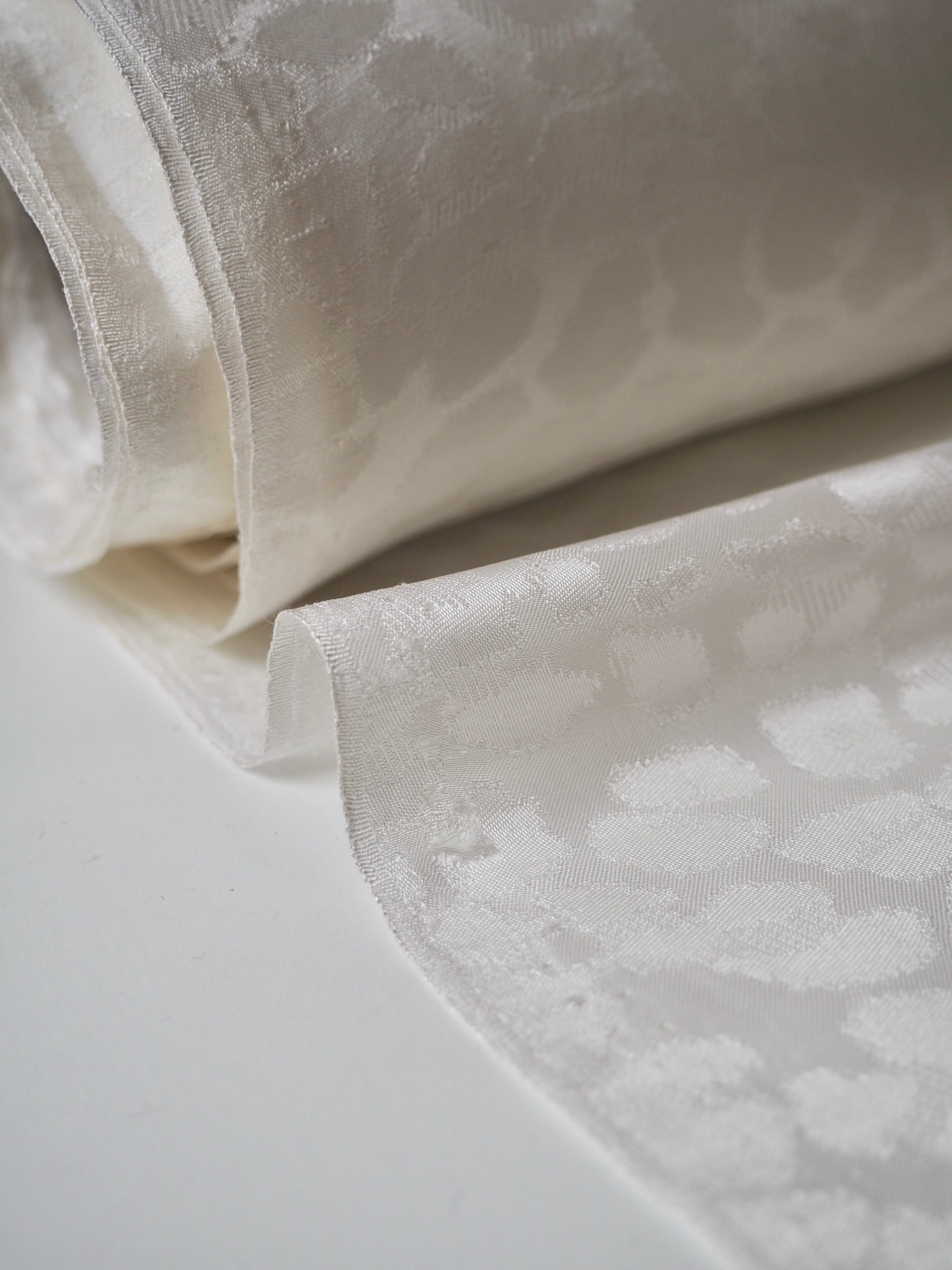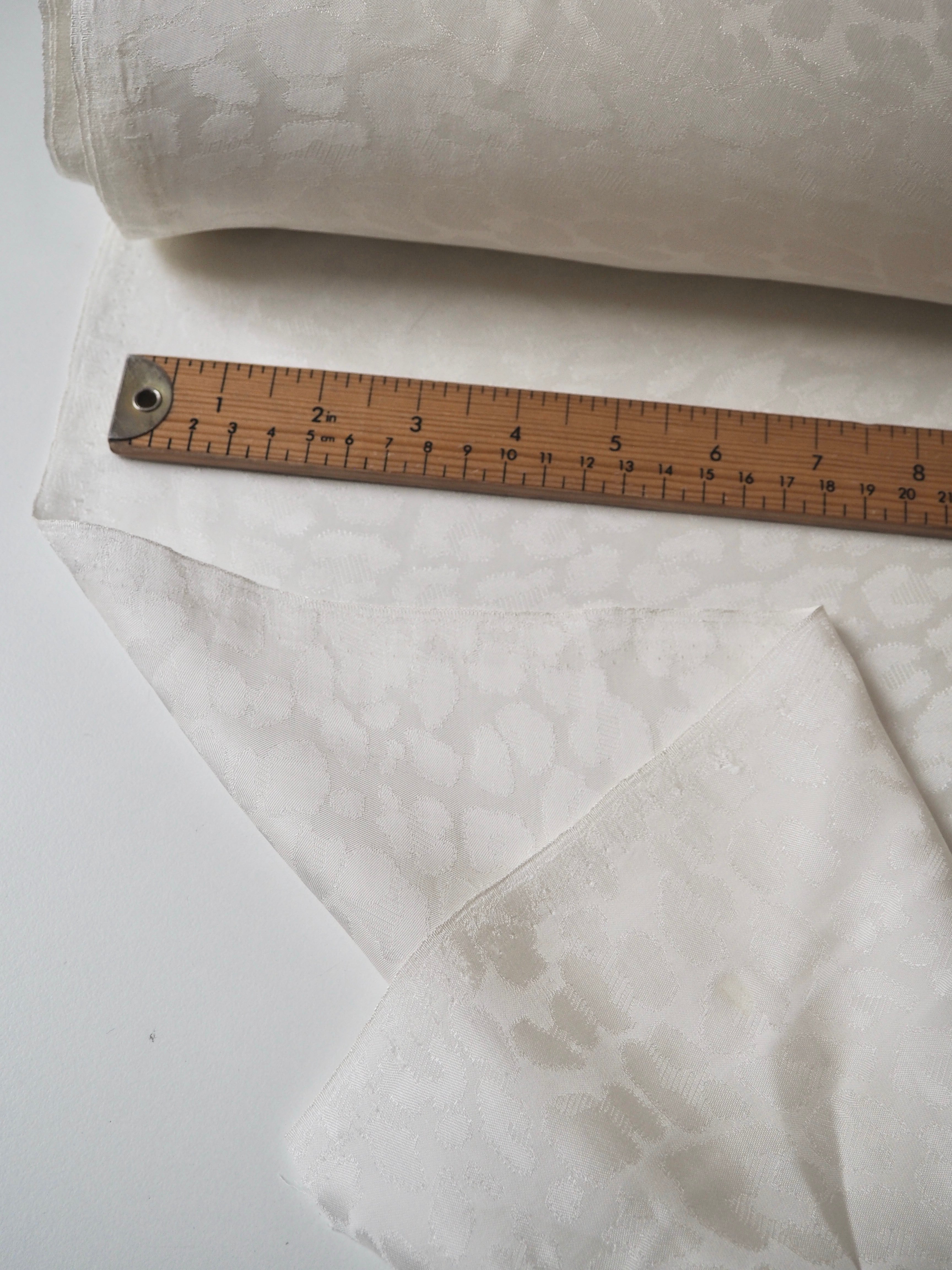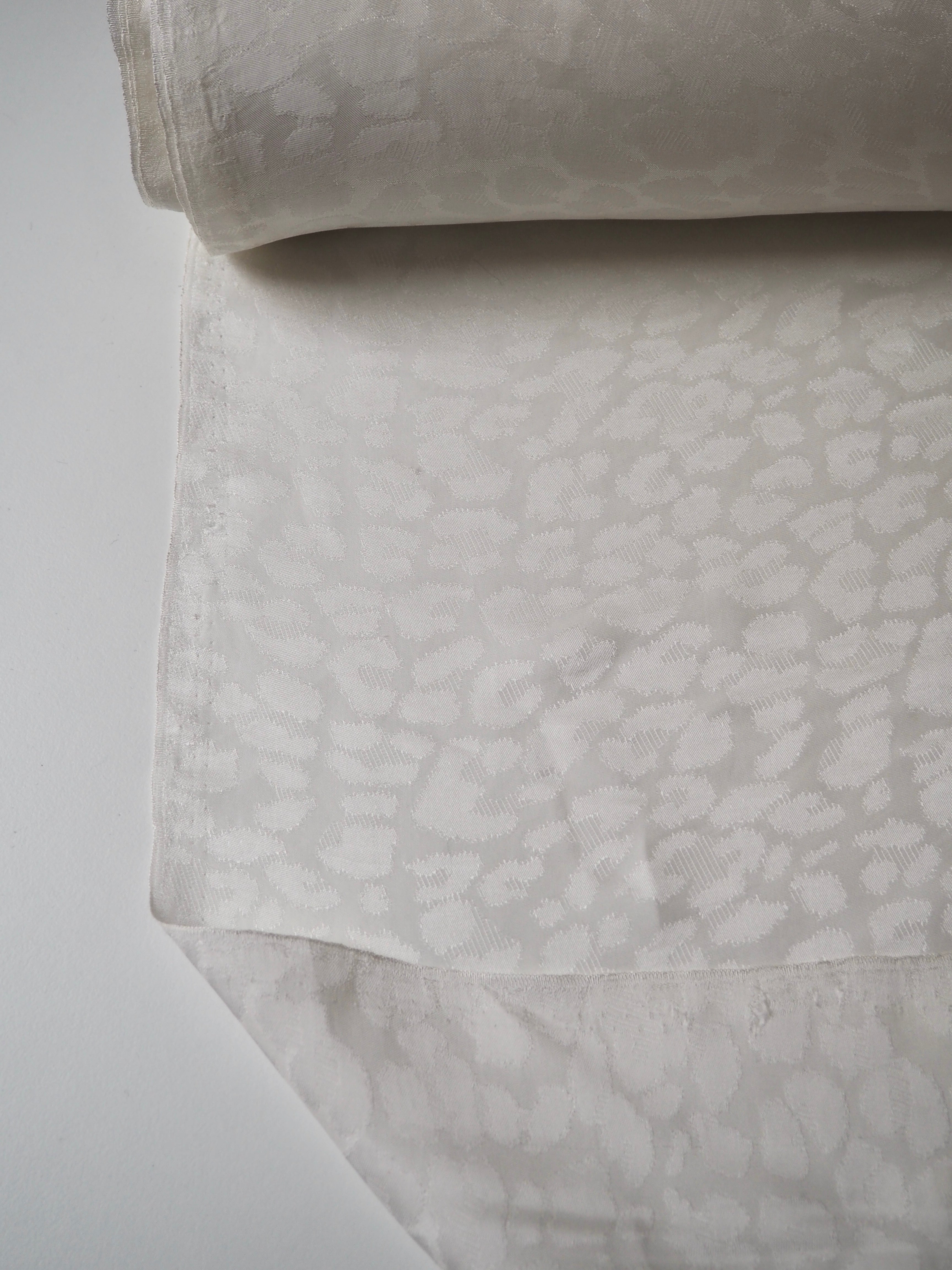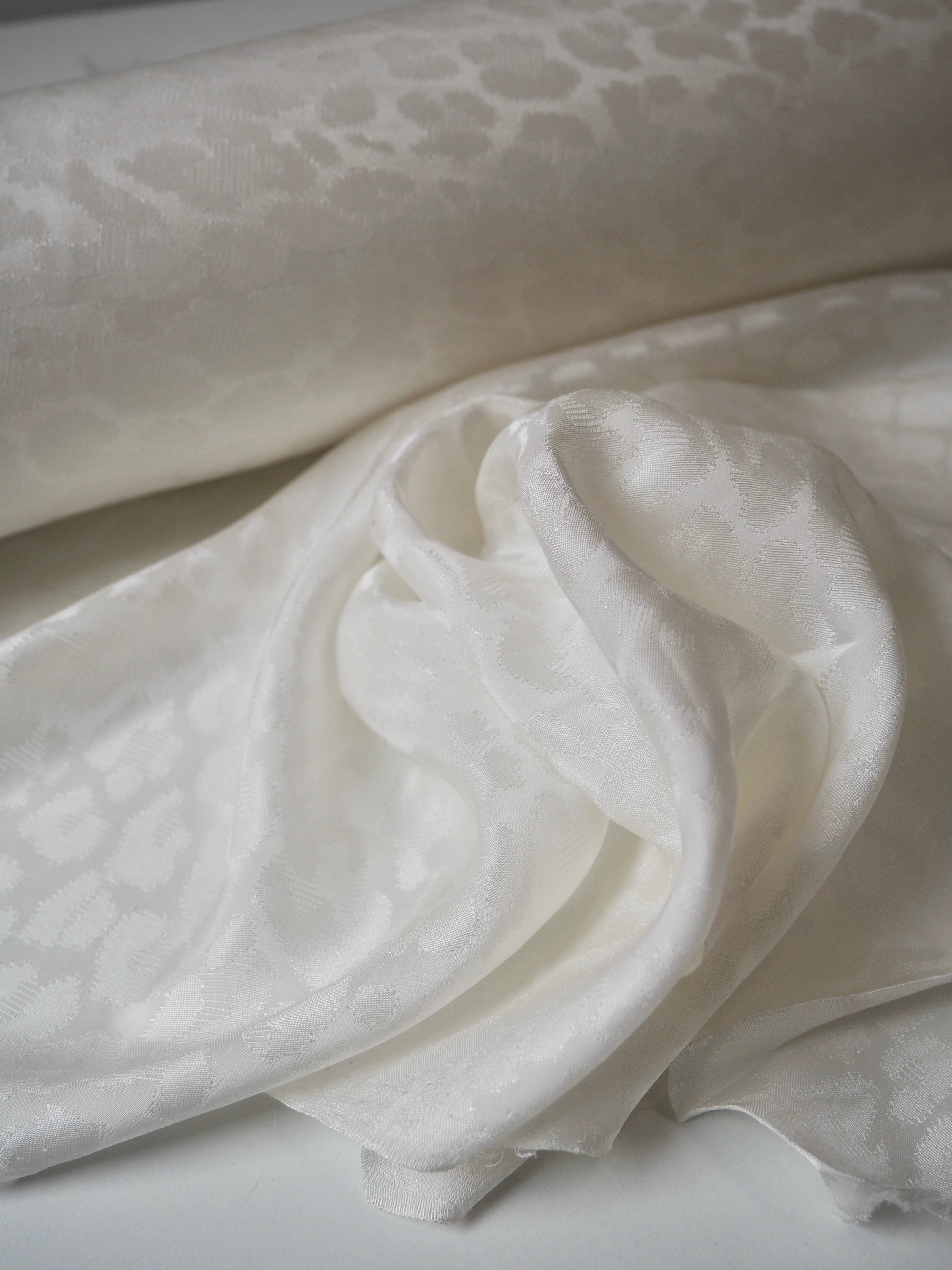 This ex-designer fabric is a leopard jacquard. It's in such a lovely creamy ivory shade, with a leopard pattern woven into the cloth. One side has a bright lustrous satin finish, and the other has a slightly duller side that's just as beautiful. Has a fantastic viscose silky handle! Lightweight with wonderful drape and shiny finish. Slightly sheer due to colour. Incredible movement! Ideal for lining or making a garment both!