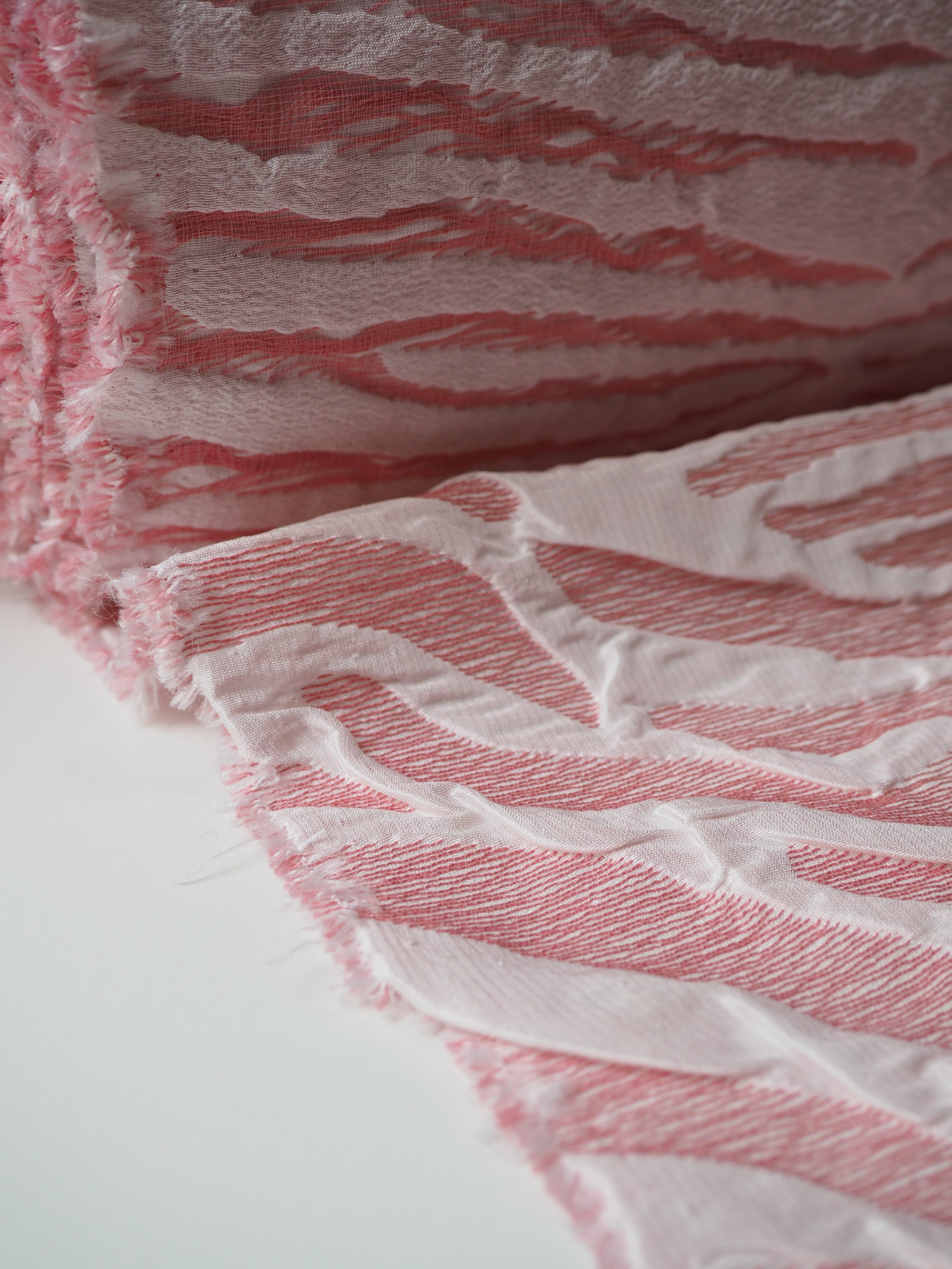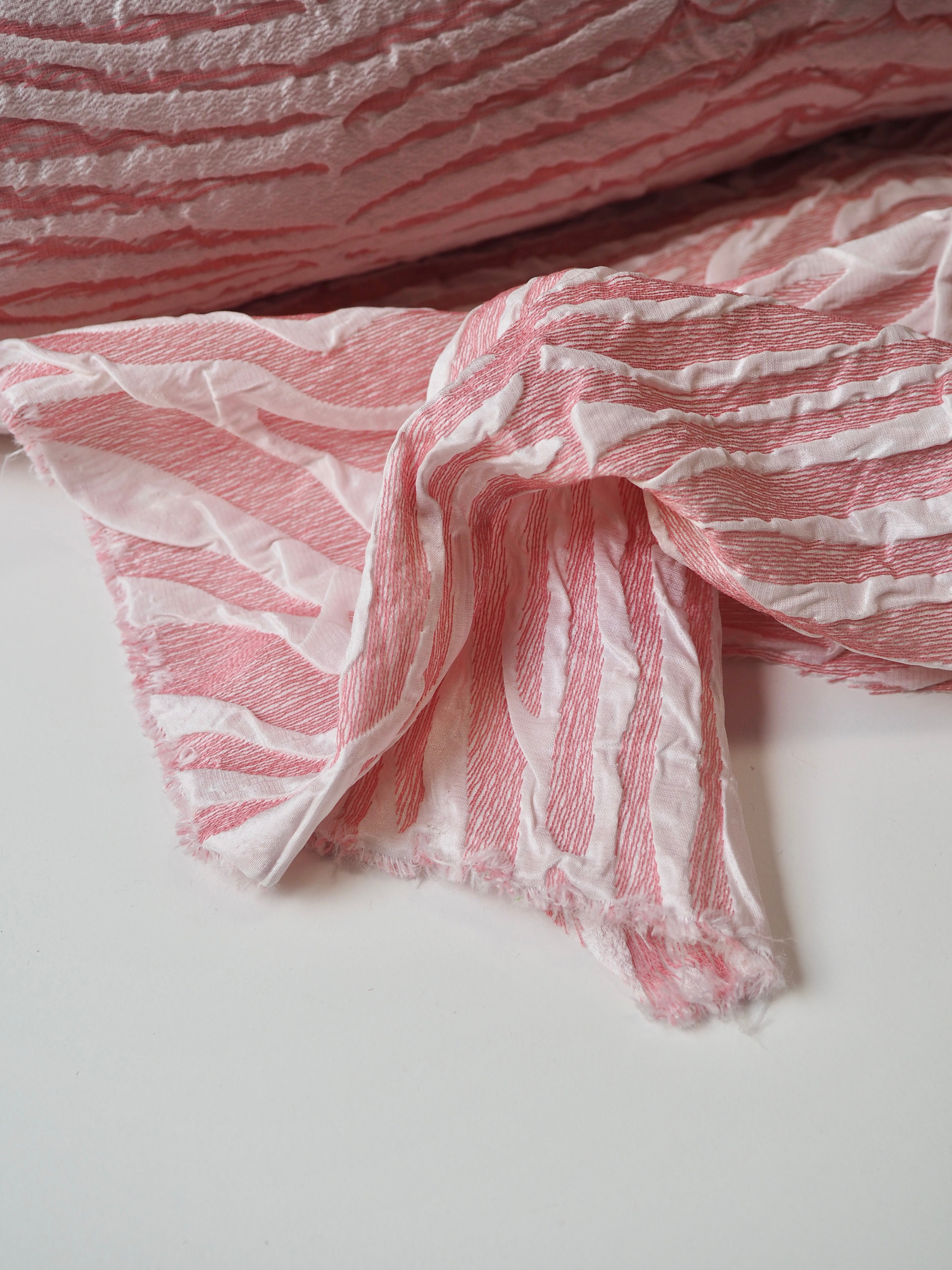 This ex-designer fabric is a stunning cloqué. It's a jacquard-cloqué with a unique zebra-like weave in pink and white. It has a plush risen texture and wonderful silk-blend handle. Lightweight with an incredible airy structure and bouncy movement. Fully opaque. Perfect for an Everyday Dress/Top, or a bag or accessory!