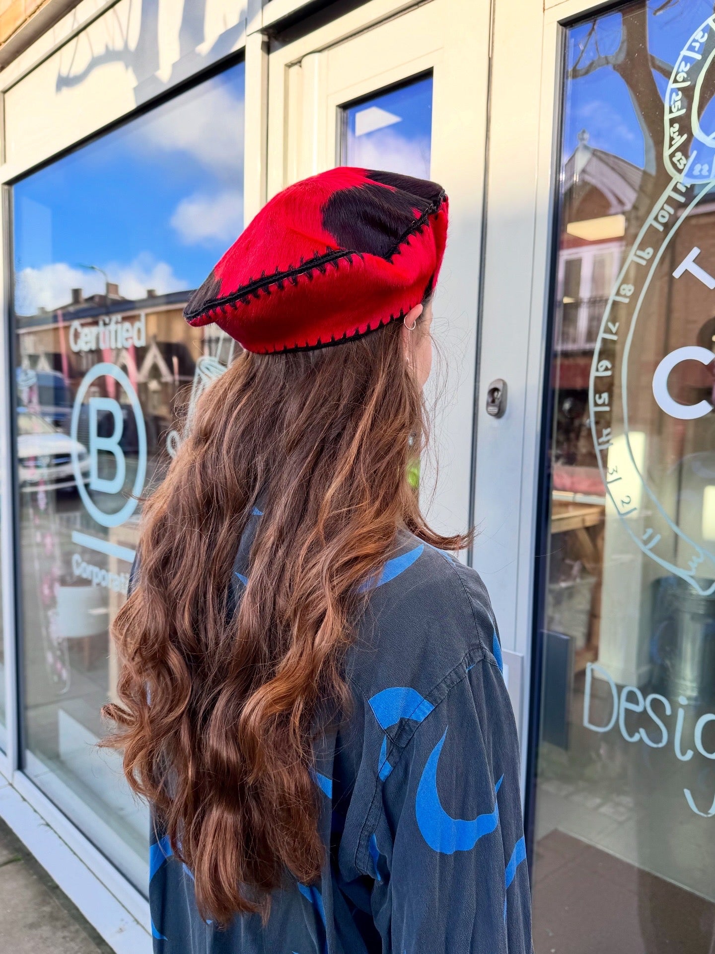 This ex-designer leather is a spotted kidskin hide. It's a smooth calfskin, with a soft and light fur hide topside and supple suede underside. In a rich red and classic black spot, with a red underside. Has a lovely sheen and is light to medium weight. We would love to see this made up into a bag, purse, on a garment, footwear, or even a home project!
