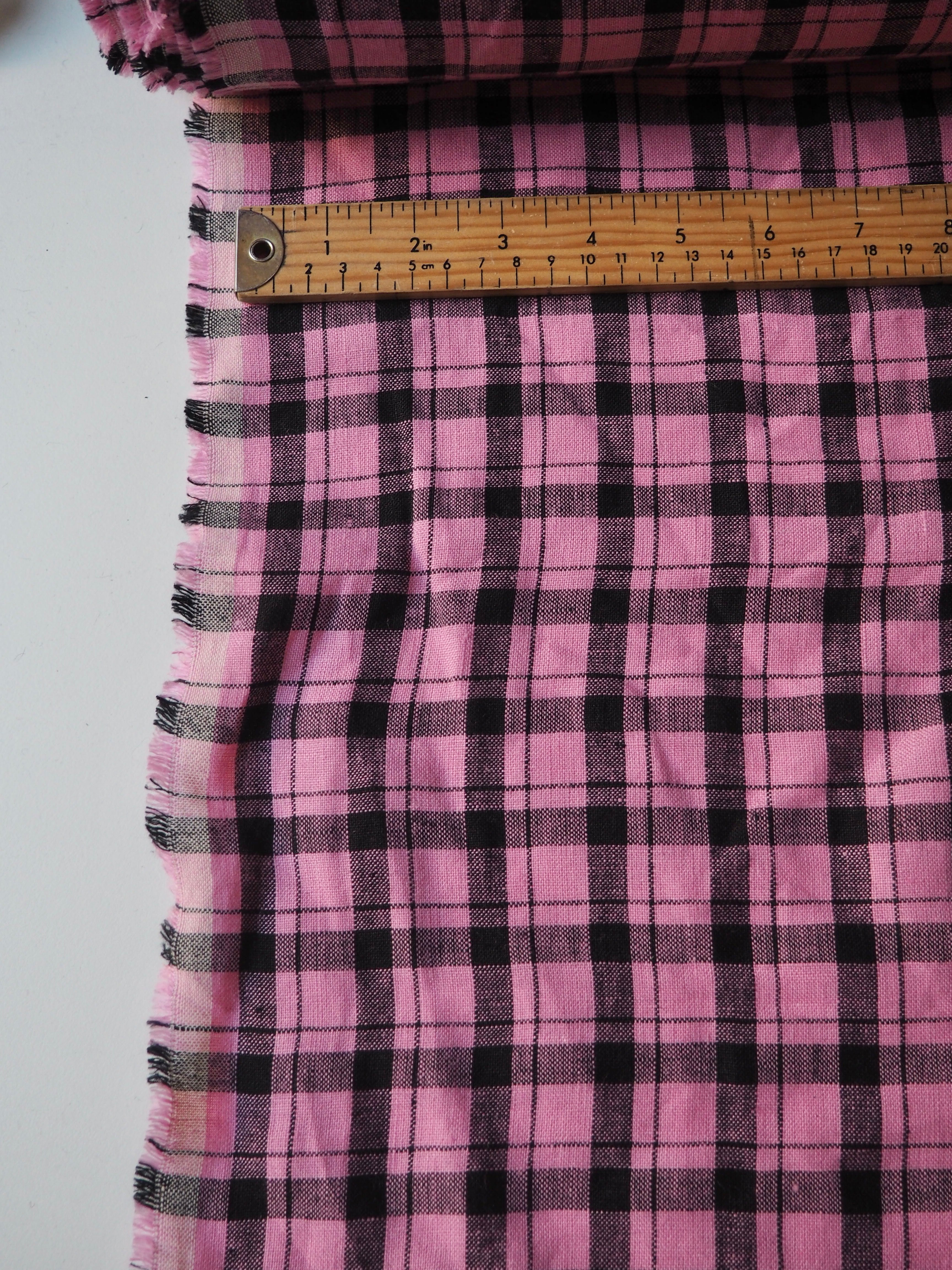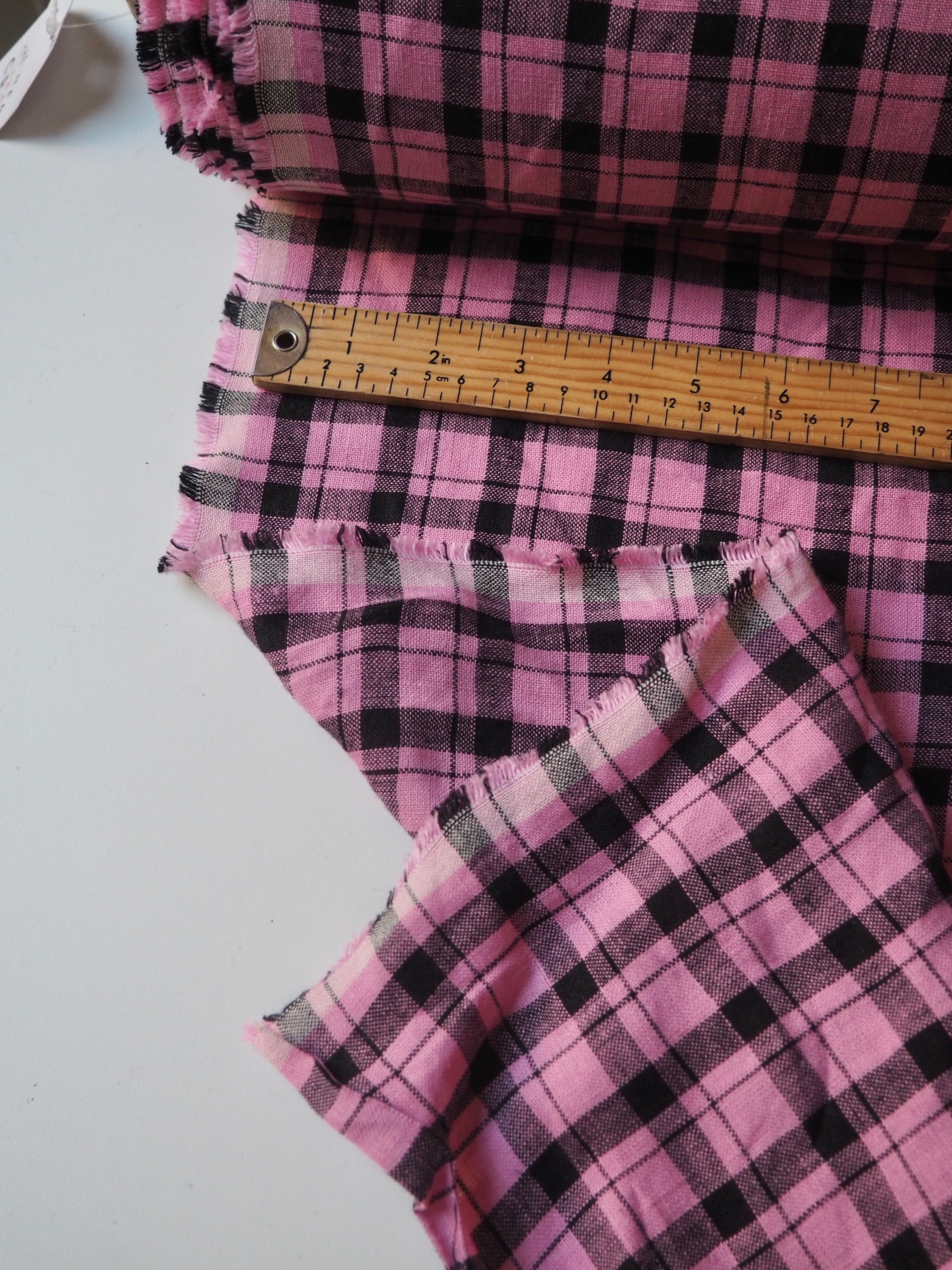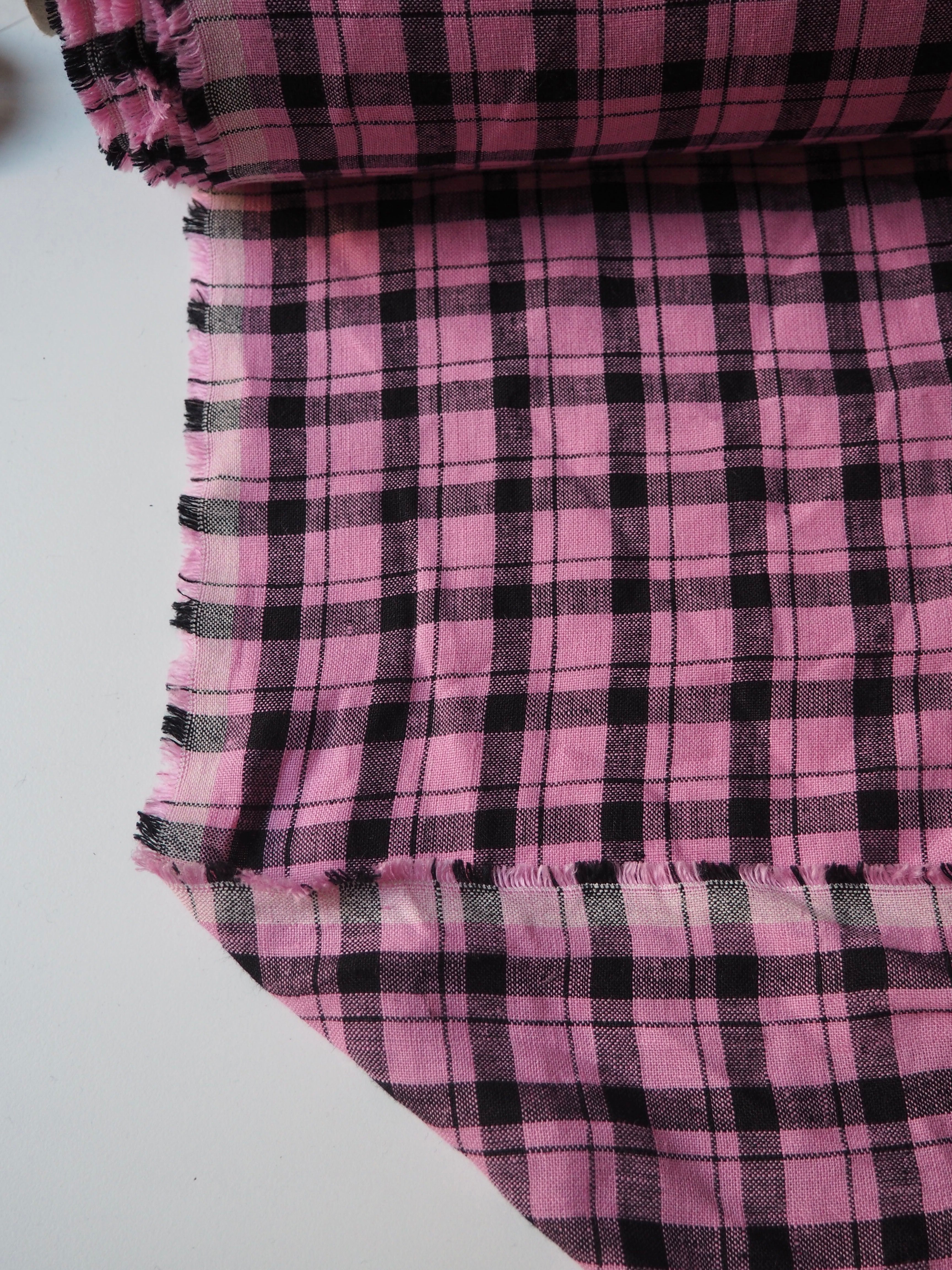 This ex-designer fabric is a lovely linen. It's a pink and black colourway, in a check. It has a soft and gentle linen weave with a typical linen texture, and a brilliant handle that's so wearable. Lightweight with a gentle structured drape, and fully opaque. From popular London-based brand Beyond Nine. Lovely for a bias dress of skirt, summer tops or Everyday Trousers!