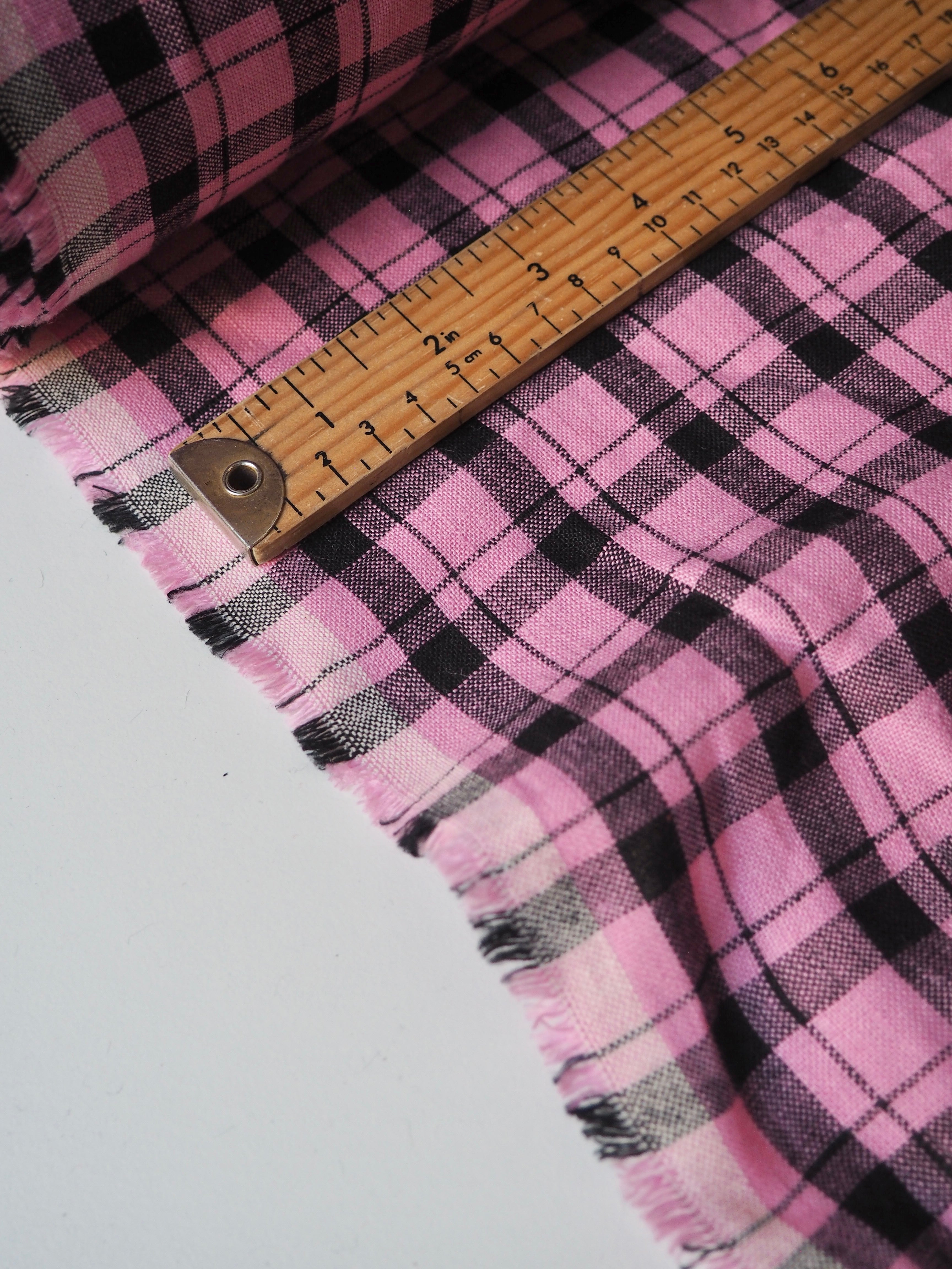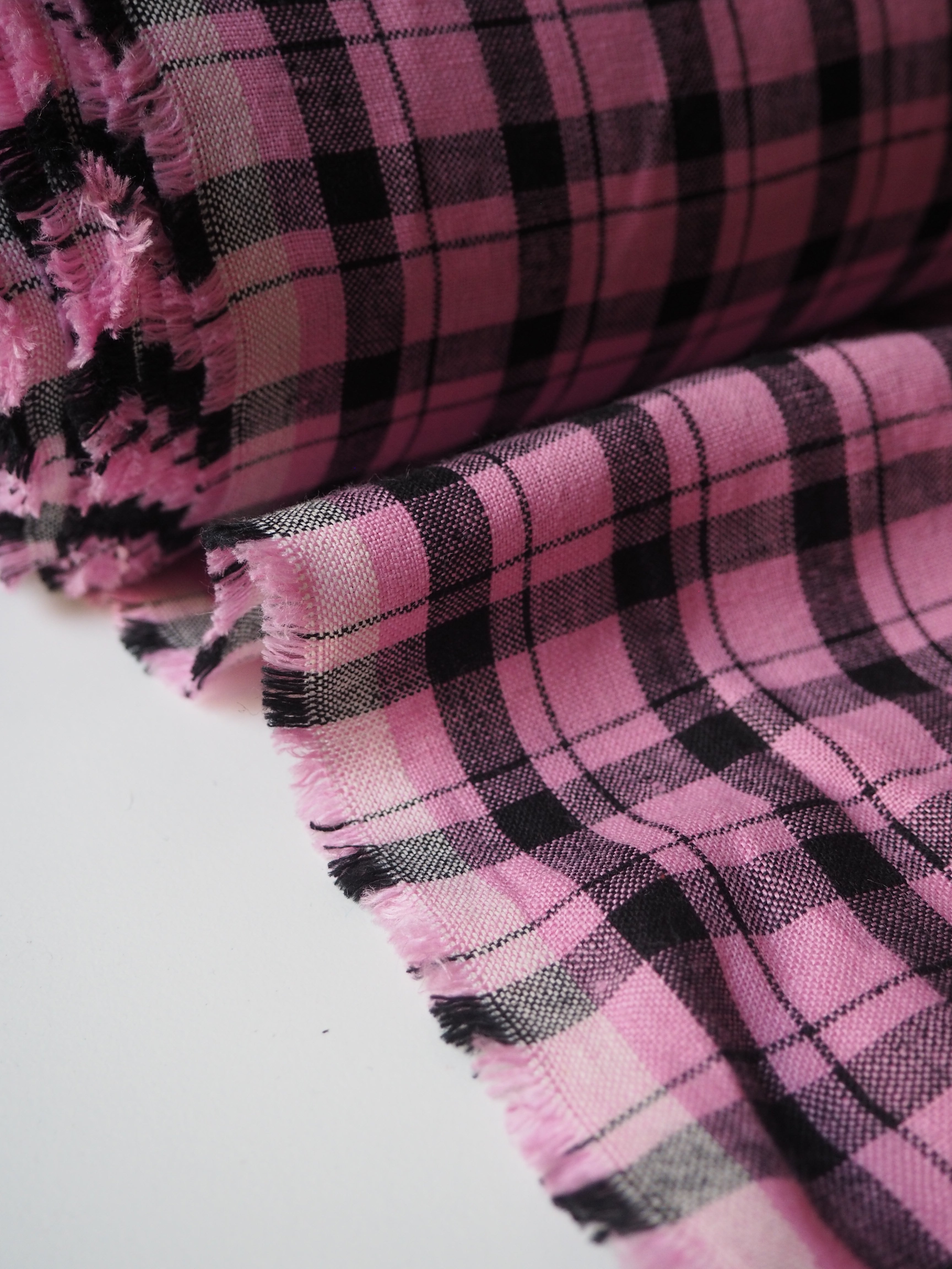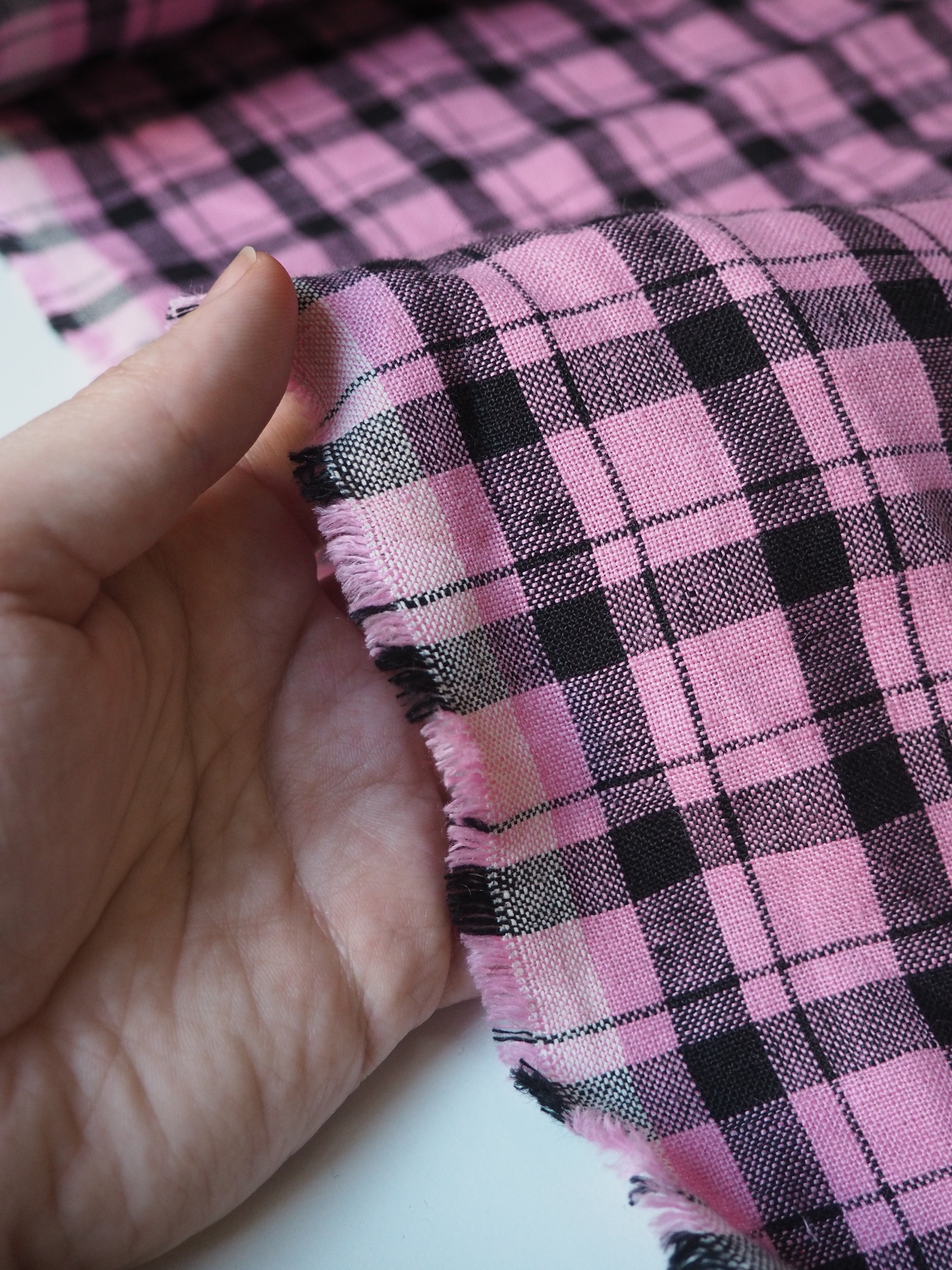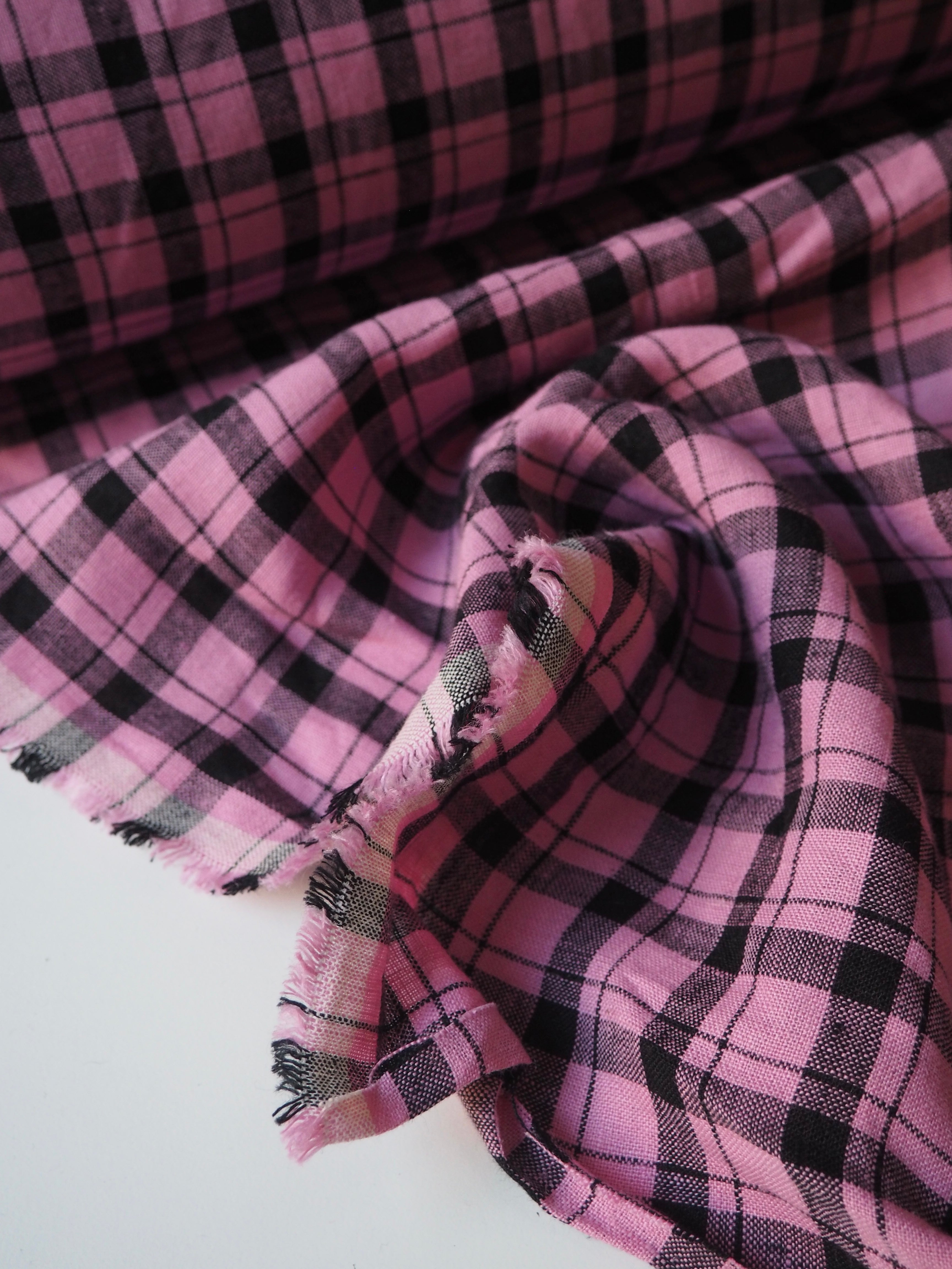 This ex-designer fabric is a lovely linen. It's a pink and black colourway, in a check. It has a soft and gentle linen weave with a typical linen texture, and a brilliant handle that's so wearable. Lightweight with a gentle structured drape, and fully opaque. From popular London-based brand Beyond Nine. Lovely for a bias dress of skirt, summer tops or Everyday Trousers!