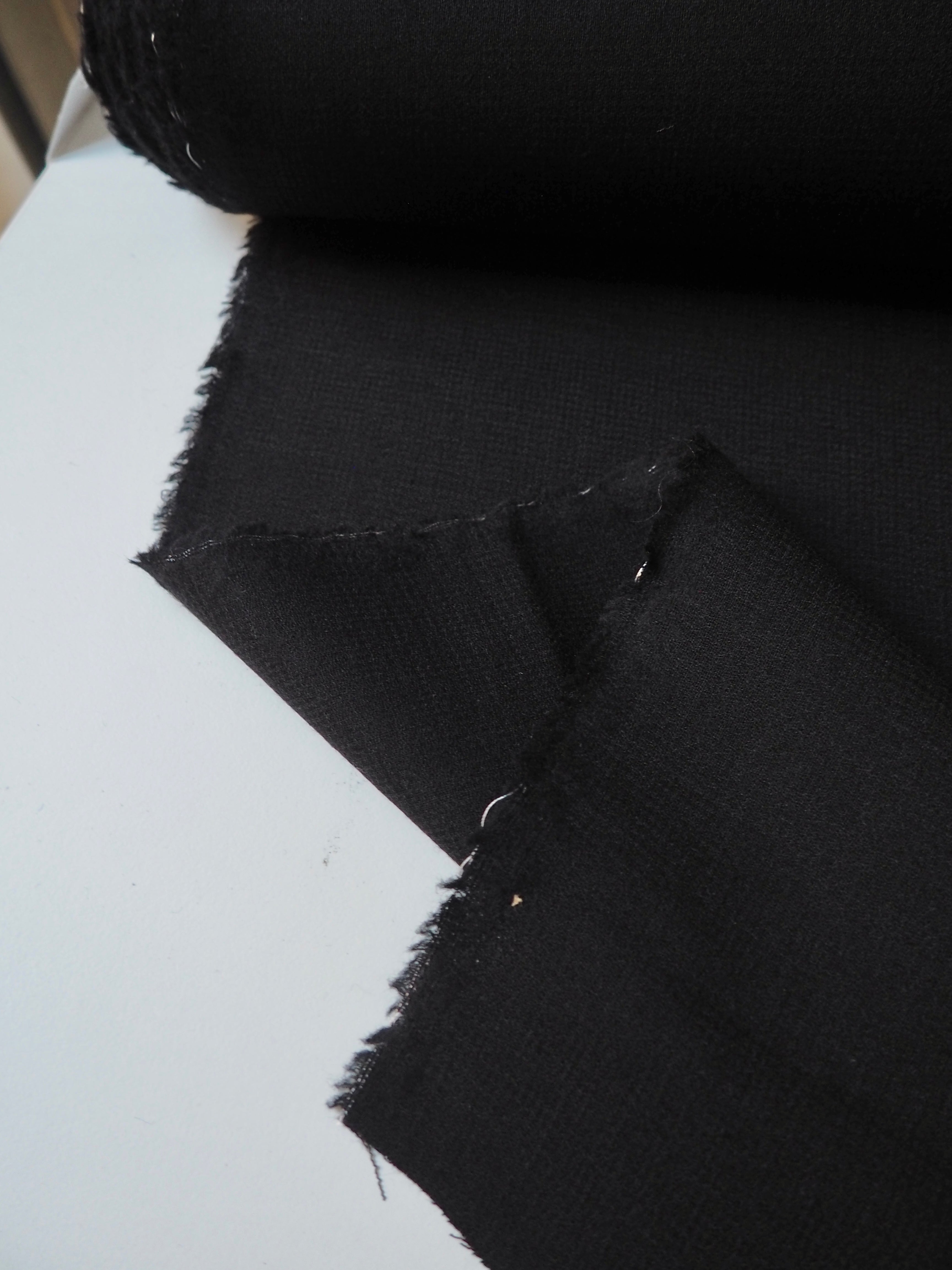 This ex-designer fabric is a wool crepe. It's a rich black colour, with a soft woolly handle and beautiful raised crepe texture. Lightweight with gentle structure. It's opaque with a medium density weave. Perfect for some warm but chic trousers!