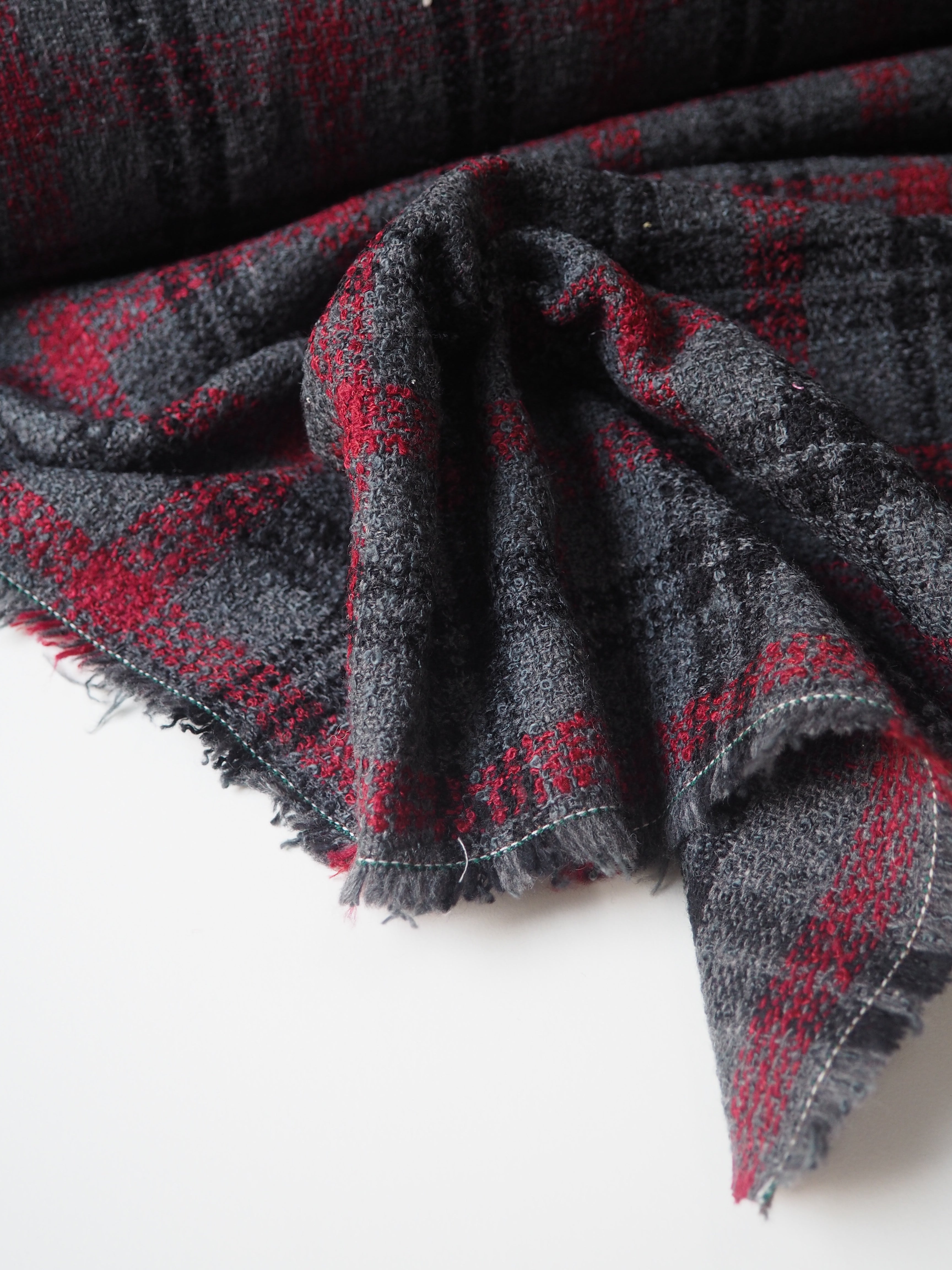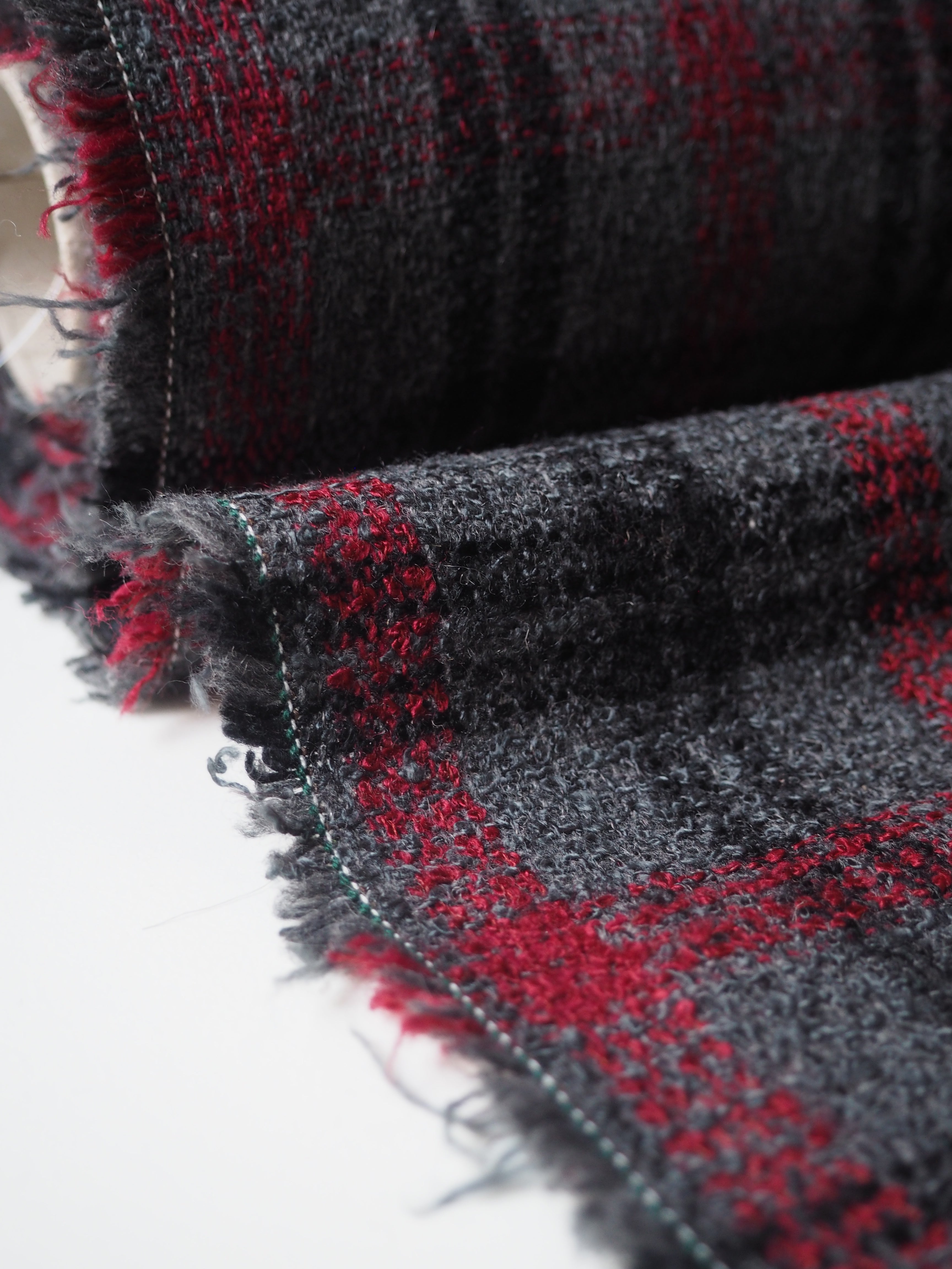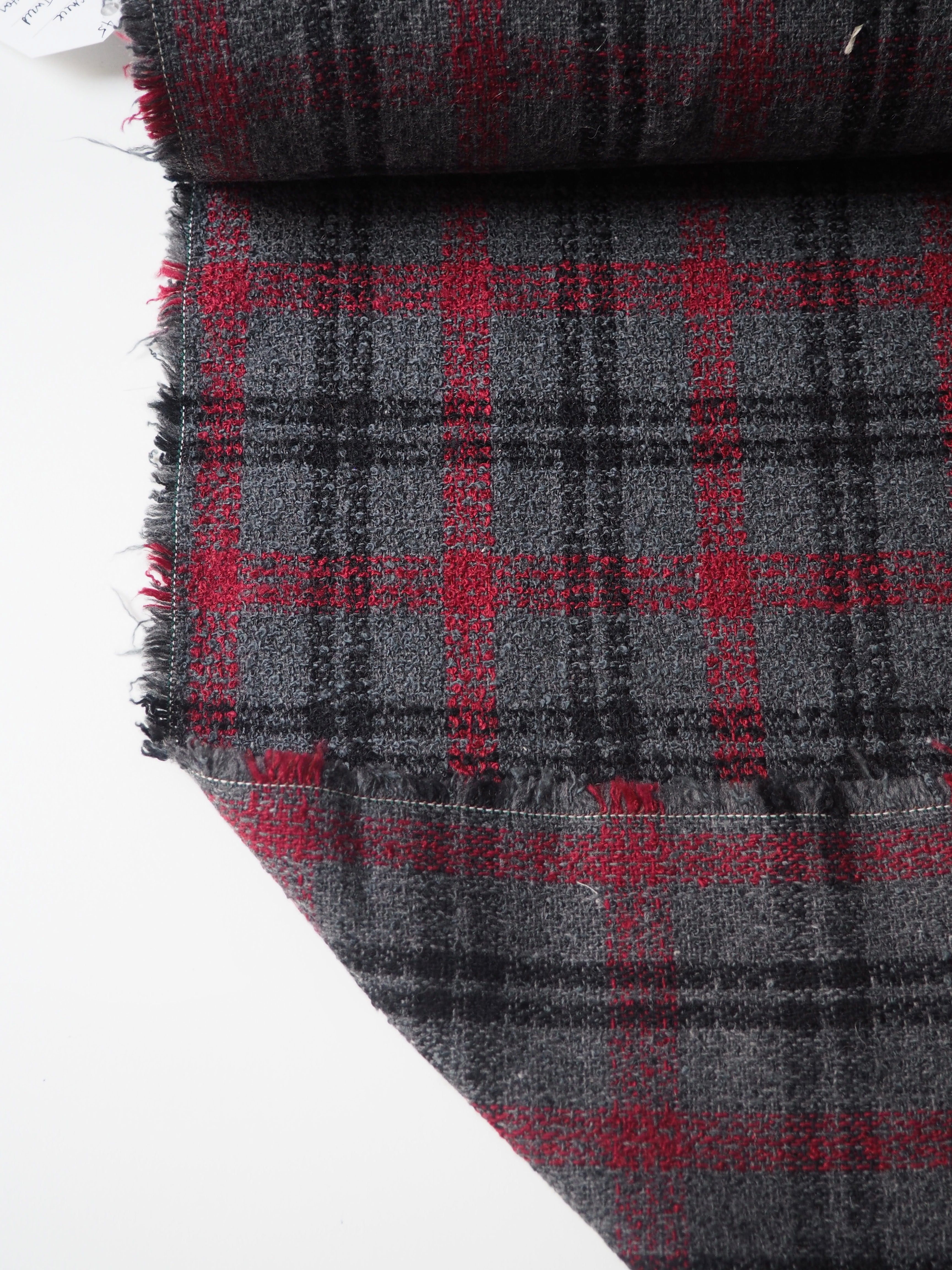 This ex-designer fabric is a tweed. It's a grey, black, and red check. It has a lovely soft handle and beautiful movement and drape. It's light to medium weight and opaque. The blend of wool, poly, and cotton make it versatile and wearable all year around. Perfect for light jackets, scarves, or a coordinated set!
