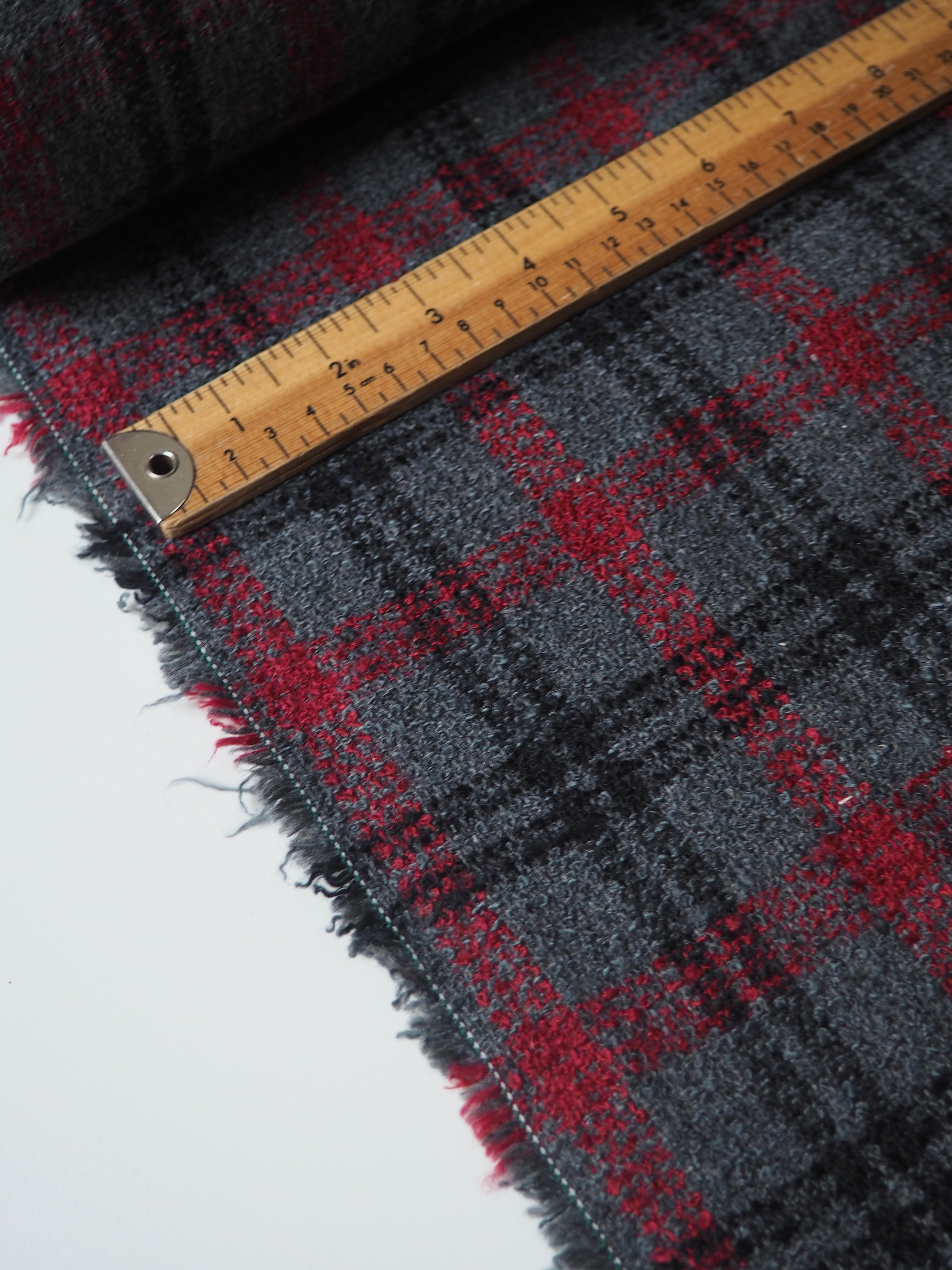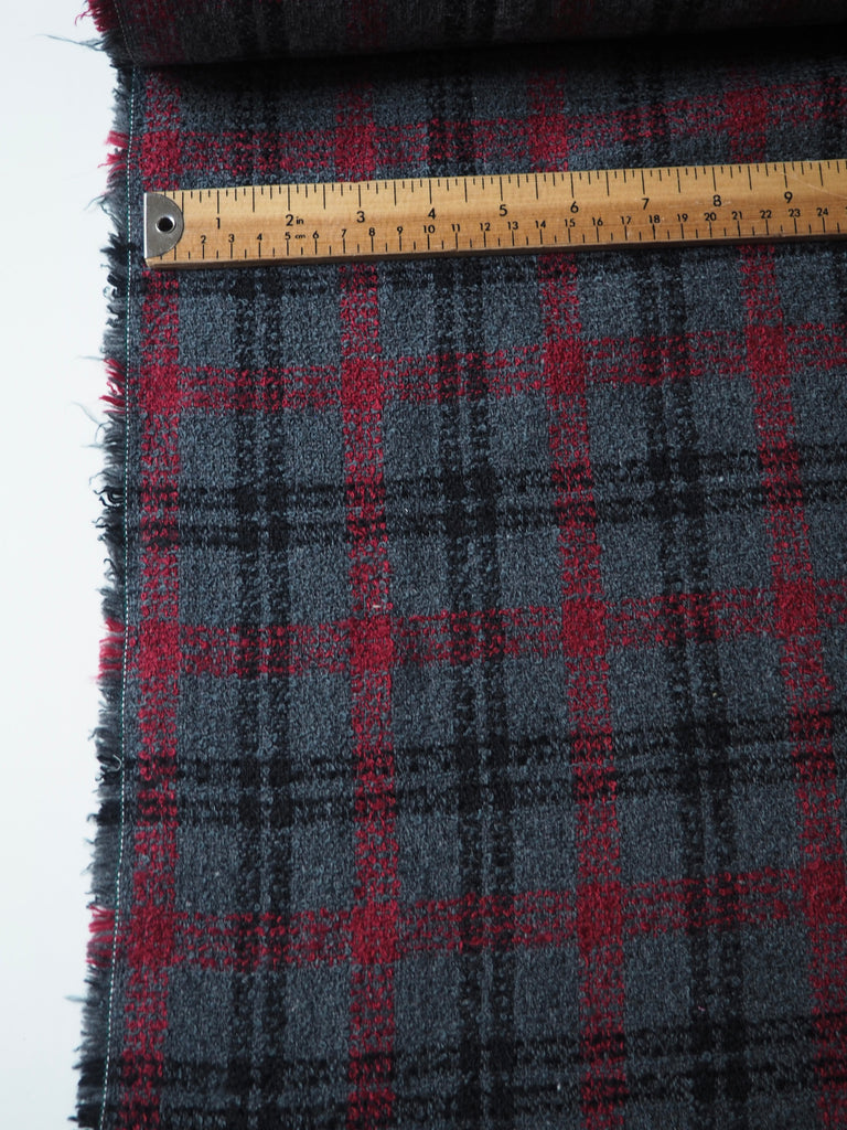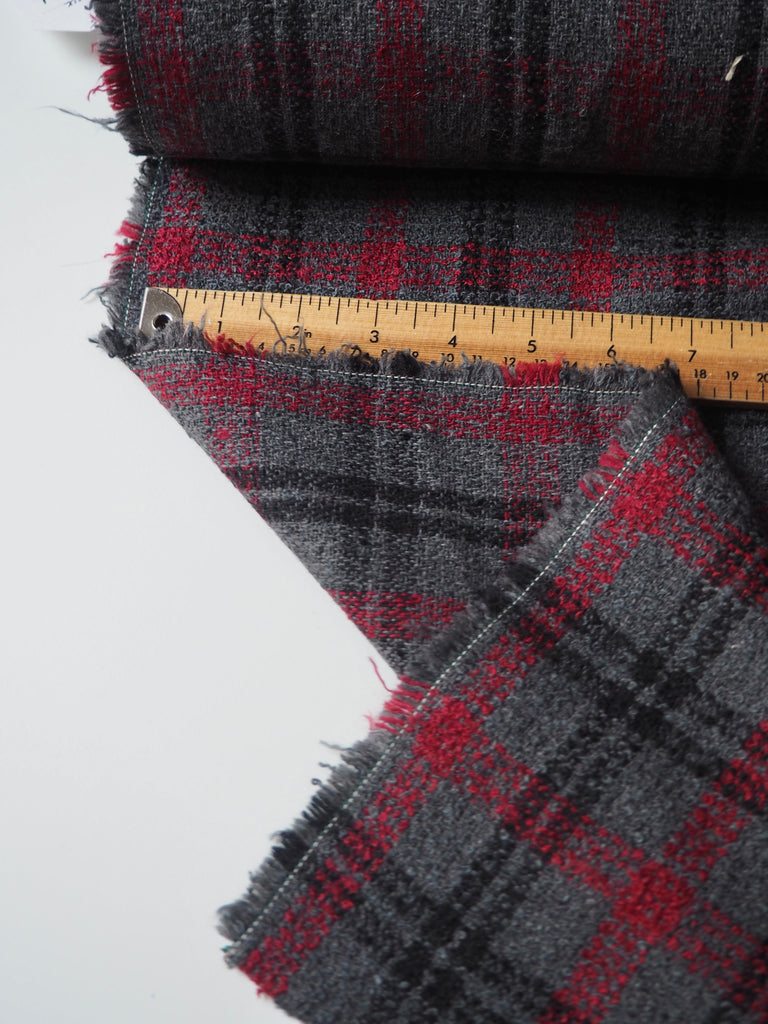 This ex-designer fabric is a tweed. It's a grey, black, and red check. It has a lovely soft handle and beautiful movement and drape. It's light to medium weight and opaque. The blend of wool, poly, and cotton make it versatile and wearable all year around. Perfect for light jackets, scarves, or a coordinated set!