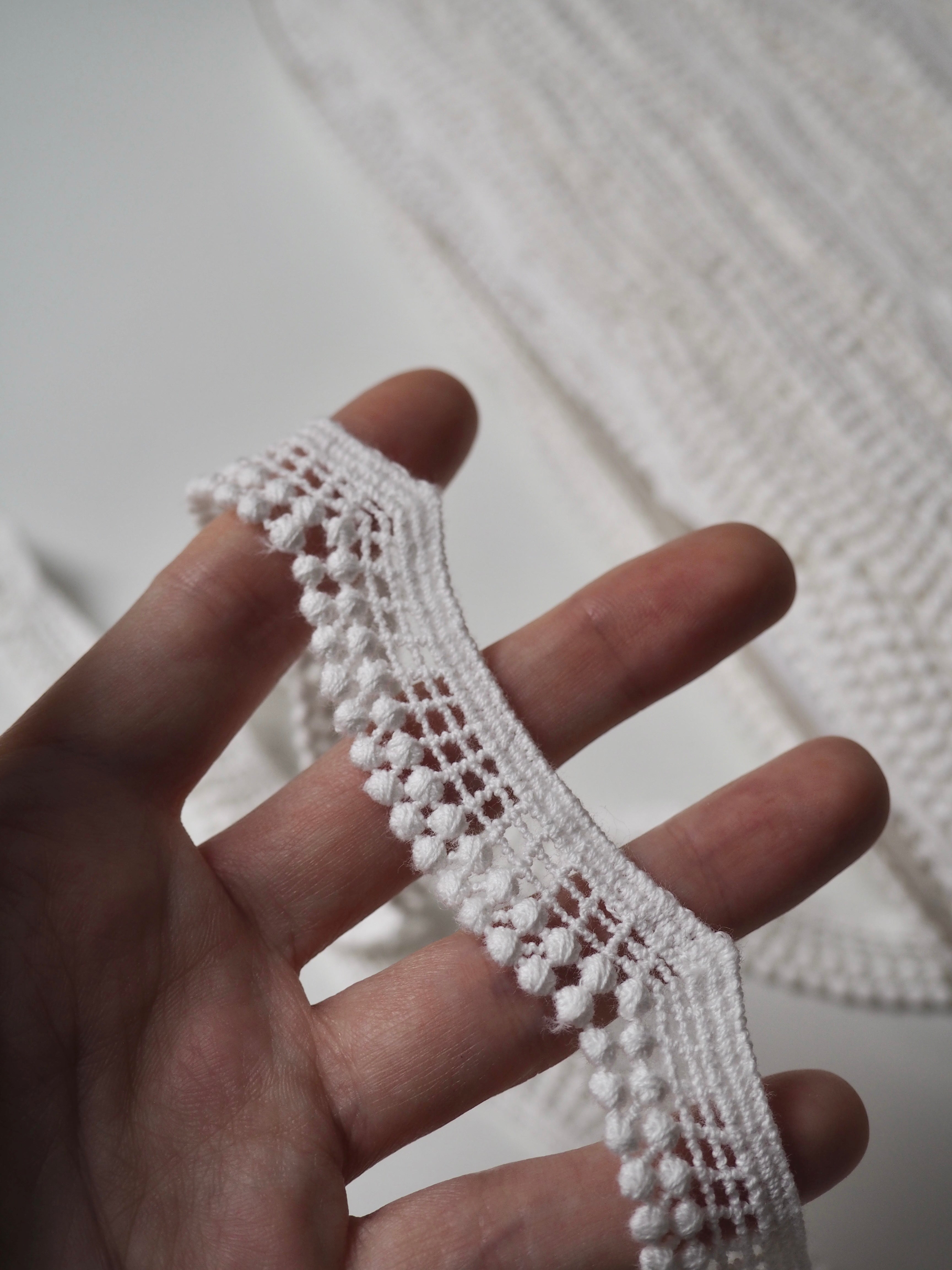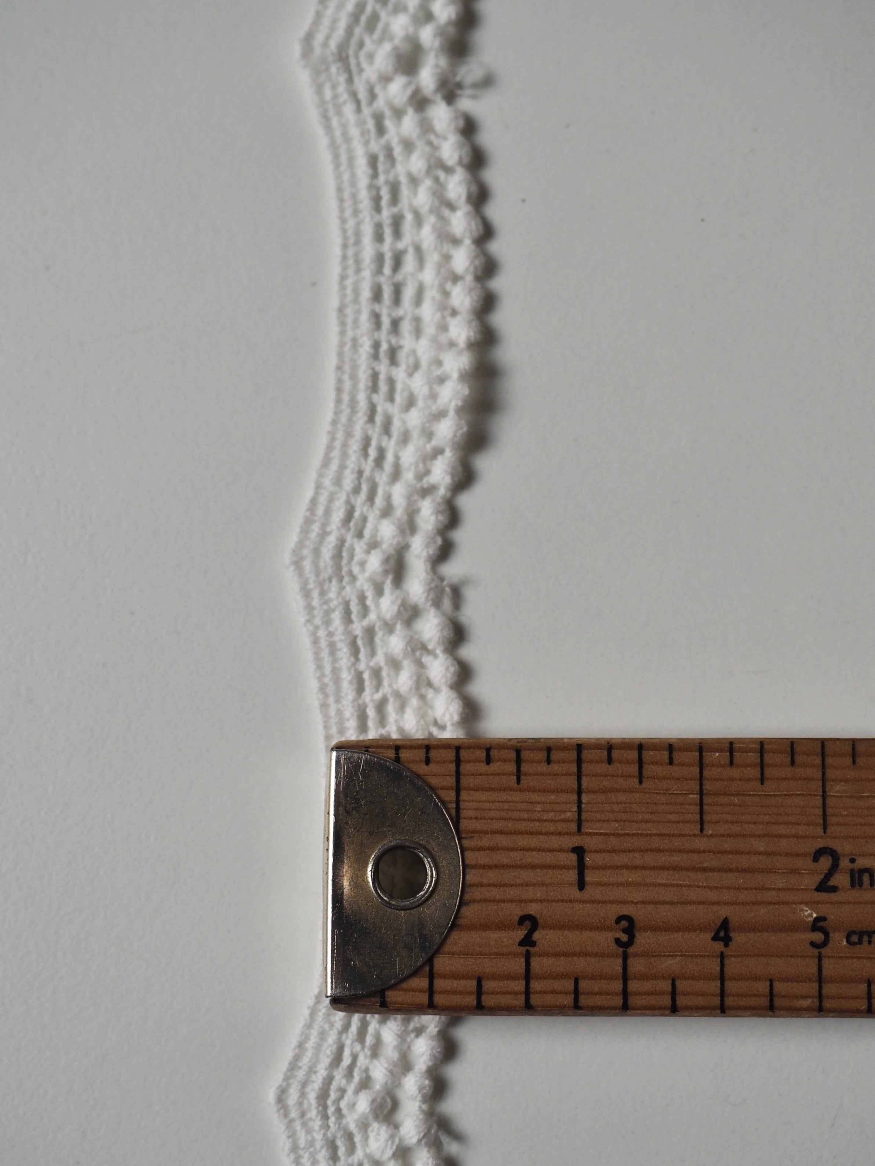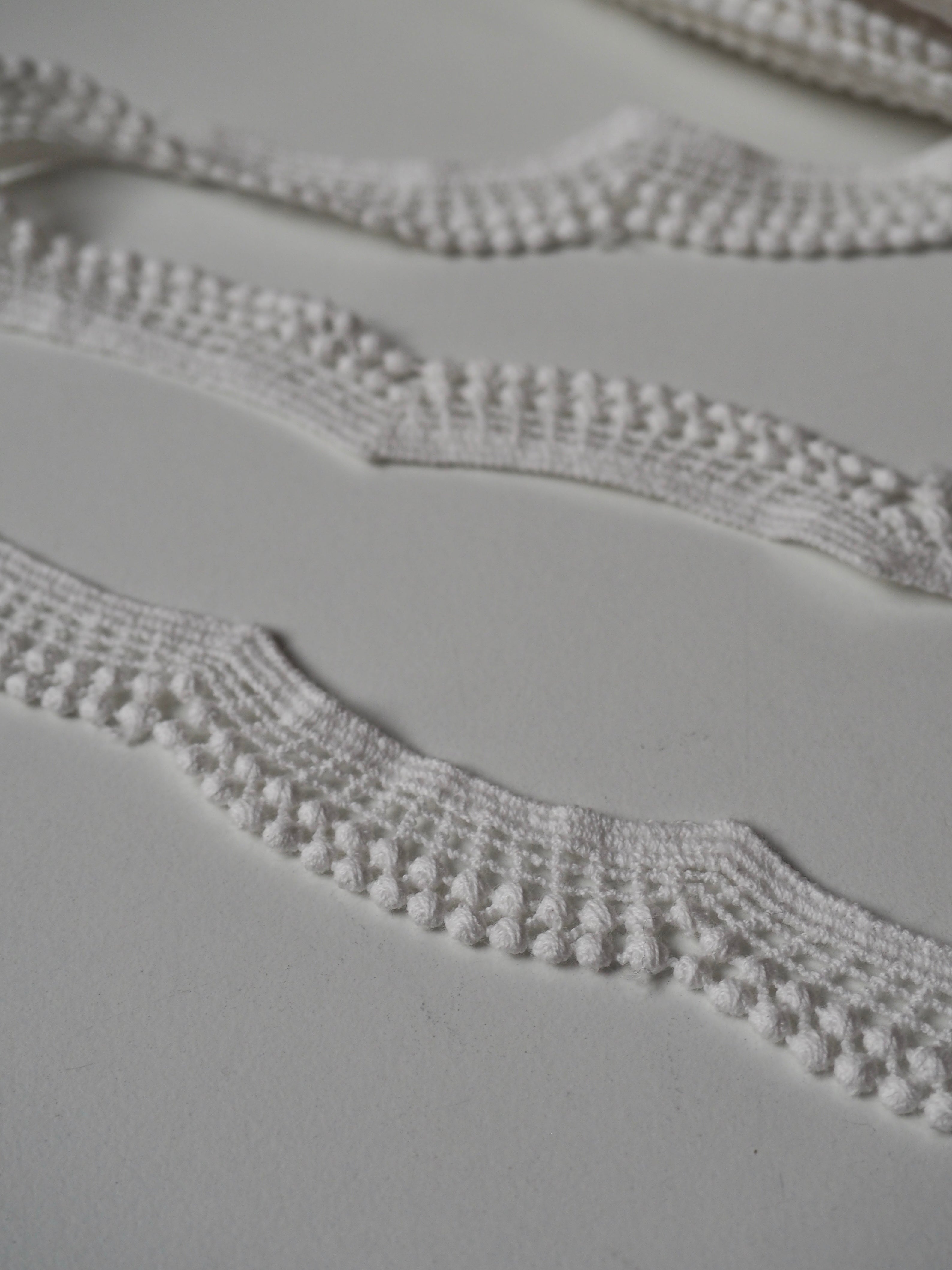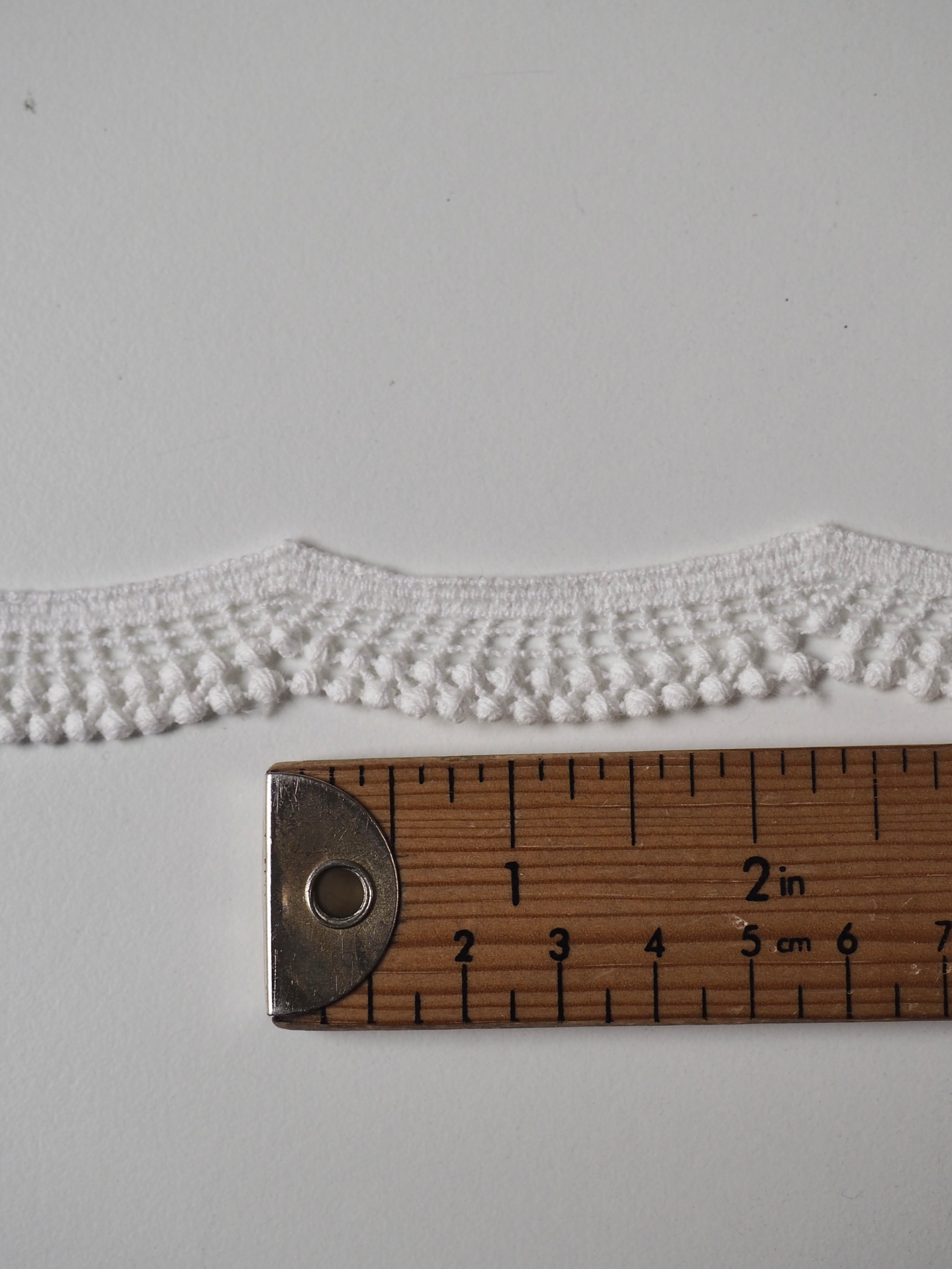 Gorgeous geometric lace trim. A gentle scallop with a lattice design, and a double dot edge. Would look great as an inlay or could be appliquéd on. Perfect for garments or lingerie, particularly bridal! All our trim is deadstock left over from when a designer has finished sampling their collection.