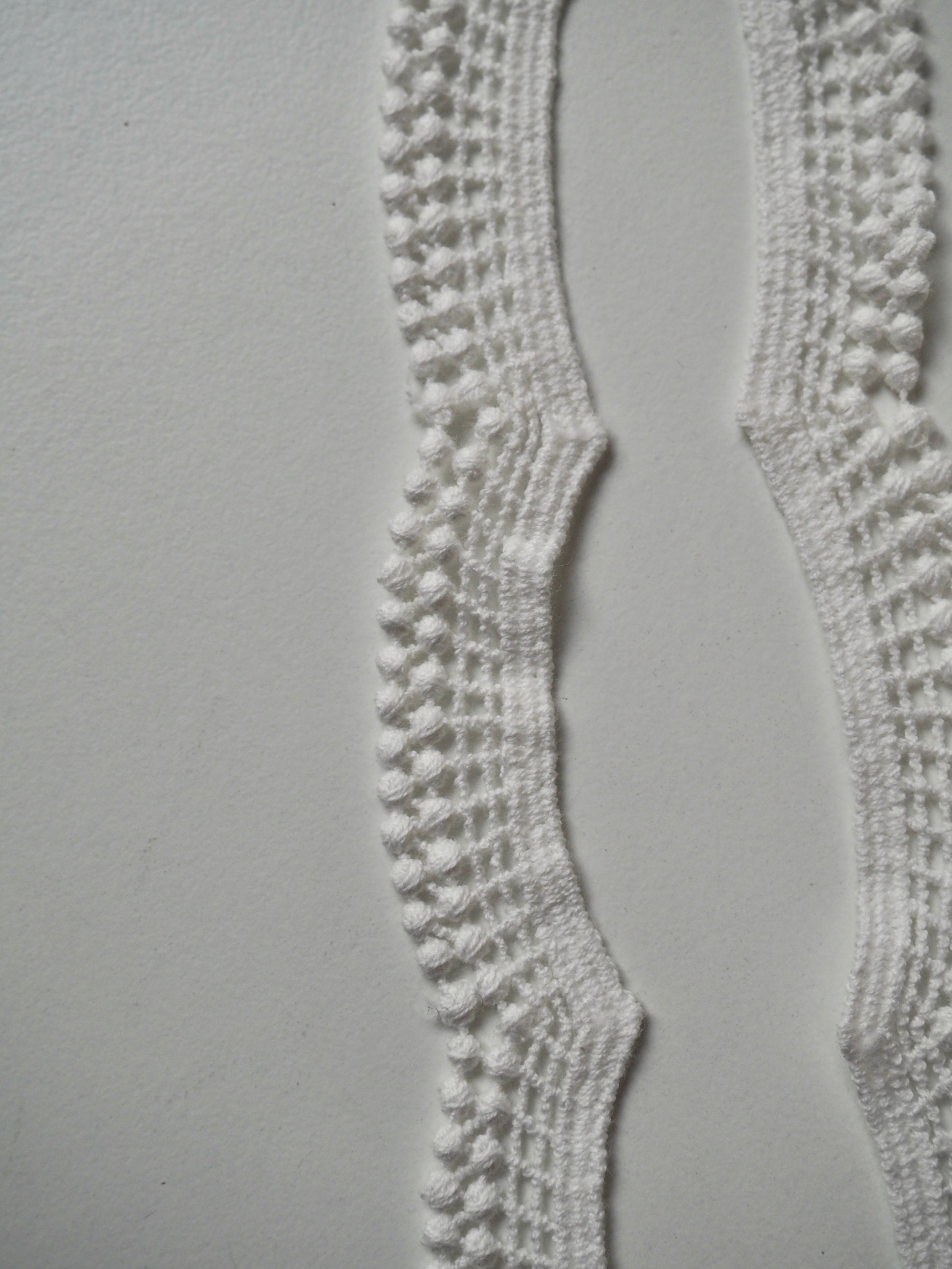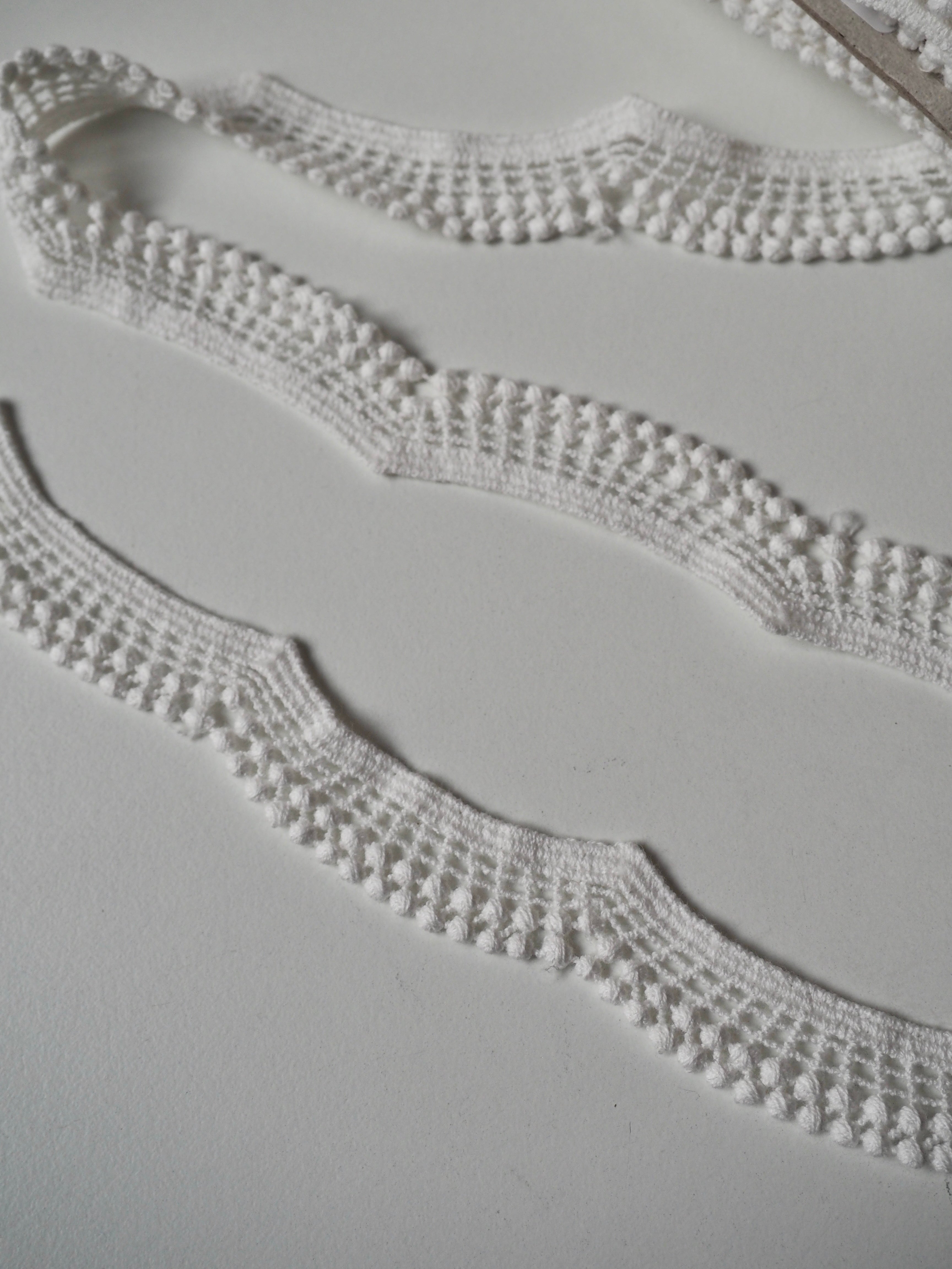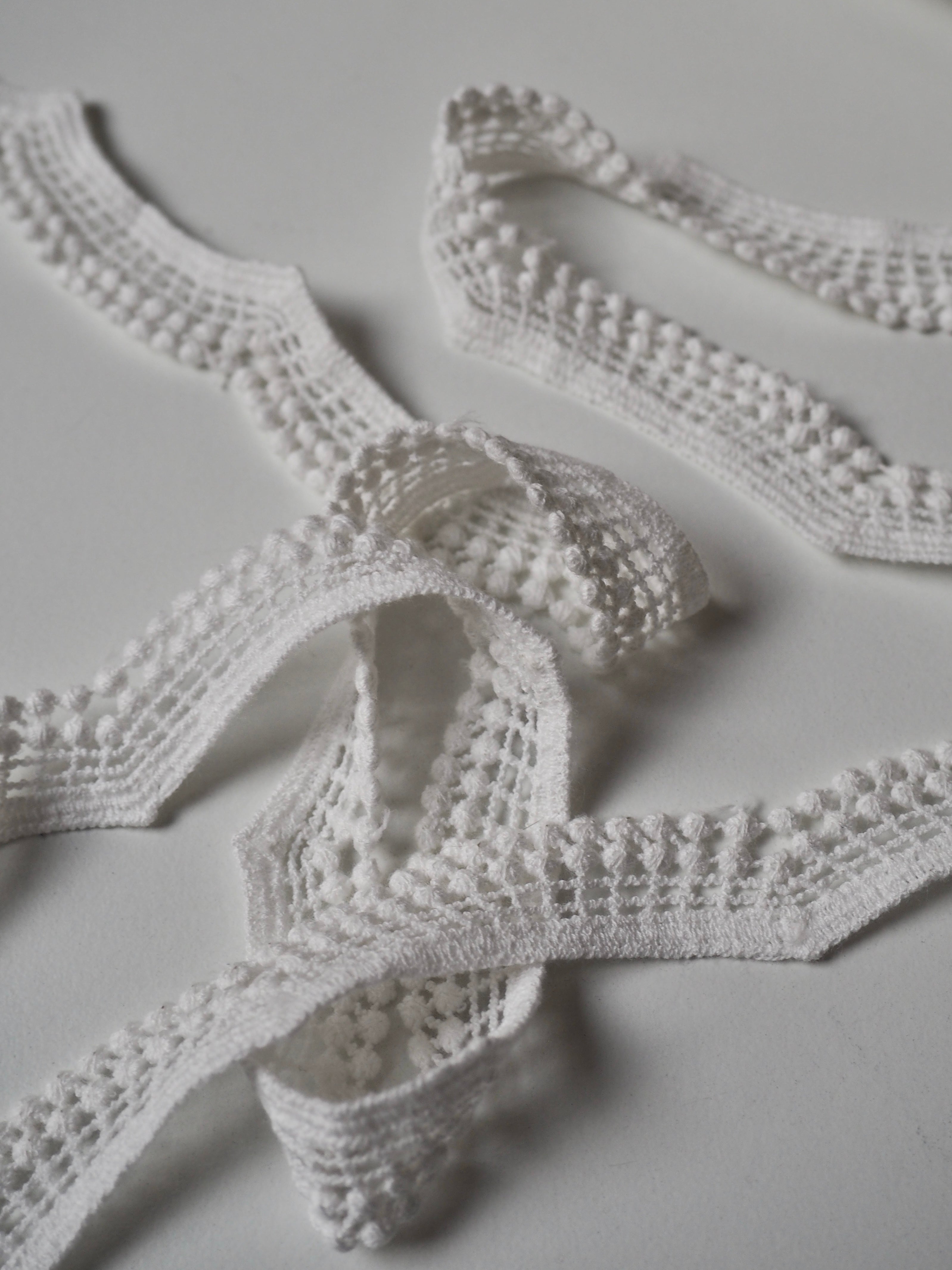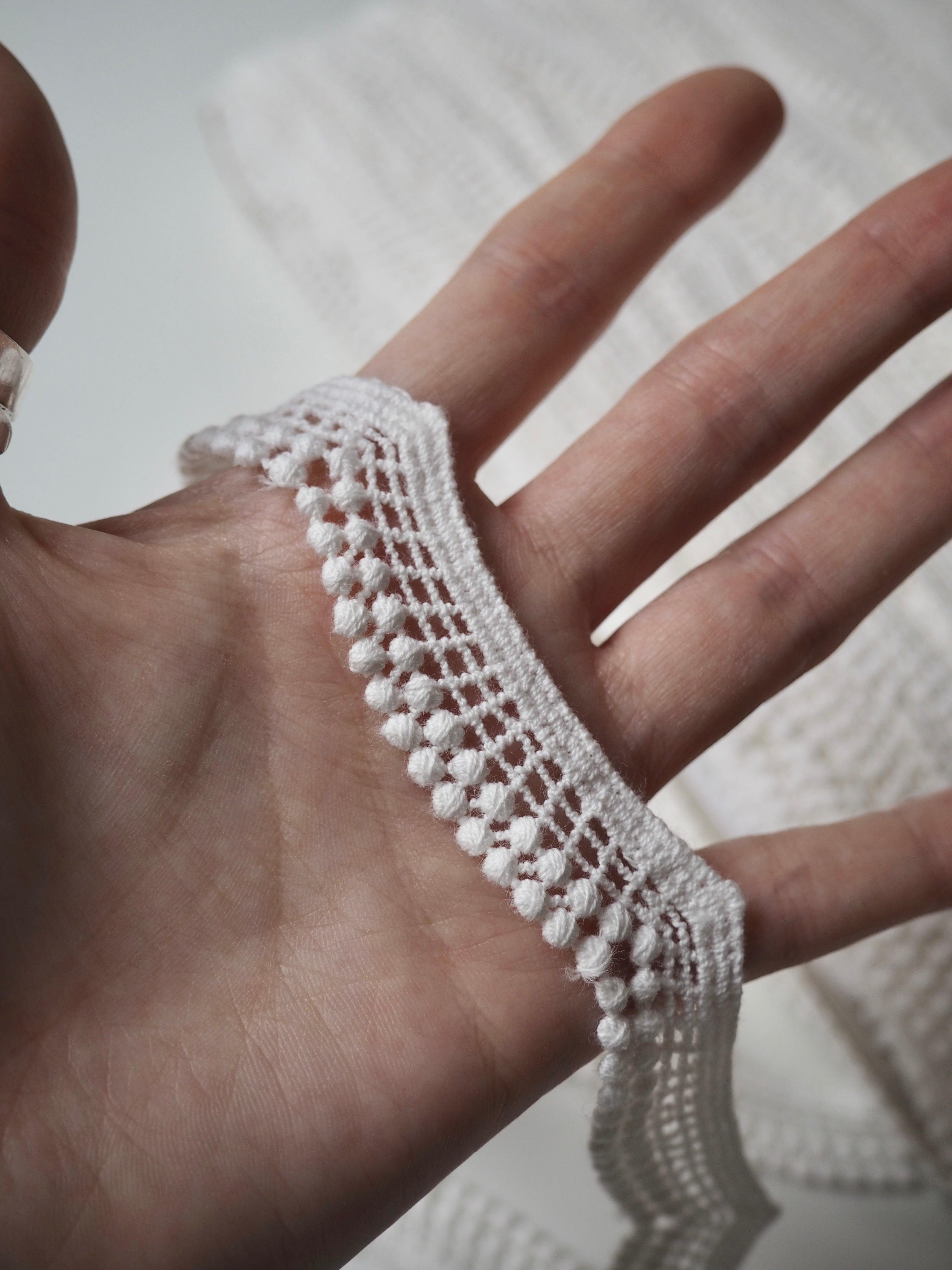 Gorgeous geometric lace trim. A gentle scallop with a lattice design, and a double dot edge. Would look great as an inlay or could be appliquéd on. Perfect for garments or lingerie, particularly bridal! All our trim is deadstock left over from when a designer has finished sampling their collection.