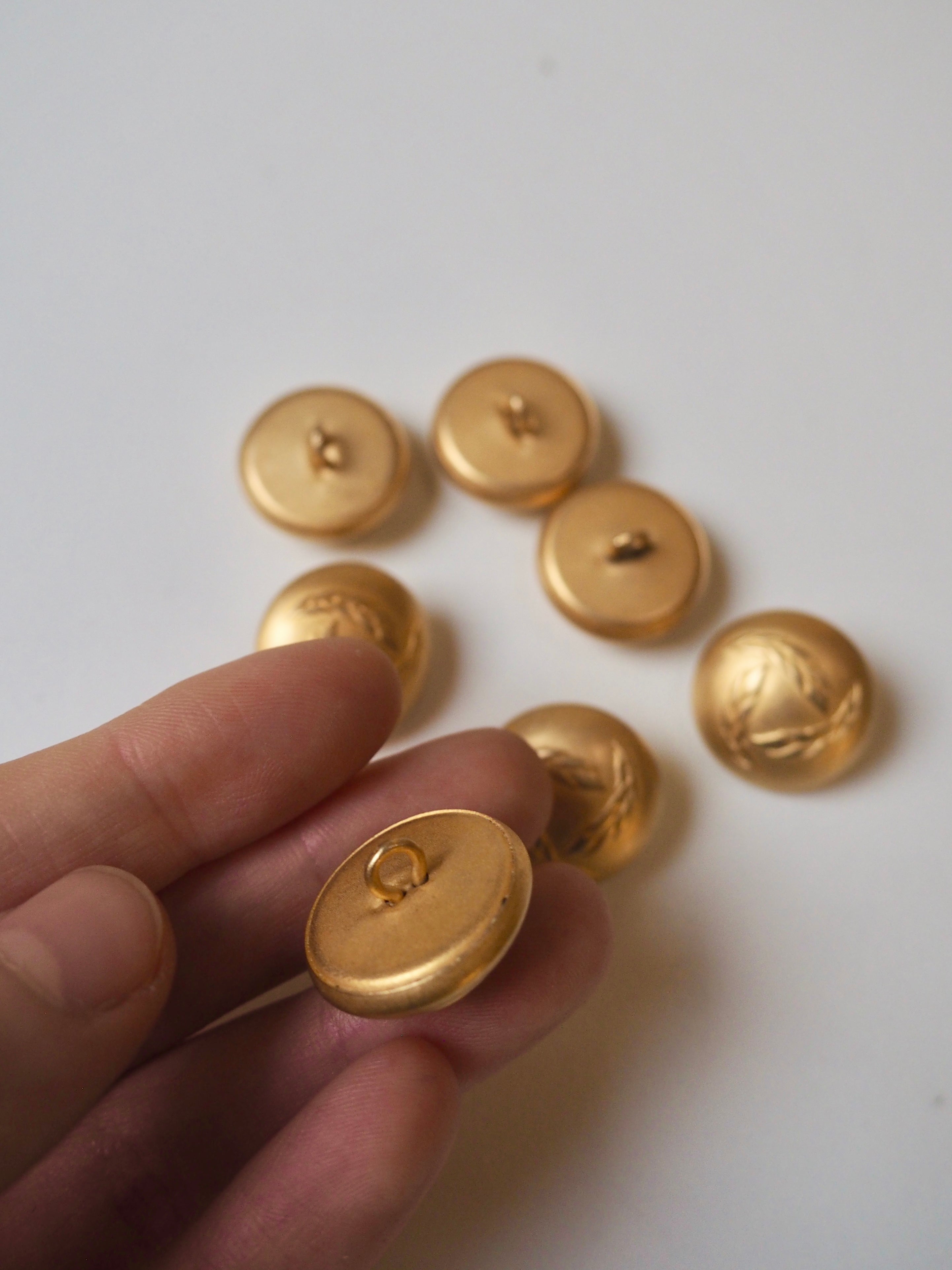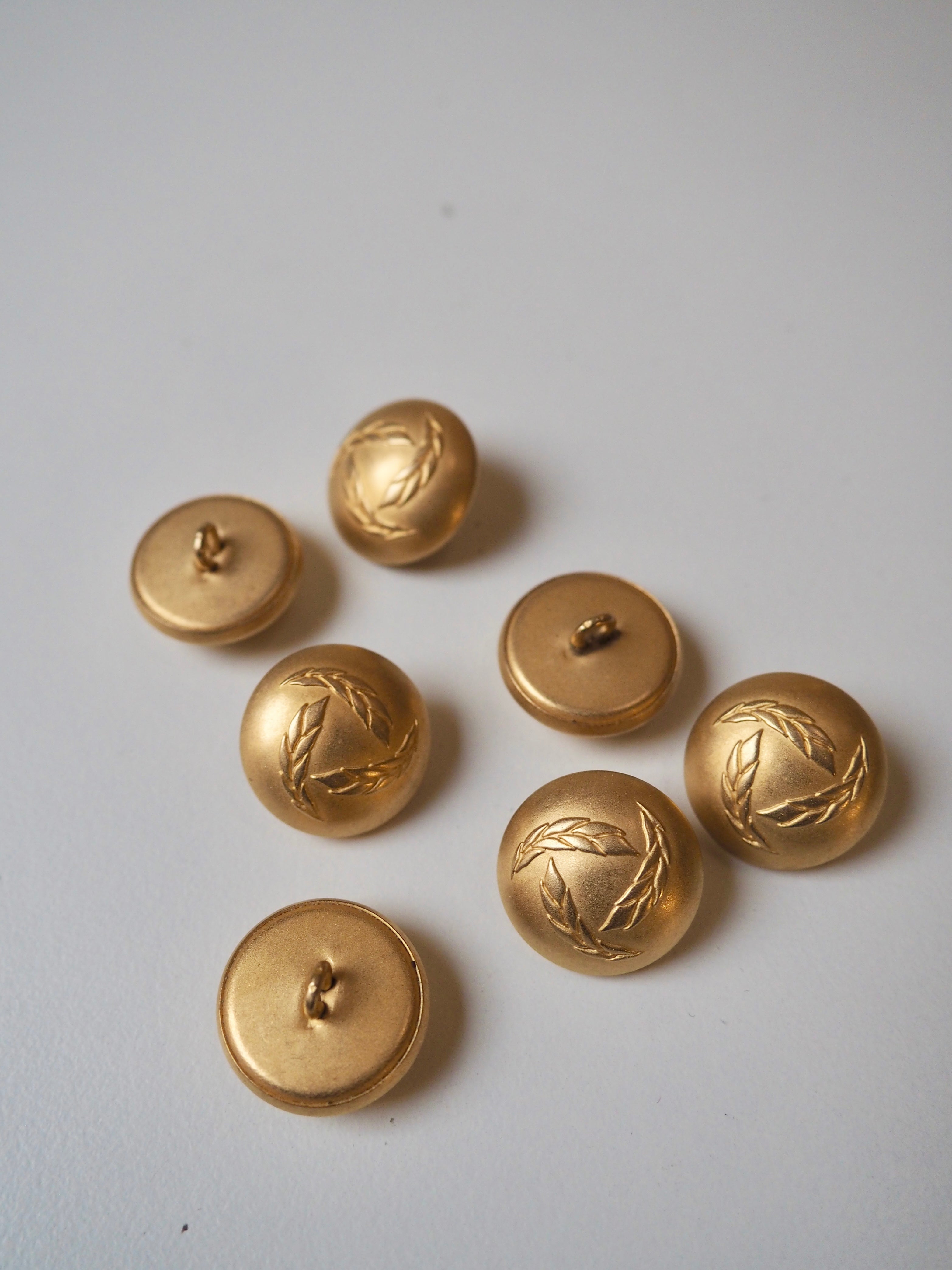 This ex-designer trim is a metal shank button. They have a vintage gold finish and the surface has a raised design of three leaves or wheat stalks. Perfect size for coats, jackets and cardigans.