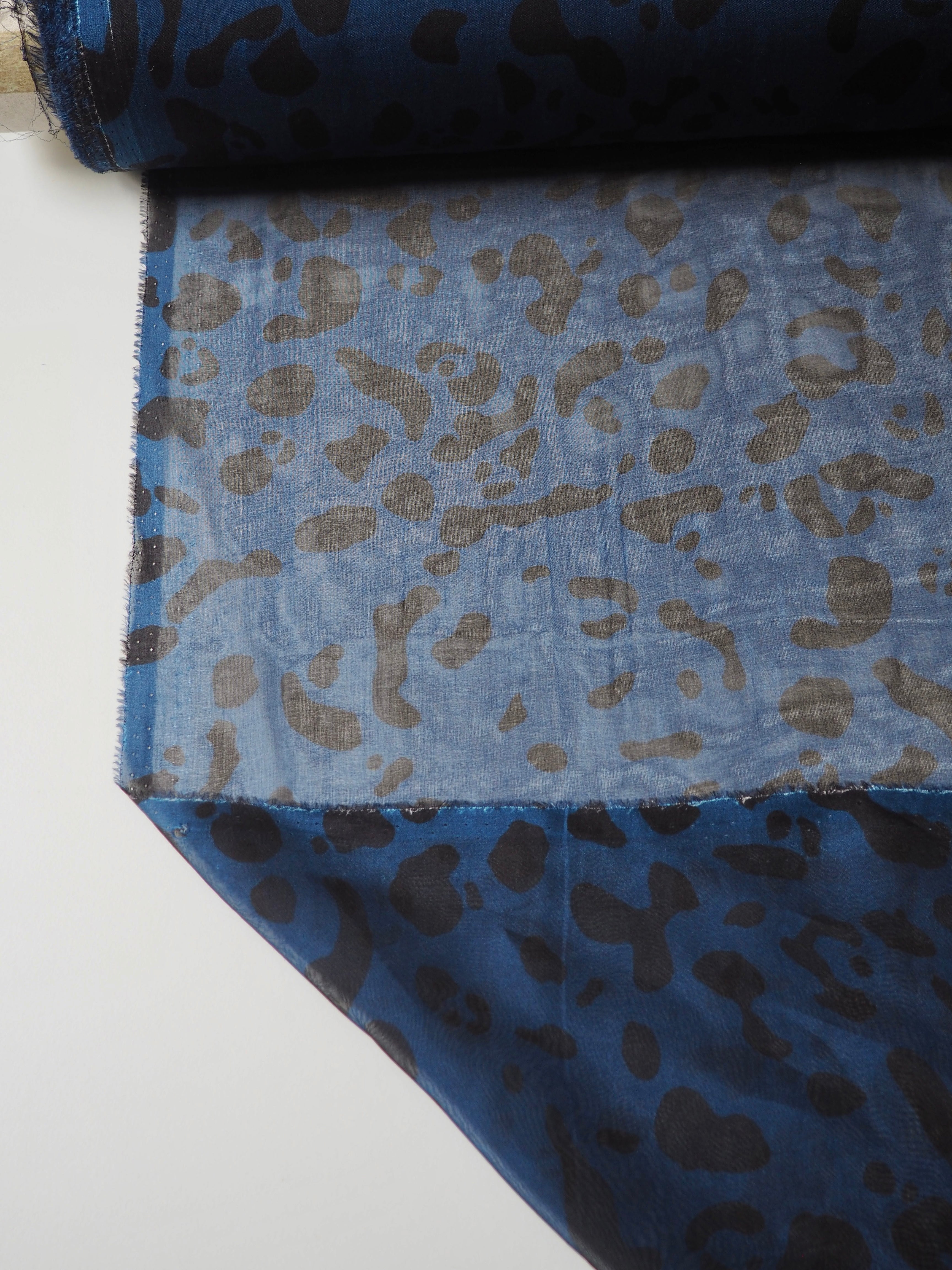 This ex-designer fabric is a lovely silk chiffon. It has a dark blue background and a black animal print. It is quite sheer but so drapey and very floaty! Has a great silky handle that feels really special. Super light and airy, great for a scarf or using for a floaty top or dress!