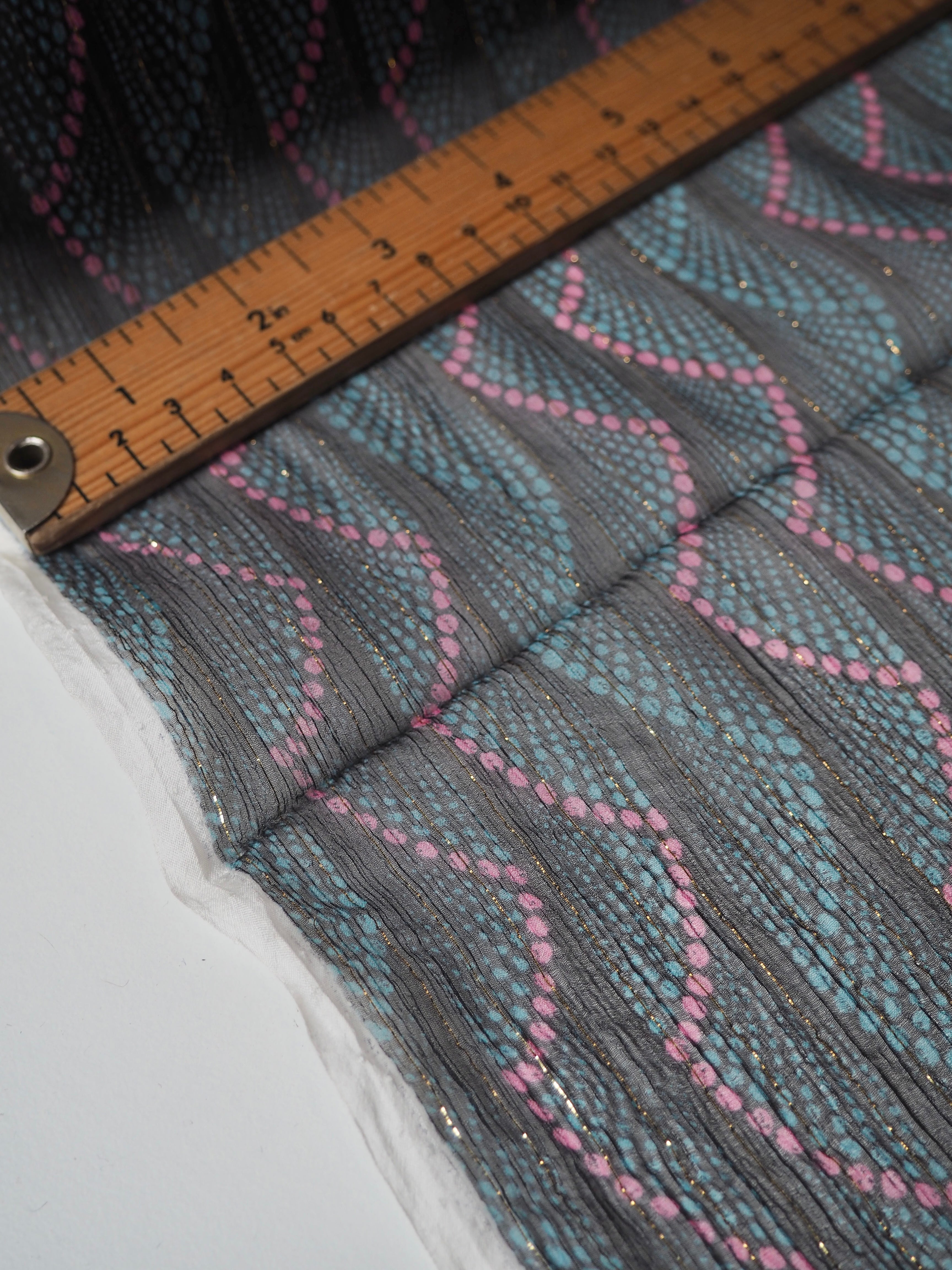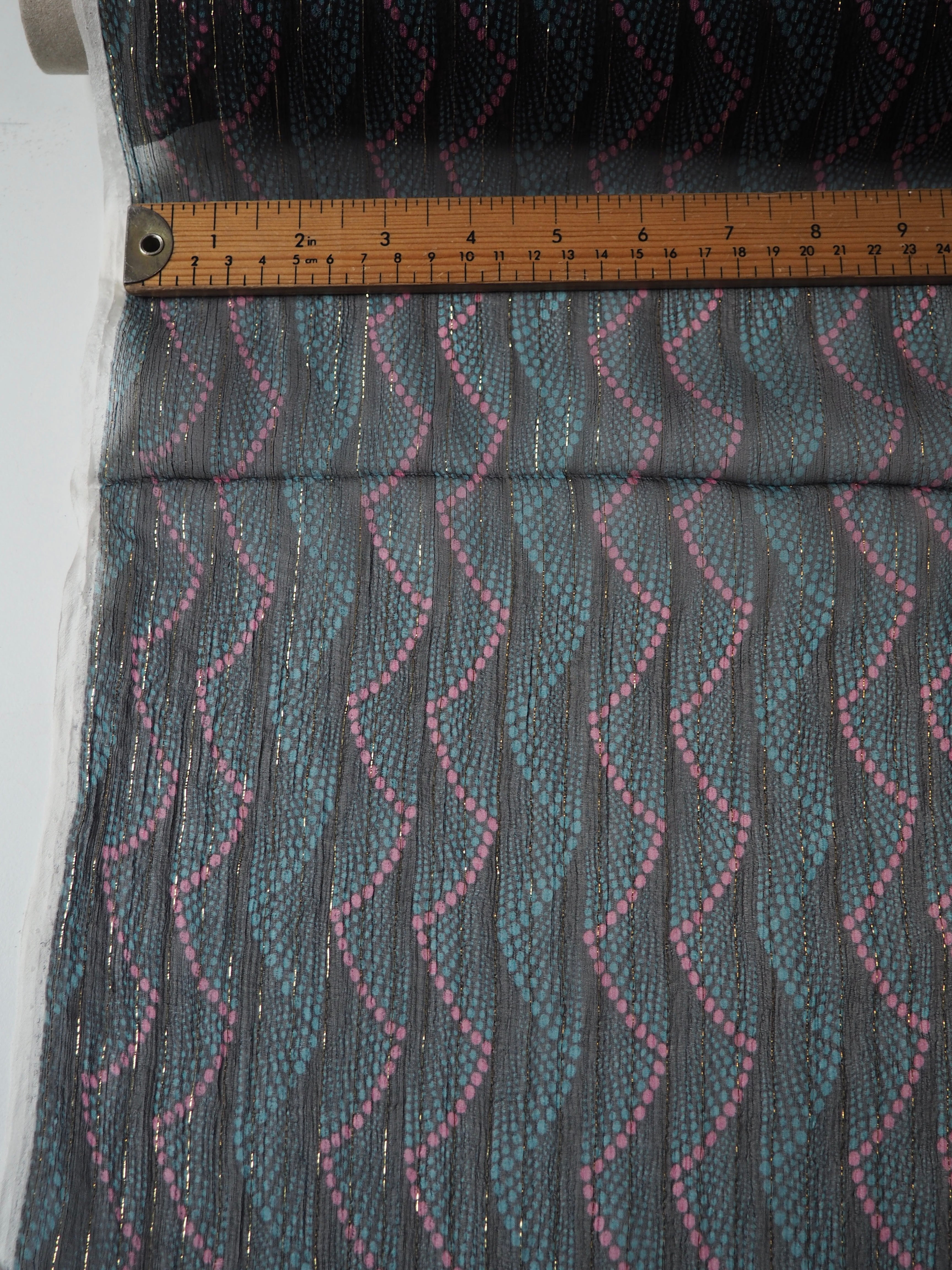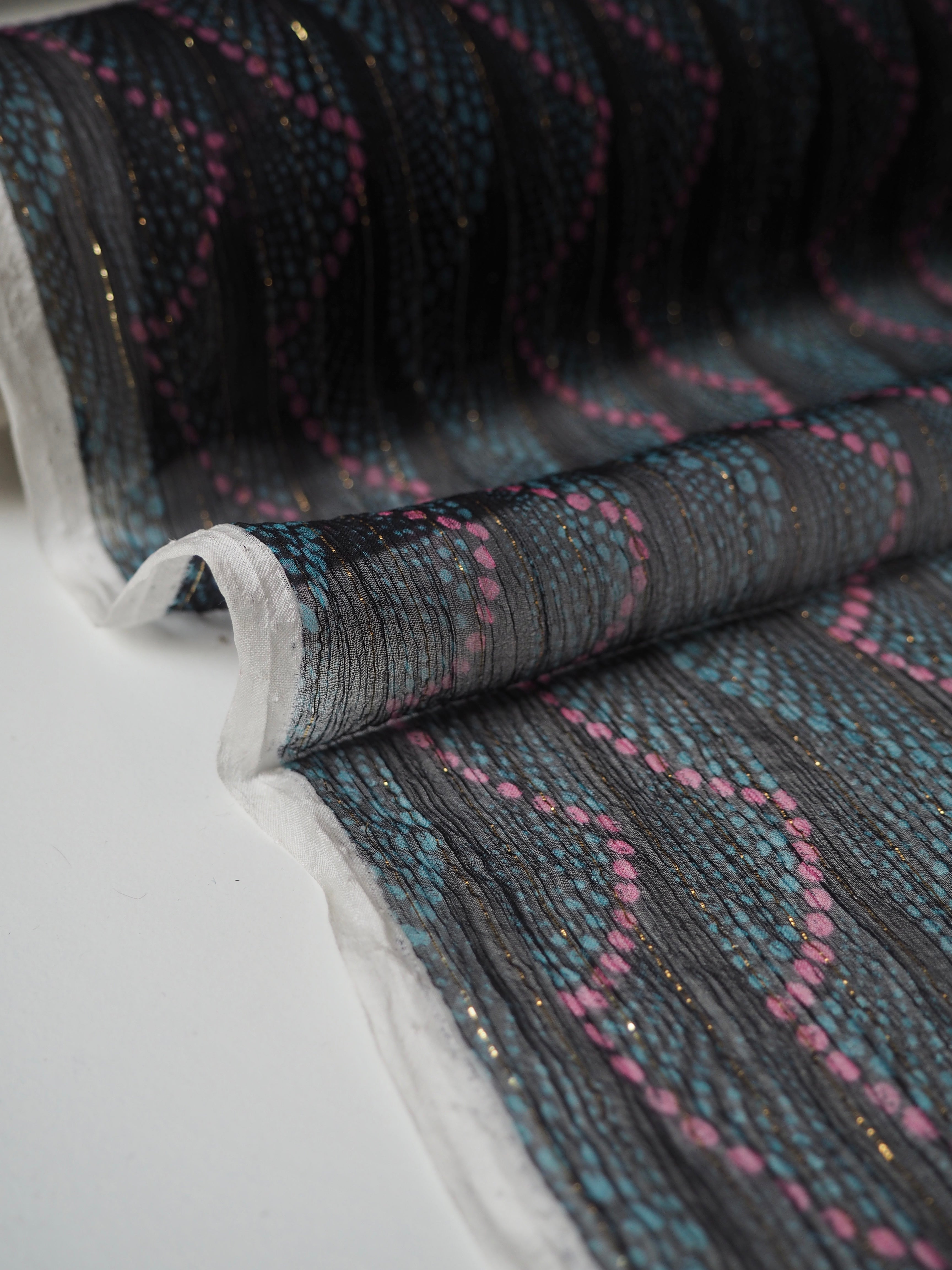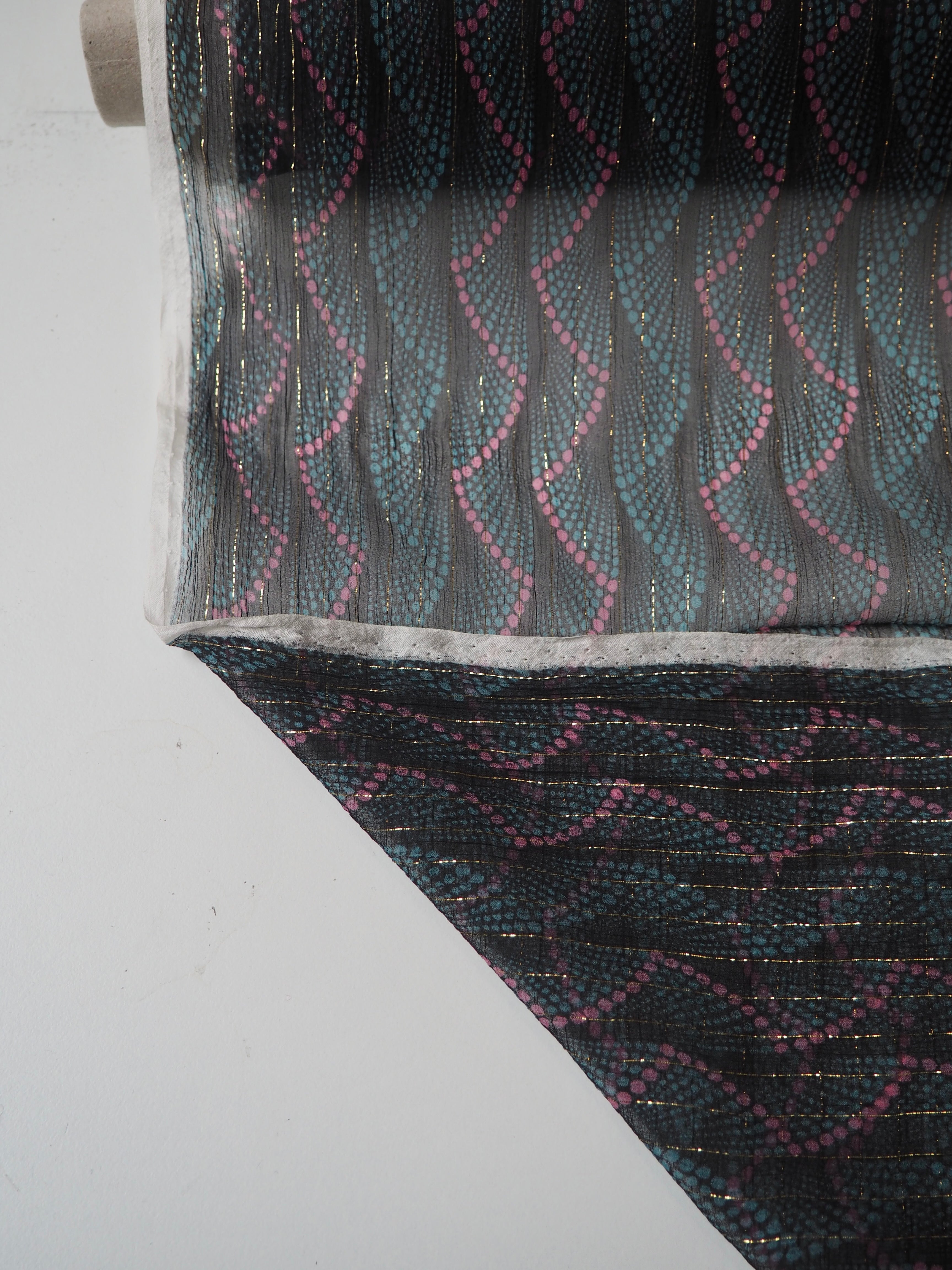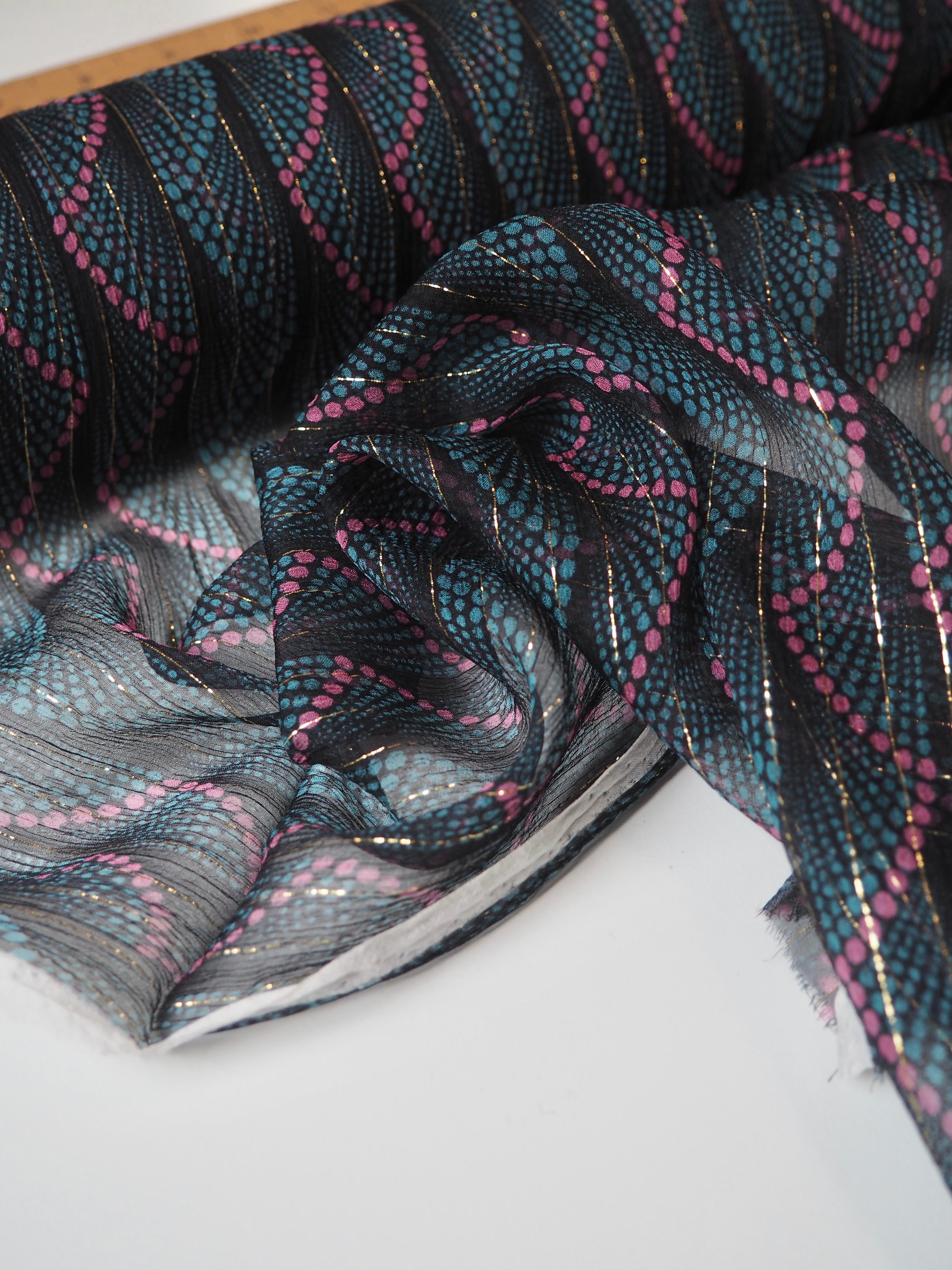 This ex-designer fabric is a lovely silk chiffon. In a dotted stripe design, with a gold lurex thread running along the pattern down the warp. It's very sheer, with incredible movement, and catches the light so well! Has a great silky handle with a subtle crepe-like texture. Super light and airy, ideal for scarves, or using for a floaty top or dress!