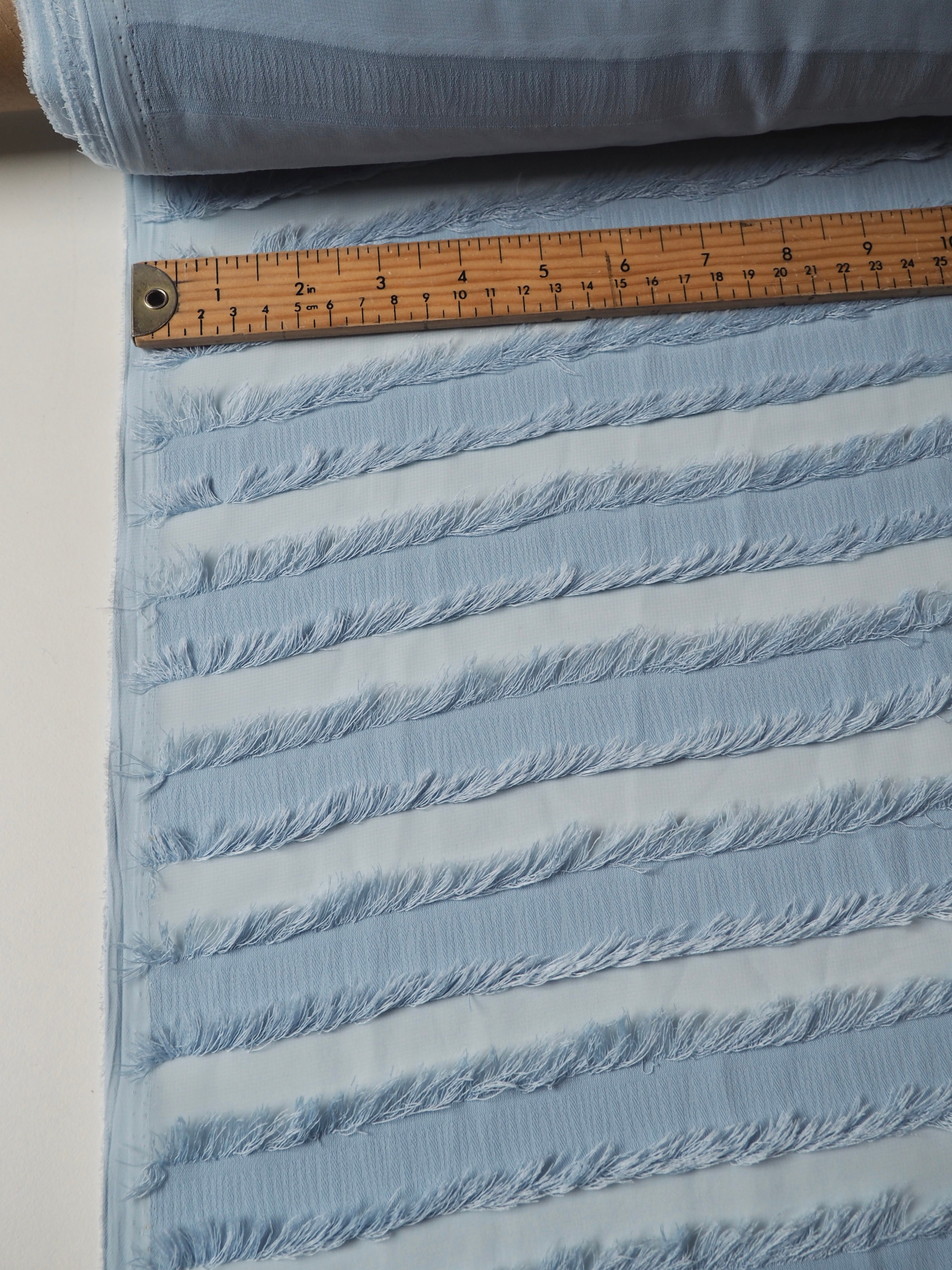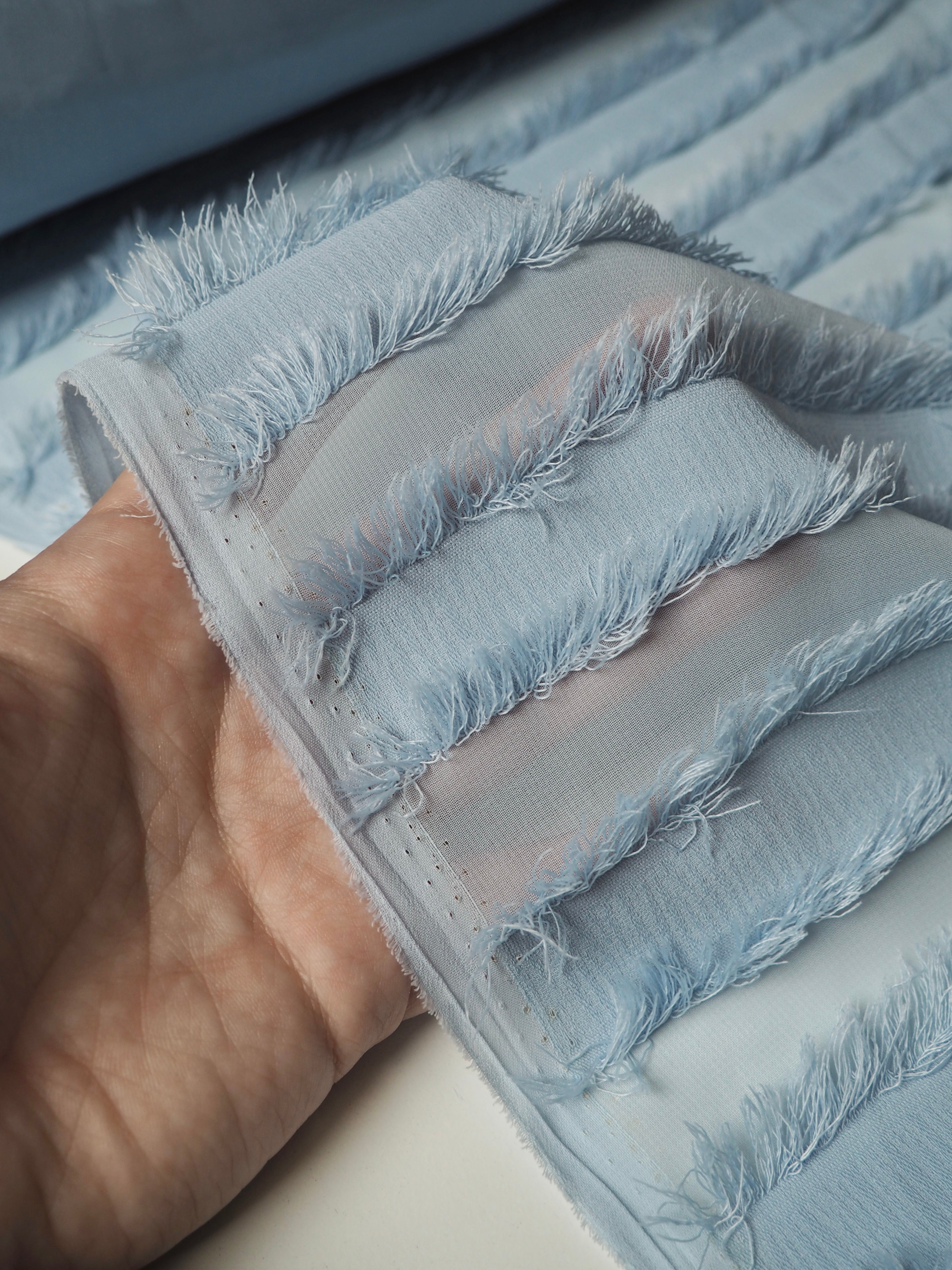 This ex-designer fabric is a stripe and fringe chiffon. It's in a light blue shade, with a stripe weave and fringed edge. Lightweight with a gorgeous airy drape. Has a very soft handle. Such a unique cloth that feels and looks so cool! Wonderful movement! Would look amazing as a blouse or as the overlay of a dress!
