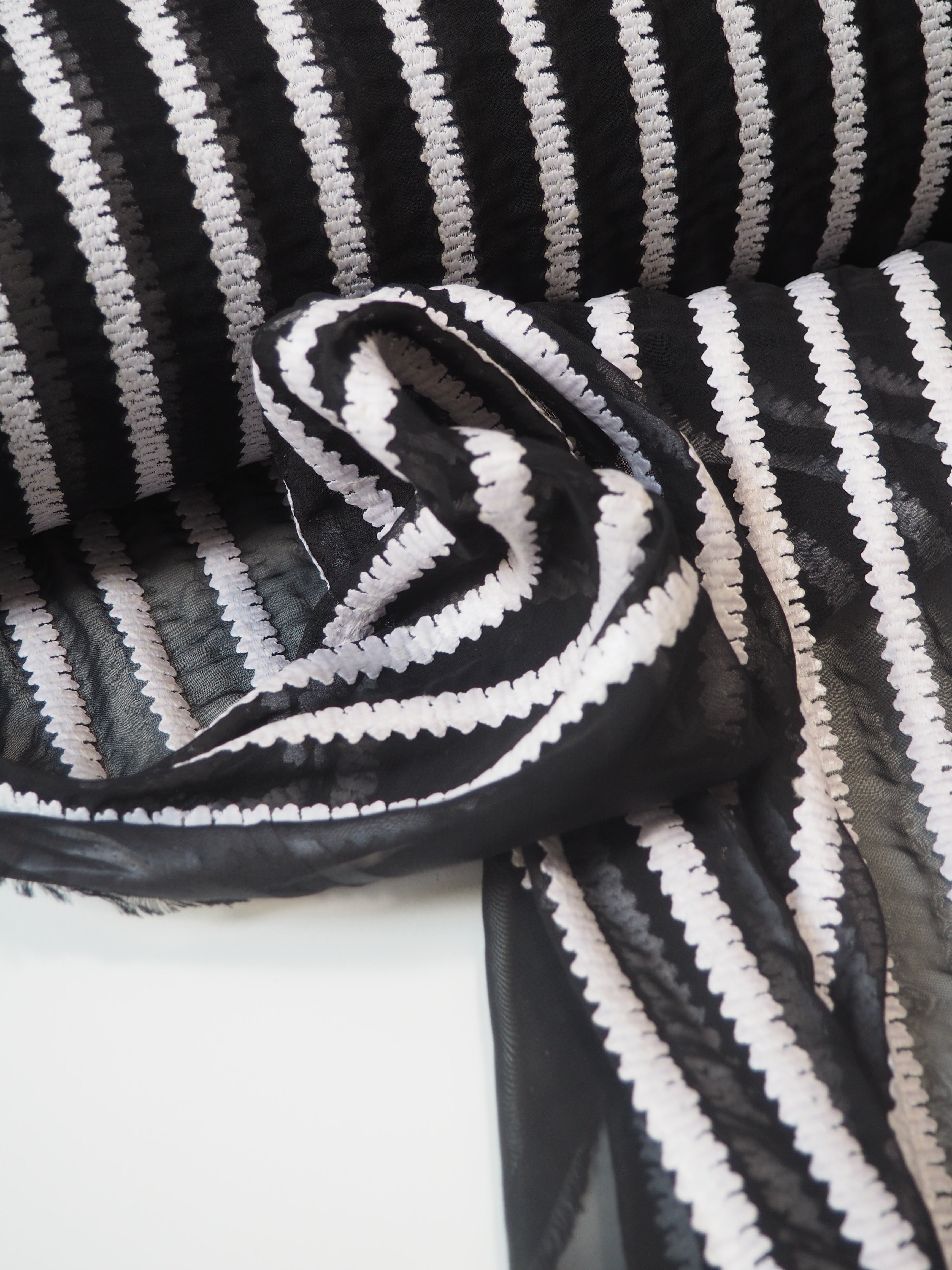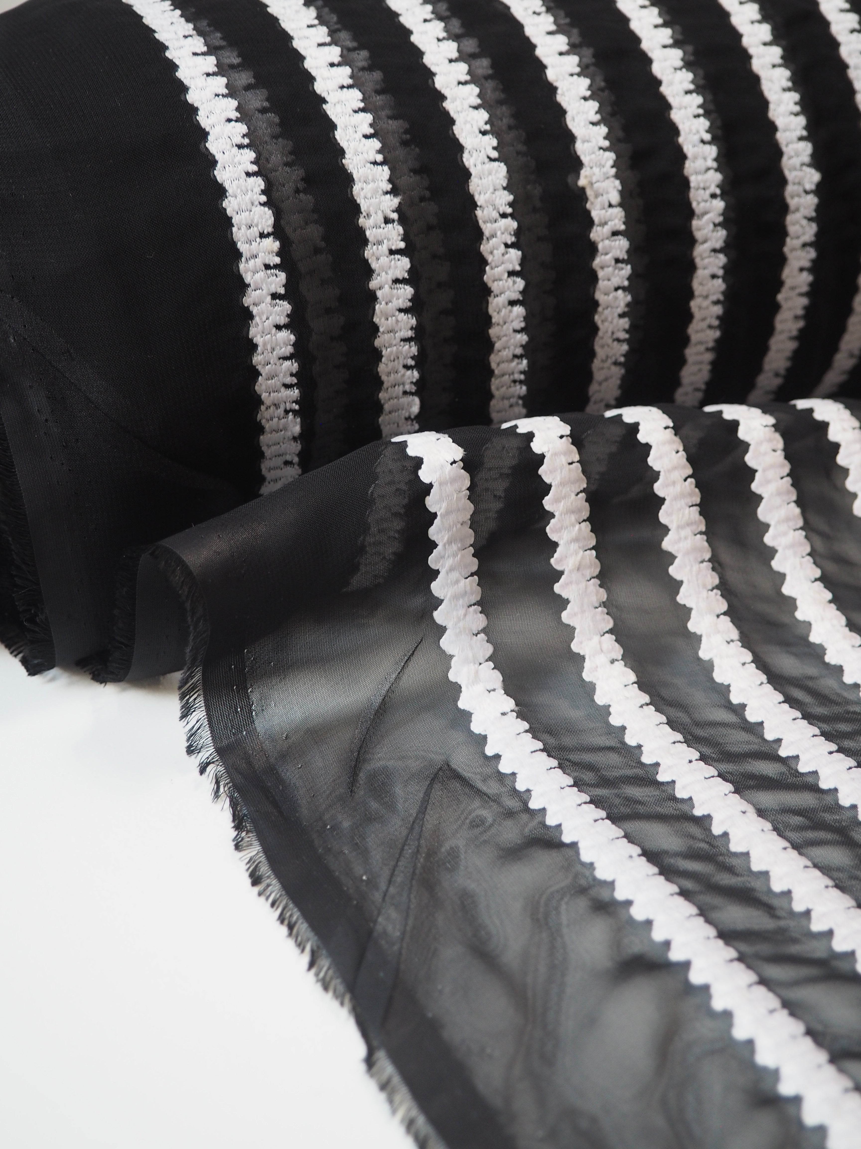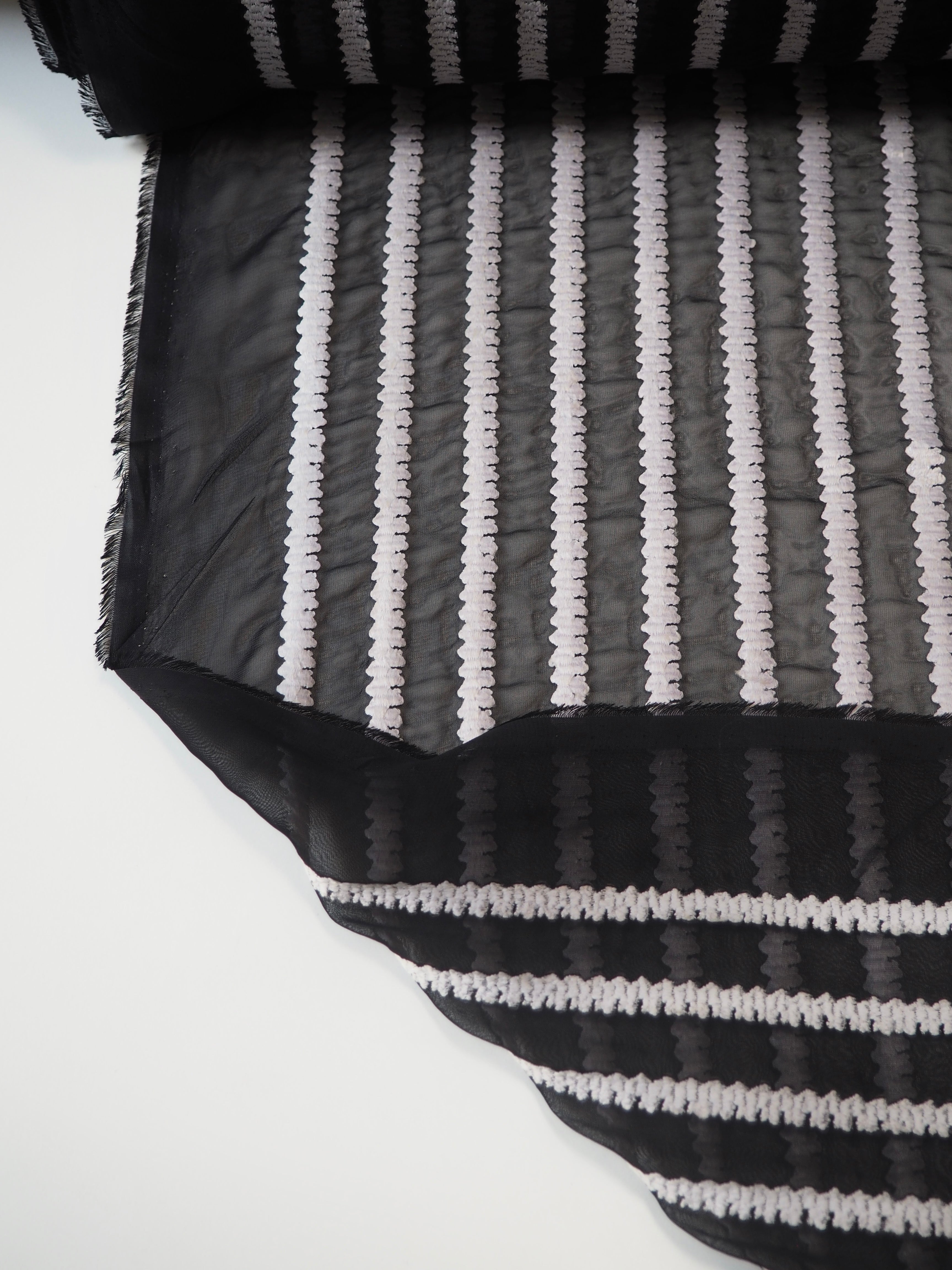 This ex-designer fabric is a unique chiffon. It's a black chiffon with a white heavy embroidered stripe, which looks like a braid, down the warp. It's semi-sheer, medium weight, and has an interesting drape with a bit of structure from the stripes. Has an interesting handle that reflects the visual texture. Would make such a cool dress or top overlay, or even curtains!