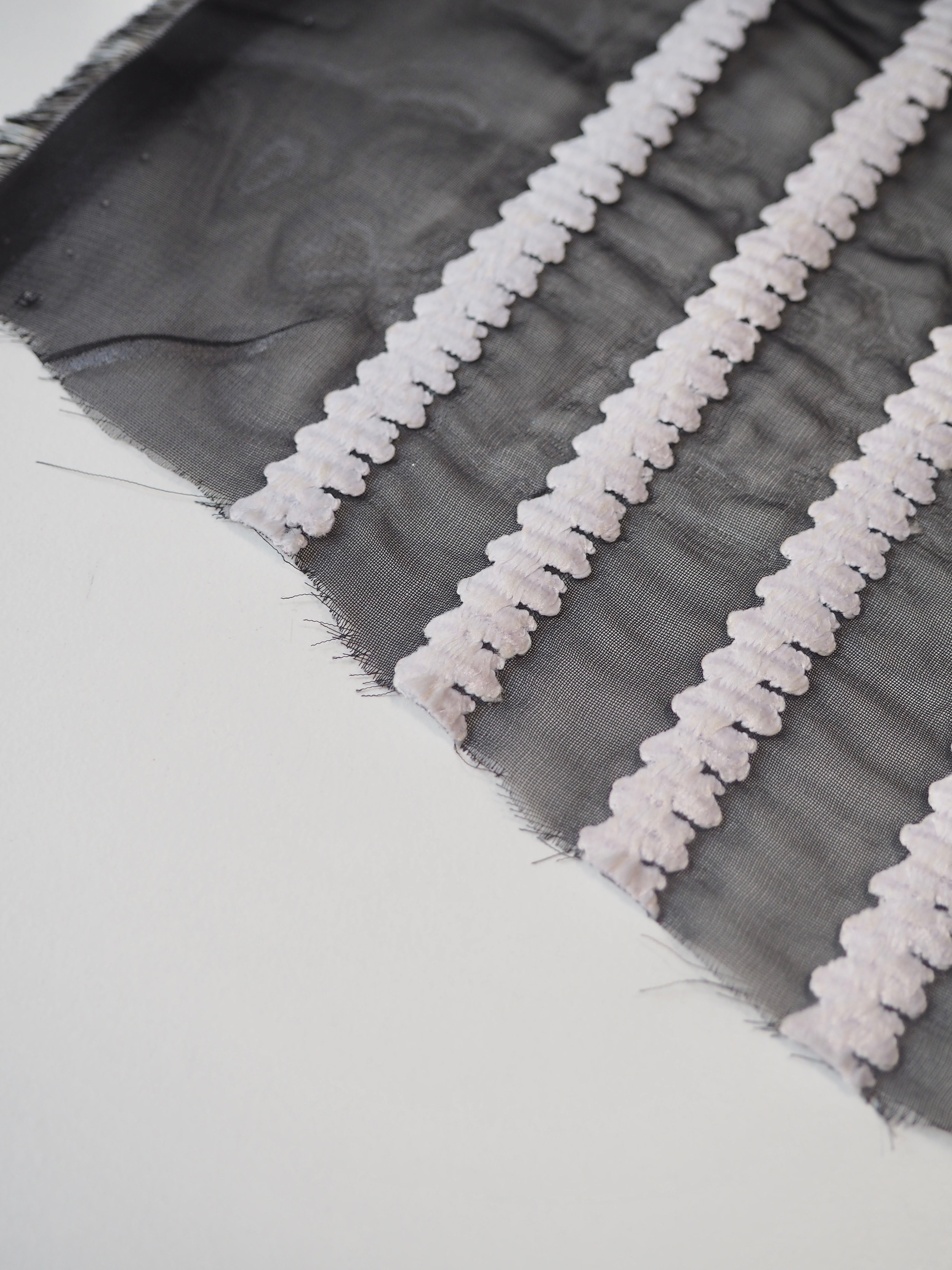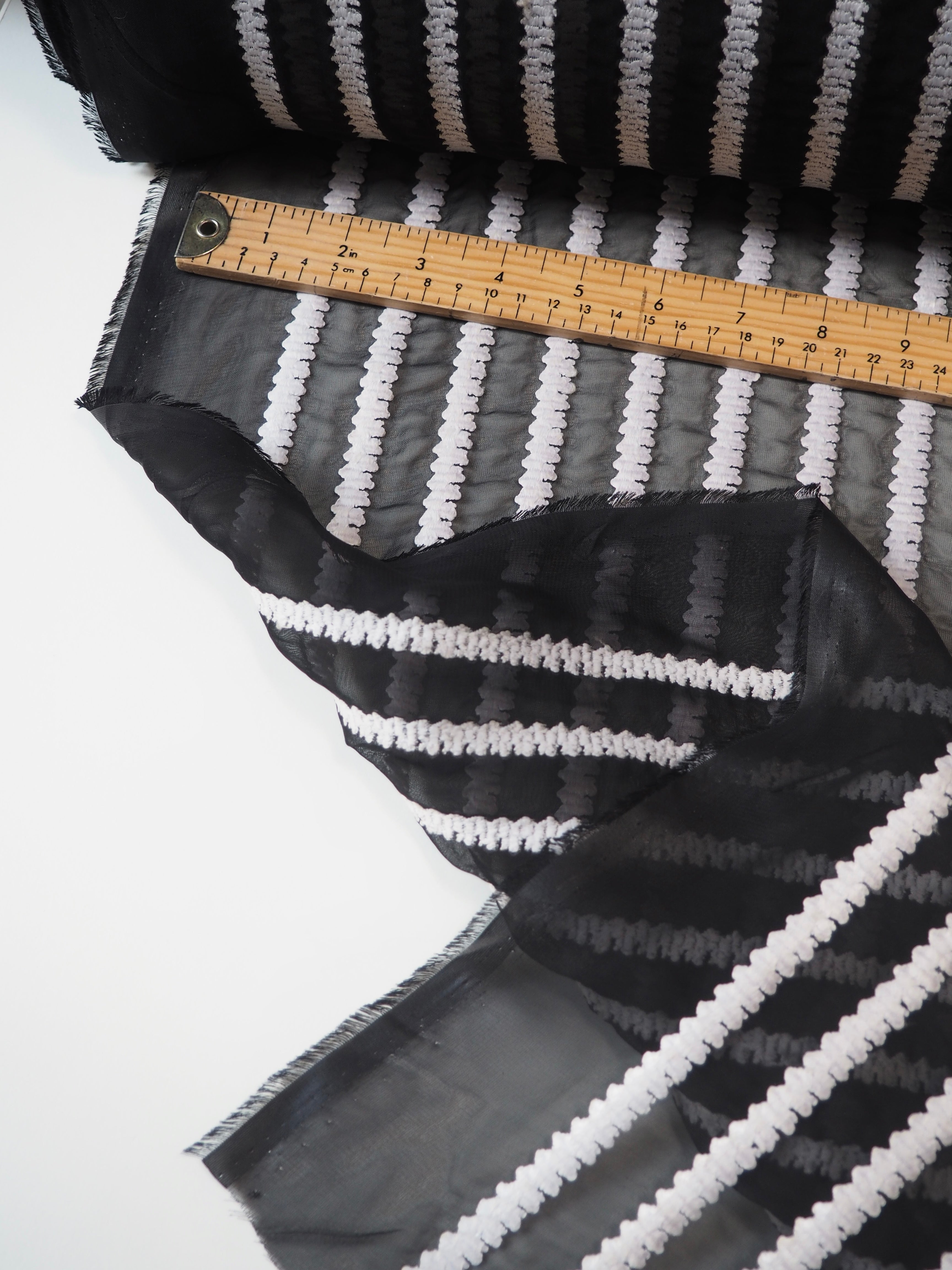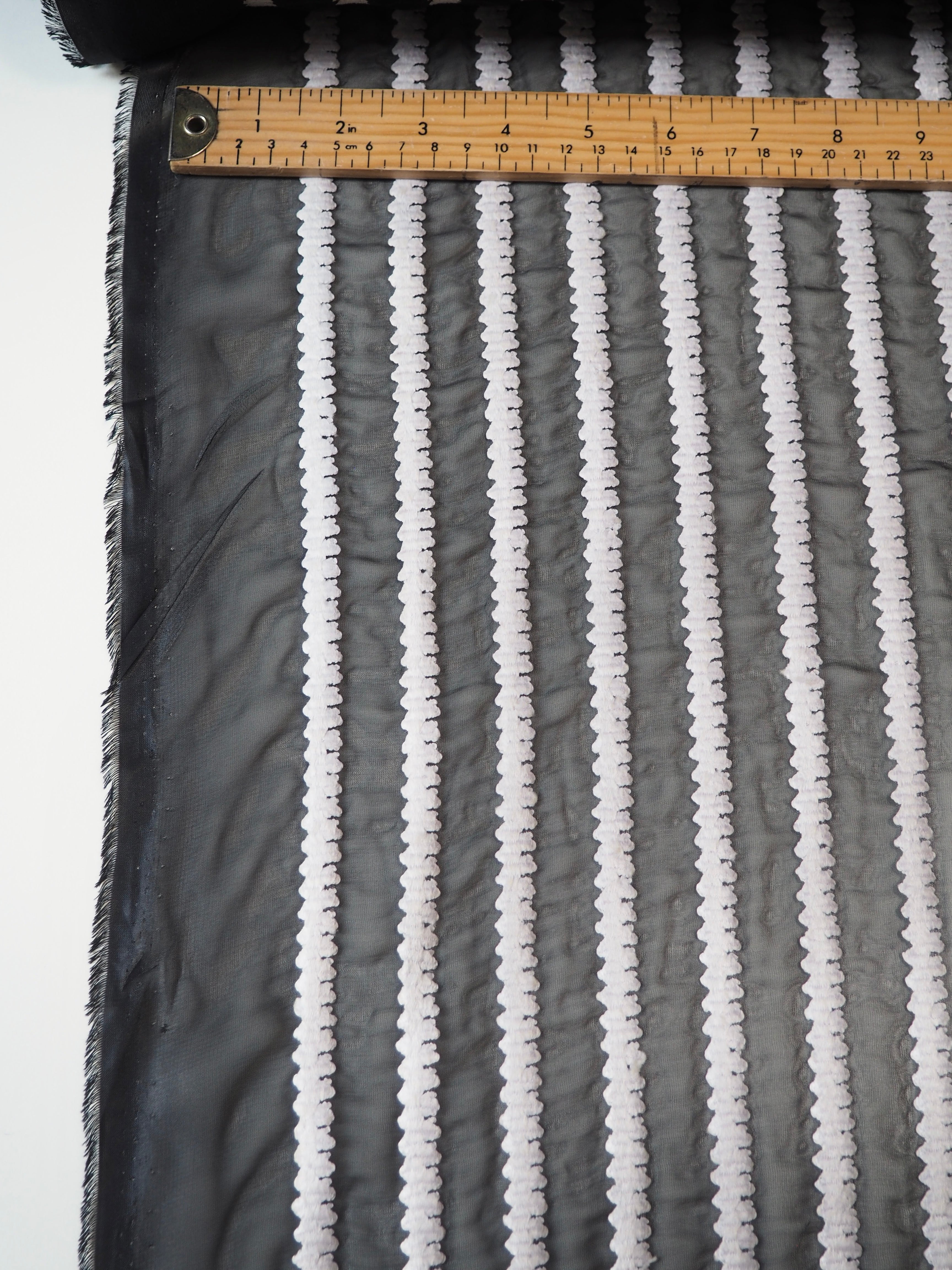 This ex-designer fabric is a unique chiffon. It's a black chiffon with a white heavy embroidered stripe, which looks like a braid, down the warp. It's semi-sheer, medium weight, and has an interesting drape with a bit of structure from the stripes. Has an interesting handle that reflects the visual texture. Would make such a cool dress or top overlay, or even curtains!