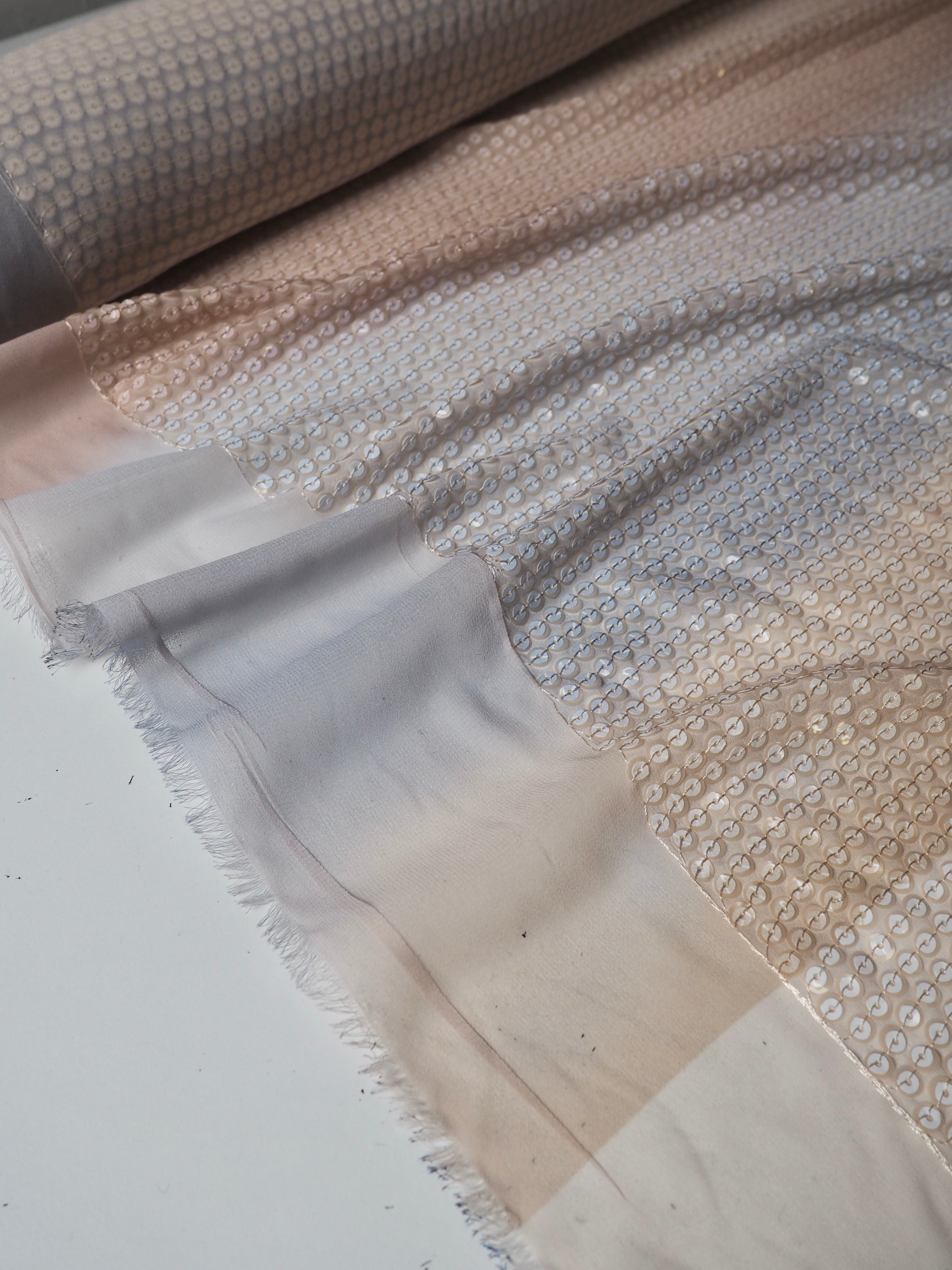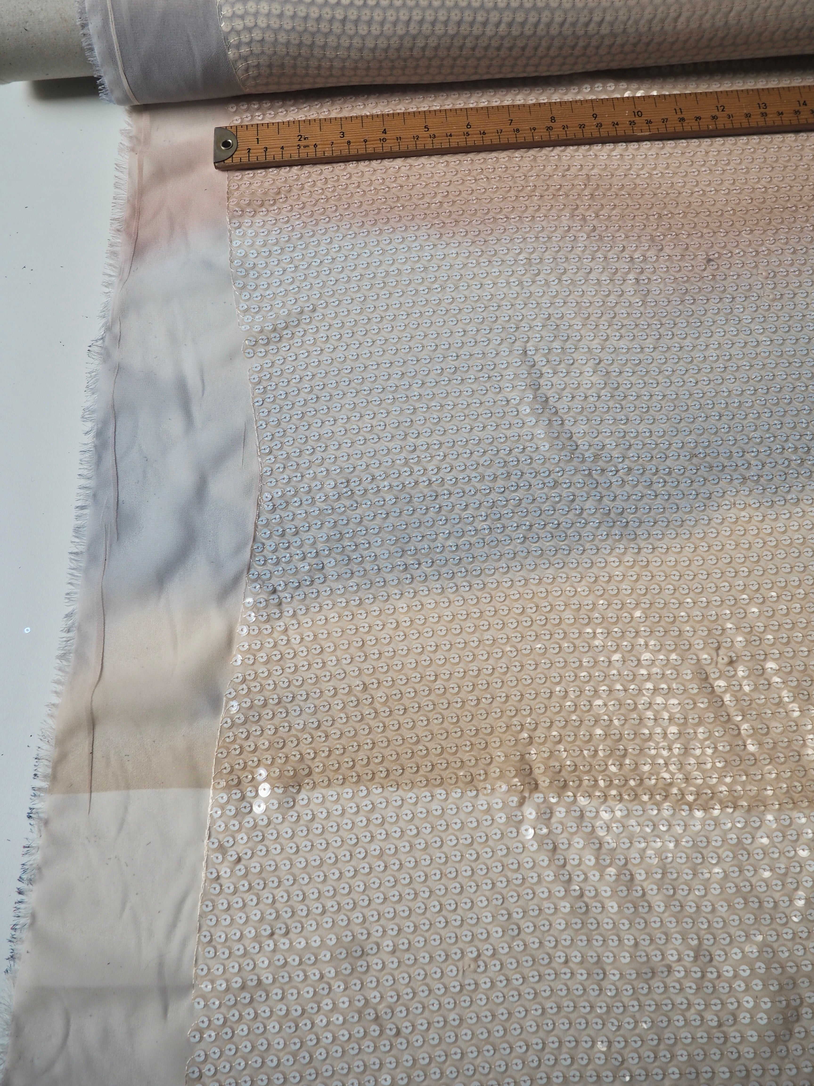 This ex-designer fabric is a sequin chiffon. Shiny white sequins are woven in stripes onto this ombre chiffon. It's really unique, with great movement and a beautiful drape. Lightweight, most opaque with the sequins, and very colourful. Has a nice gentle handle. Would be perfect for a party dress or skirt!
