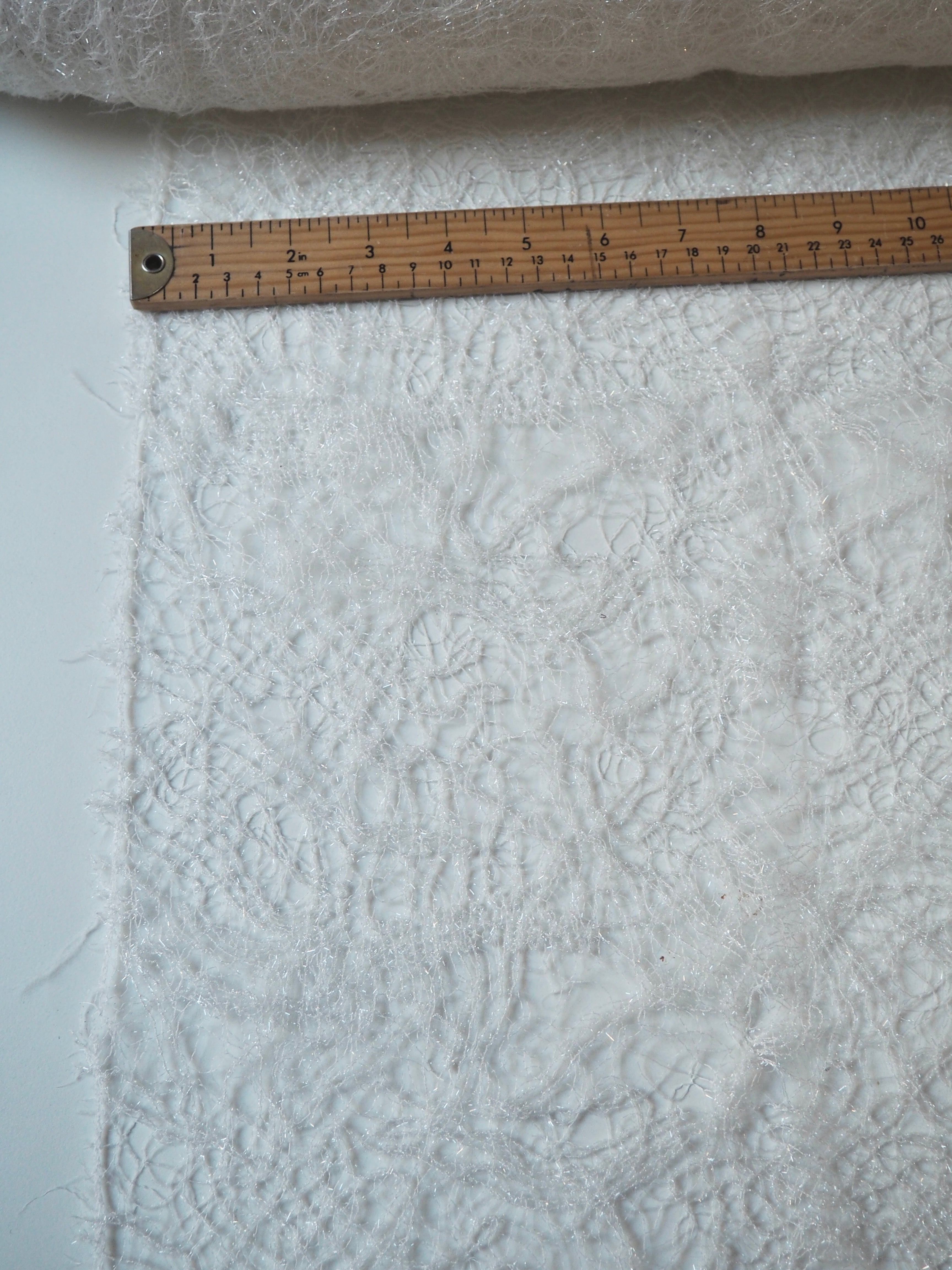 This incredible white lace fabric is made up of fine delicate strands of white and silver. With a subtle sparkle and a pure white colour, this would be perfect for a bodice or skirt overlay on a bridal dress. Amazing quality, unusual fabric. Sourced from a high-end bridal designer.