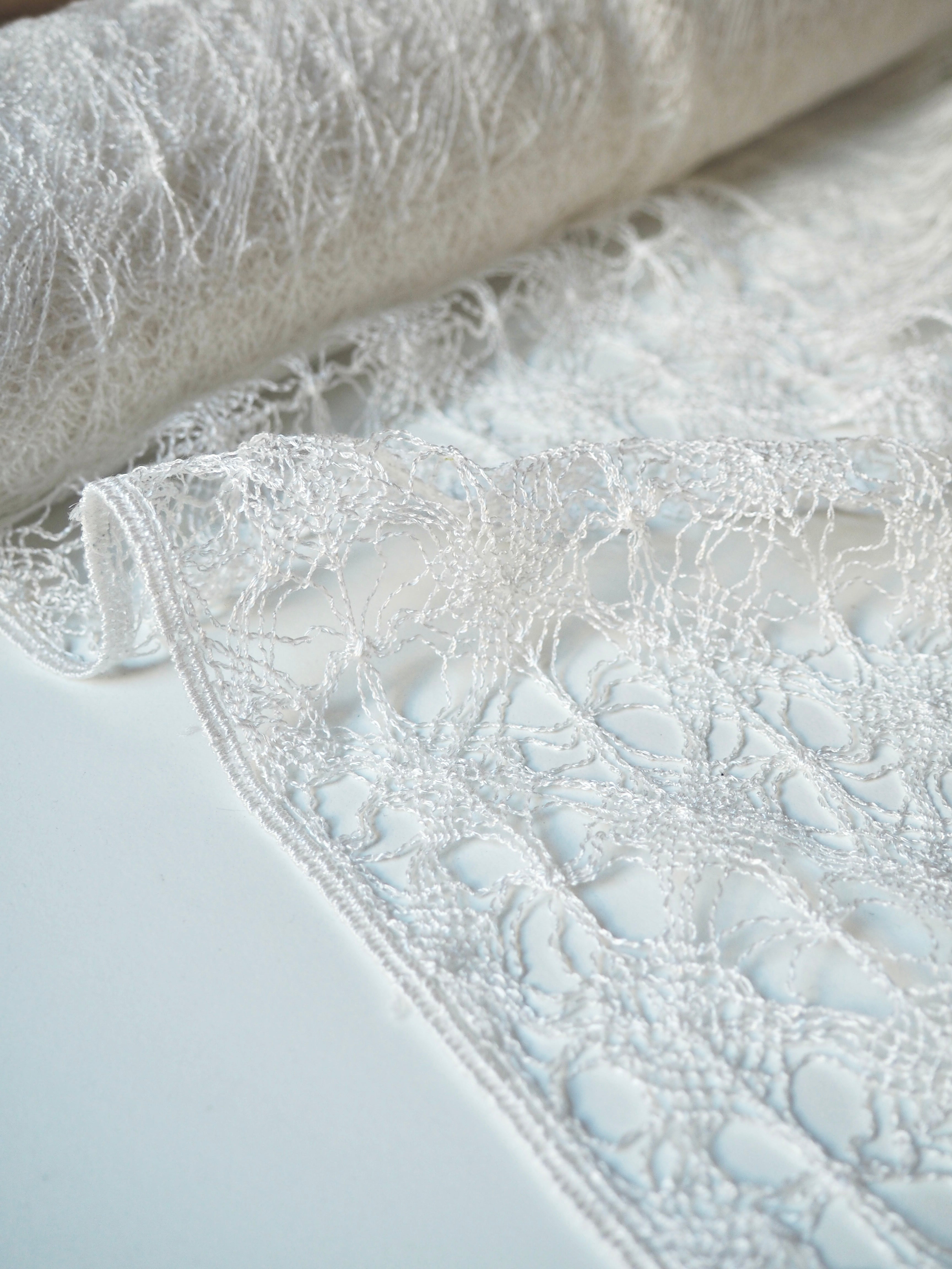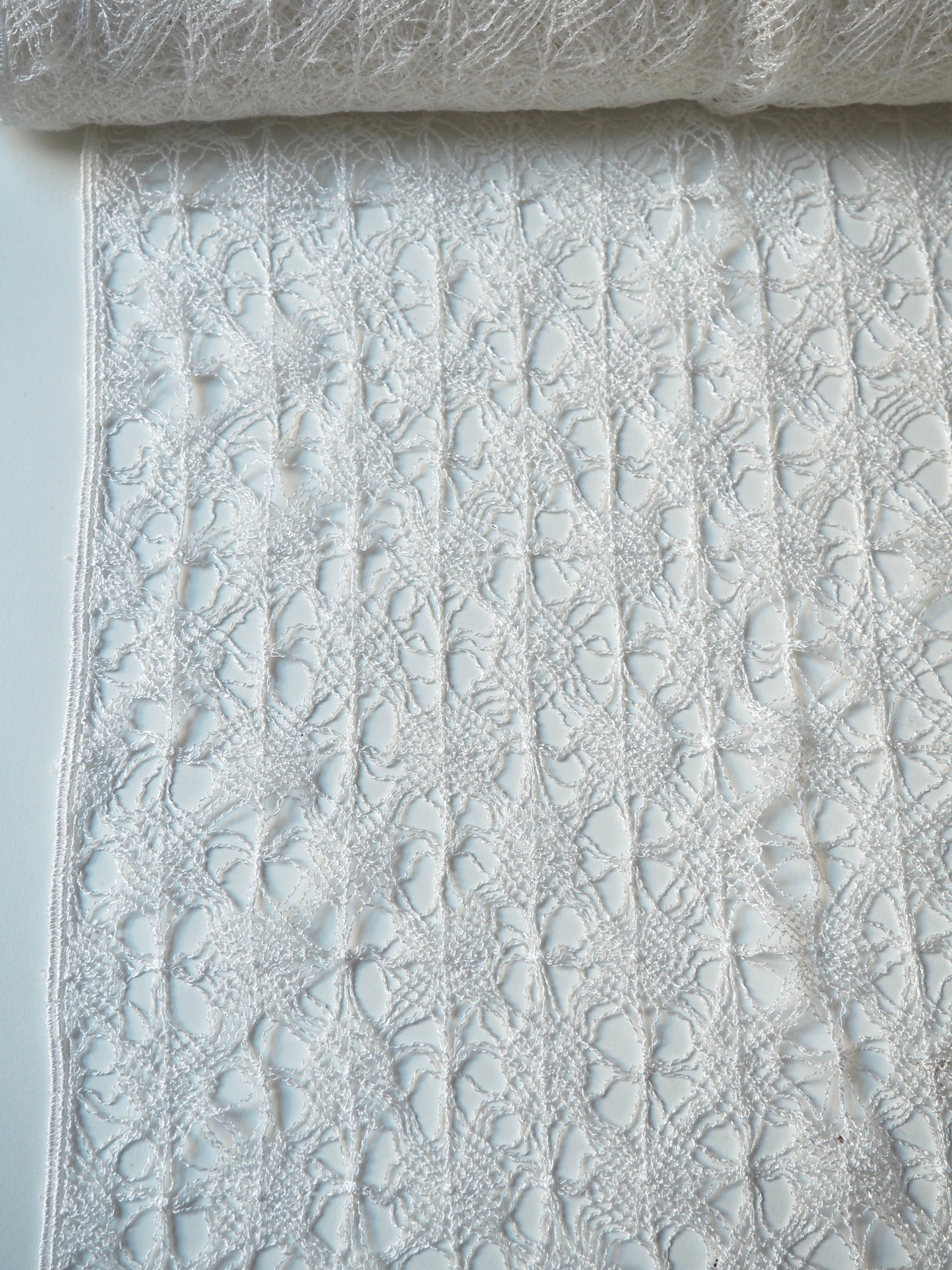 This incredible white lace fabric is made up of fine delicate strands of white in a square web-like design. The threads have a slight sheen which gives a beautiful lustre to the finish. This would be perfect for a bodice or skirt overlay on a bridal dress. Amazing quality, unusual fabric. Sourced from a high-end bridal designer.