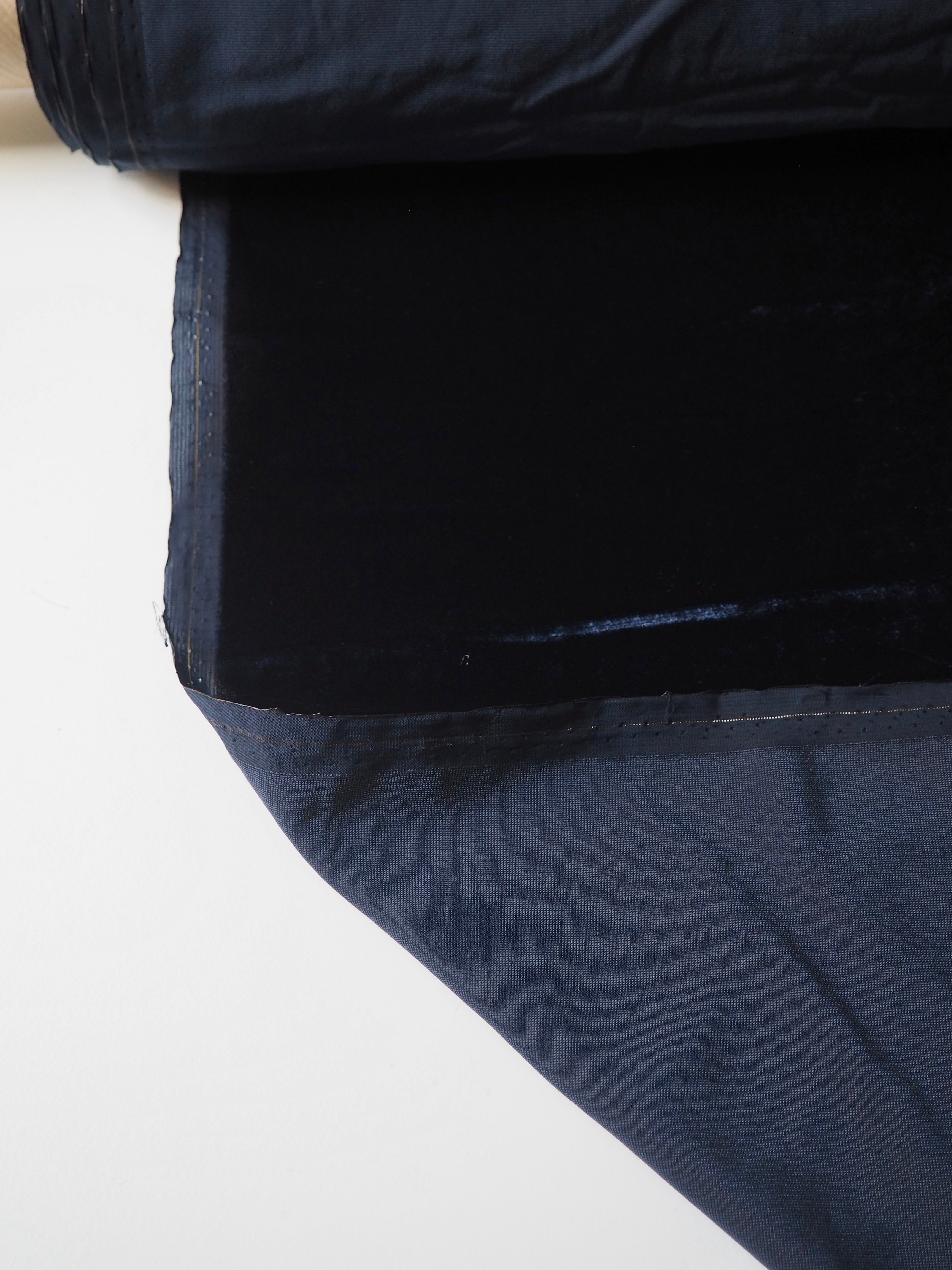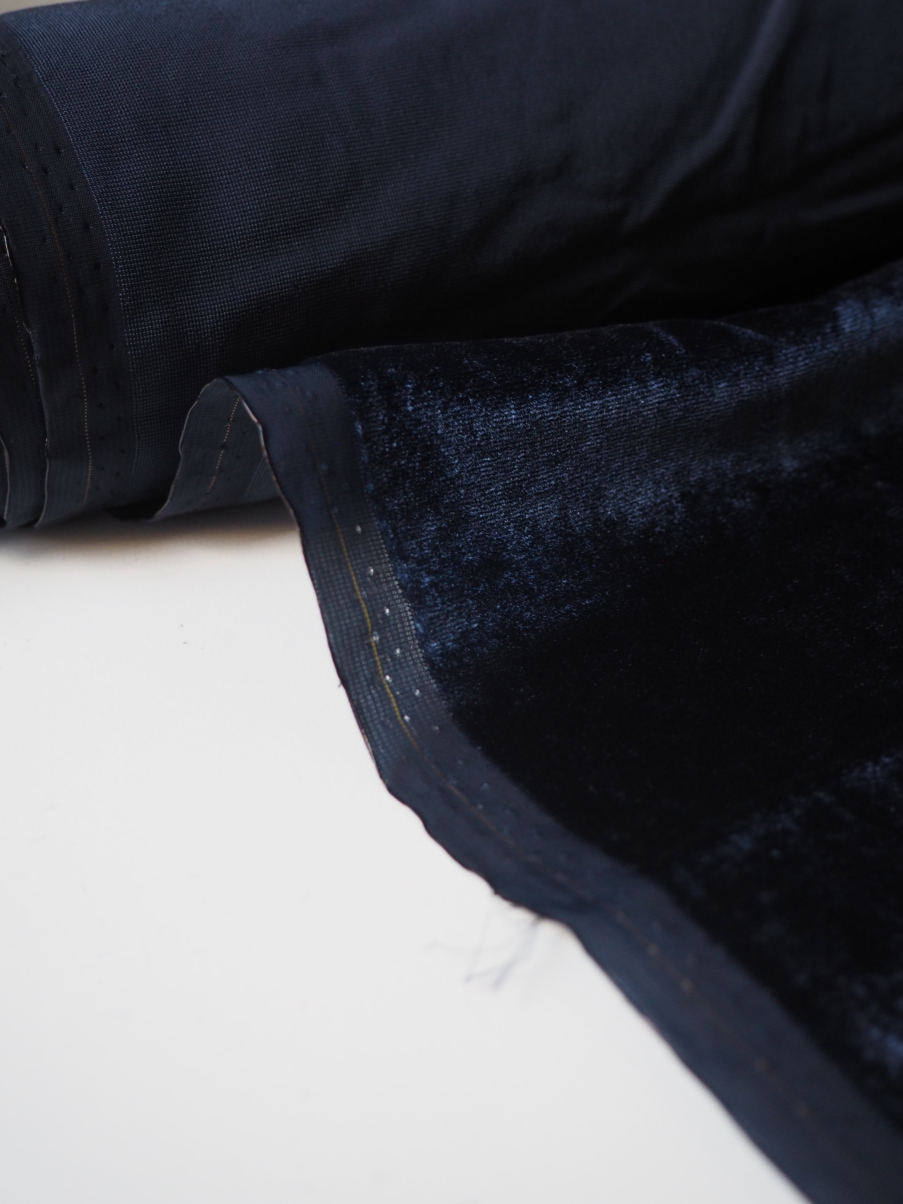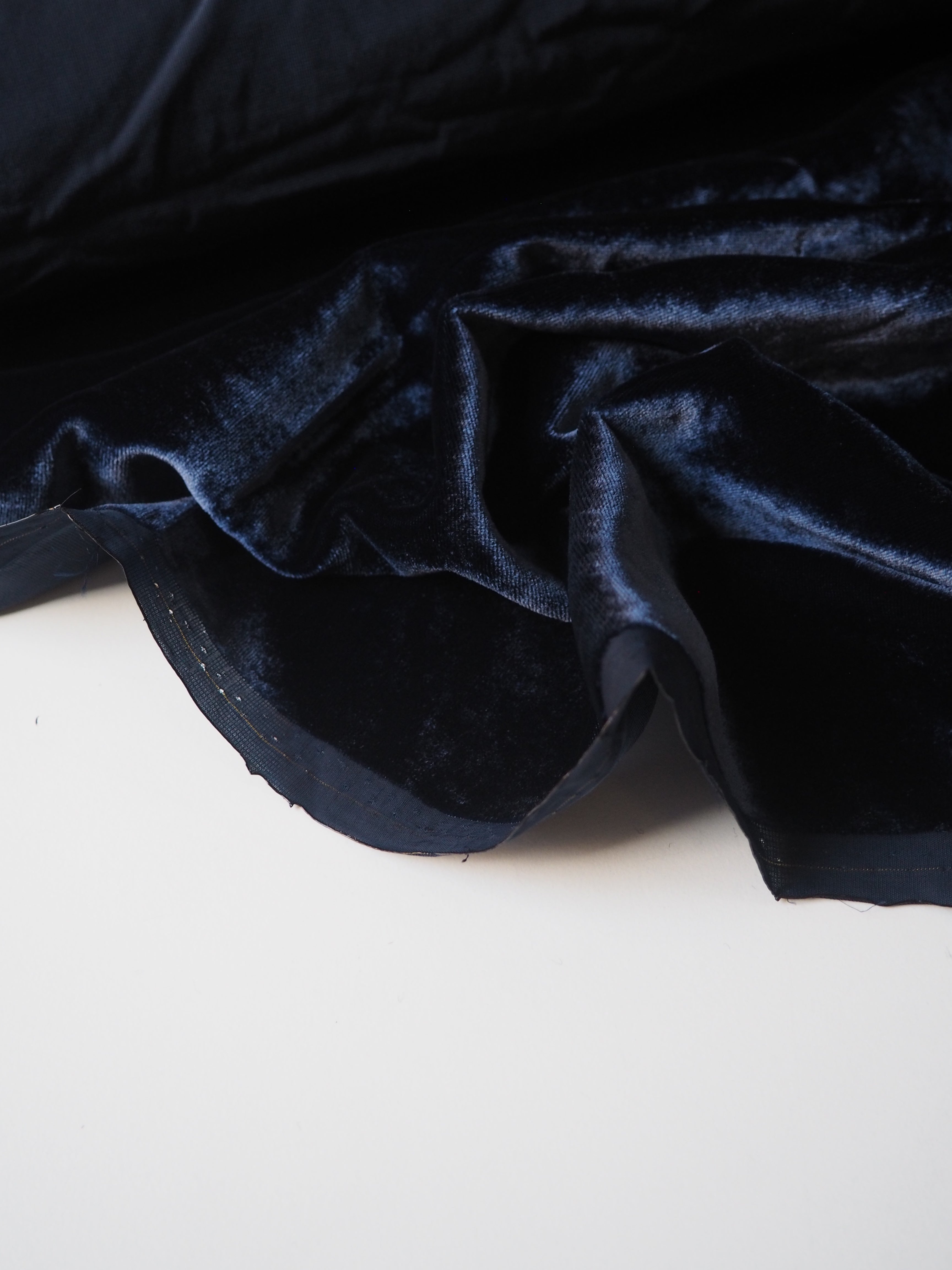 This ex-designer fabric is a sumptuous velvet. It's incredibly soft and luxurious. It has a slightly crushed finish, it came from the designer in a box, so the pile has slight pressure marks. This should revive with steam and brushing! It's opaque, with such a beautiful sheen. Has a light to medium pile that is wonderful to handle. Lightweight and with a beautiful drape and lovely movement. Perfect for a dress or even a blouse!