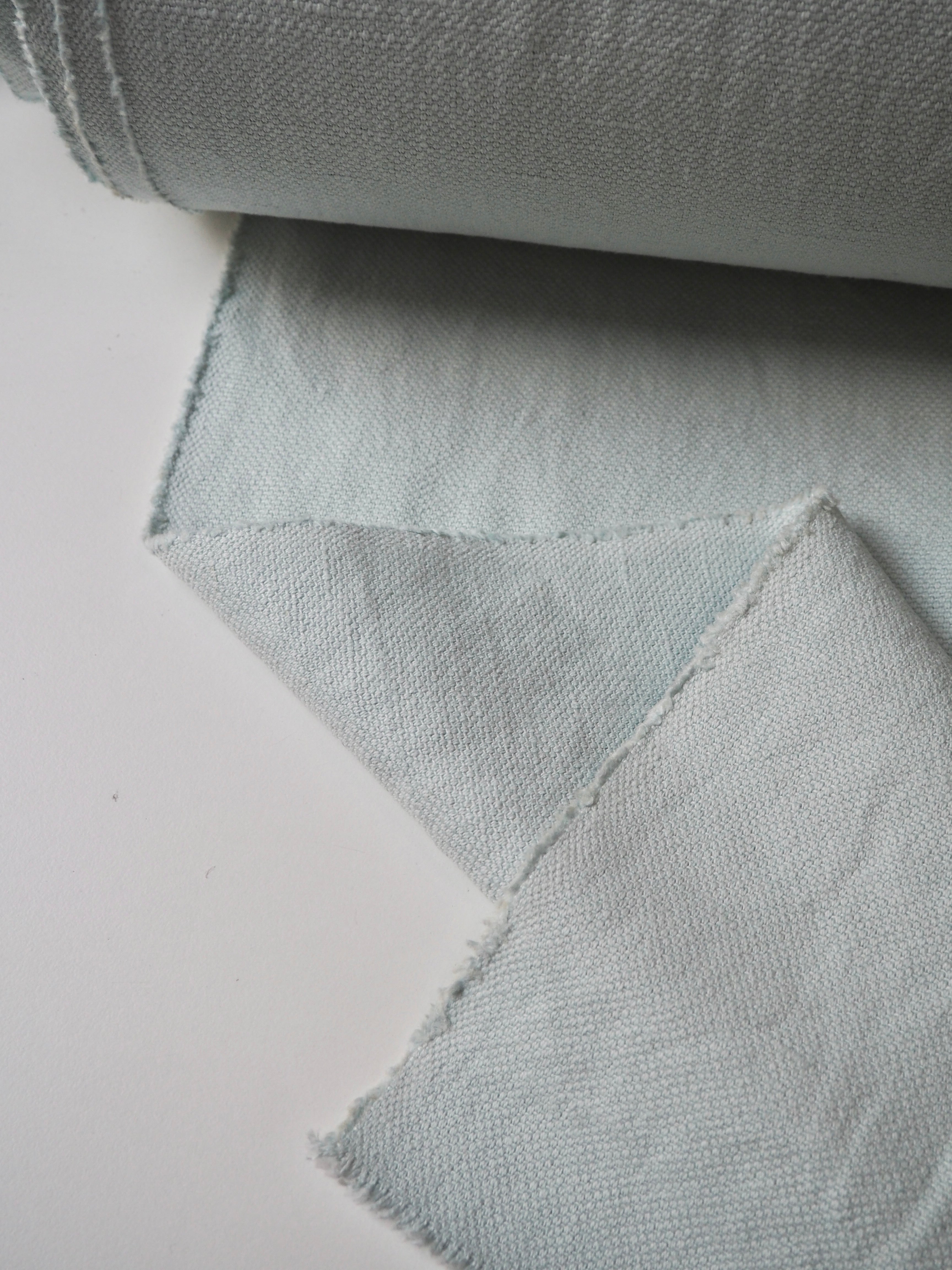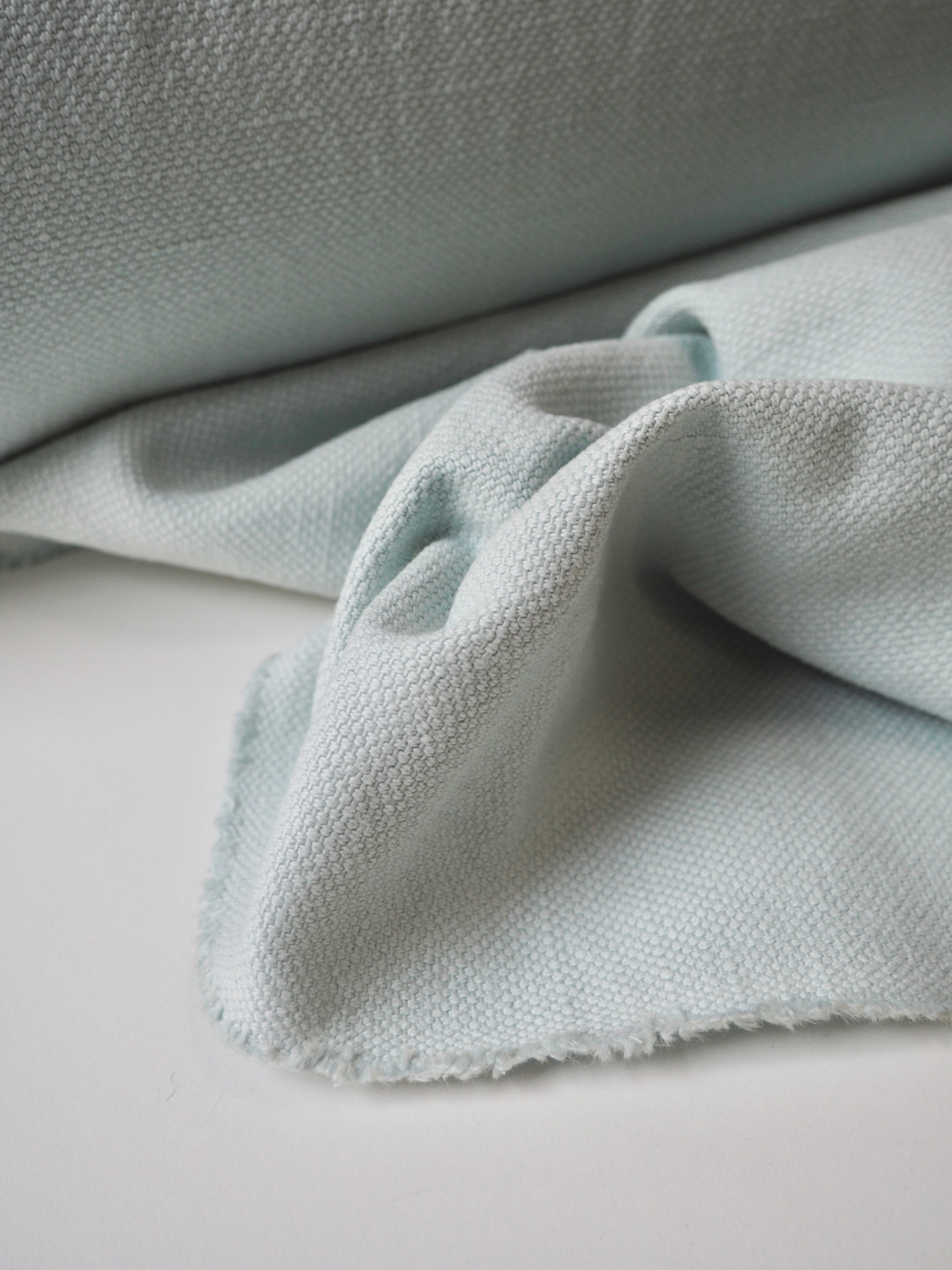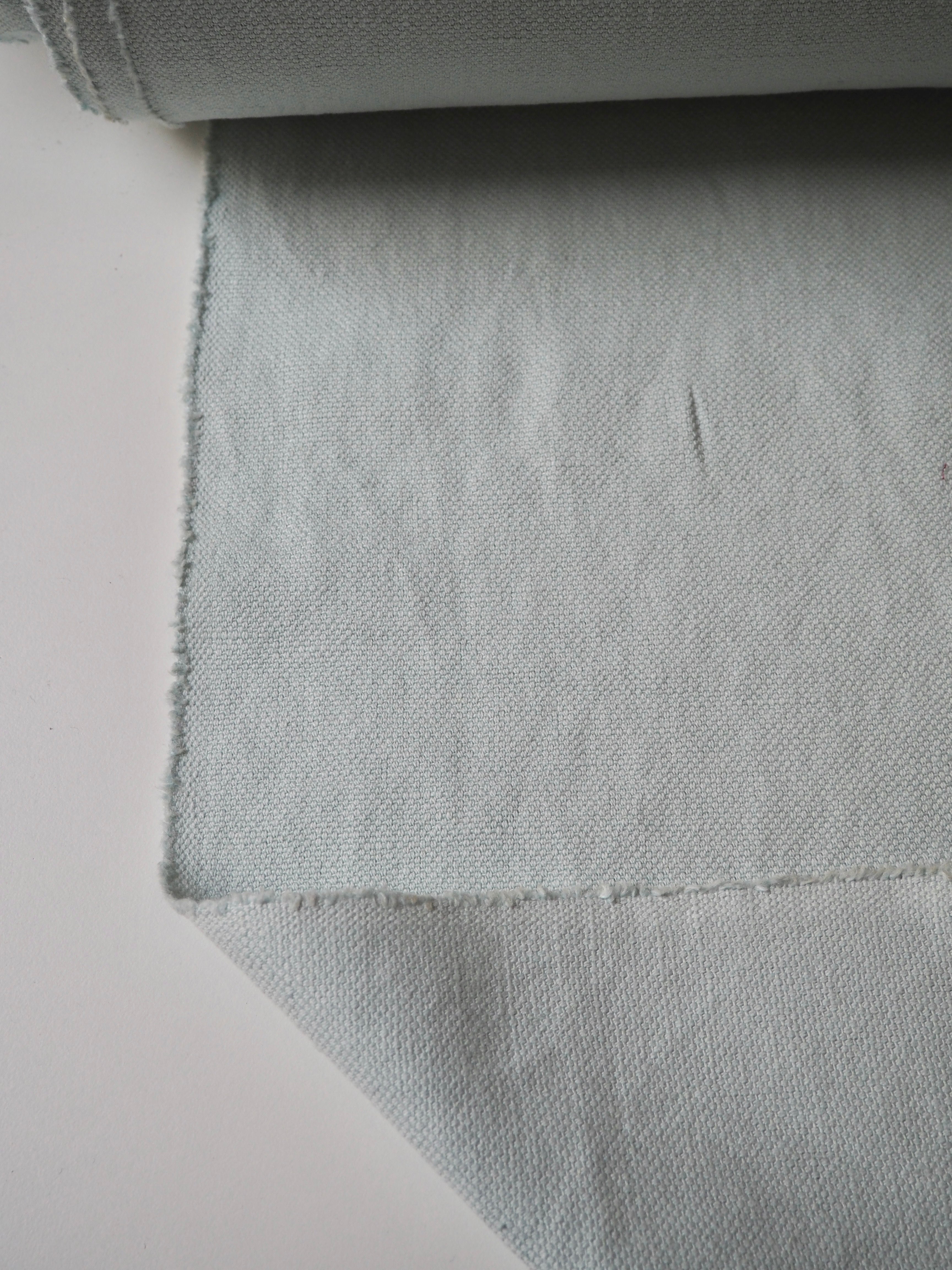 This ex-designer fabric is a linen/cotton. It's a strong basketweave cloth, with a great texture in a medium to heavy weight. It has the same texture and similar weave to a canvas. Made in a balanced cotton and linen blend. Very soft and fully opaque. In an aqua light blue colour. Has a great structure, perfect for a jumpsuit or jacket! The designer, Stalf, use this to make jumpsuits!