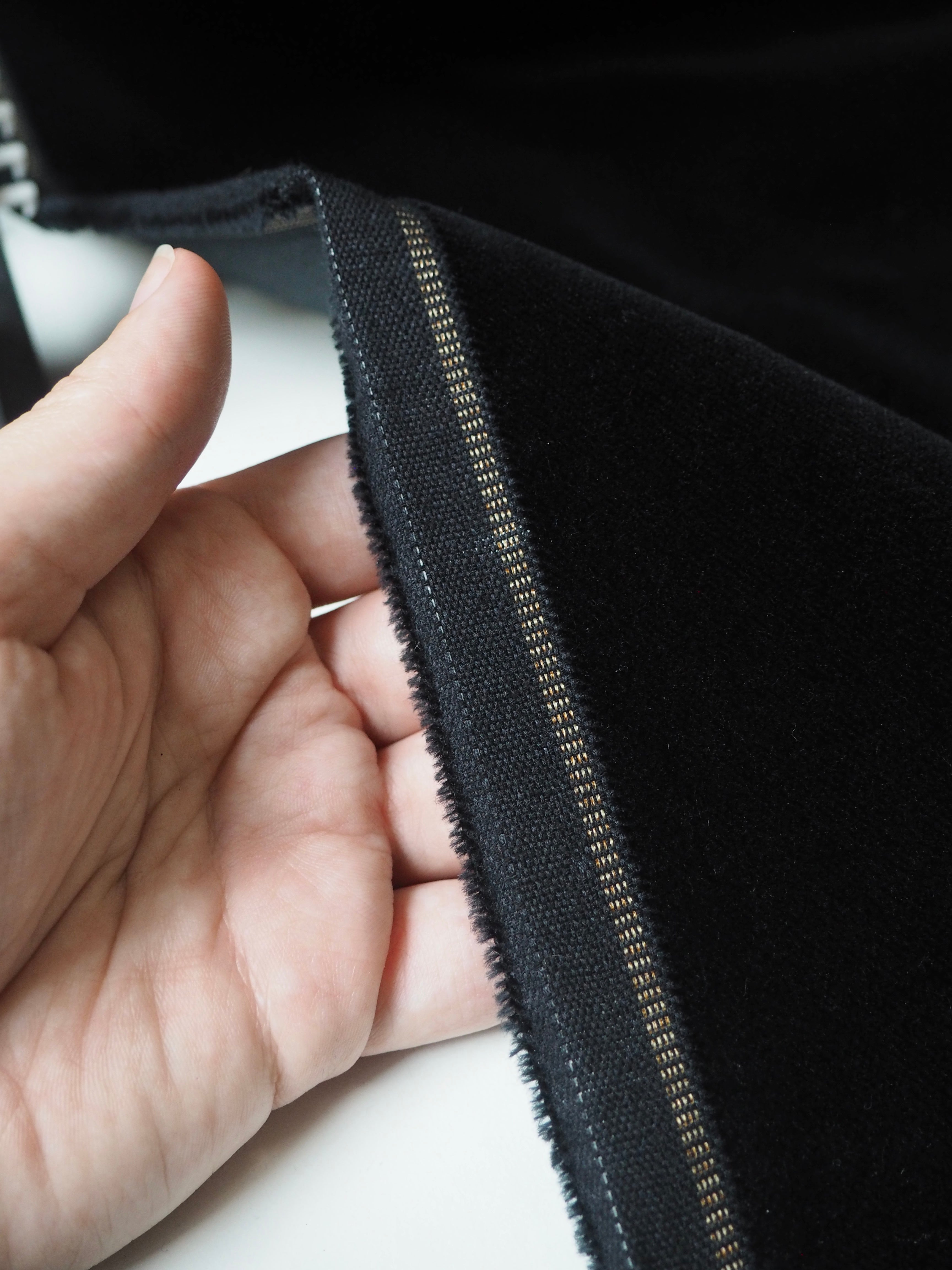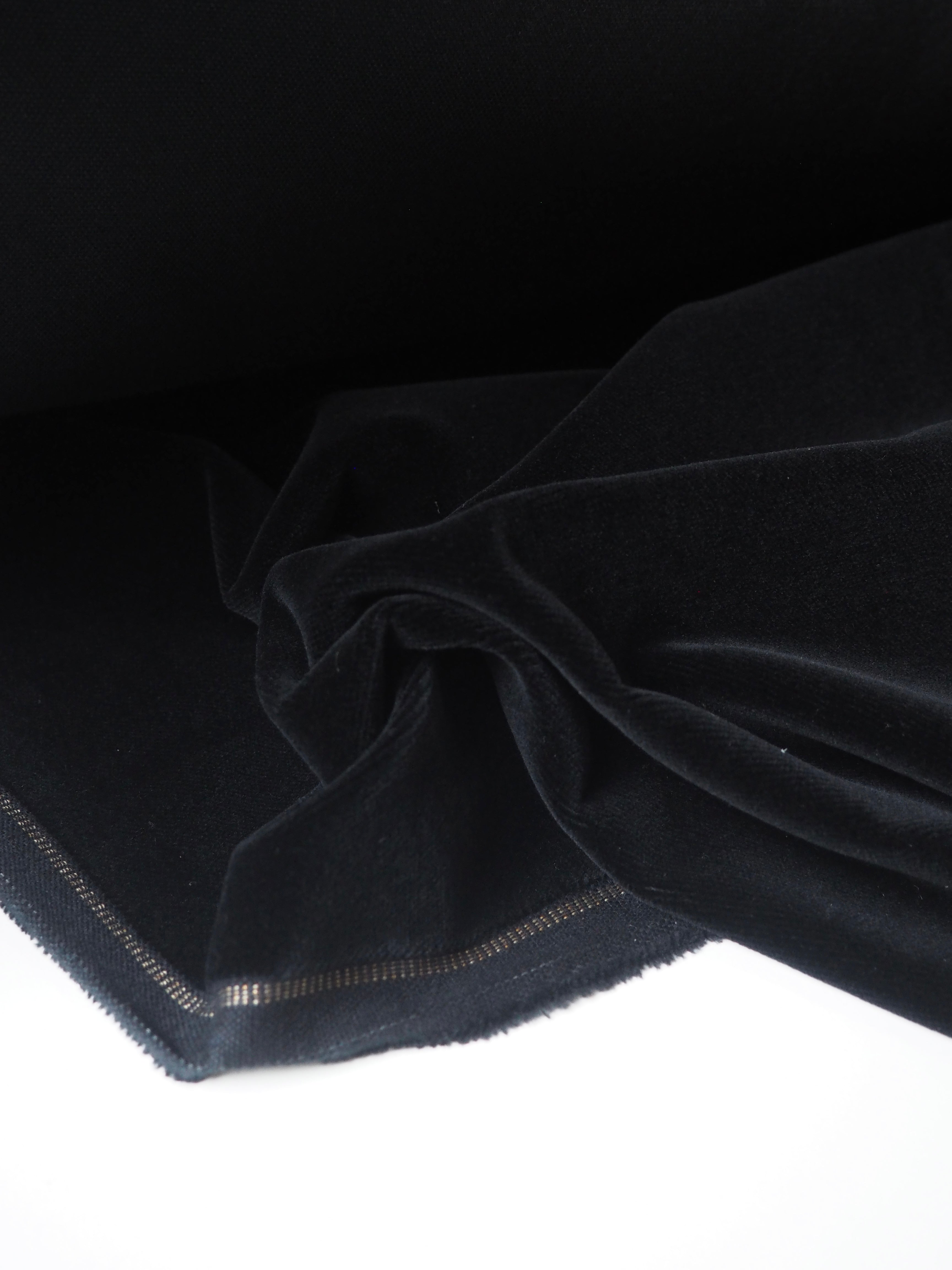 This ex-designer fabric is a rich velvet. It's so soft to the touch and has a beautiful sheen with a cotton canvas backing. The pile is dense and looks so luxurious. Medium weight and a wonderful mix of structure and great drape. Gorgeous for a dress or home project!