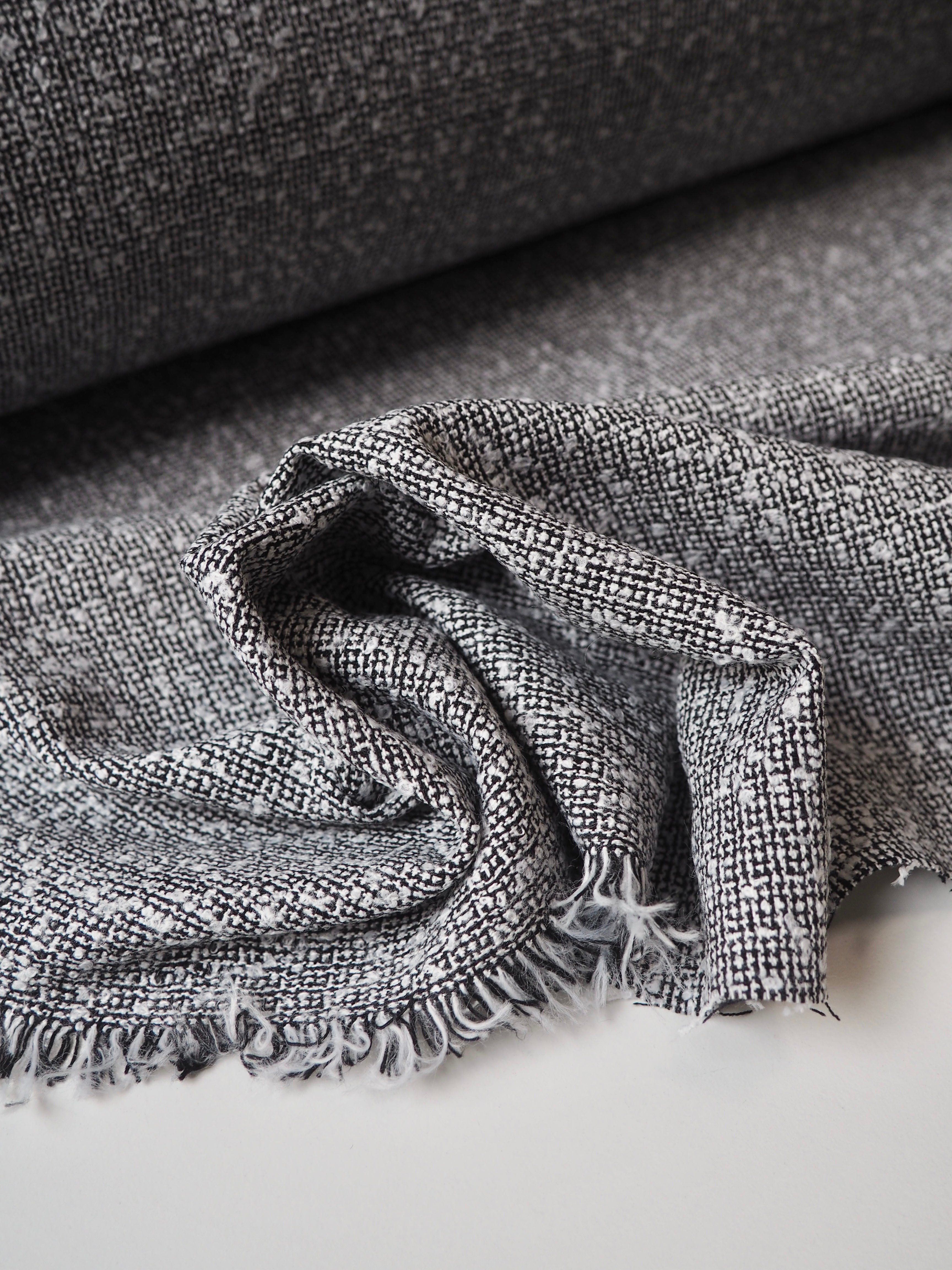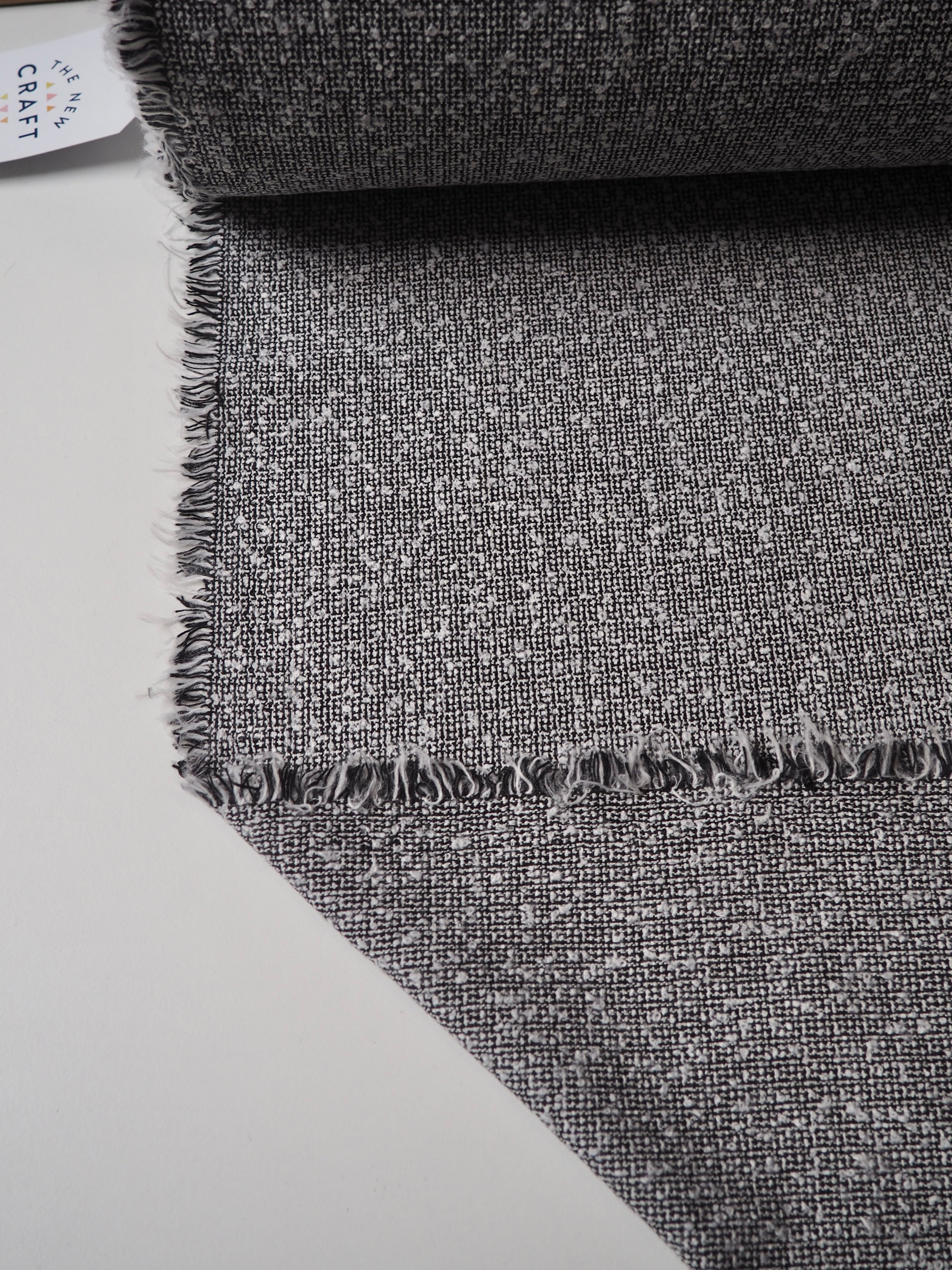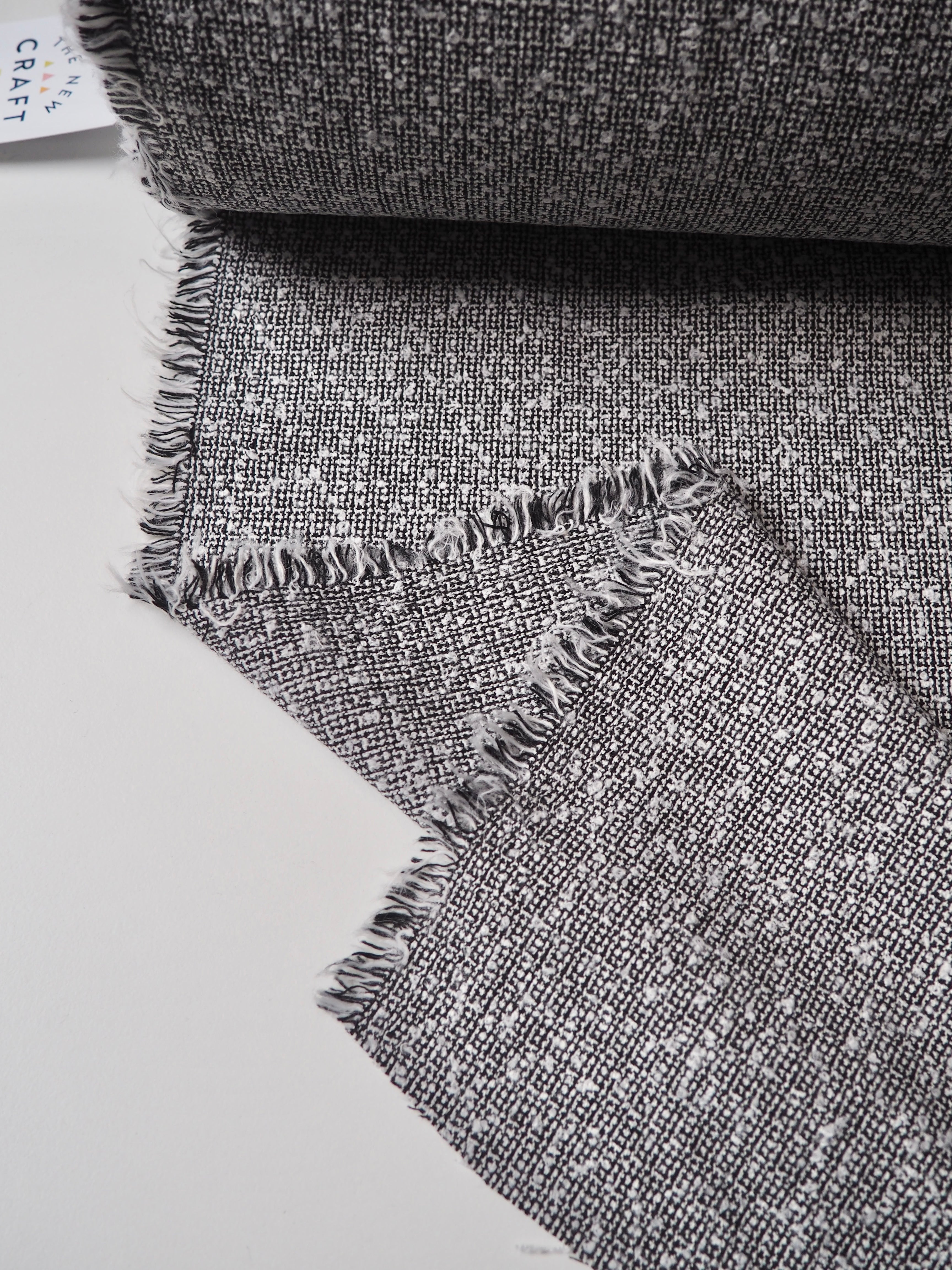 This ex-designer fabric is a bouclé. It's a black and white colourway, with a sturdy but lighter weight weave. It has a typical bobbly bouclé texture, and is very soft! It has a gentle structure and nice drape. Light to medium weight, with a lovely handle that feels like a blanket! Great for a light jacket that could be interfaced, or even a co-ord set!