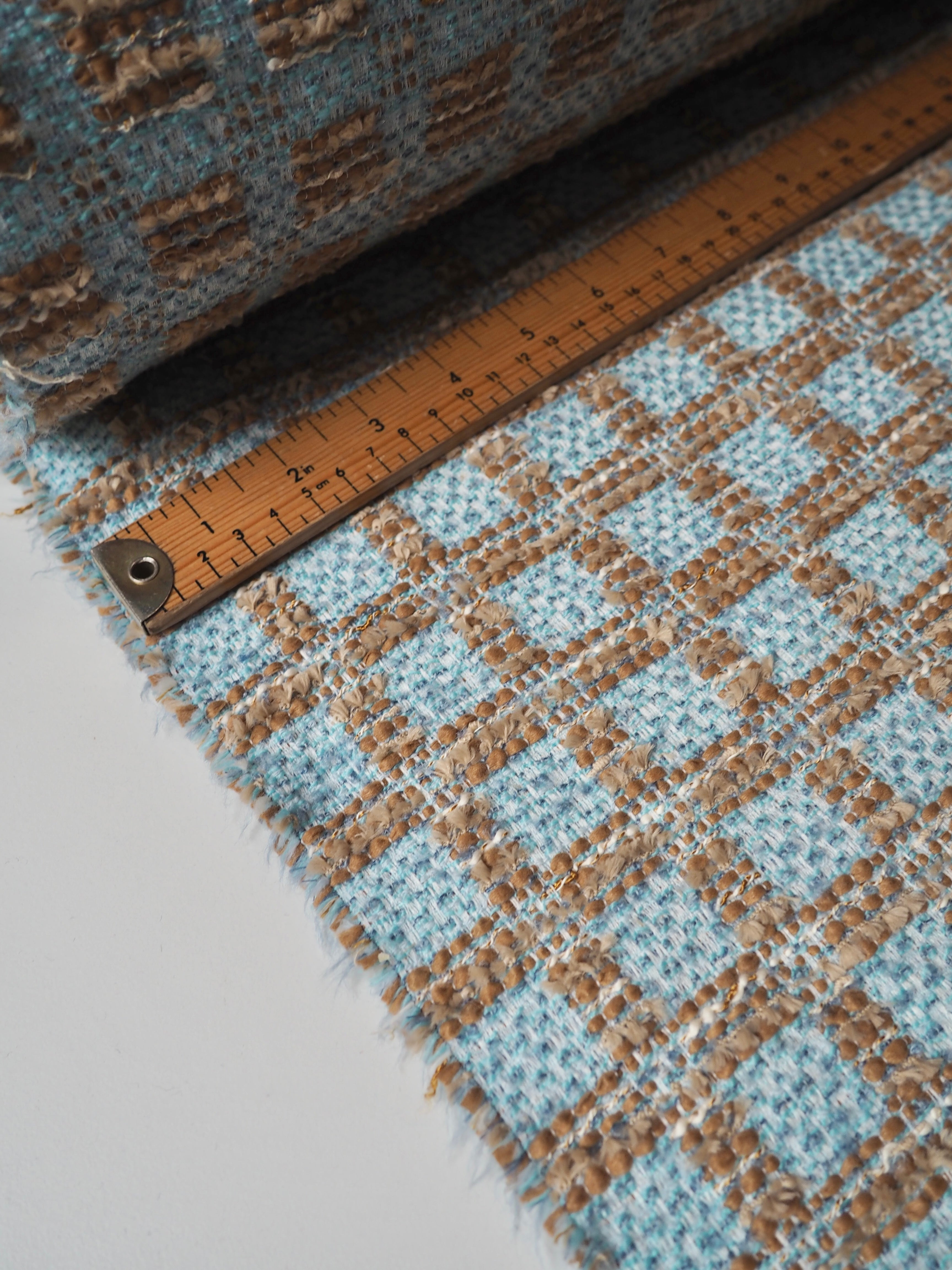 This ex-designer fabric is a bouclé coating. It's a blue and brown check, with a soft handle and quite plush texture. It's lighter weight for a coating, and has a great texture. It's quite warm and has a soft drape. Perfect for a coat, jacket, or cushions!