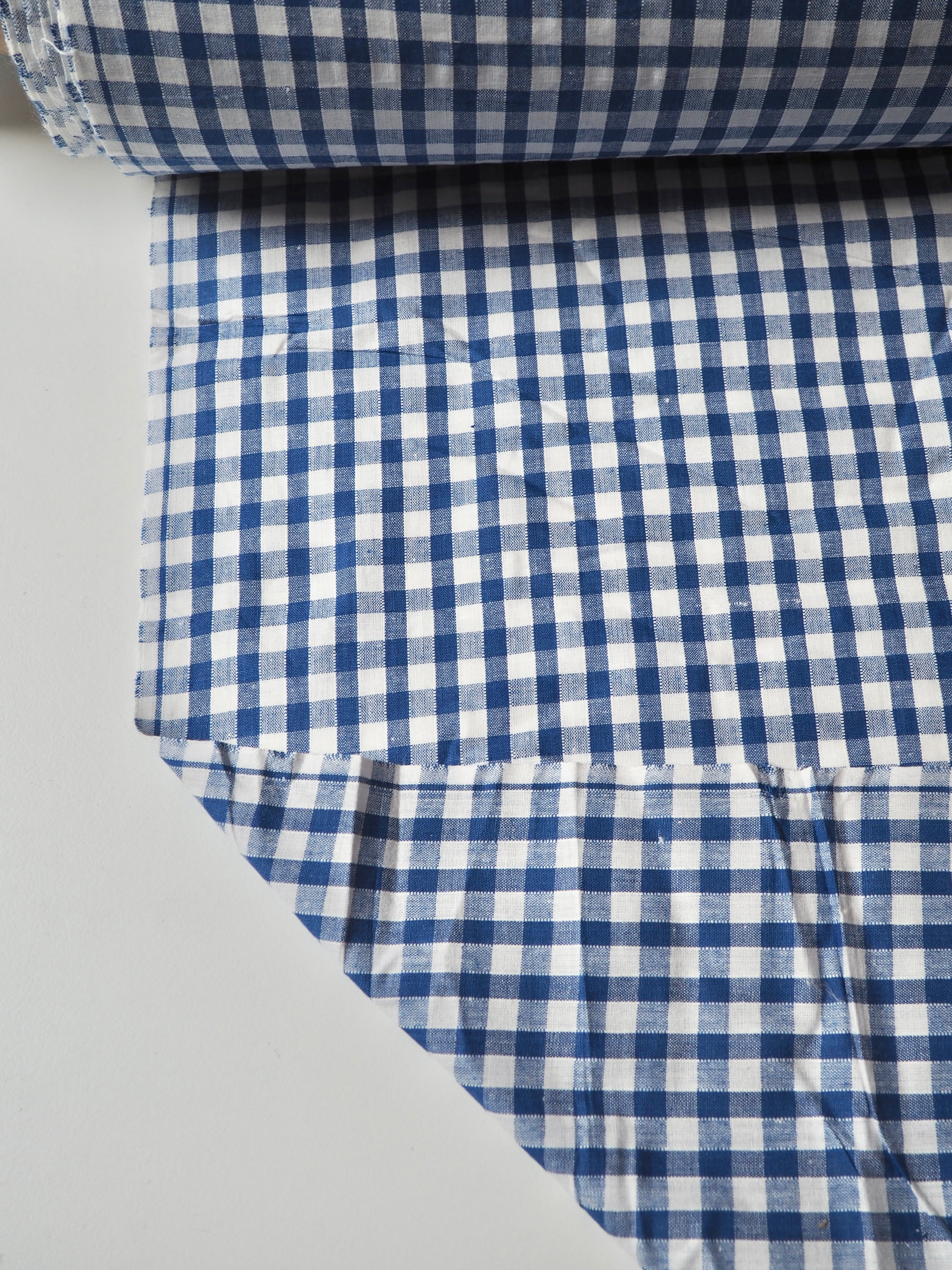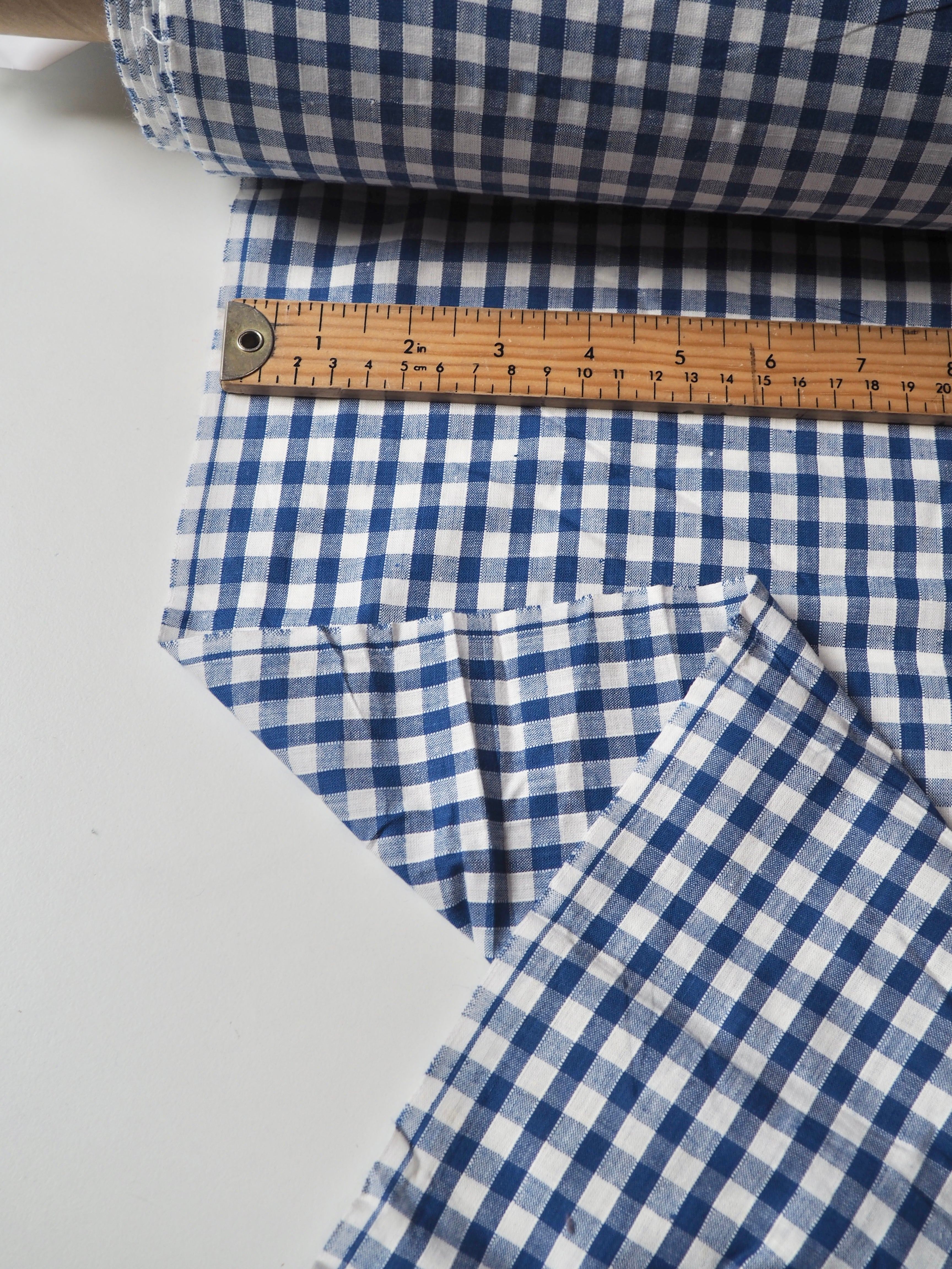 This ex-designer fabric is a cotton. It's a blue and white gingham check made in Japan. It has crisp drape and lovely soft handle. It has a sturdier weave that is typical of Japanese cottons. Lightweight and opaque. Great for a dress or top! This would be so cute with the tie front hack of our Everyday Top!