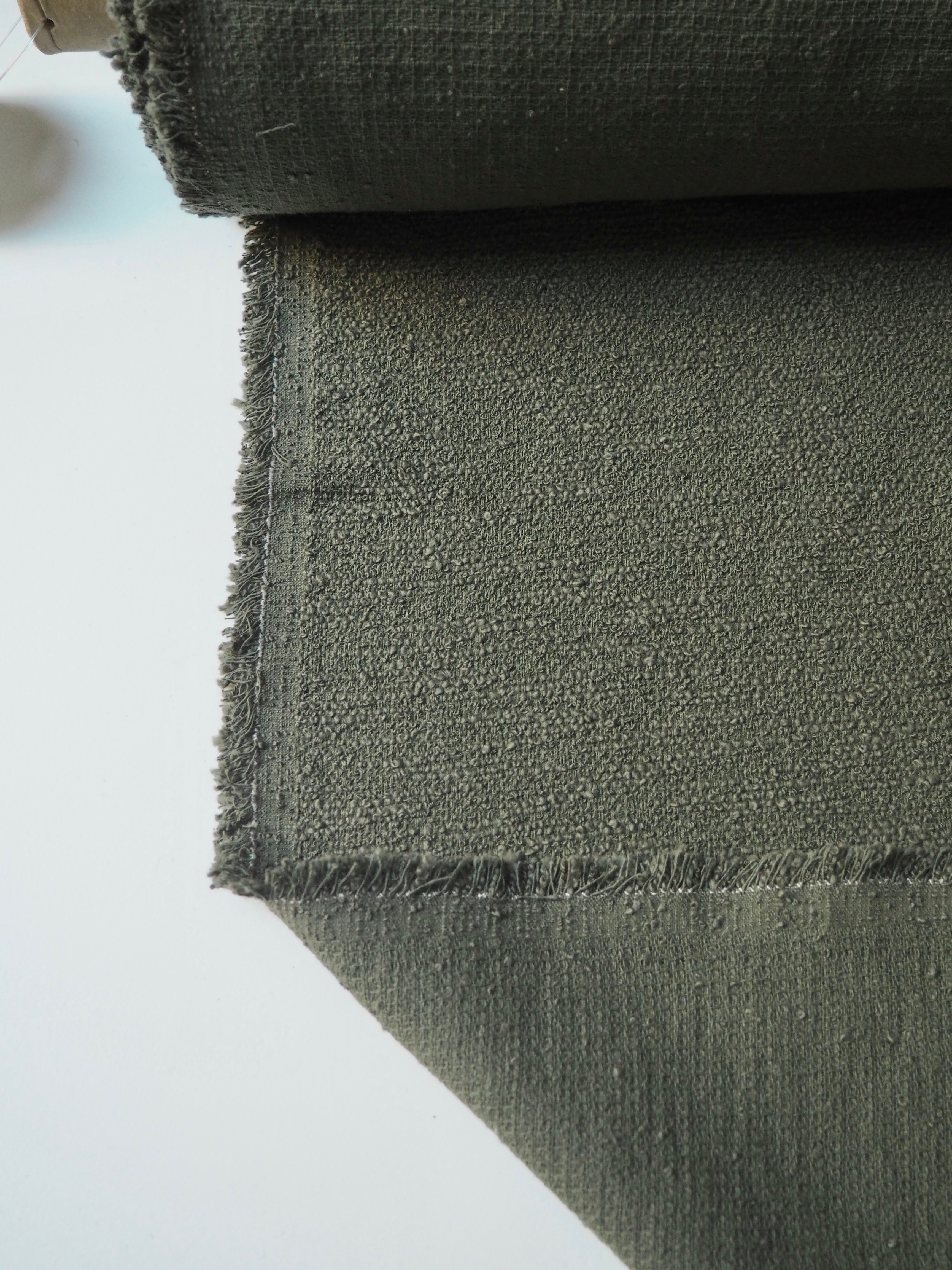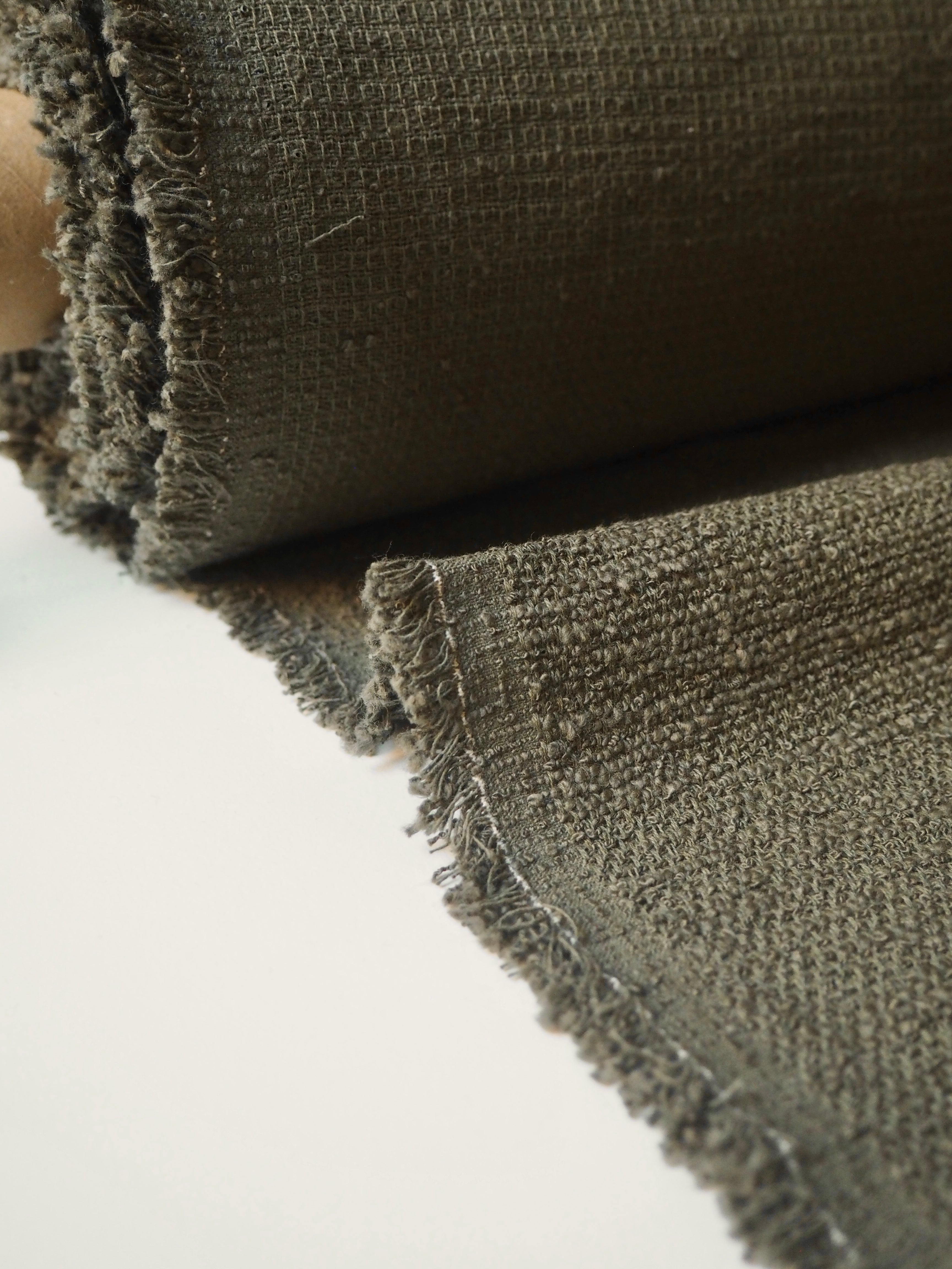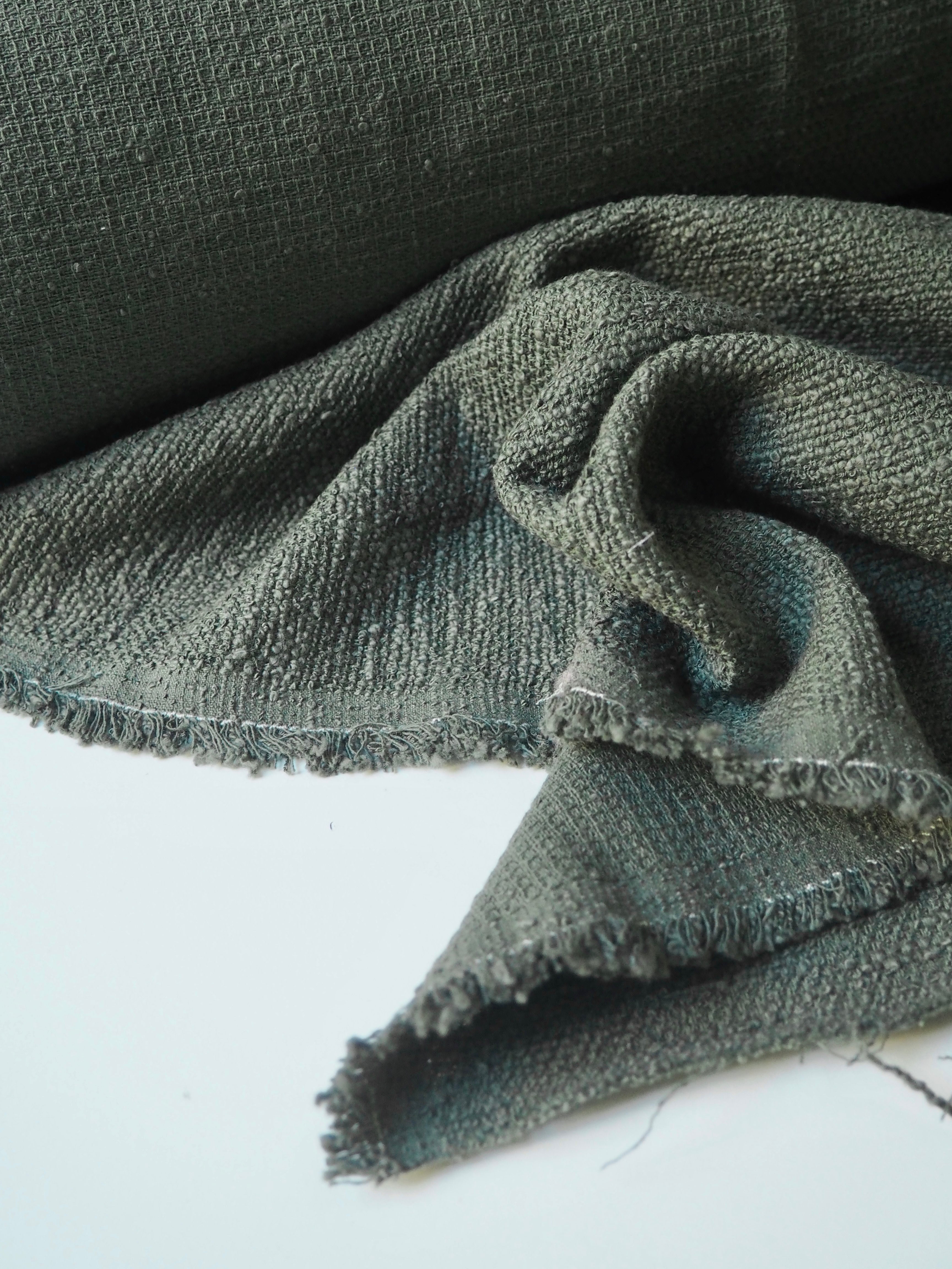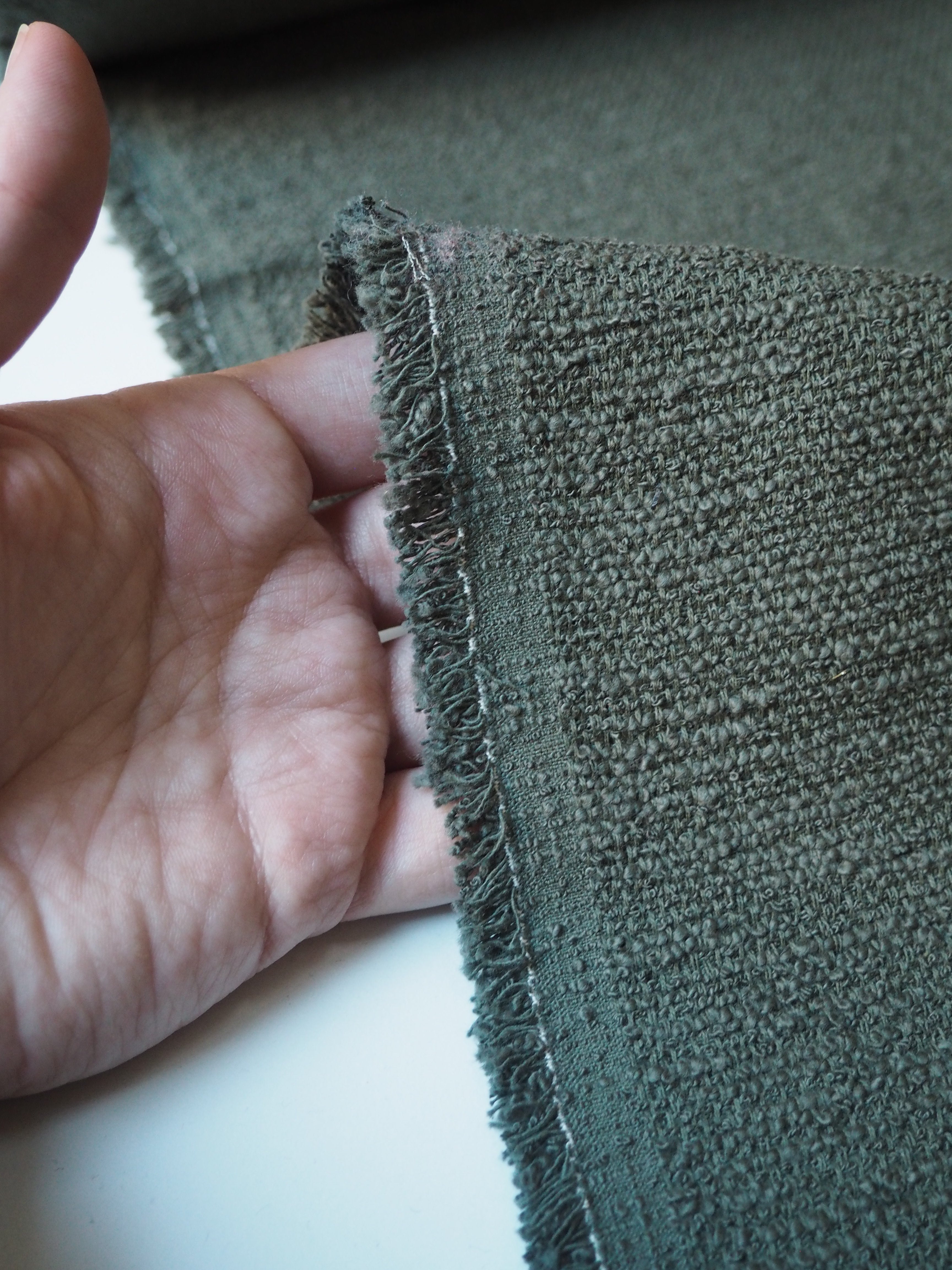 This ex-designer fabric is a cotton tweed. It has a sturdy but very soft and textured bouclé weave. It's opaque, with a gentle structure and lovely drape. Has such a lovely handle that's easy to work with. Light to medium weight and perfect for a jacket or even cushion covers!