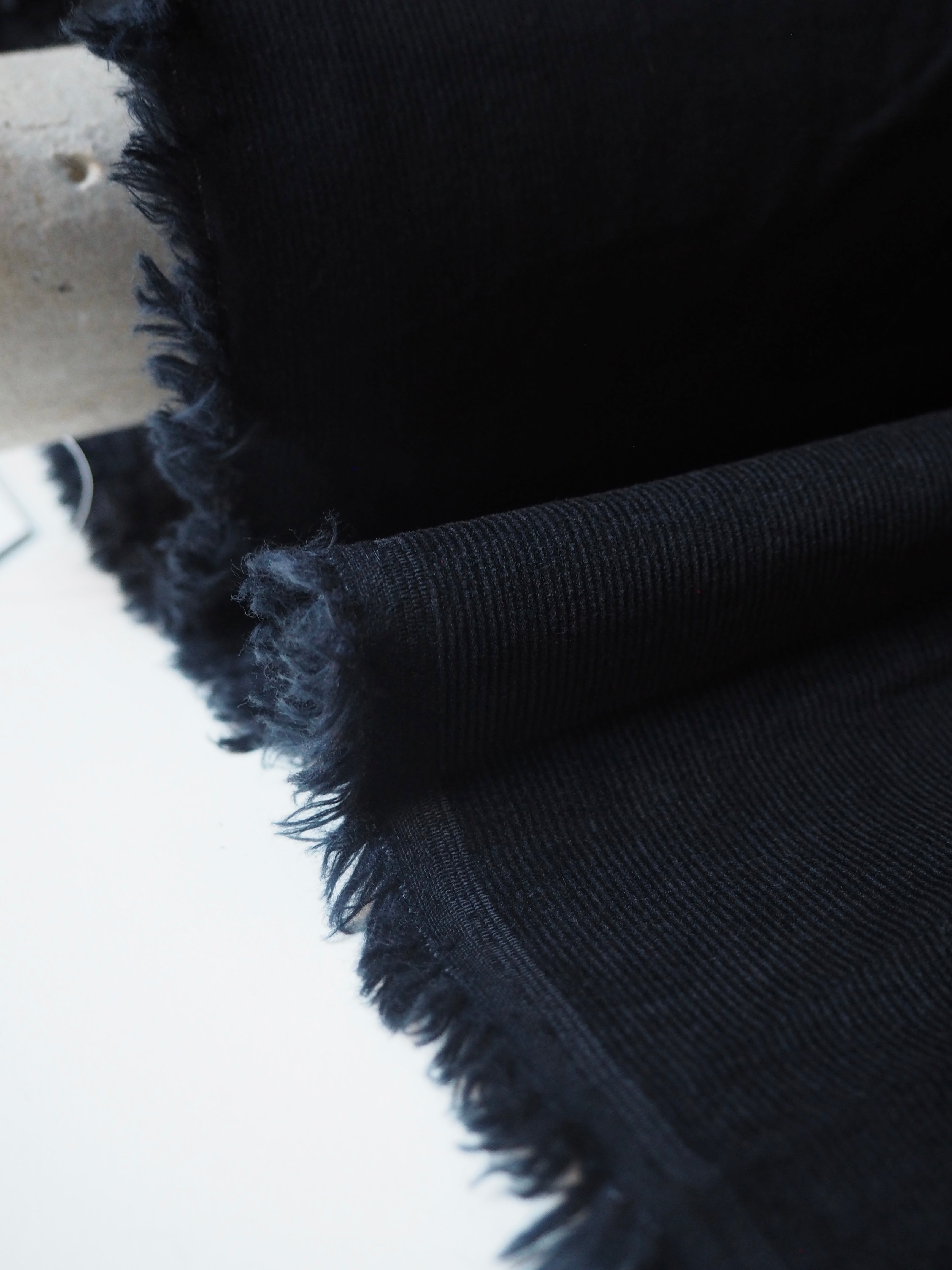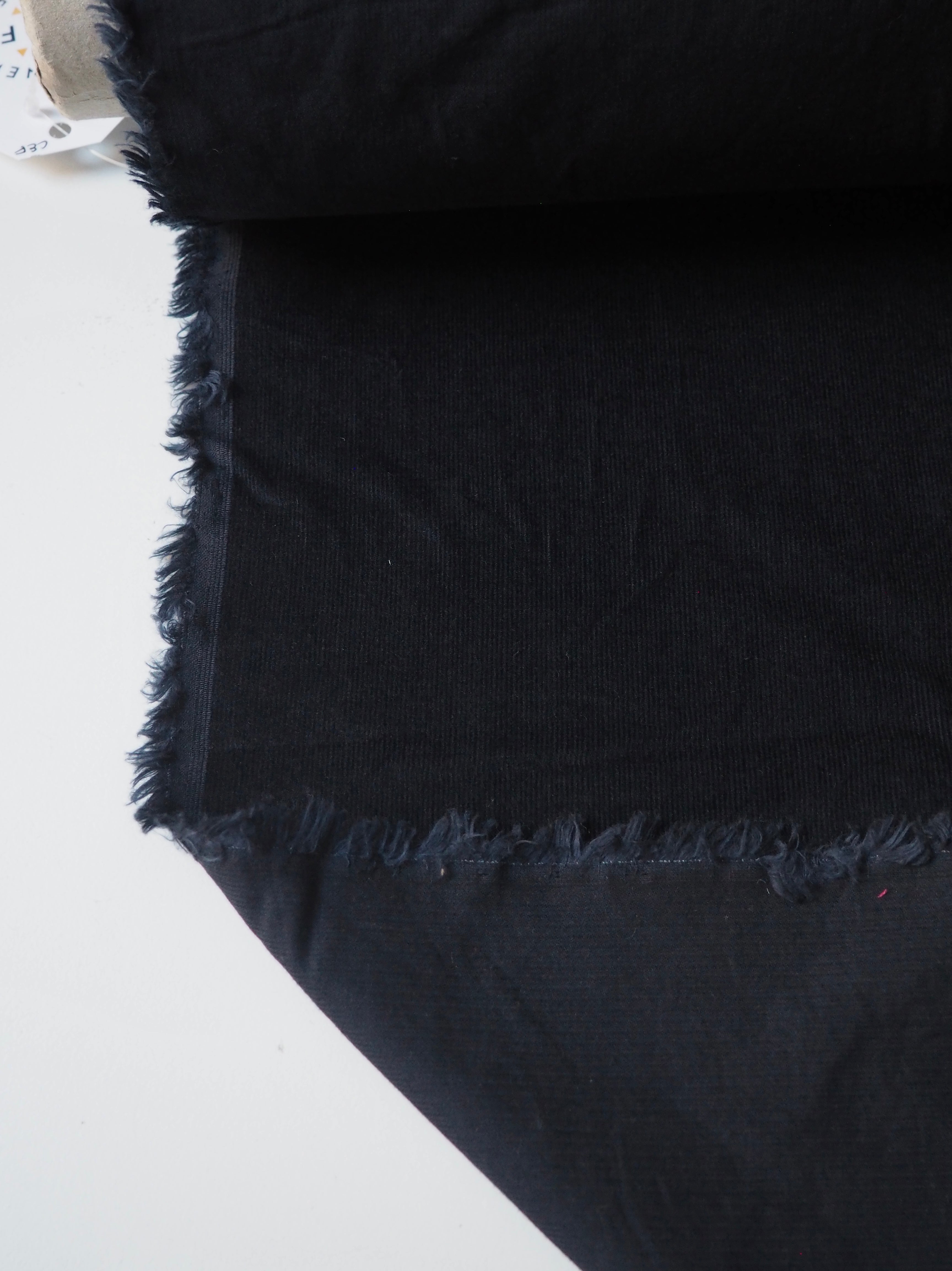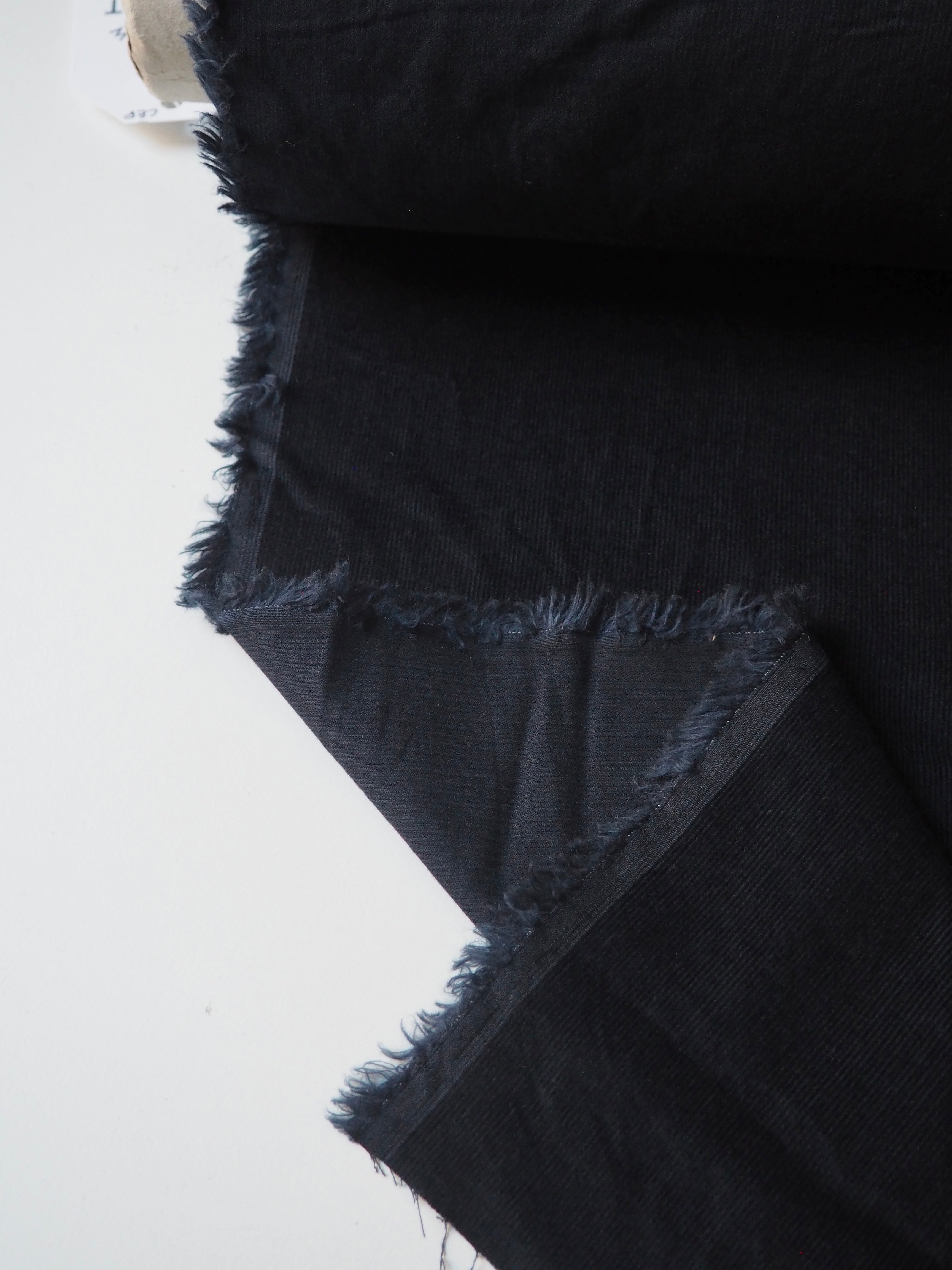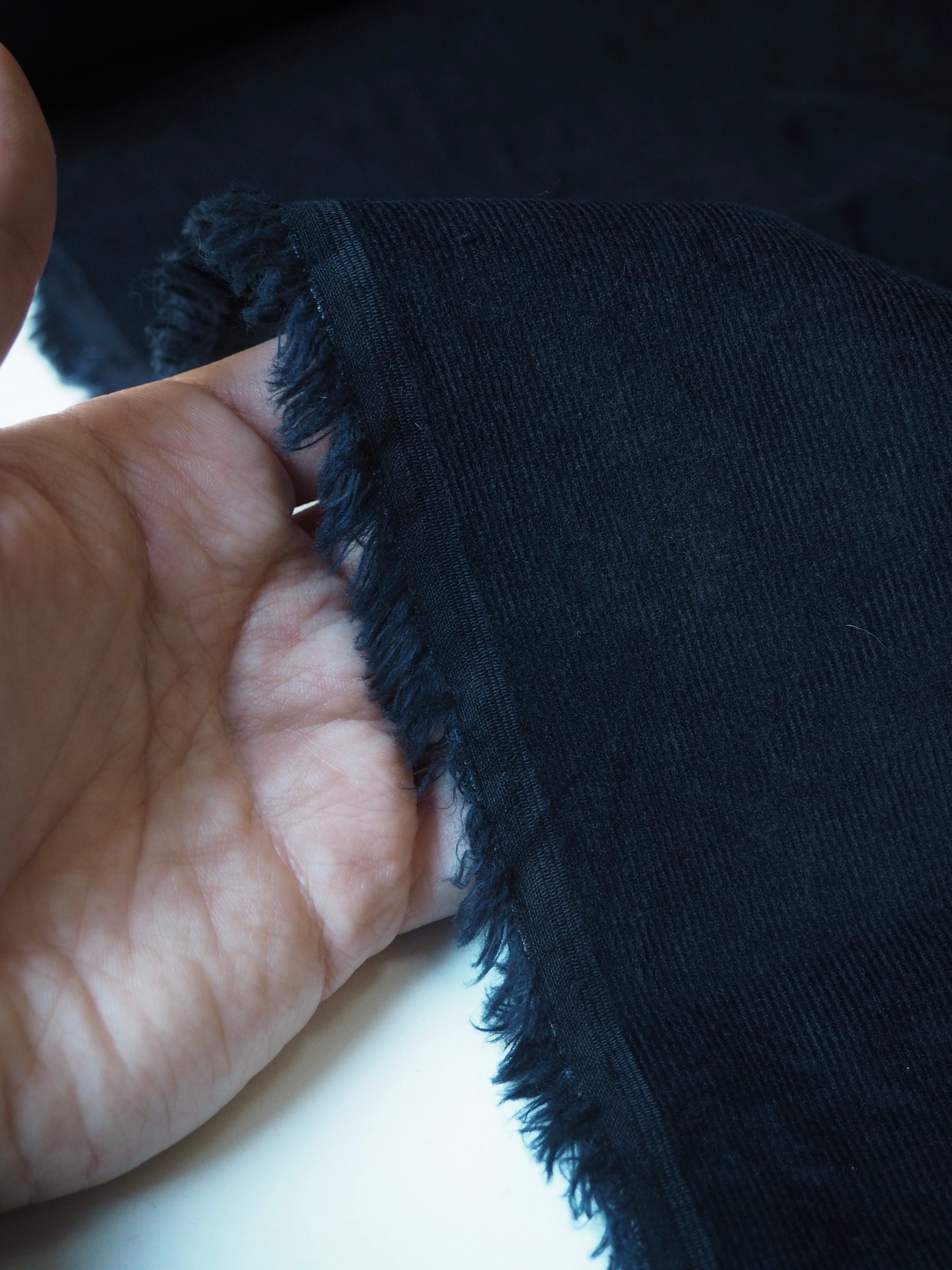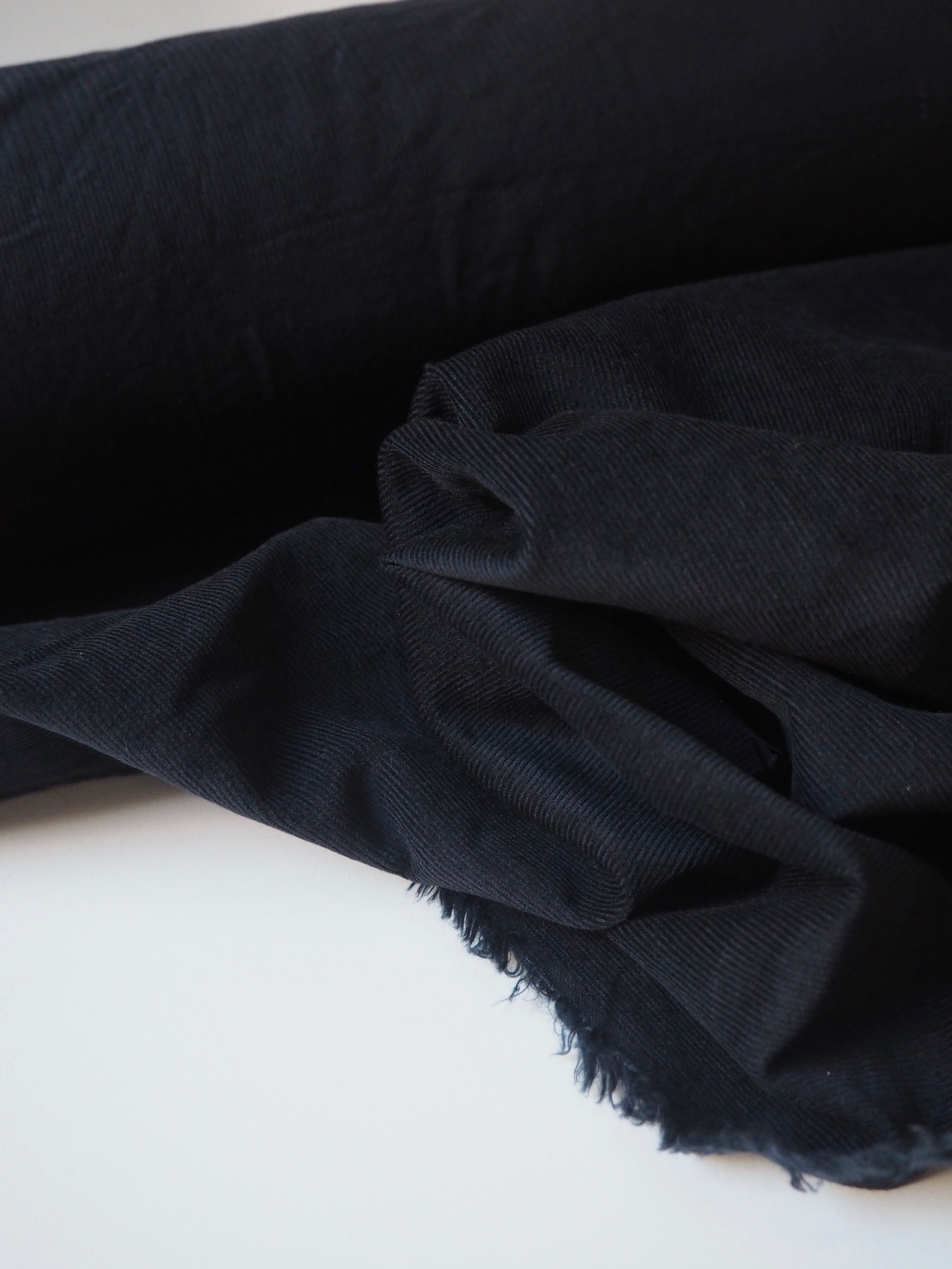 This ex-designer fabric is a pin cord. Fine cord ribs run along lengthways. So incredibly soft to the touch! The designer labelled these are pre-washed, but we would recommend still pre-washing. Has a very gentle structure, and lovely light texture. Lightweight, and has a bit of natural ease that makes it perfect for trousers!