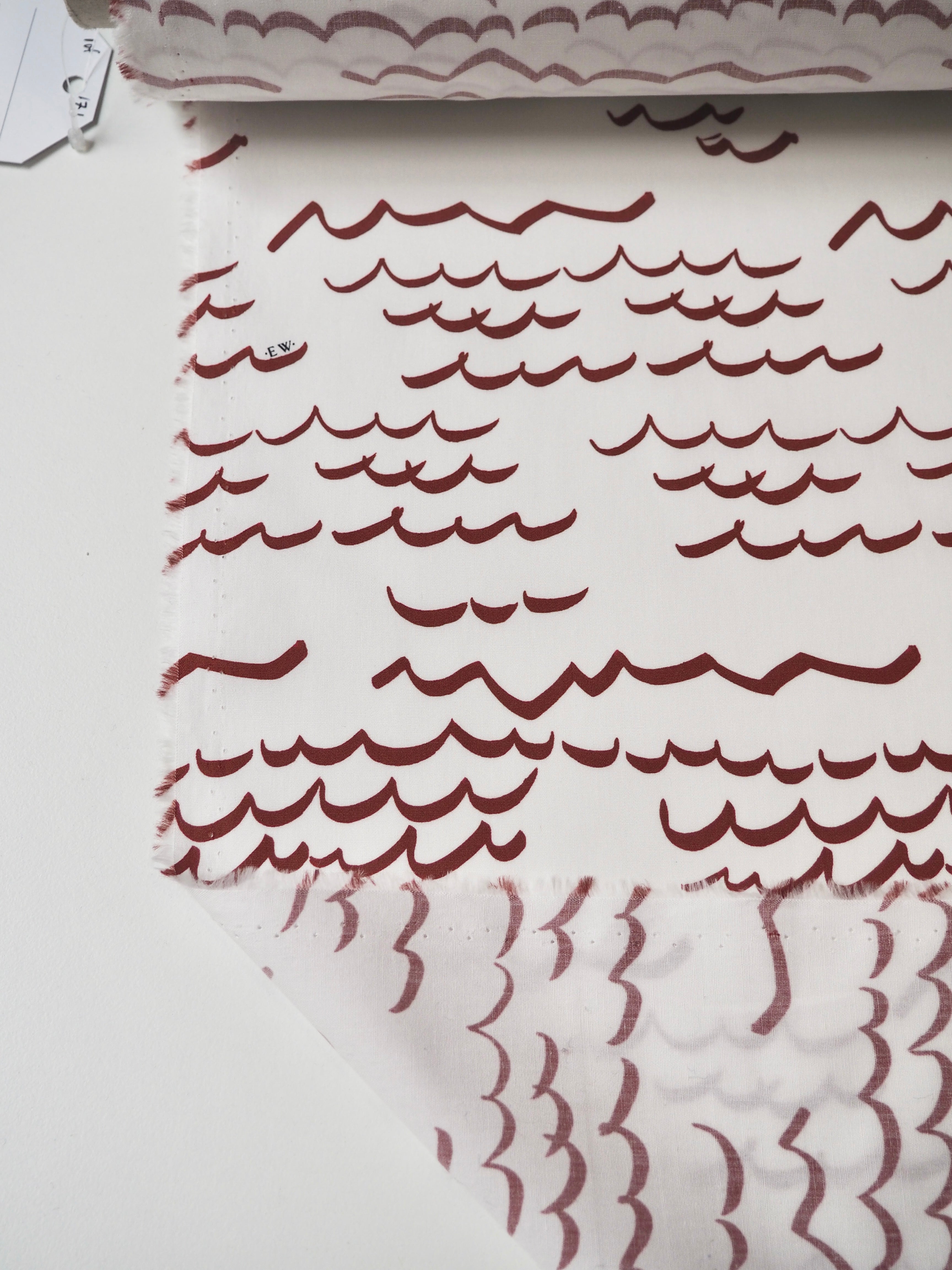 This ex-designer fabric is a cotton poplin. It's in a red and white colourway, with abstract wave drawings across the weft. You can even see the designers initials! It is lightweight with a gently structured, slightly crispy drape. Mostly opaque, with a really lovely handle and quality. Perfect for dresses and button downs!