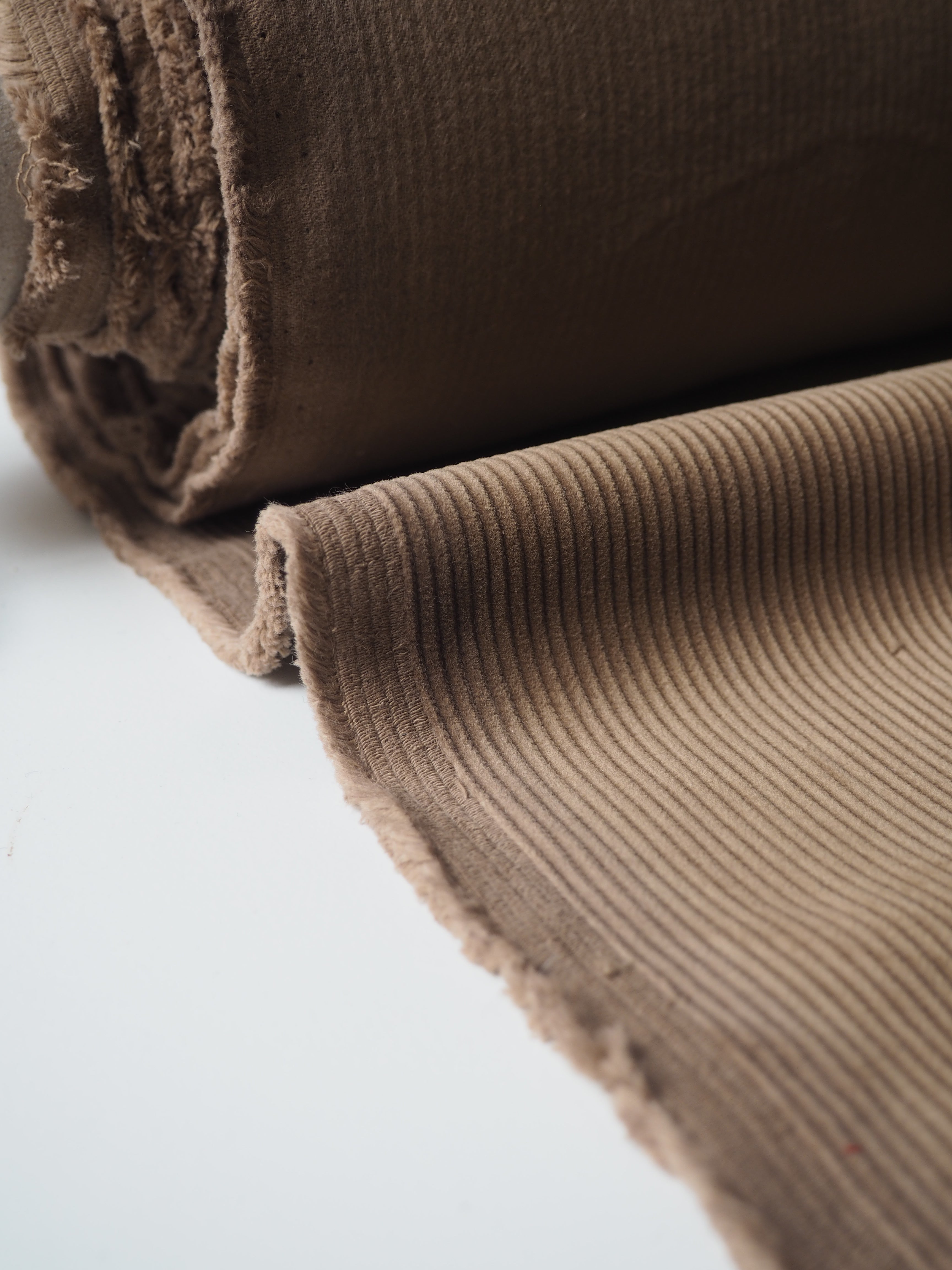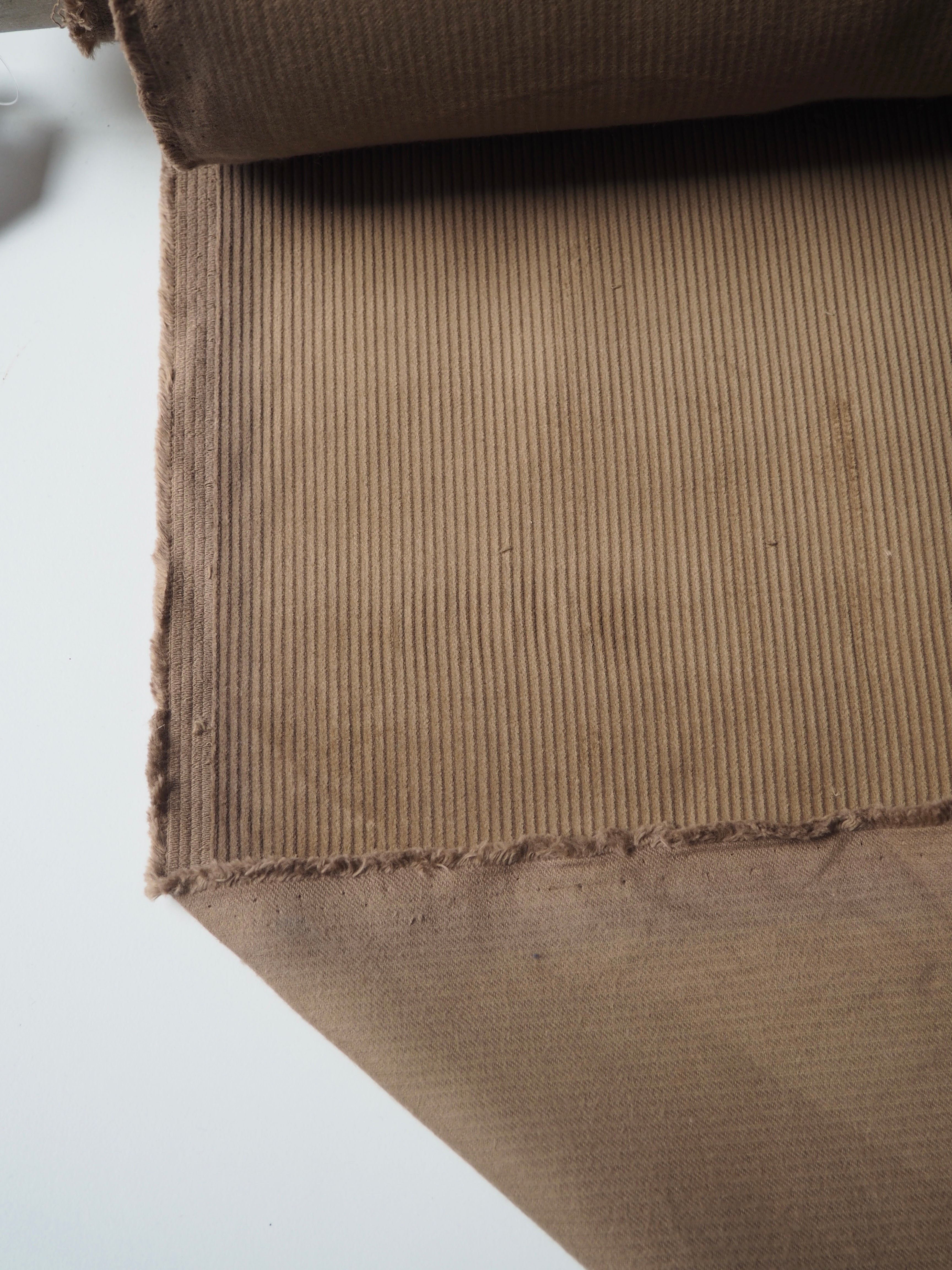 This ex-designer fabric is a corduroy. Cord ribs run along lengthways in a lovely tan brown. Beautifully soft with a gentle structure. Opaque and so lovely! Medium weight and quite sturdy. Perfect for a jacket! This cloth does have a nap.