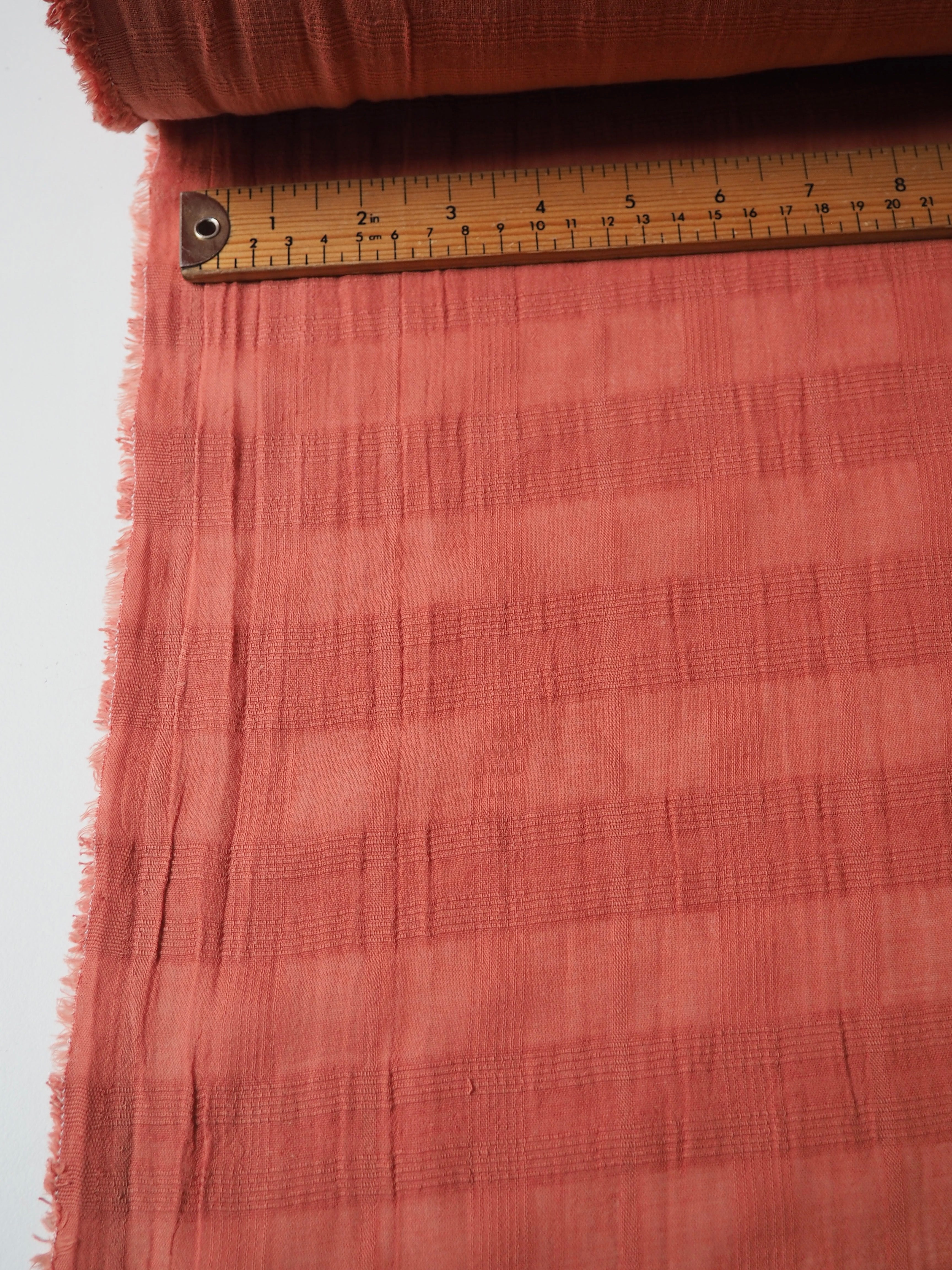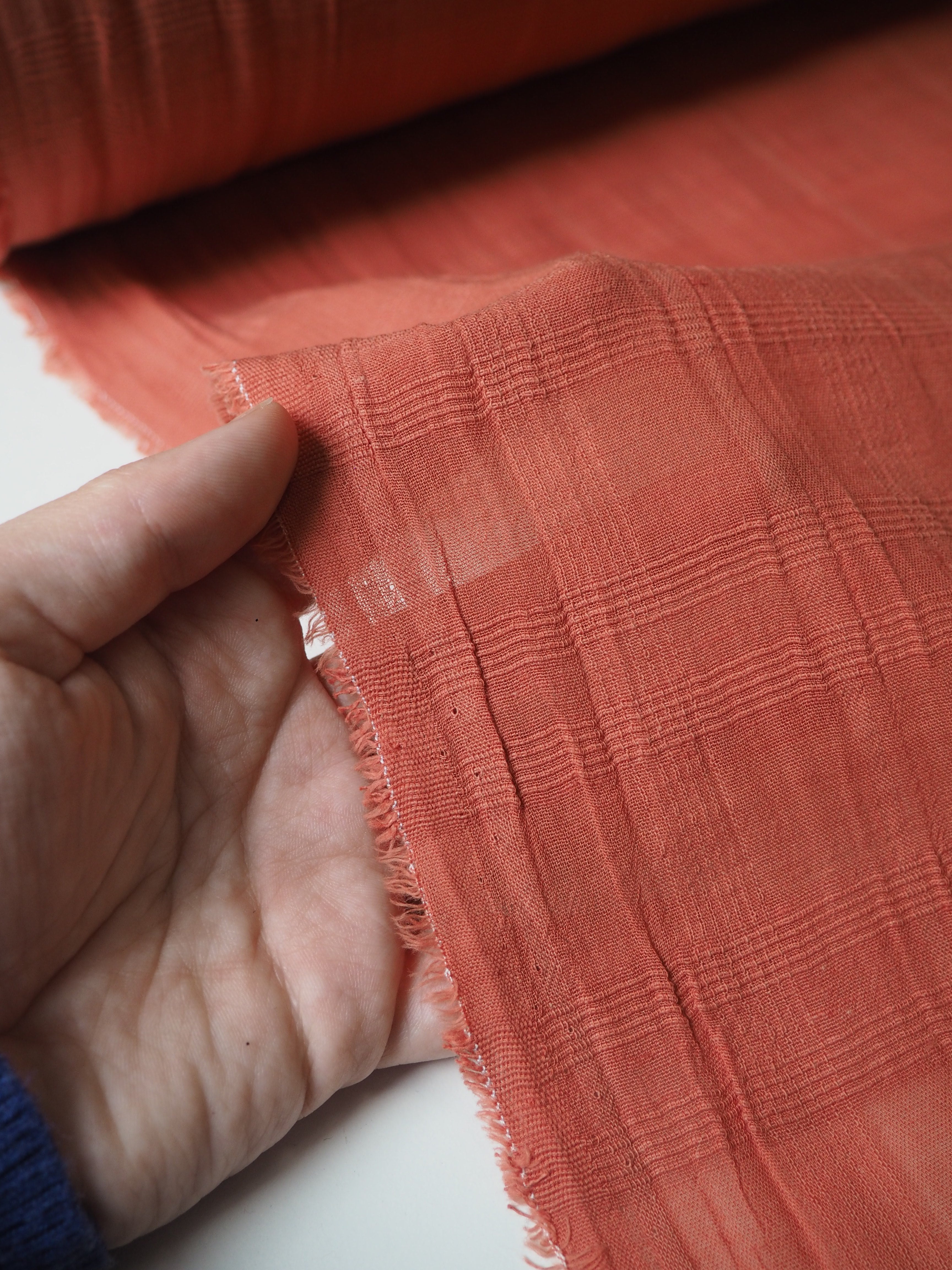 This ex-designer fabric is a cotton voile. It's a terracotta orange cotton voile, with a check jacquard weave. It's from a London-based brand called Beyond Nine. It has a super soft and gentle handle that's so wearable. It's a little heavier than a typical voile, but still very lightweight. Semi-sheer and drapes so beautifully! Very breathable and so soft! Lovely for our Everyday Dress/Top, or even some pyjamas! We can't wait to see what you make!