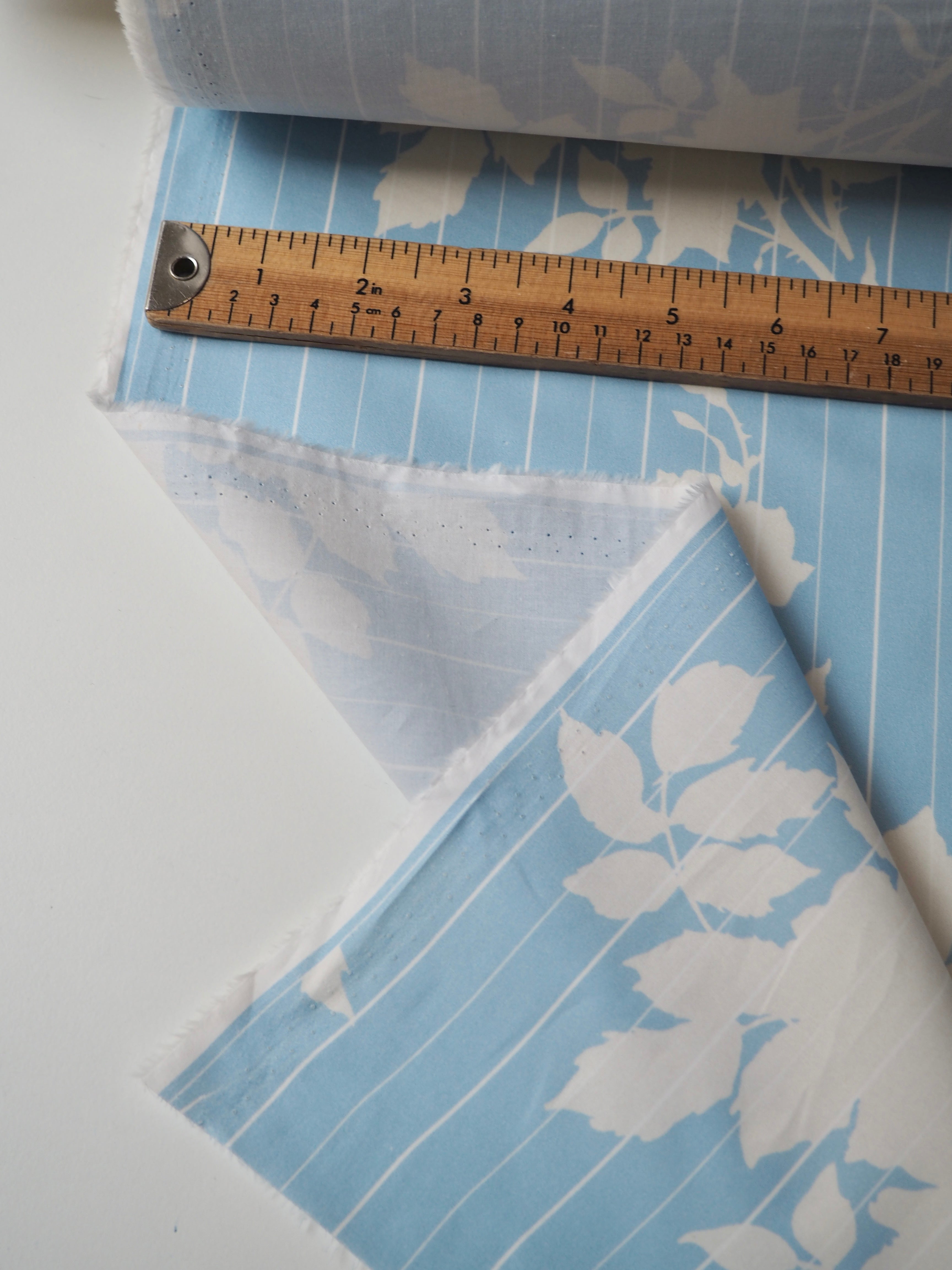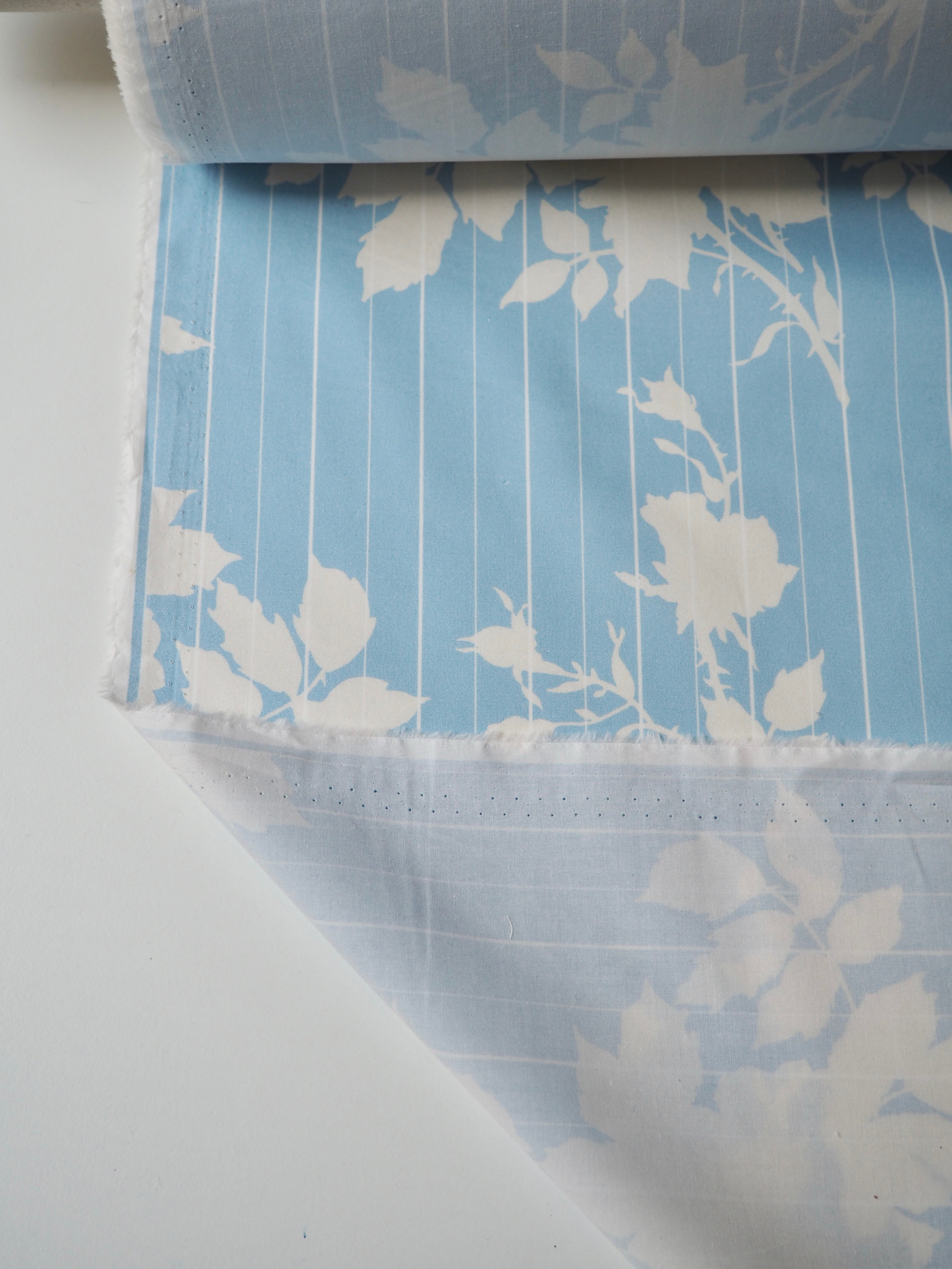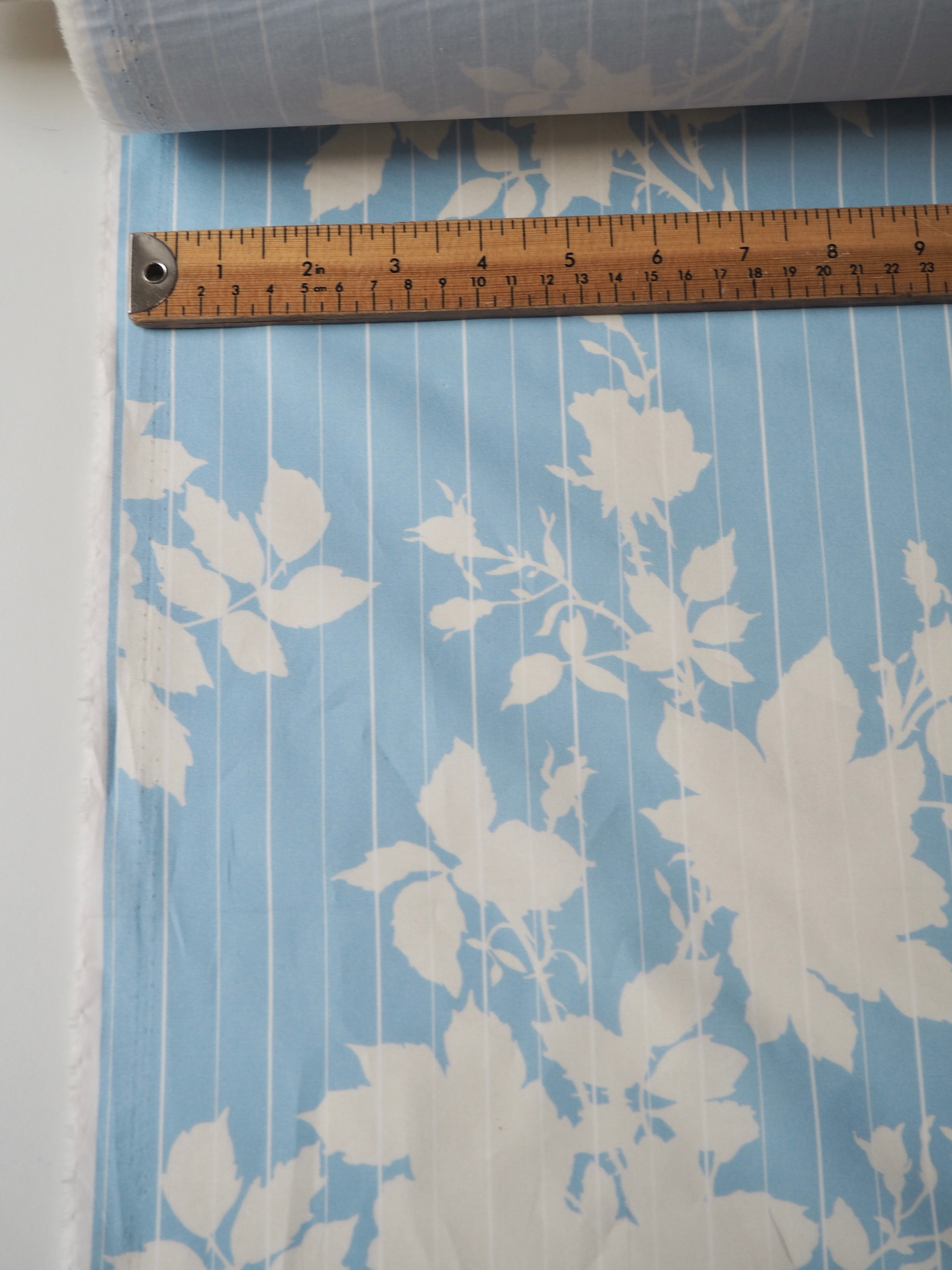 This ex-designer fabric is a cotton poplin. It has white roses printed across a blue and white stripe. It is lightweight with a gently structured, slightly crispy drape. Opaque, with a really lovely, smooth handle and quality. Perfect for dresses and button downs!