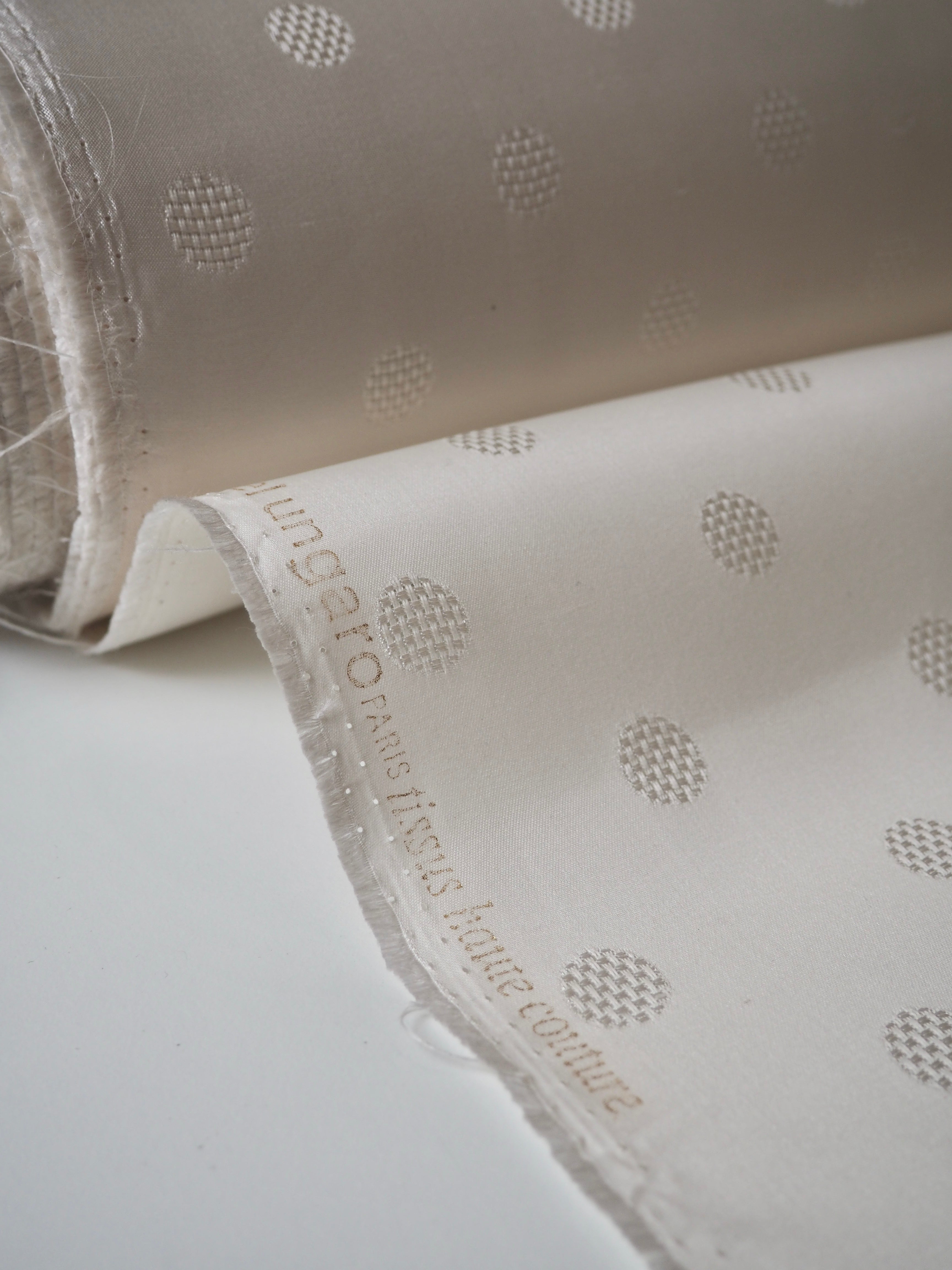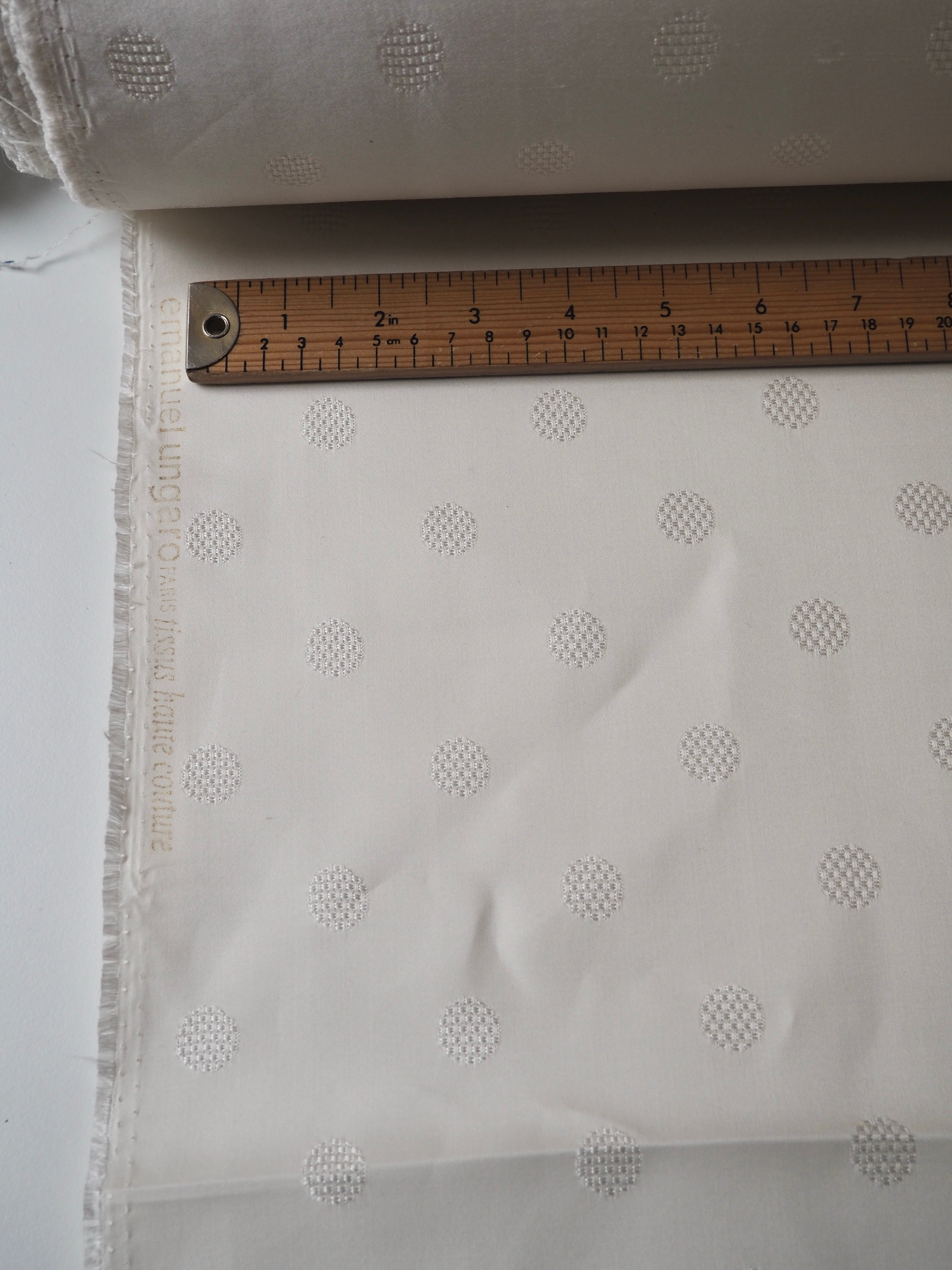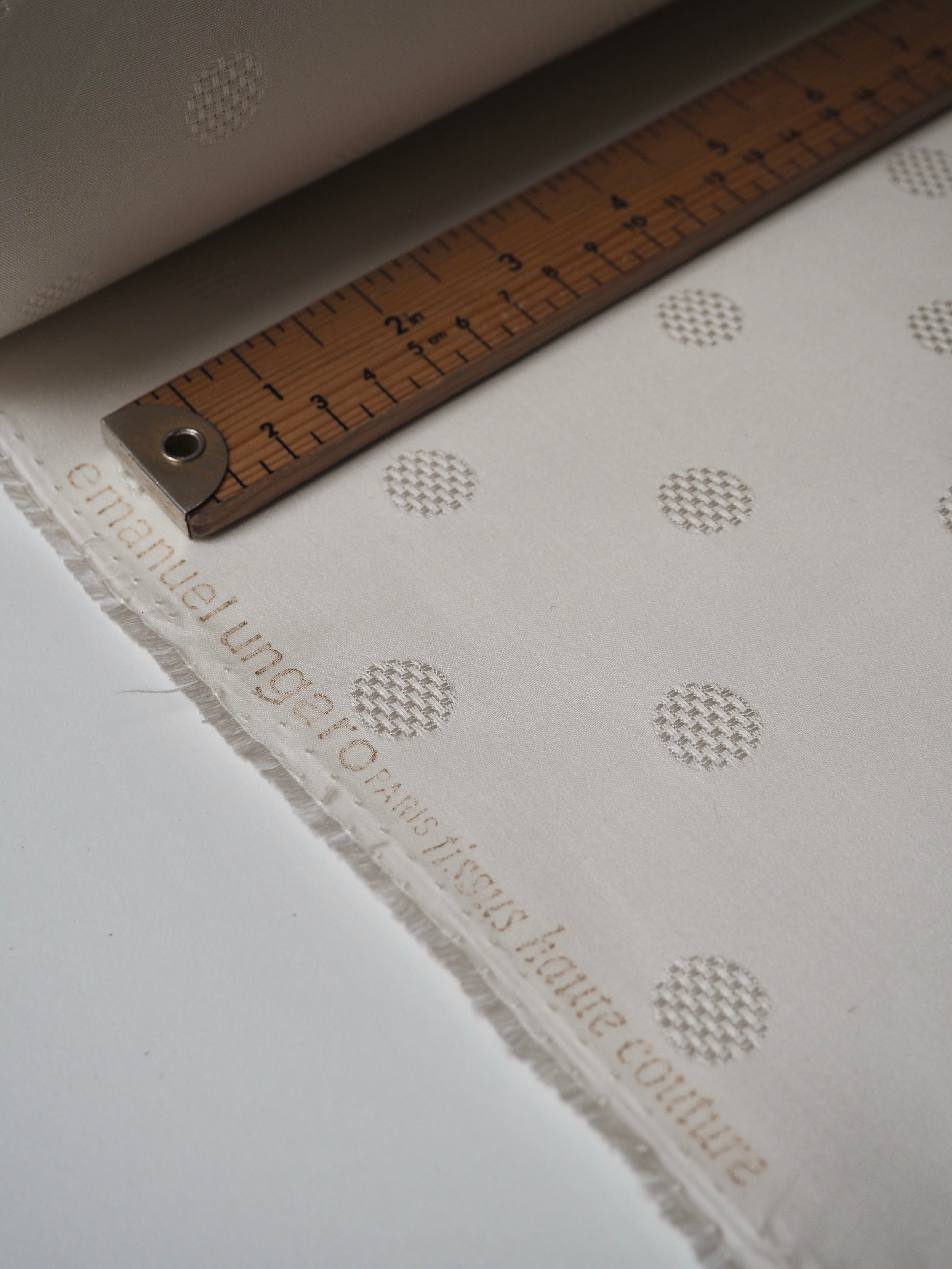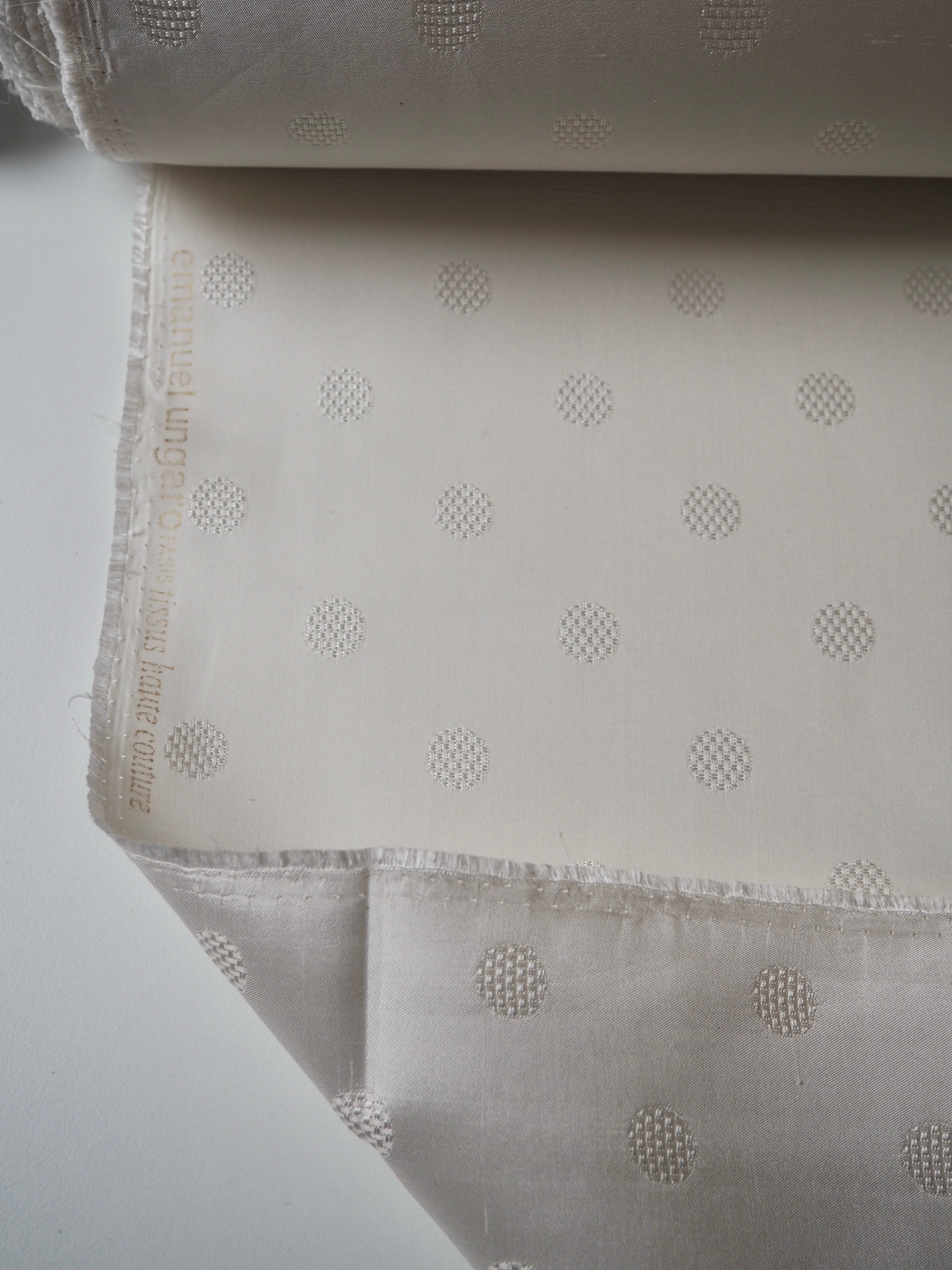 This ex-designer fabric is an incredible couture jacquard. It's designed by Emanuel Ungaro, Paris, and is a couture silk cloth. It's in an lovely slightly creamy ivory shade, with a slightly open-weave dot pattern. Main body of the cloth is a very structured silk, with the structure of a heavy organza. It's lightweight and has a slightly worsted raw silk weave, more evident on one side of the cloth. It's opaque and has a slightly rustle-y sound when in movement. Has a slight sheen finish from the lustrous silk yarns. Such an gorgeous cloth, would make a stunning wedding look!