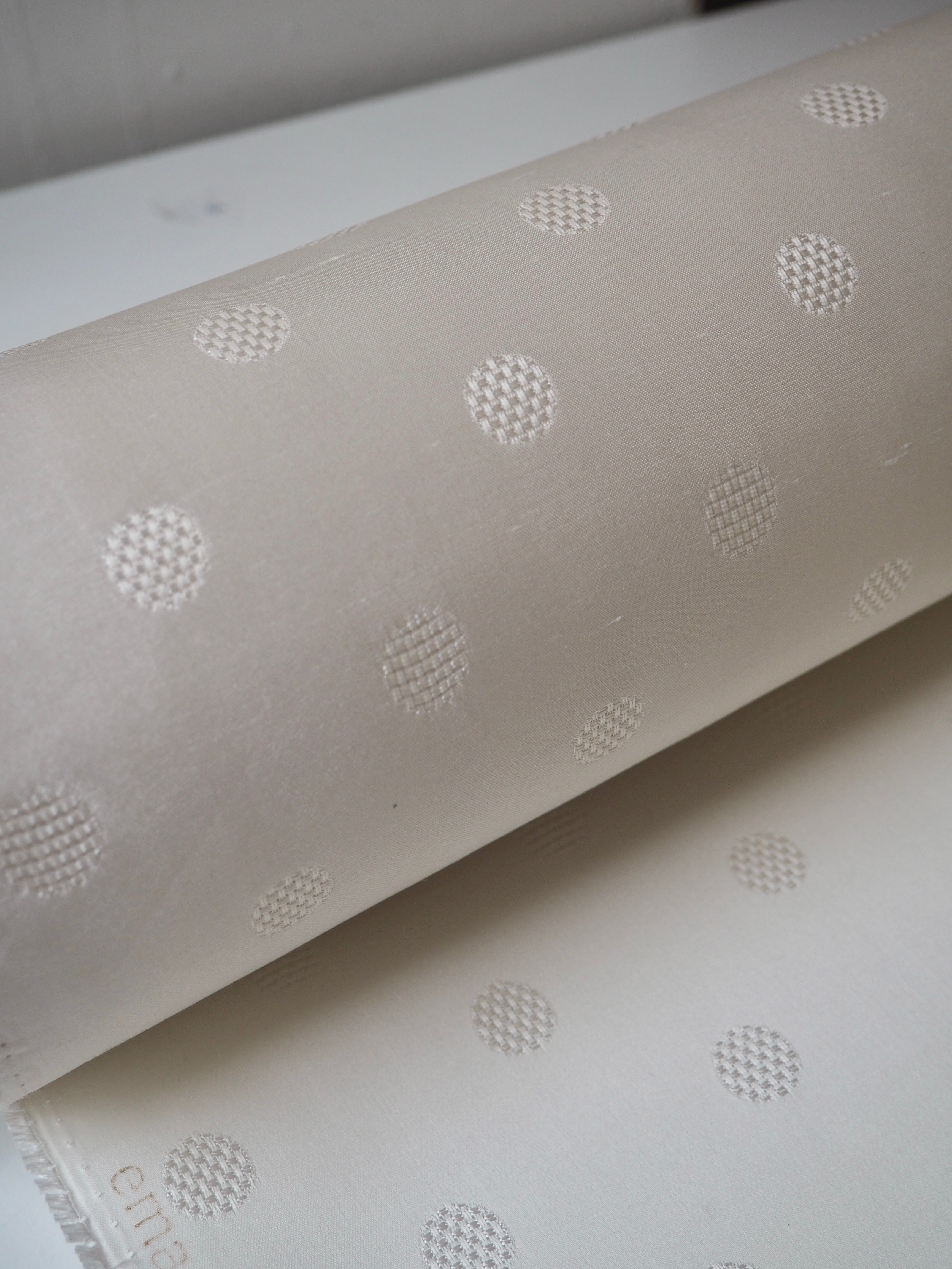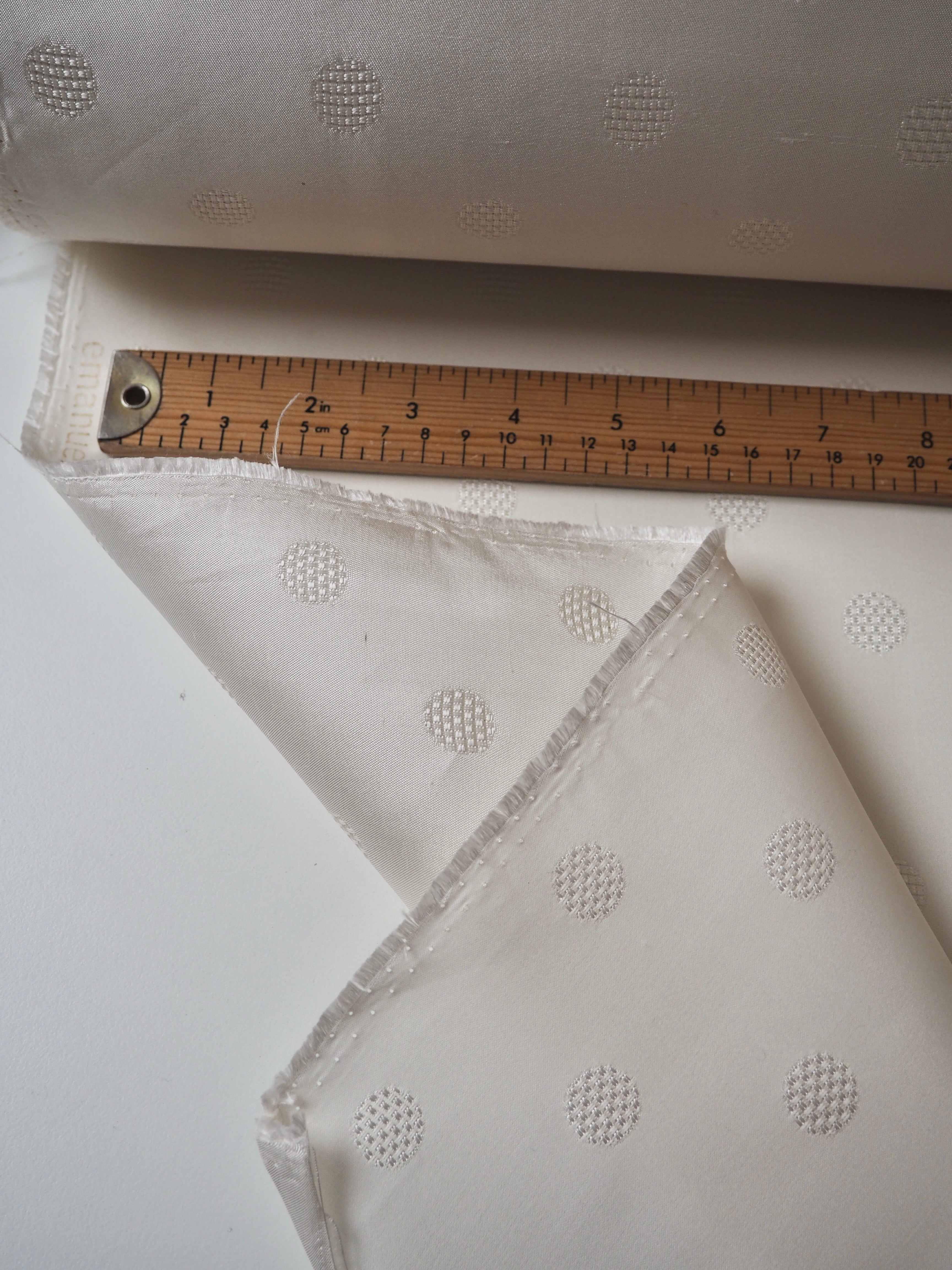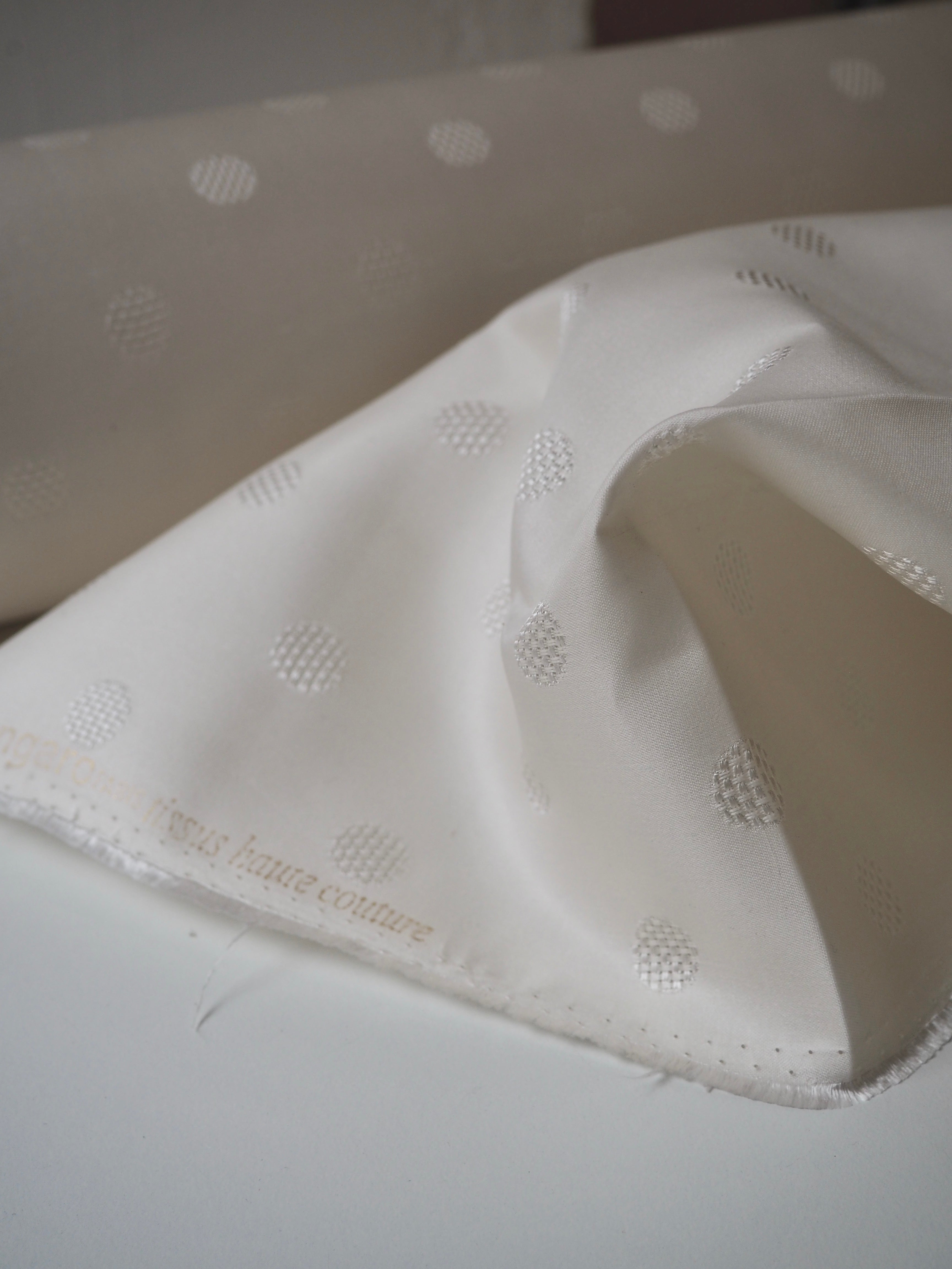 This ex-designer fabric is an incredible couture jacquard. It's designed by Emanuel Ungaro, Paris, and is a couture silk cloth. It's in an lovely slightly creamy ivory shade, with a slightly open-weave dot pattern. Main body of the cloth is a very structured silk, with the structure of a heavy organza. It's lightweight and has a slightly worsted raw silk weave, more evident on one side of the cloth. It's opaque and has a slightly rustle-y sound when in movement. Has a slight sheen finish from the lustrous silk yarns. Such an gorgeous cloth, would make a stunning wedding look!