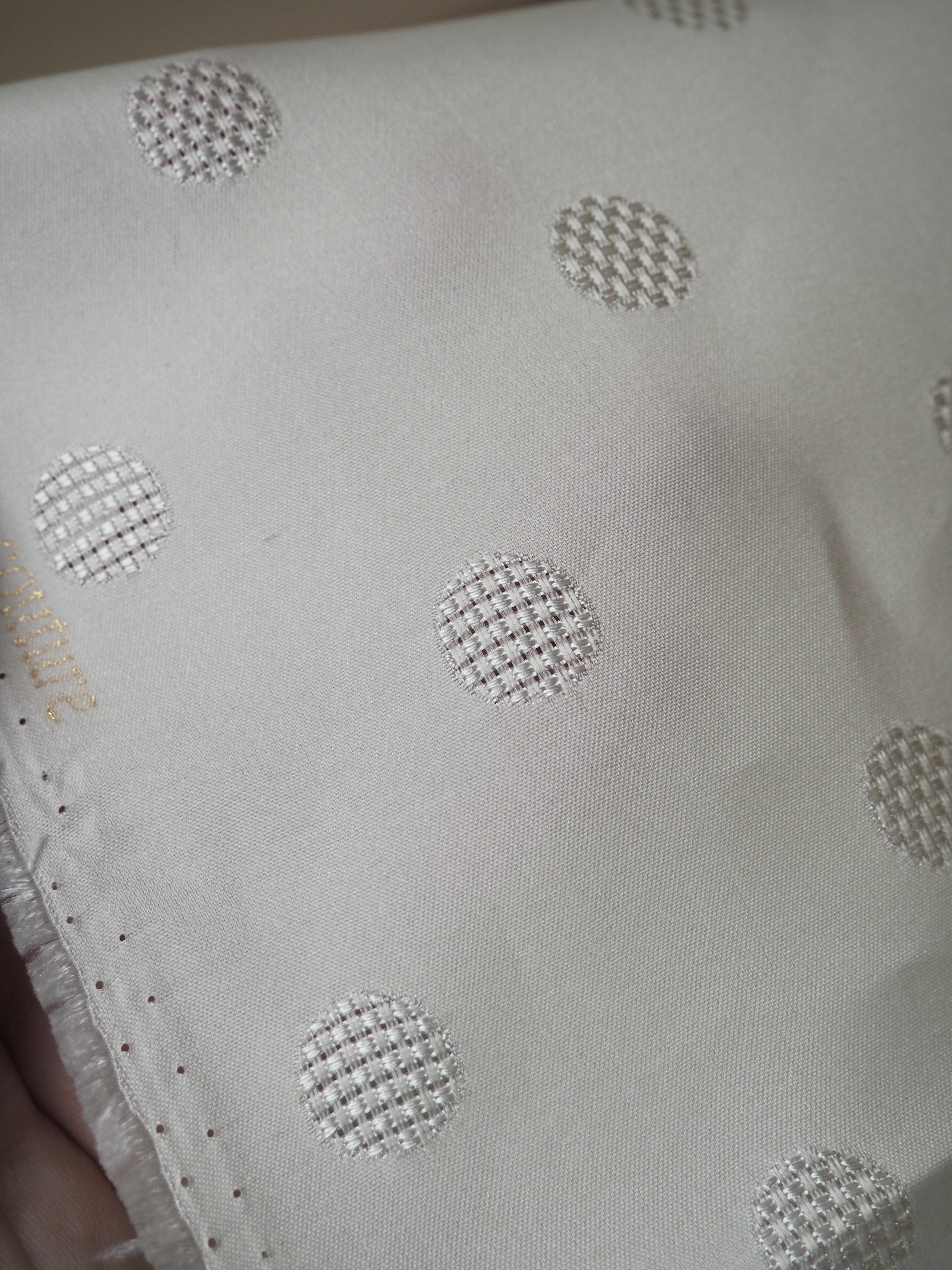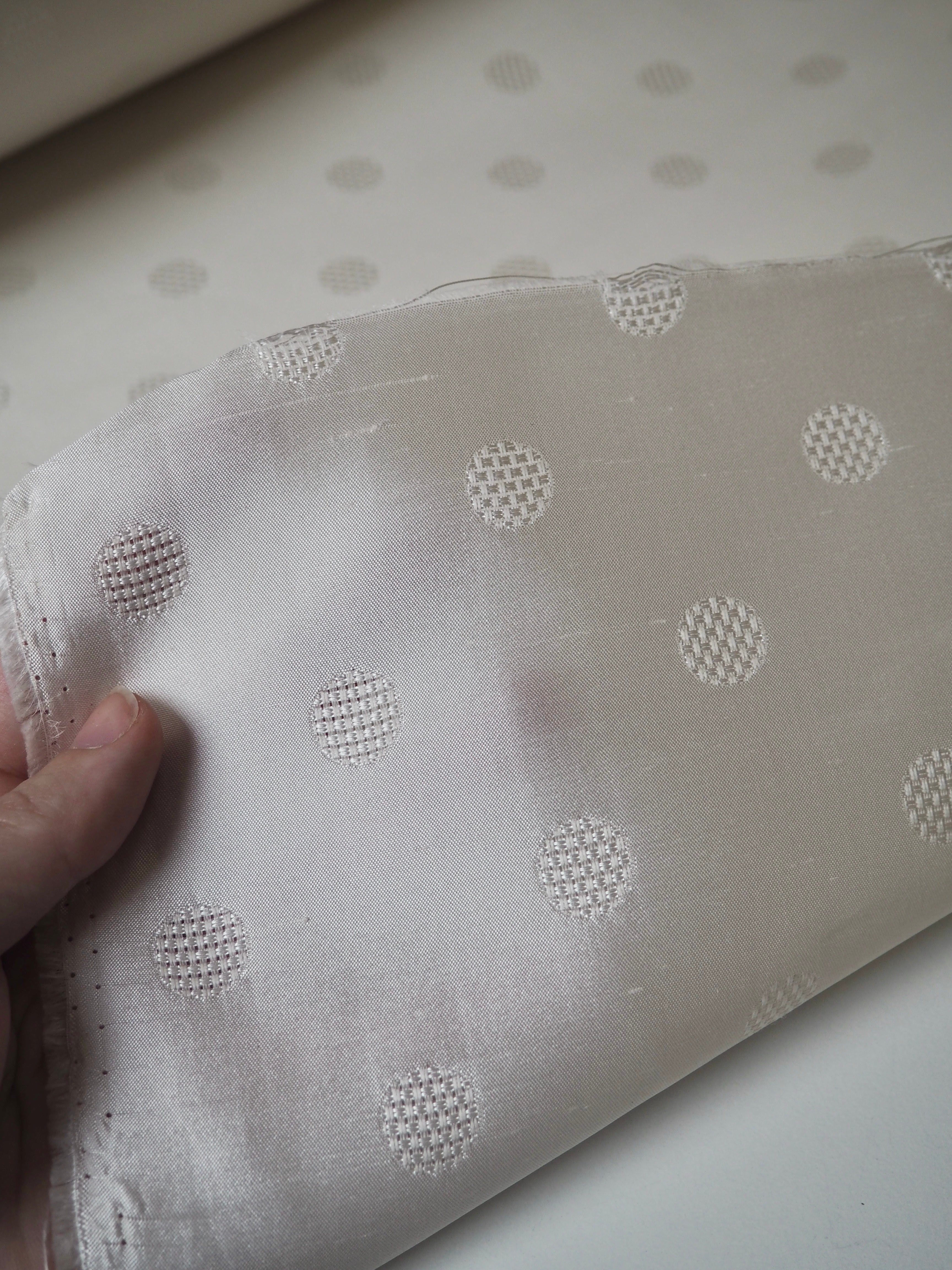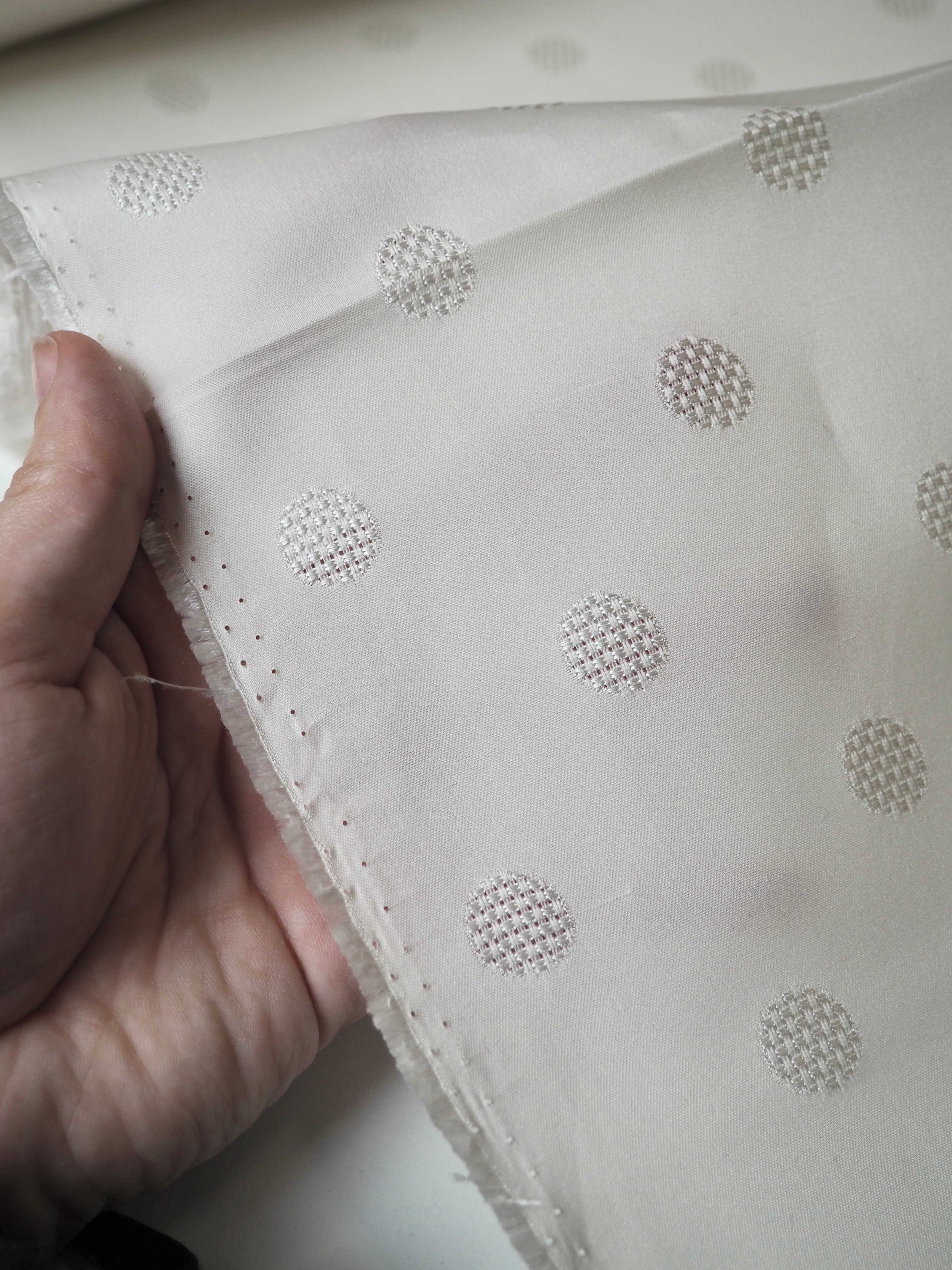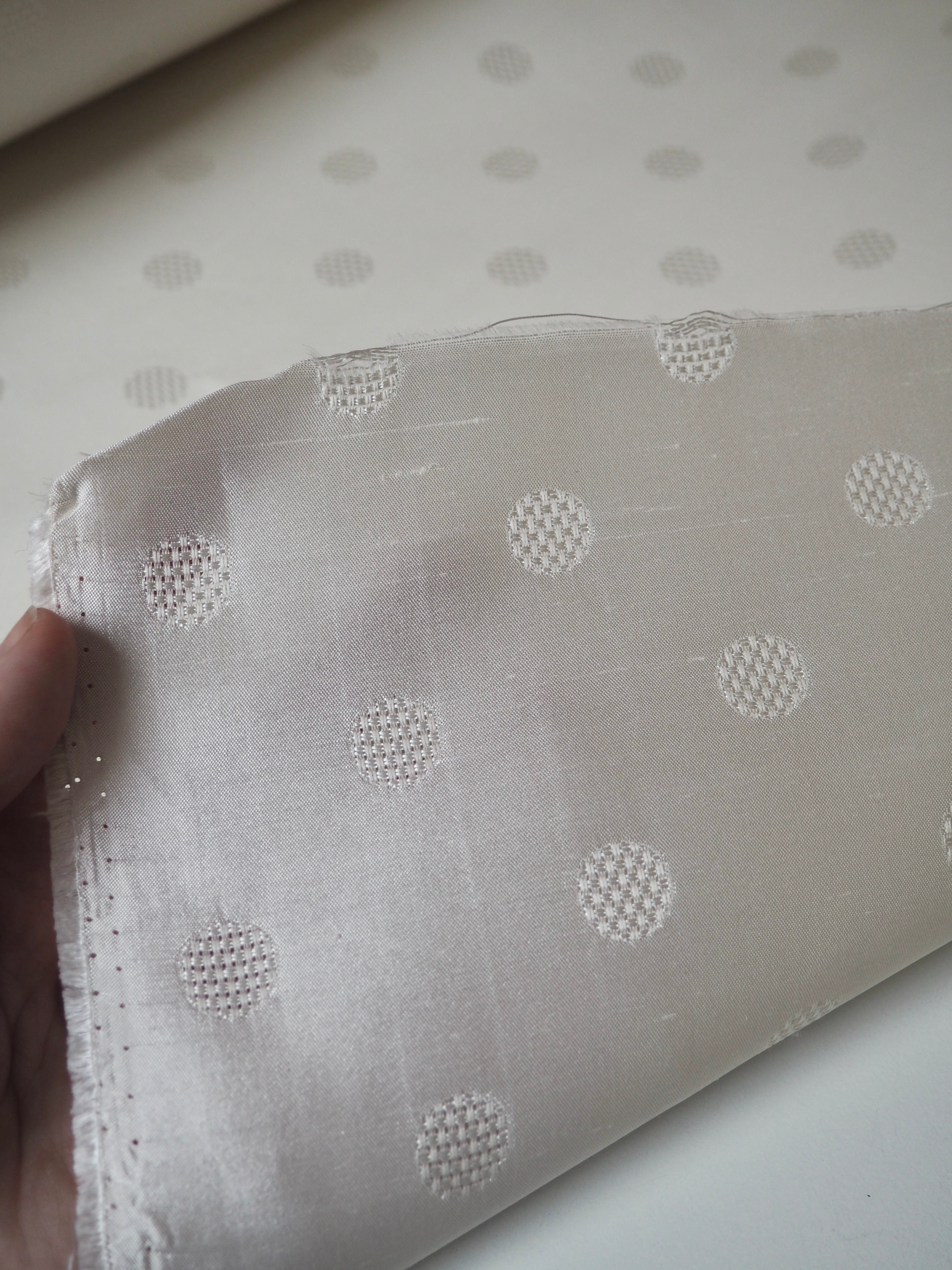 This ex-designer fabric is an incredible couture jacquard. It's designed by Emanuel Ungaro, Paris, and is a couture silk cloth. It's in an lovely slightly creamy ivory shade, with a slightly open-weave dot pattern. Main body of the cloth is a very structured silk, with the structure of a heavy organza. It's lightweight and has a slightly worsted raw silk weave, more evident on one side of the cloth. It's opaque and has a slightly rustle-y sound when in movement. Has a slight sheen finish from the lustrous silk yarns. Such an gorgeous cloth, would make a stunning wedding look!