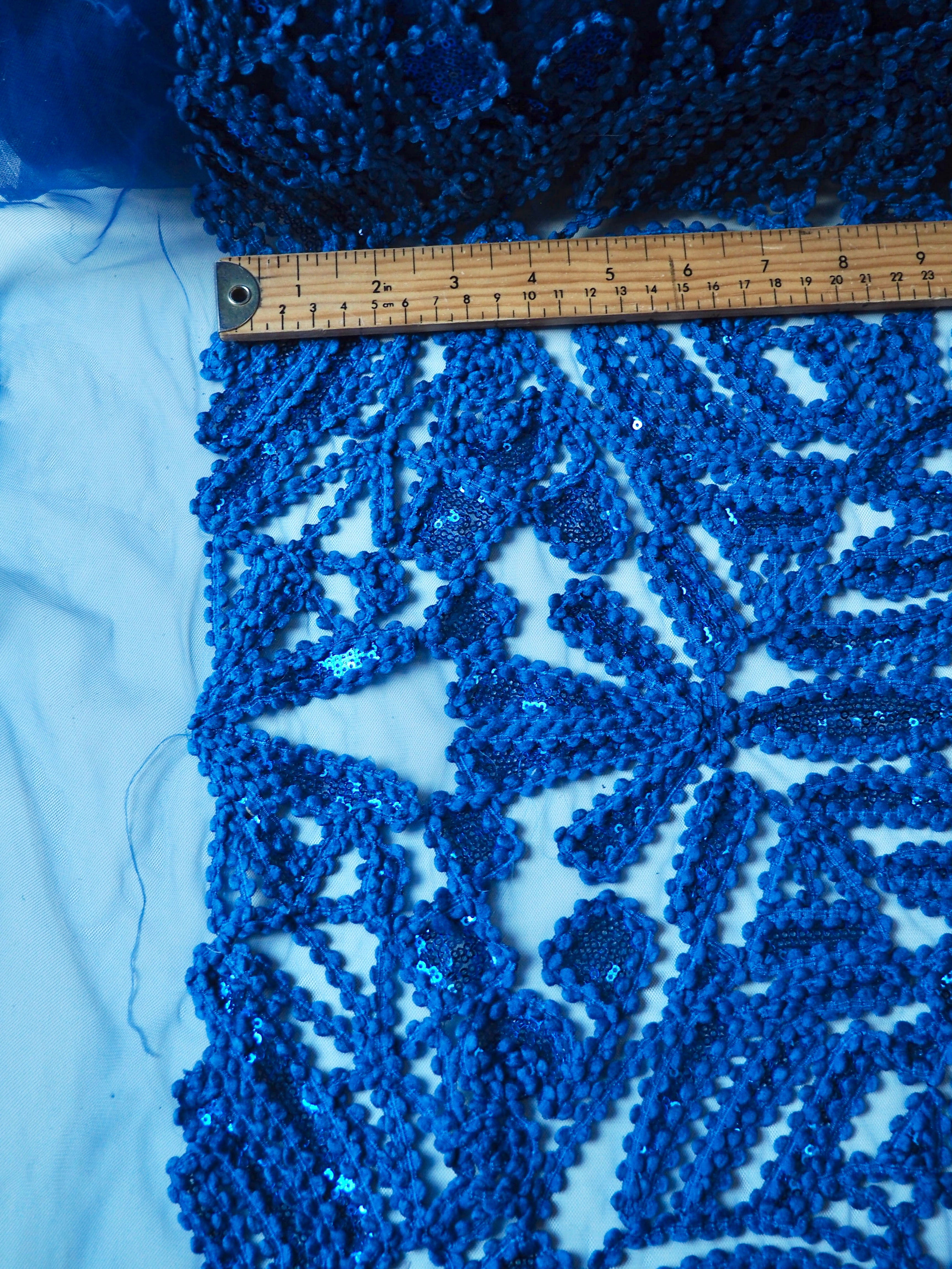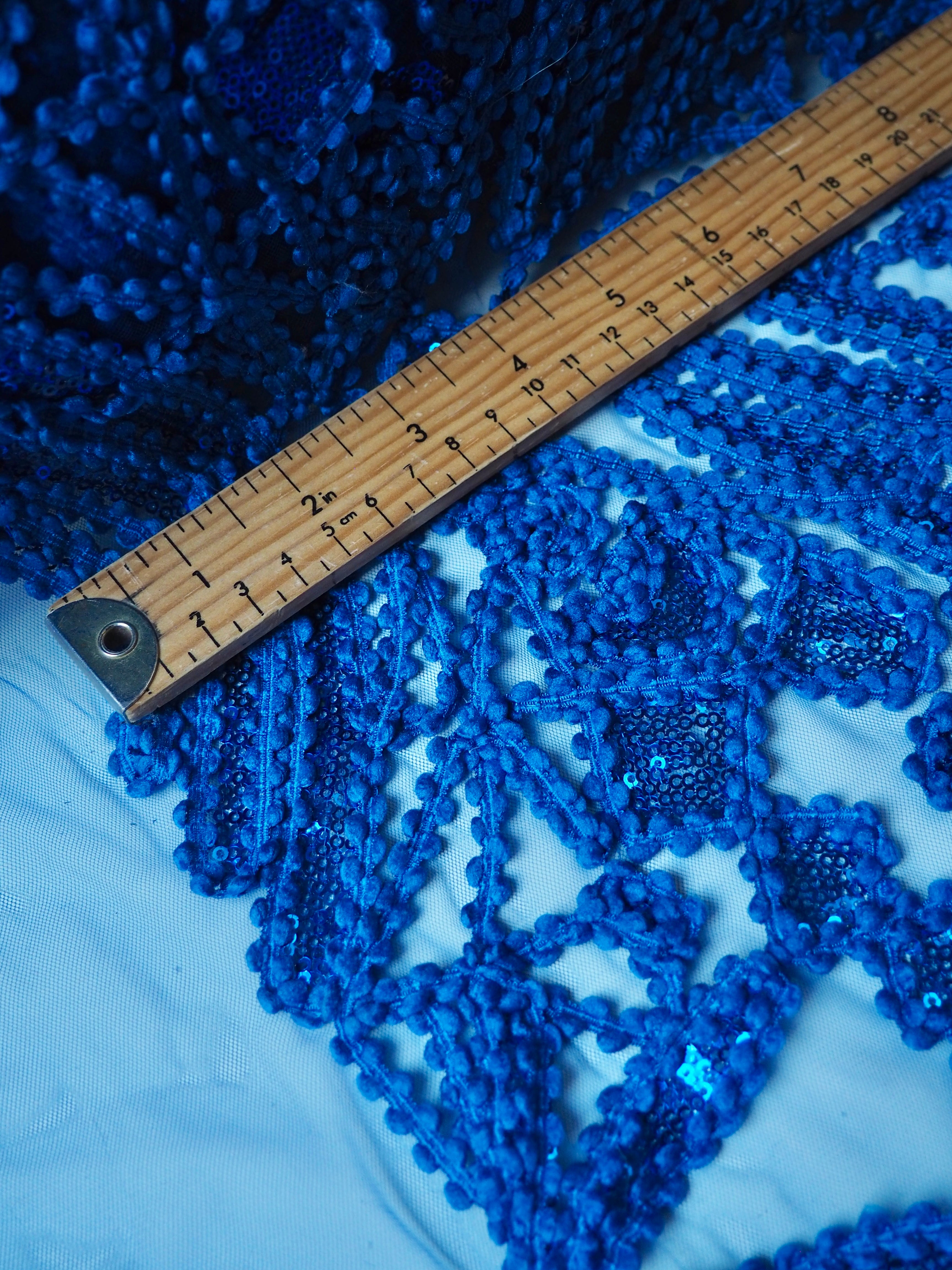 This ex-designer fabric is a gorgeous tulle. A bright blue bouclé-like trim is stitched in vine-like patterns with sequins across this blue tulle. It's quite unique and has a nice handle. Semi-sheer, and has a slight structure and lovely fall. Great for a special occasion piece!