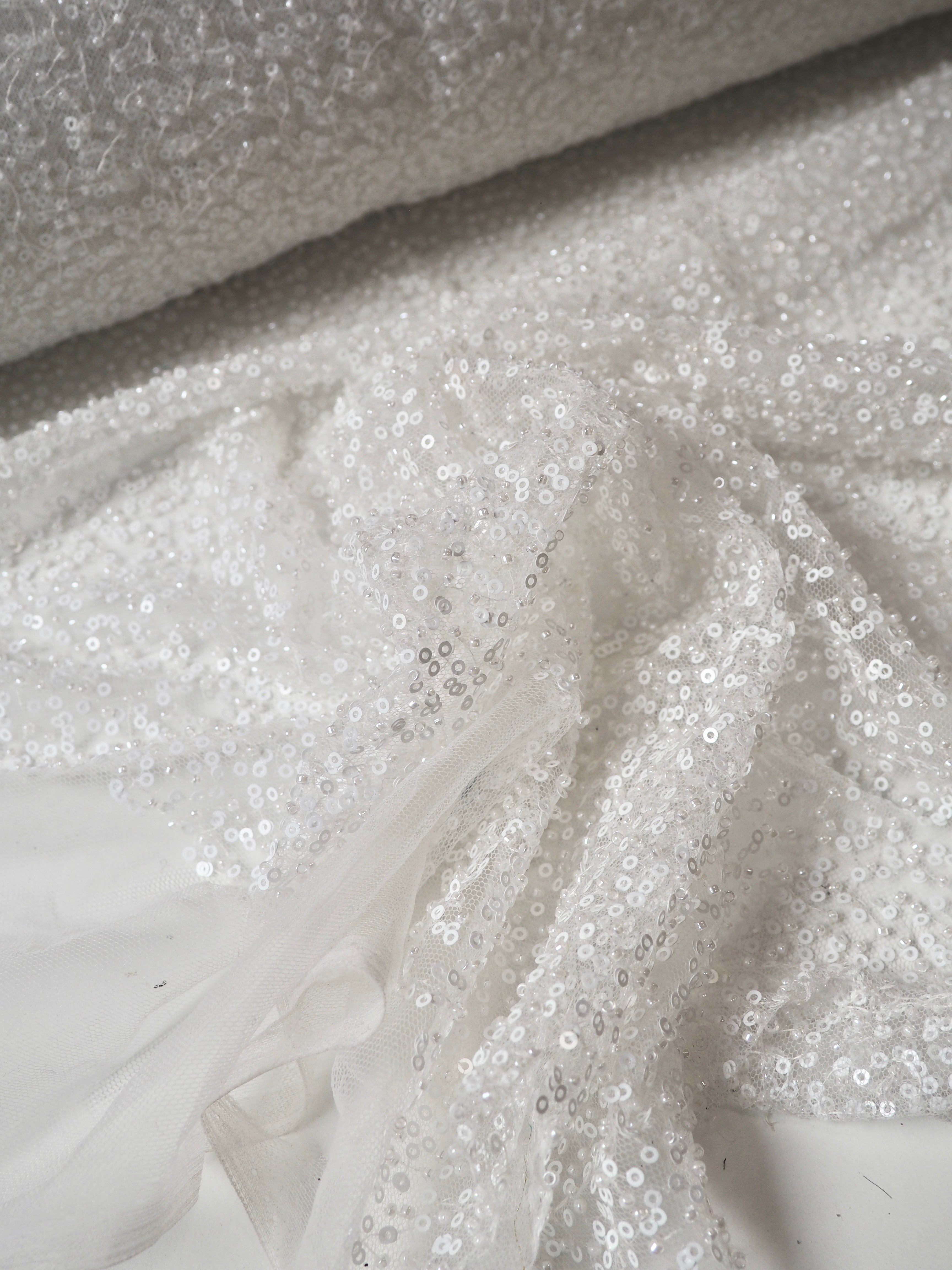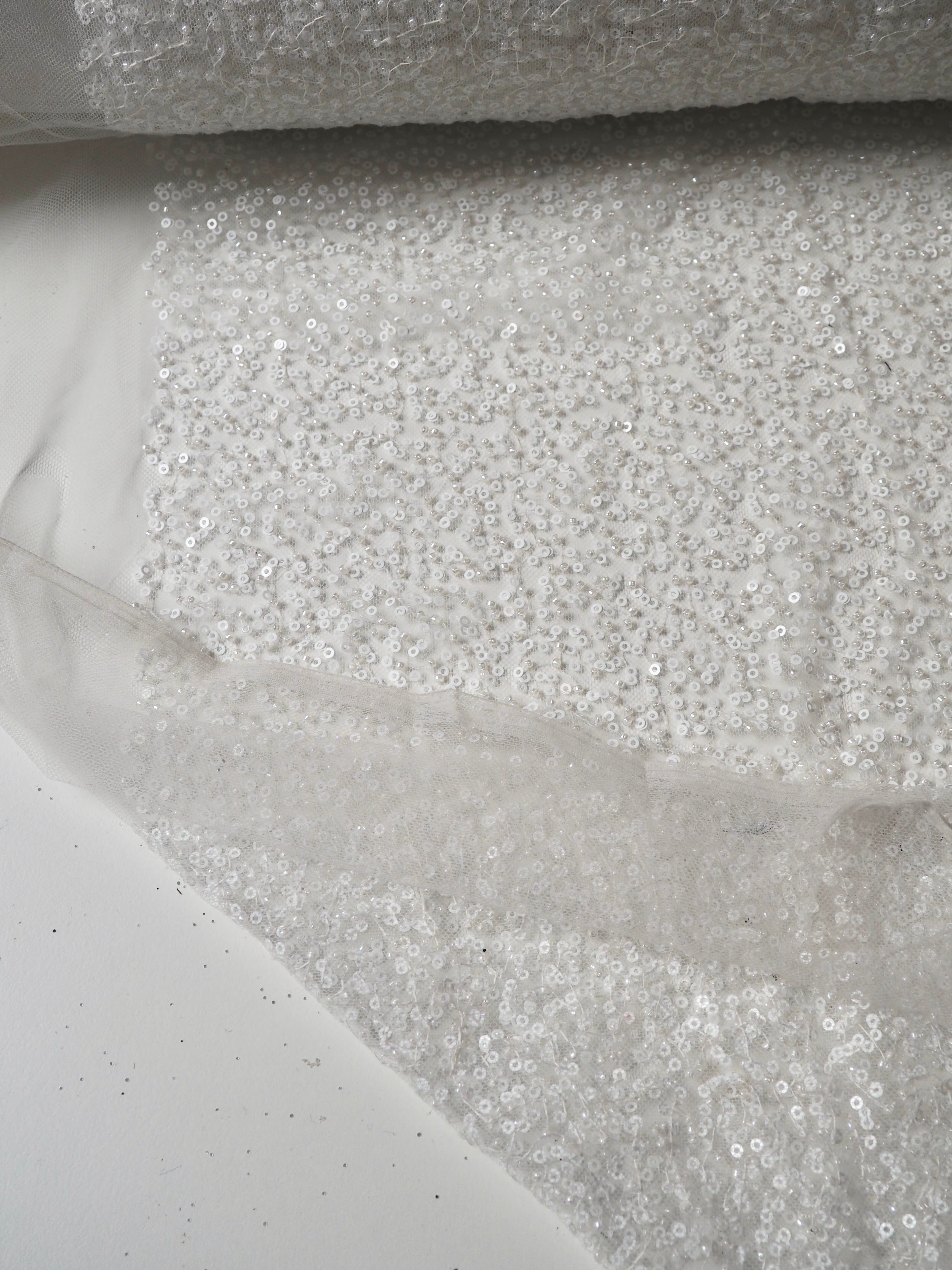 This ex-designer fabric is a gorgeous tulle. White sequins and beads are stitched across this white tulle. It's such a beautiful cloth, and has lovely movement when moving in the light! Medium weight and so fancy! Sheer, and has a nice structure. Perfect over a fancy dress or long jacket, or would be perfect for an evening bag or on a bridal look!