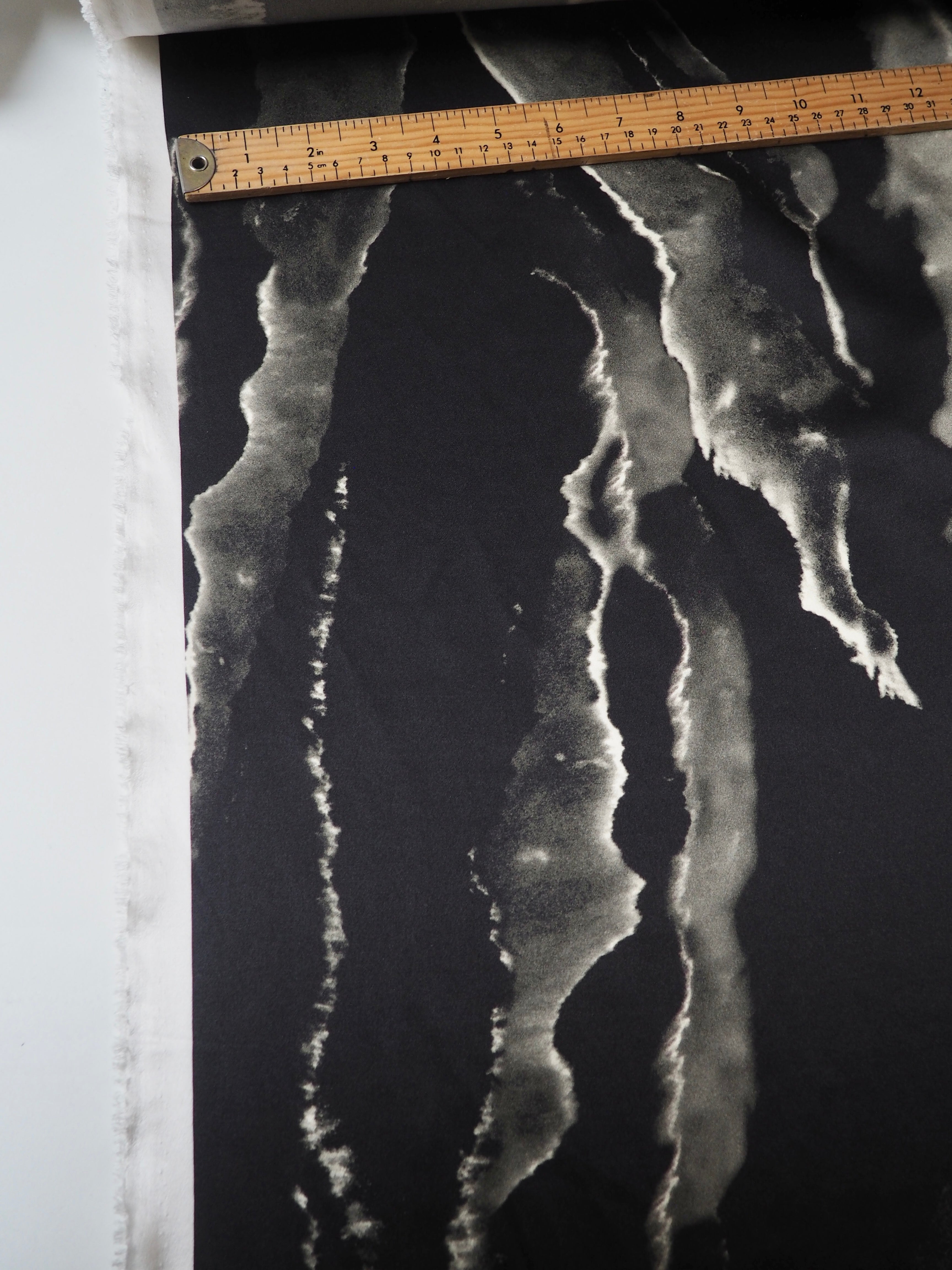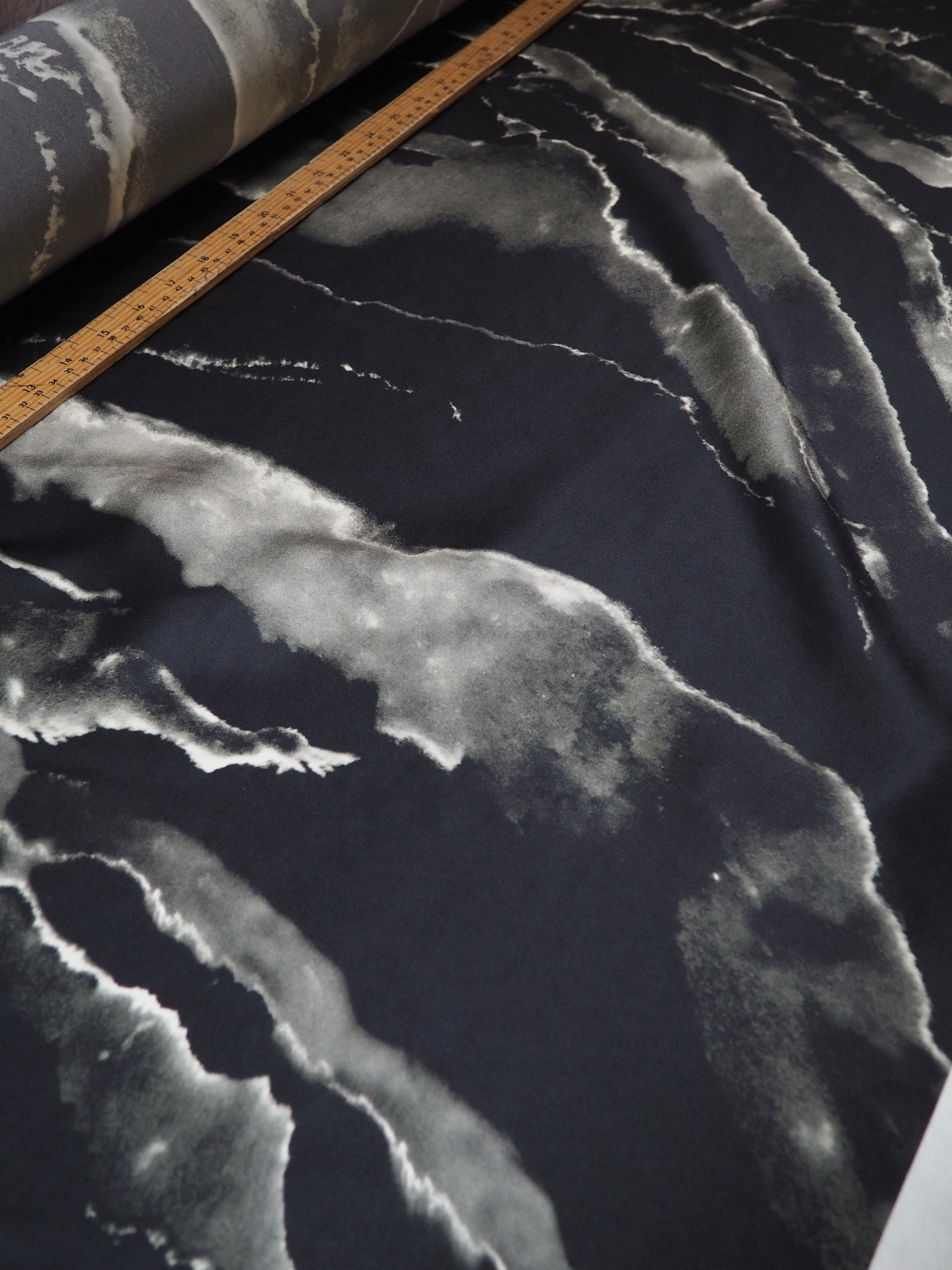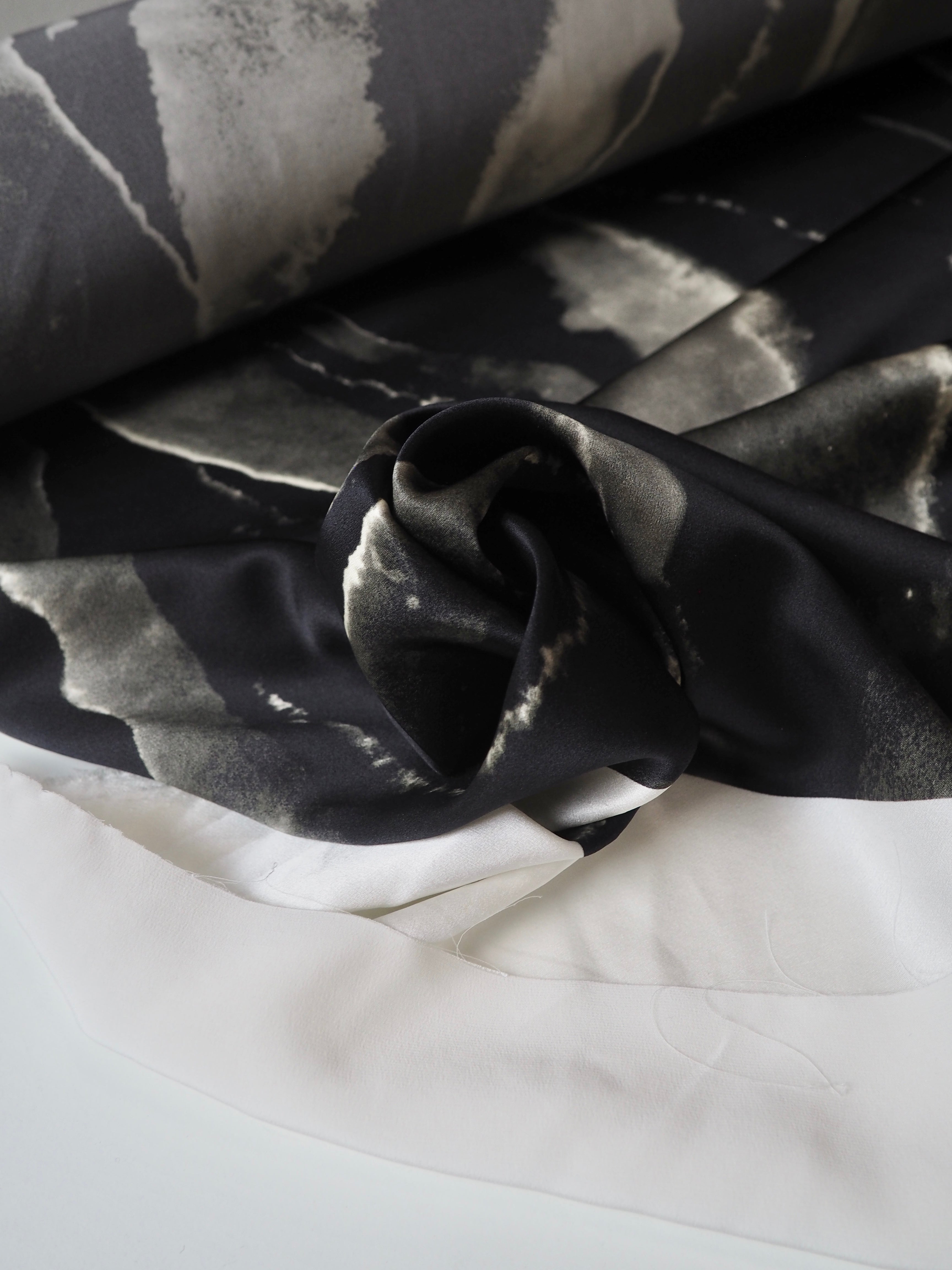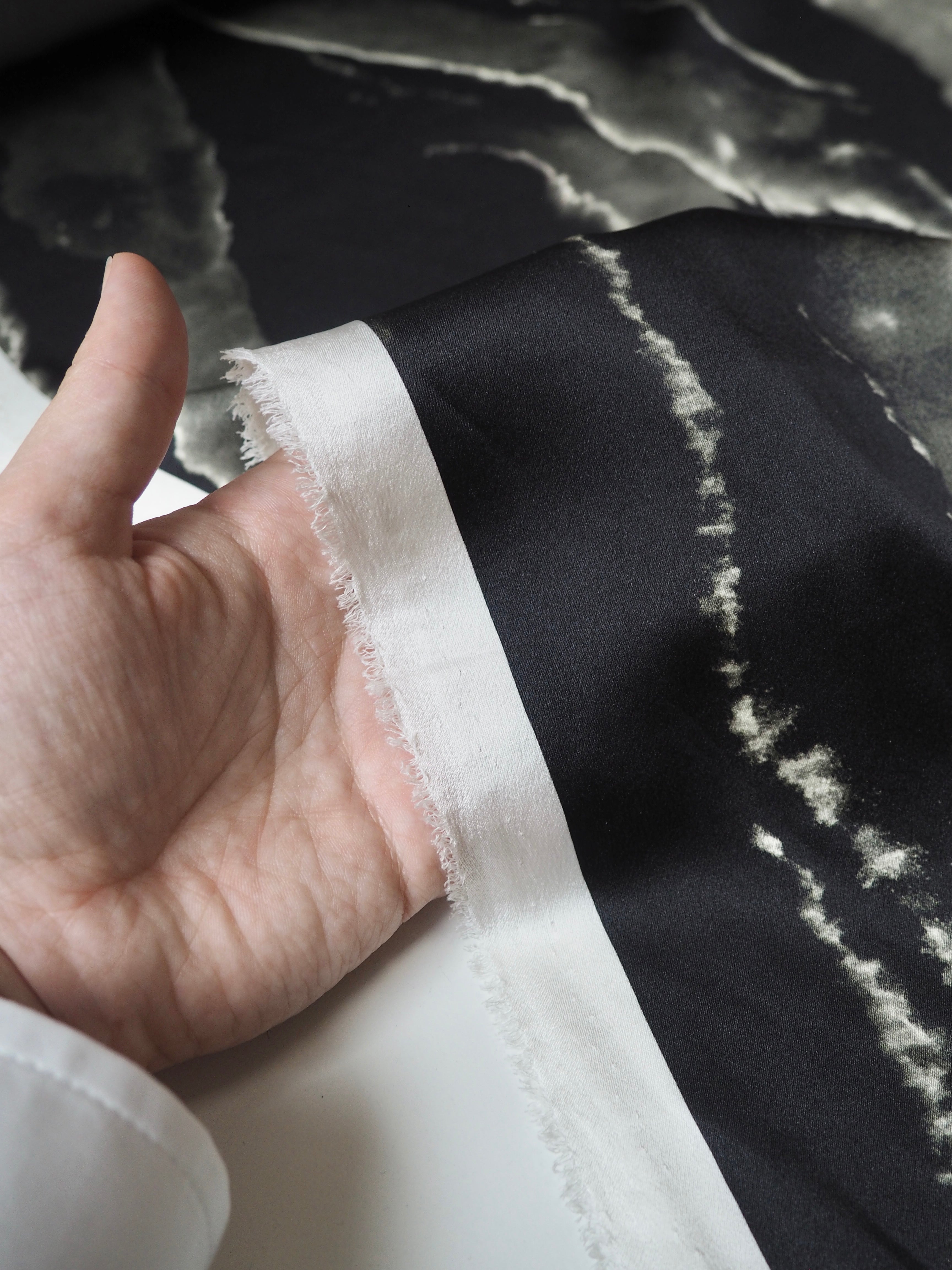 This ex-designer fabric is a silk satin. It's in a fluid marbled print. It's bespoke from a London designer. It's slinky, mostly opaque, and very soft. It has an incredible satin sheen and beautiful movement. Such a smooth and luxurious handle! It's medium weight and not as heavy as a duchess satin, but still heavier than a typical charmeuse. The perfect drapey silk for dresses or button up blouses! This cloth as slight breaks in the printing every few metres, pictures show this.