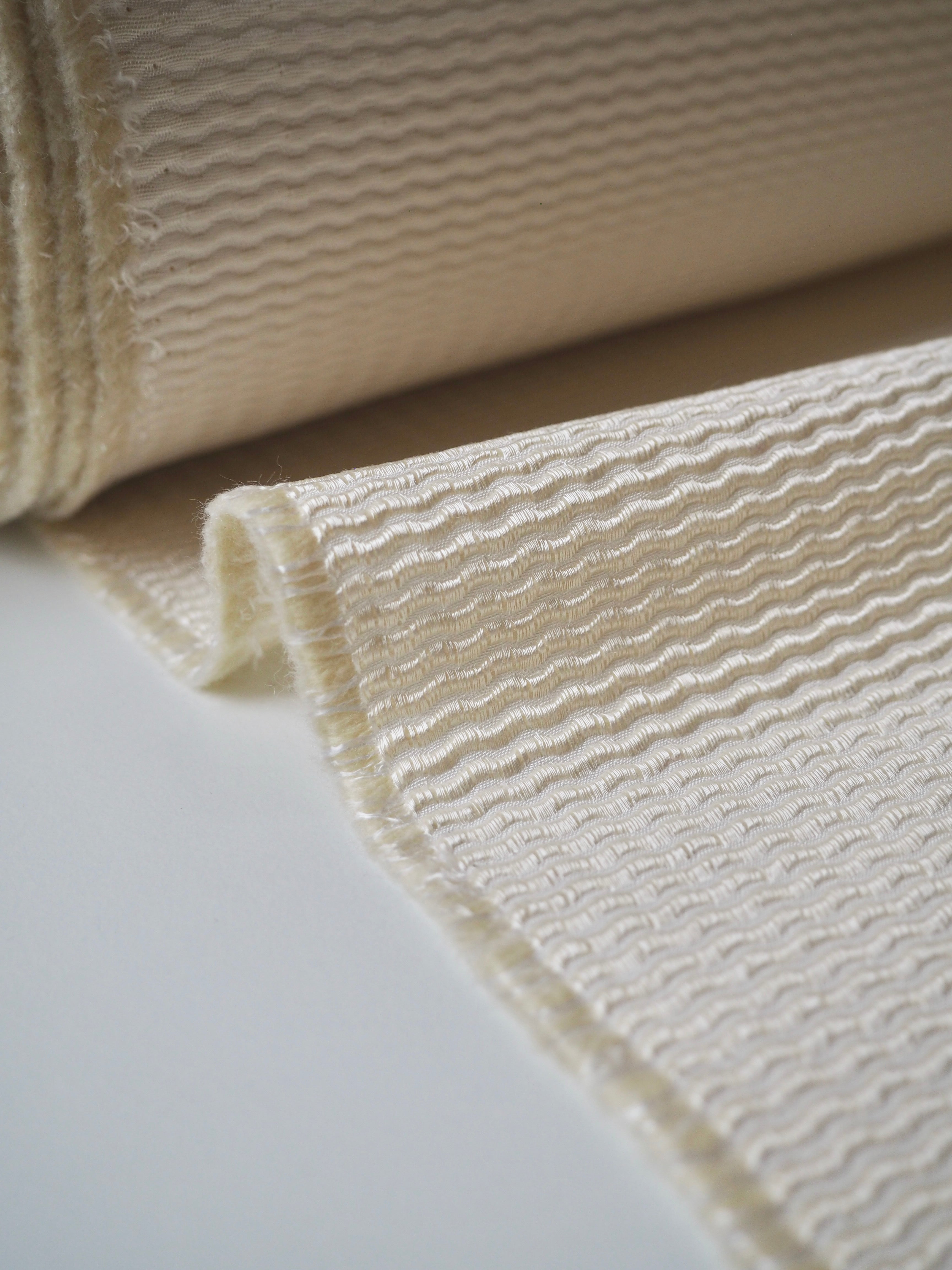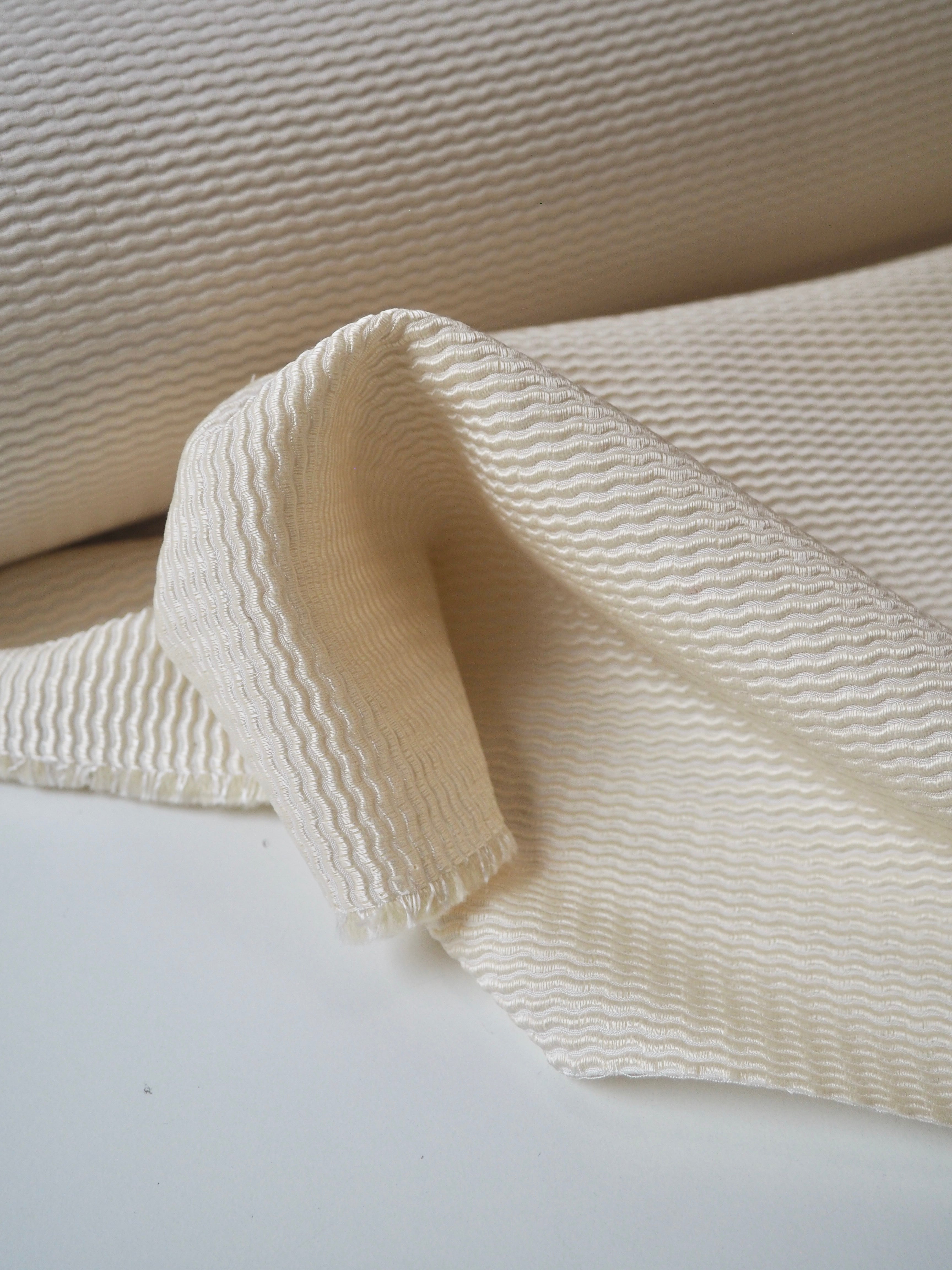 This ex-designer fabric is a jacquard. It's a unique small wave weave that give it an interesting depth. It's medium weight with a sturdy handle and great texture. Opaque and has a great structure to play with. The wool and viscose fibre blend gives it a lovely sheen finish. Would be great on a structured jacket and furnishings! This cloth has a subtle imprinted wave when reflected in the light across the whole roll. We don't believe it affects the integrity of the cloth, but it is visible.