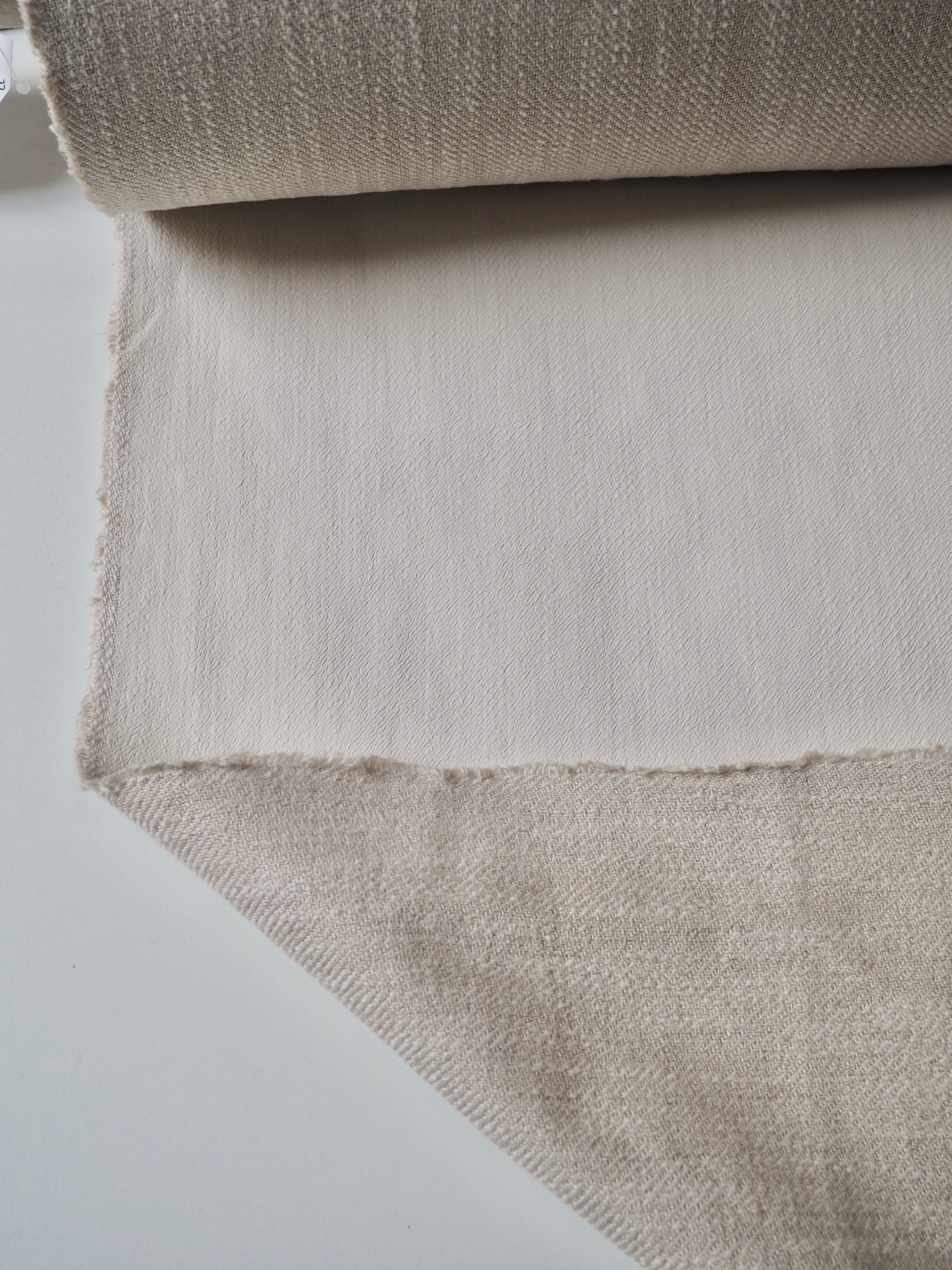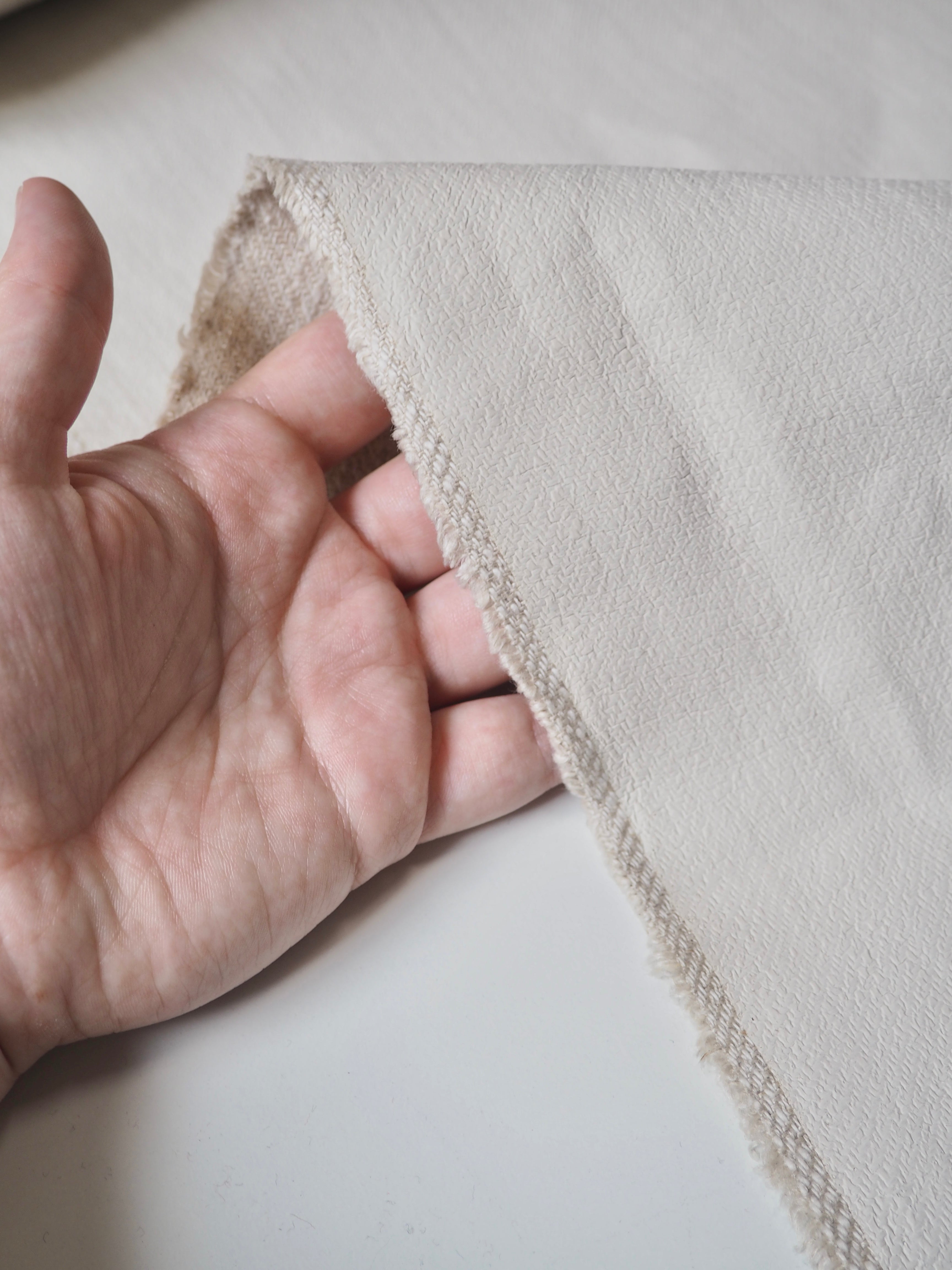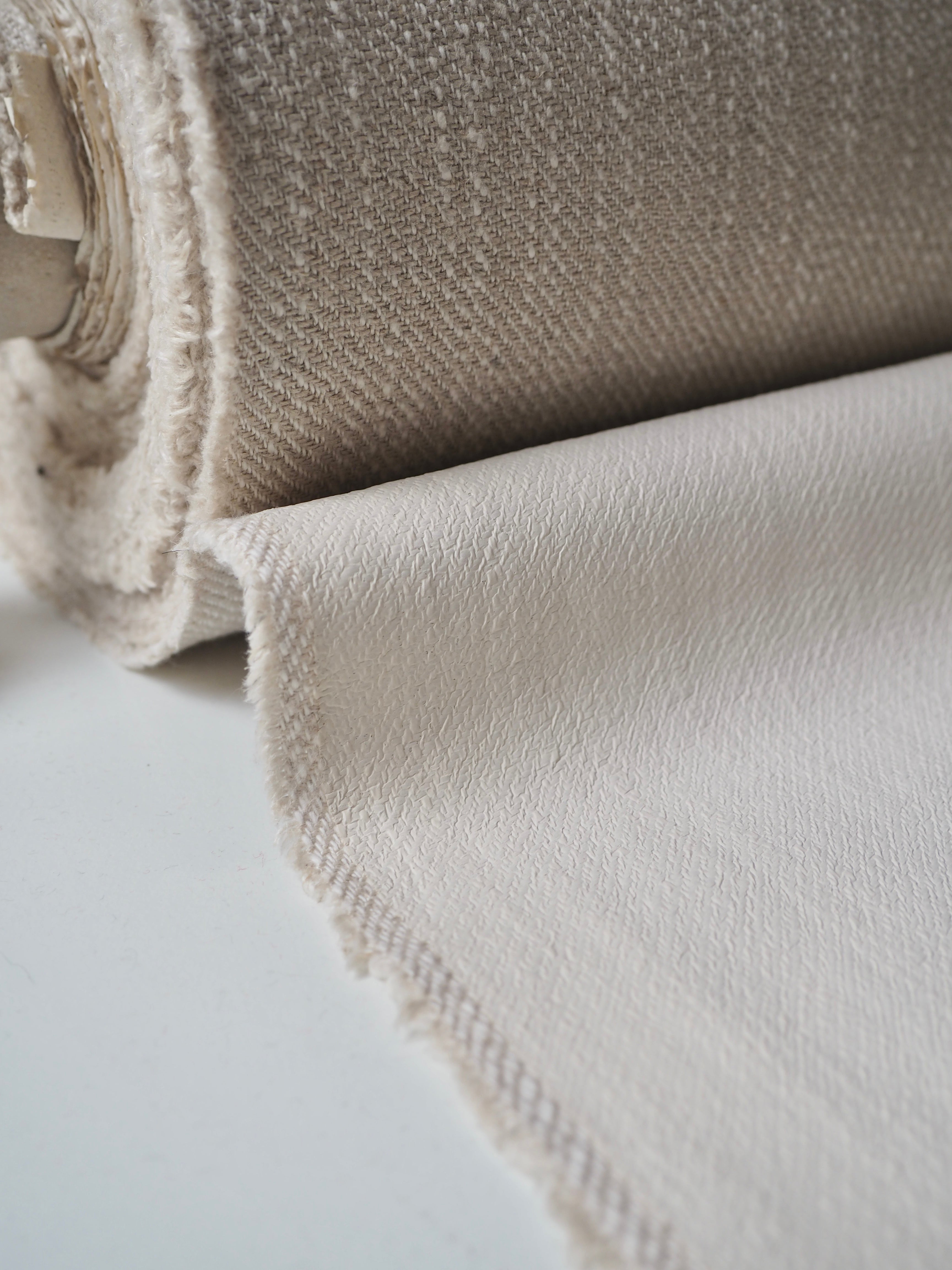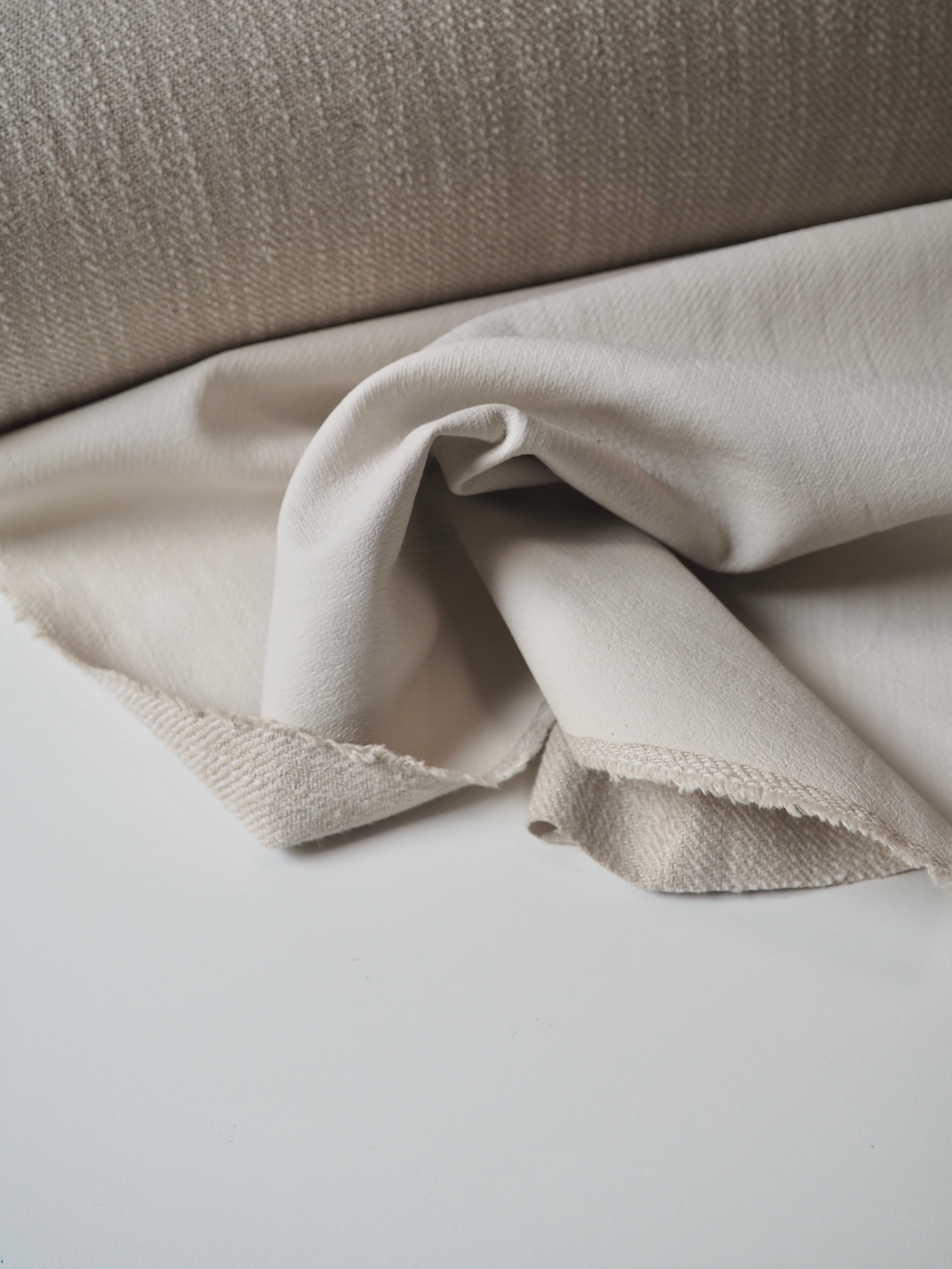 This ex-designer fabric is a coated twill. It's a natural cream colour in a looser-weave twill. The reverse is coated with a light off-white coating, which helps waterproof it and makes it great for outdoor wear or patio projects. It's soft and has a great structure. Medium weight, fully opaque, and a nice natural feeling handle. Perfect for cushions or a lightweight jacket!