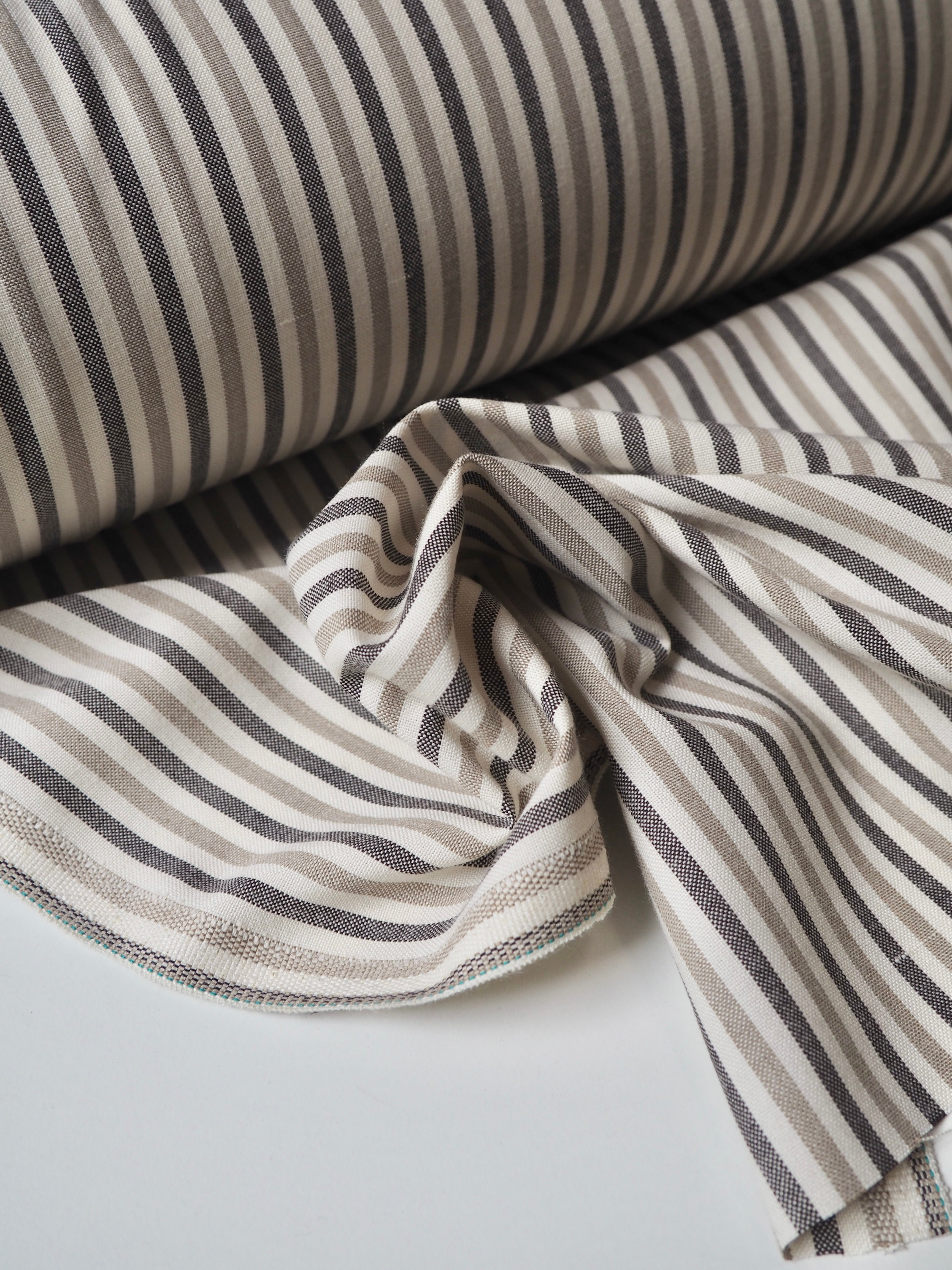 This ex-designer fabric is an Oxford cloth. It's a densely woven cotton blend stripe, that has the look of a handloom finish. It's medium weight and opaque, with a gentle structure and light drape. It's soft and feels really nice! It would make a lovely overshirt or trousers, could even be used for drapes or blinds!