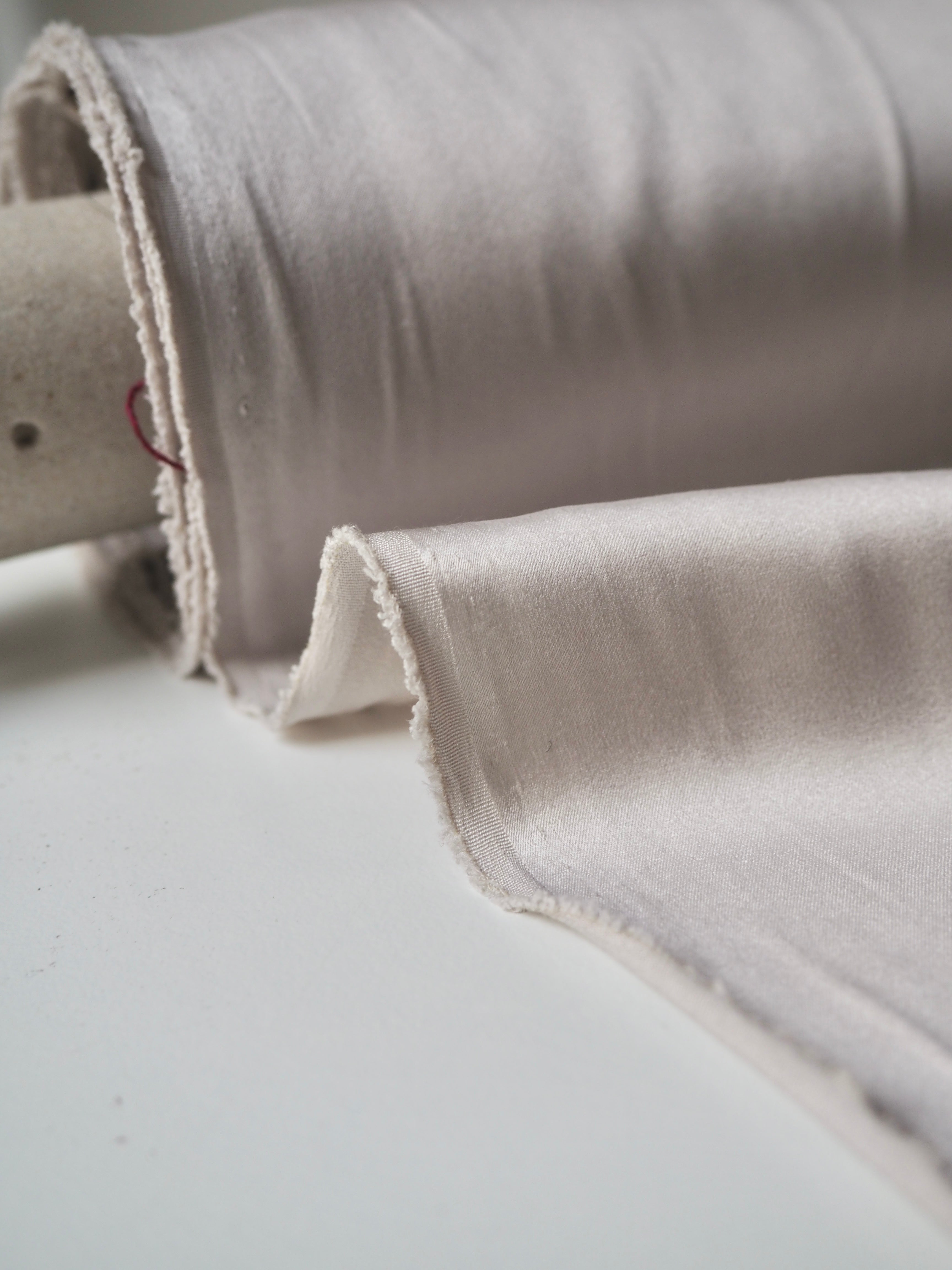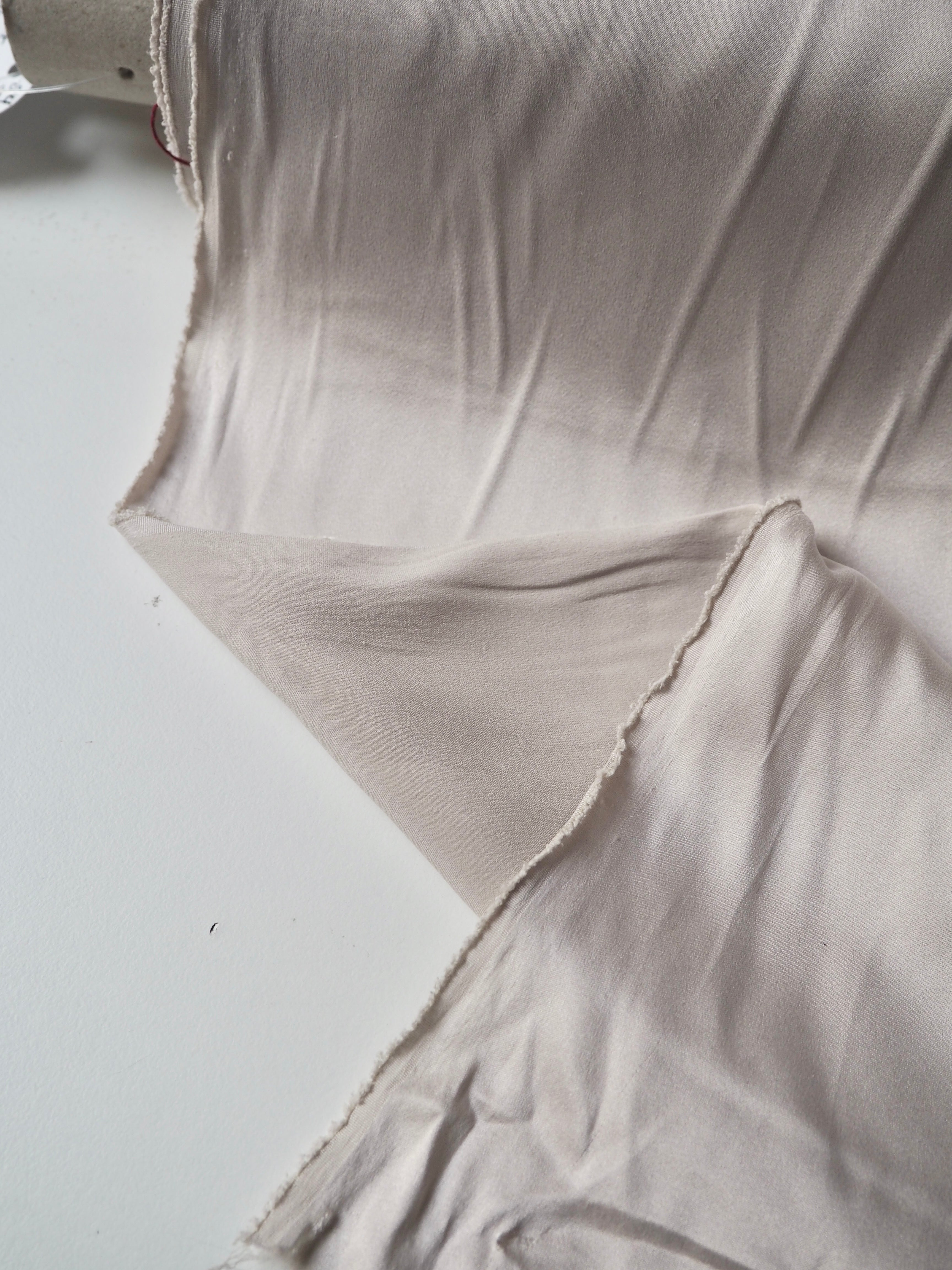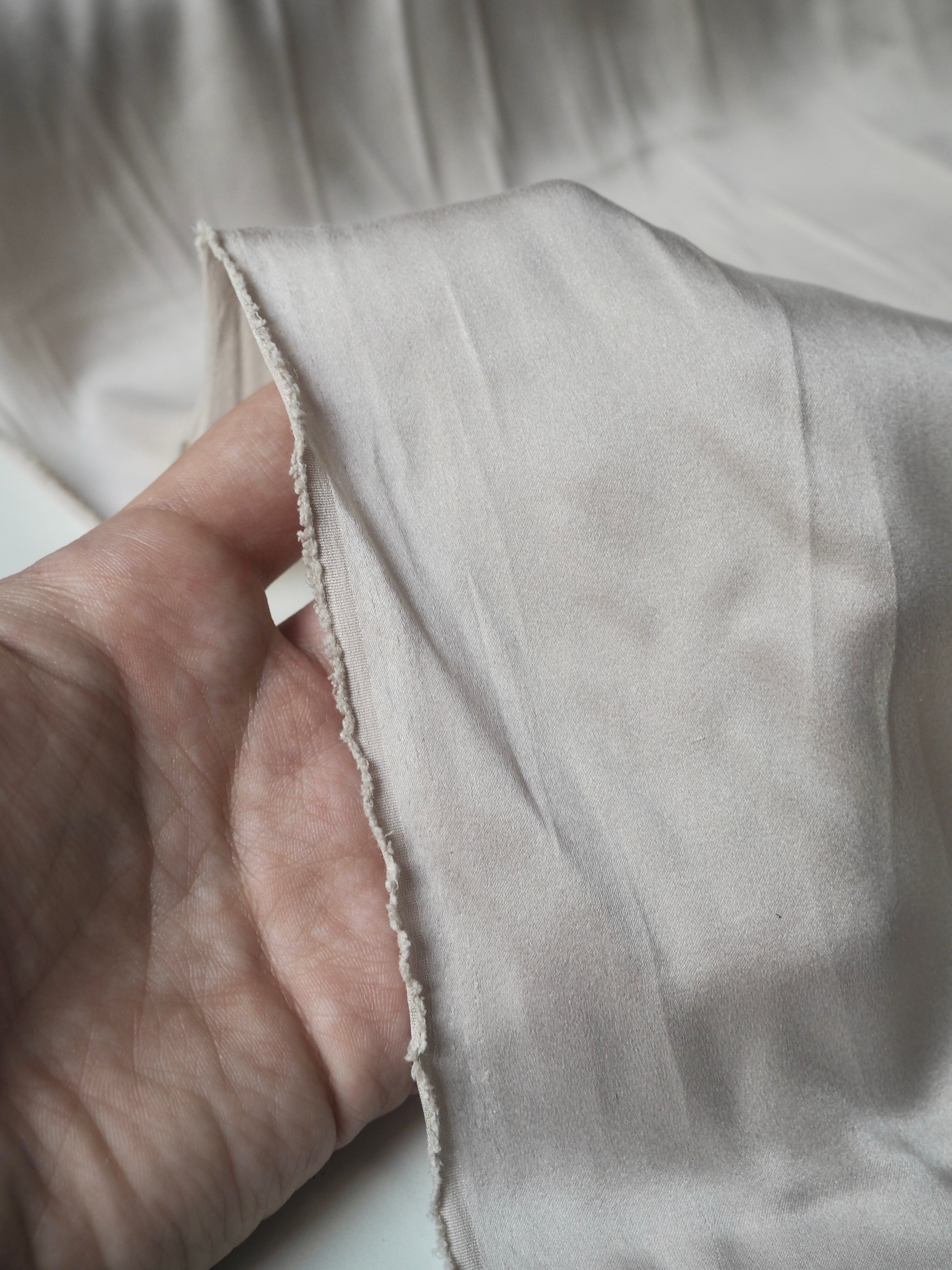This ex-designer fabric is a washed silk. It's a luxuriously soft silk, with a washed finish. This makes the silk drape better and softens it. The stretch gives it more versatility, with about 15% width-ways. It has incredible liquid movement! Super lightweight and opaque. Such a wonderful handle, feels so fantastic to the touch! Perfect for skirts, blouses, and lingerie!