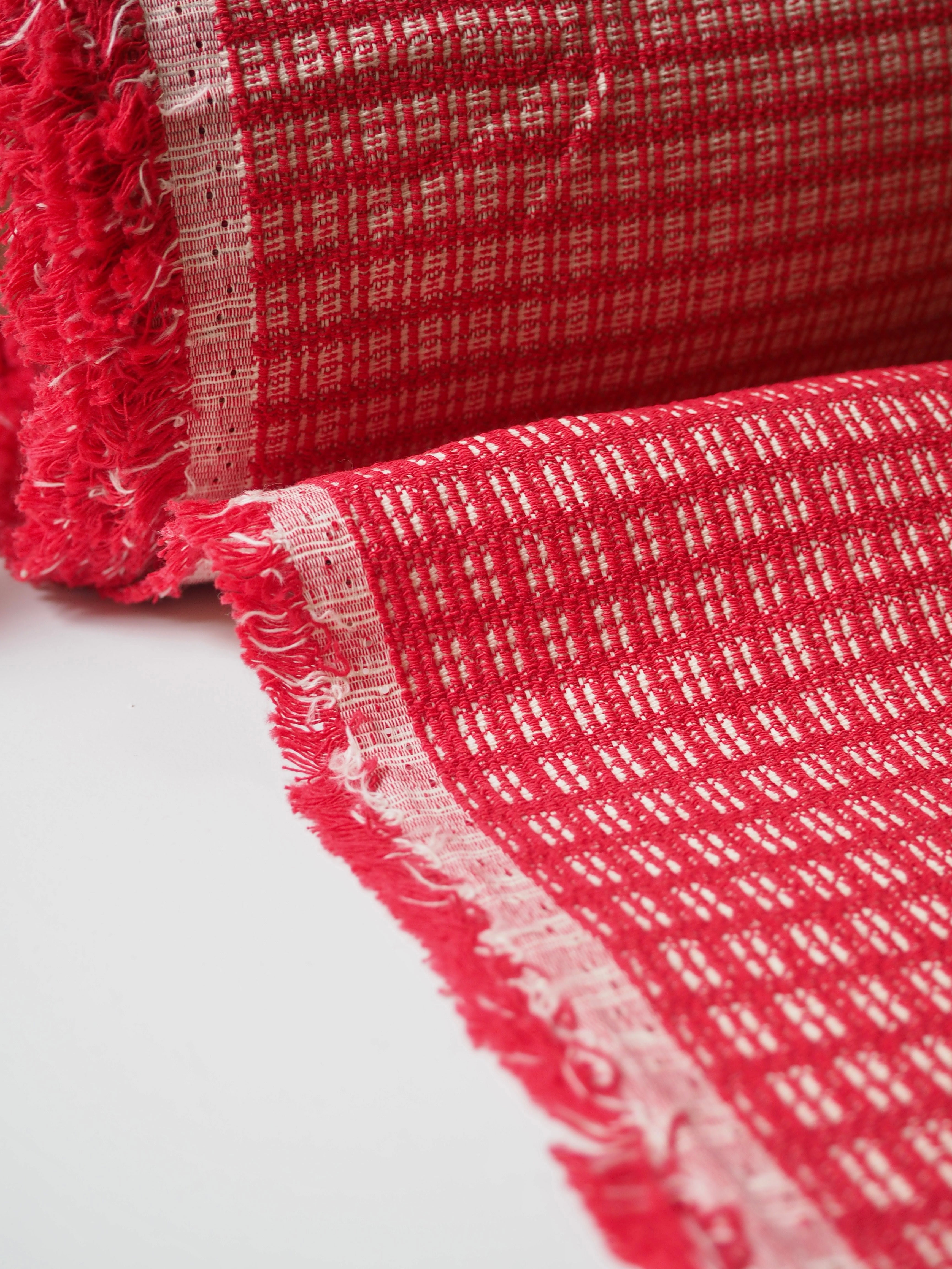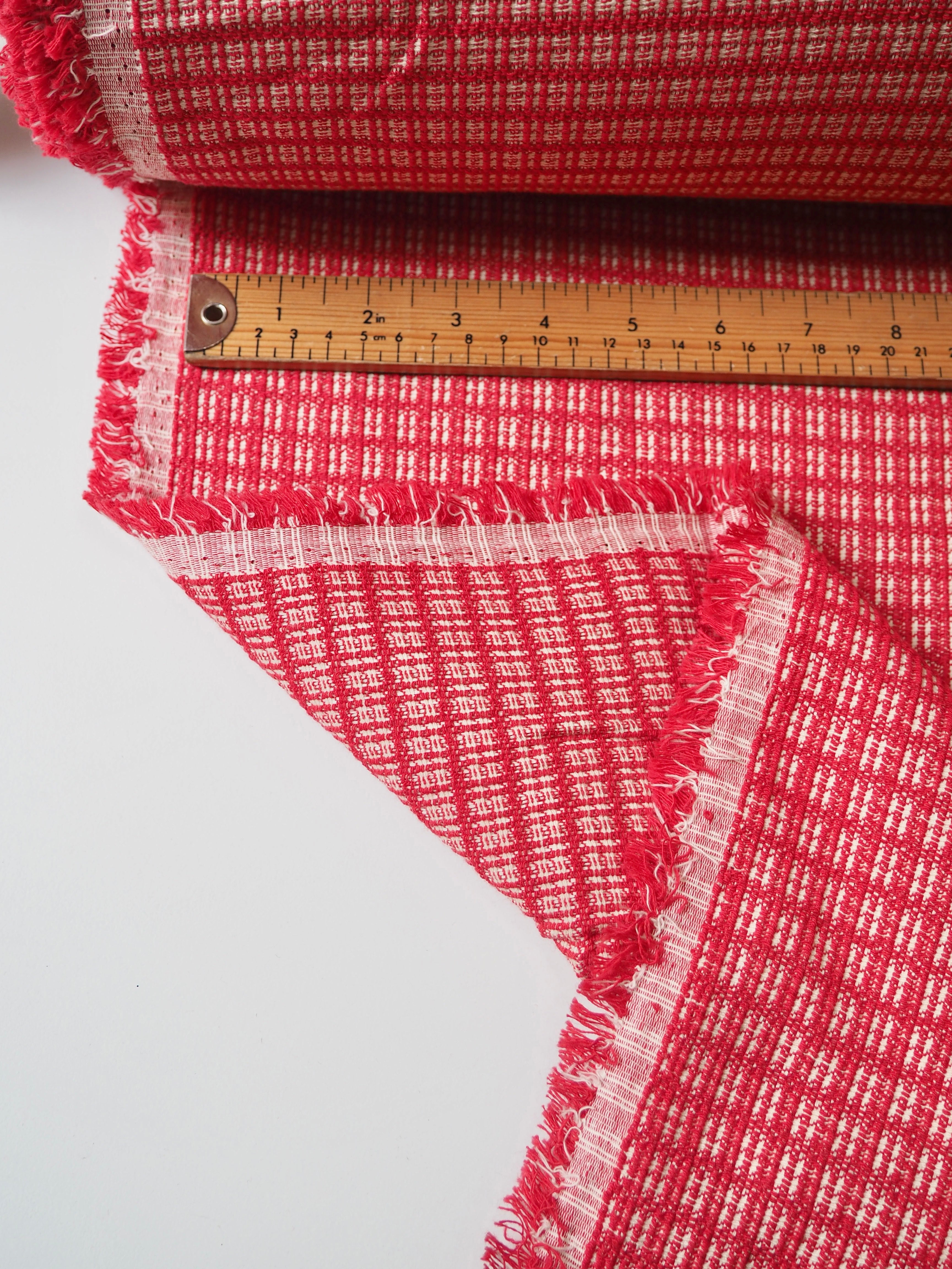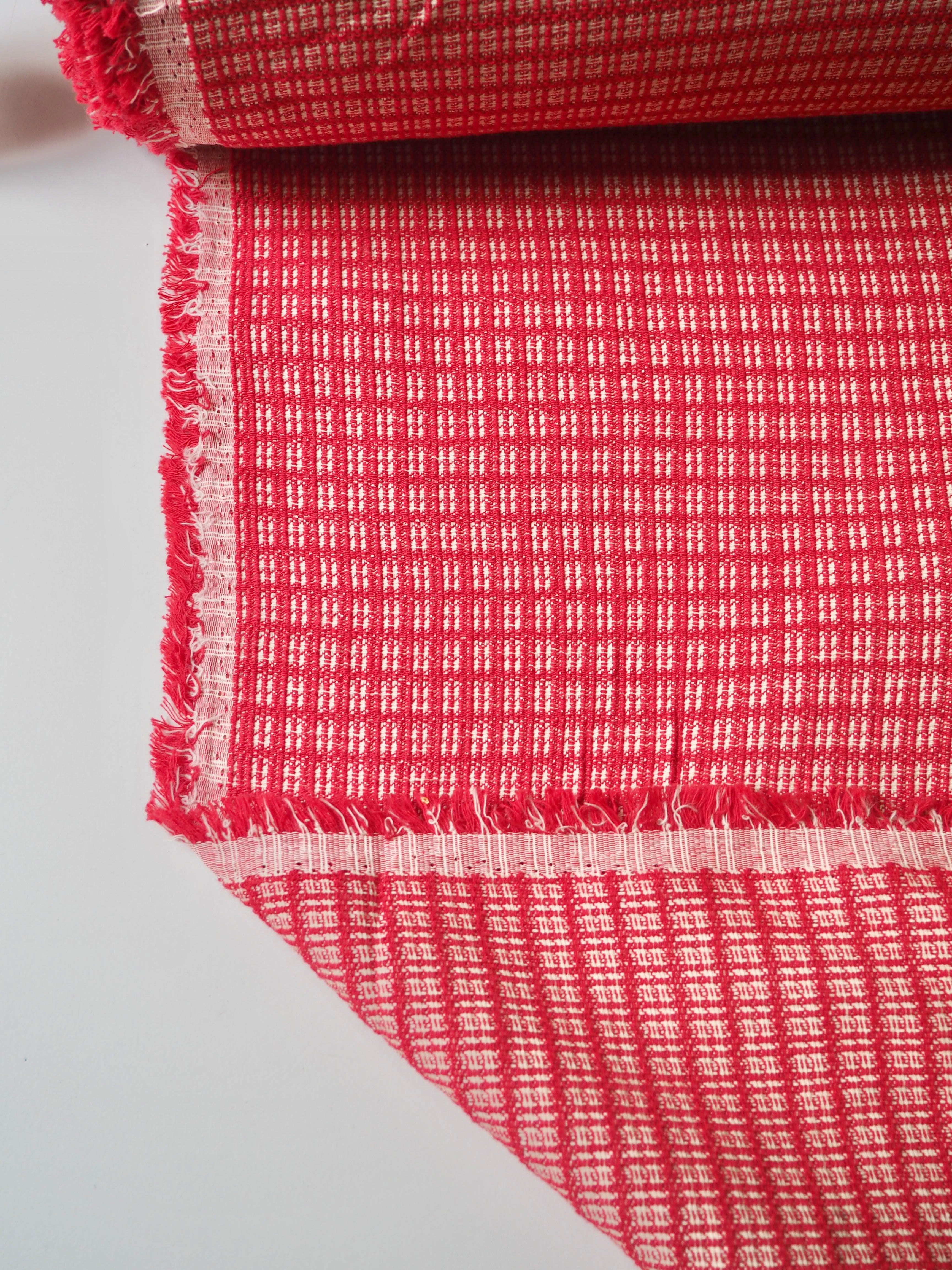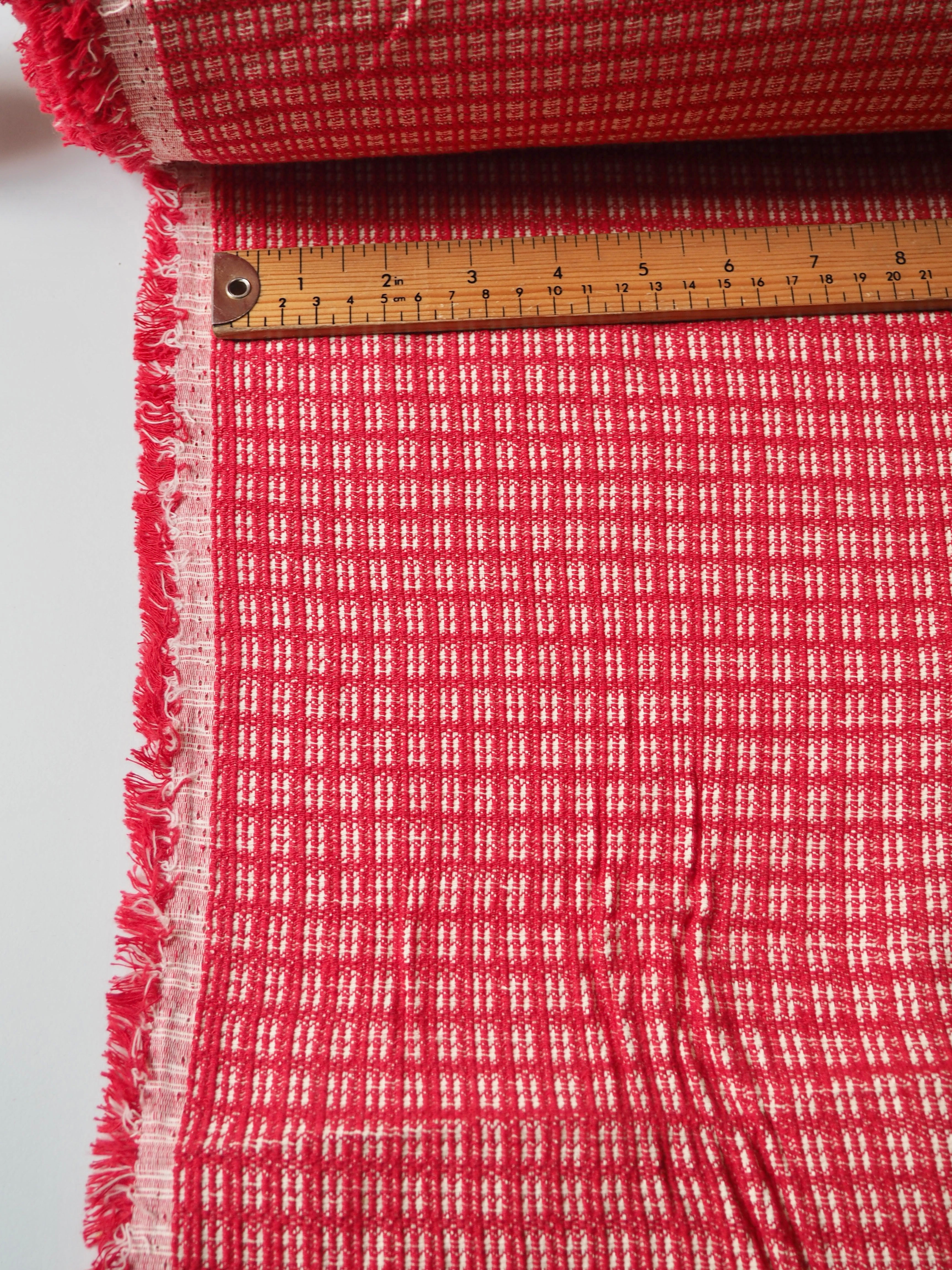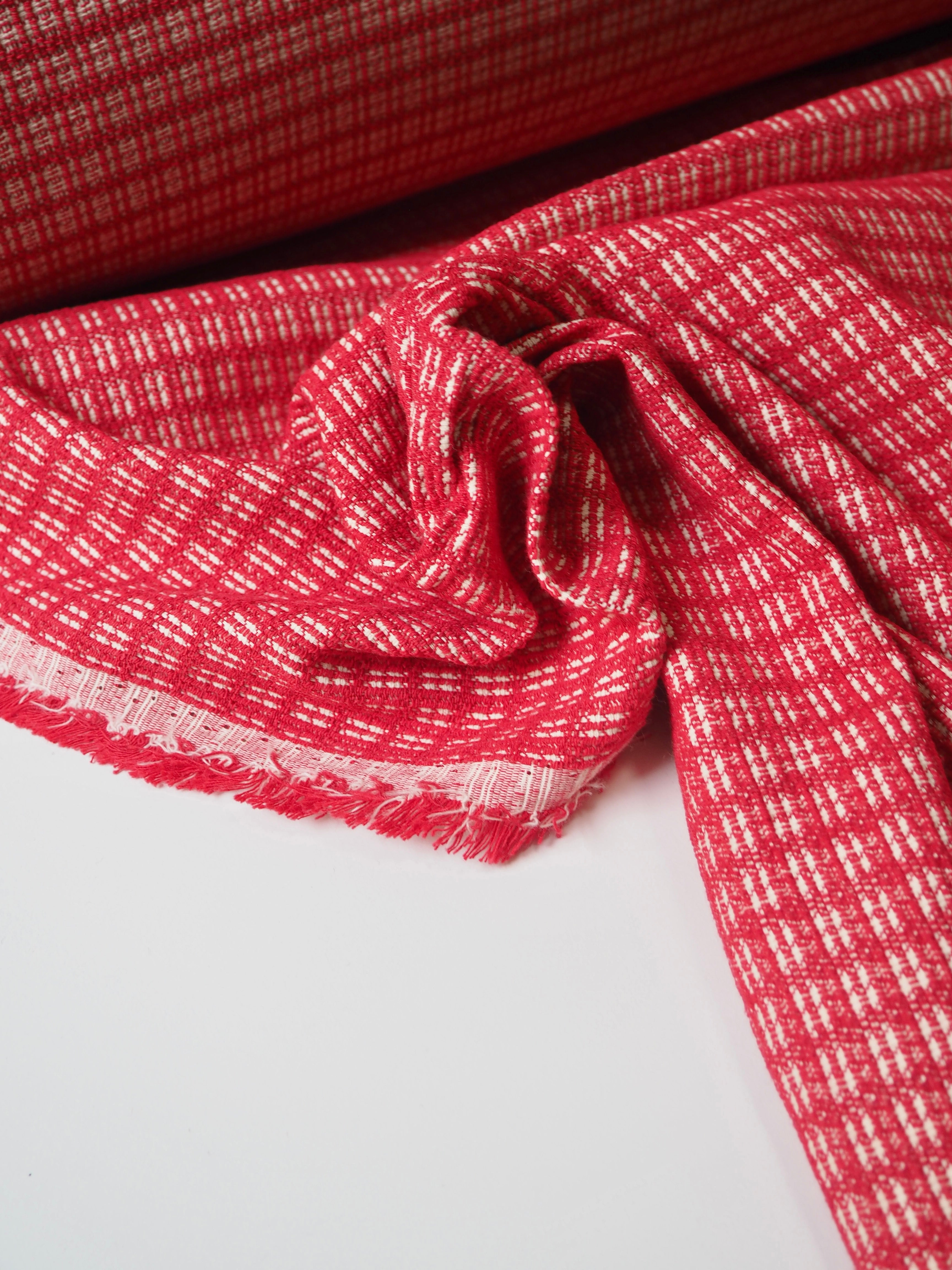 This ex-designer fabric is a jacquard. It's an off-white and red colourway with a check-like pattern. It's soft and stretchy, with a nice texture and lovely cotton handle. Opaque, medium weight, and has a great structure. Has about 15% width-ways stretch. Perfect for an oversized jacket or for cushions!
