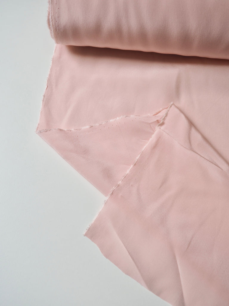 This ex-designer fabric is a silk crepe de chine. It has the characteristic gentler crepe texture but is still very soft and lightweight. It's very drapey and has fantastic movement. Almost fully opaque. Has a wonderful silky handle! Would be perfect for a lining in dresses, skirts, blazers, or for a lovely basic button down blouse!