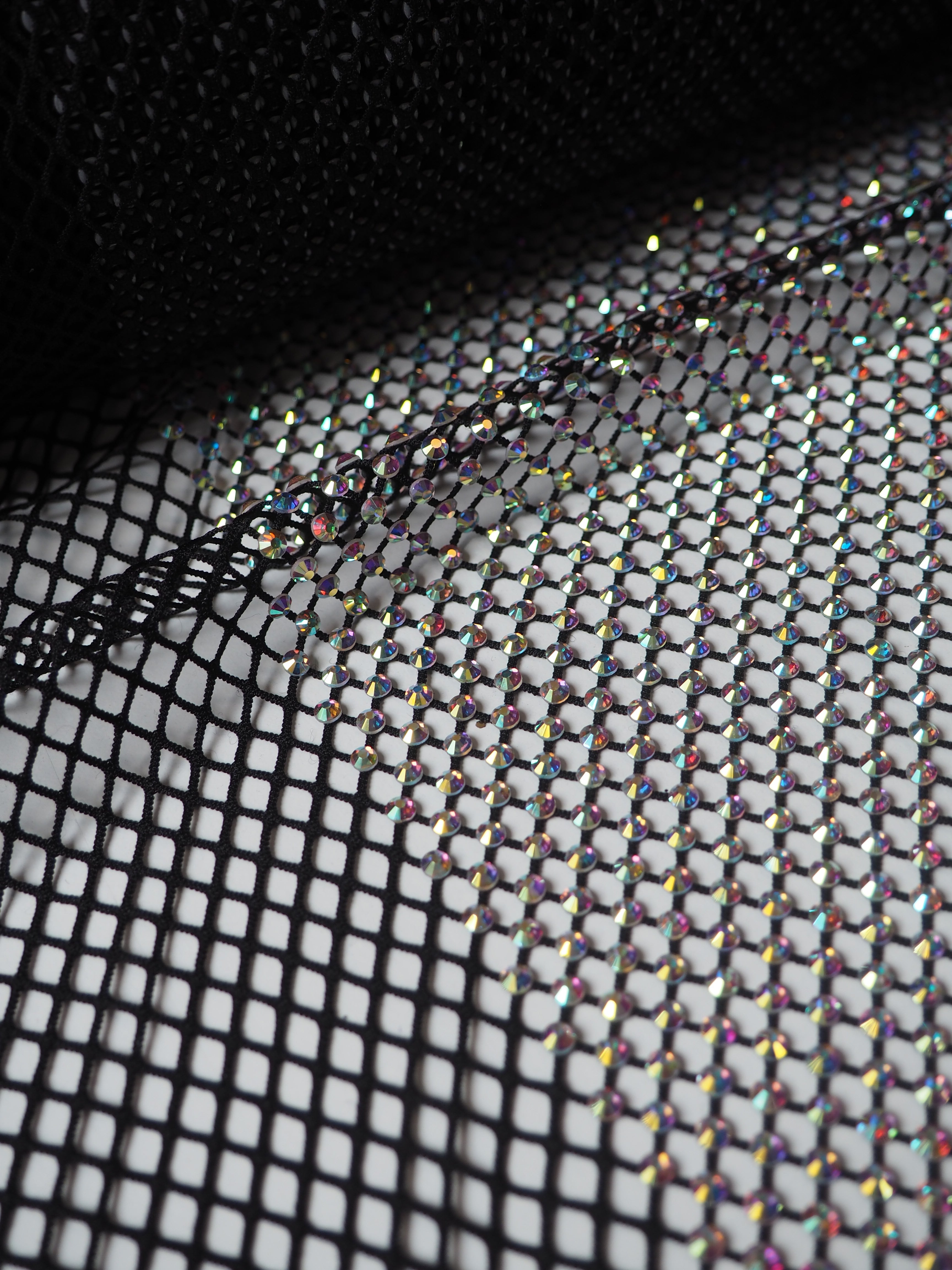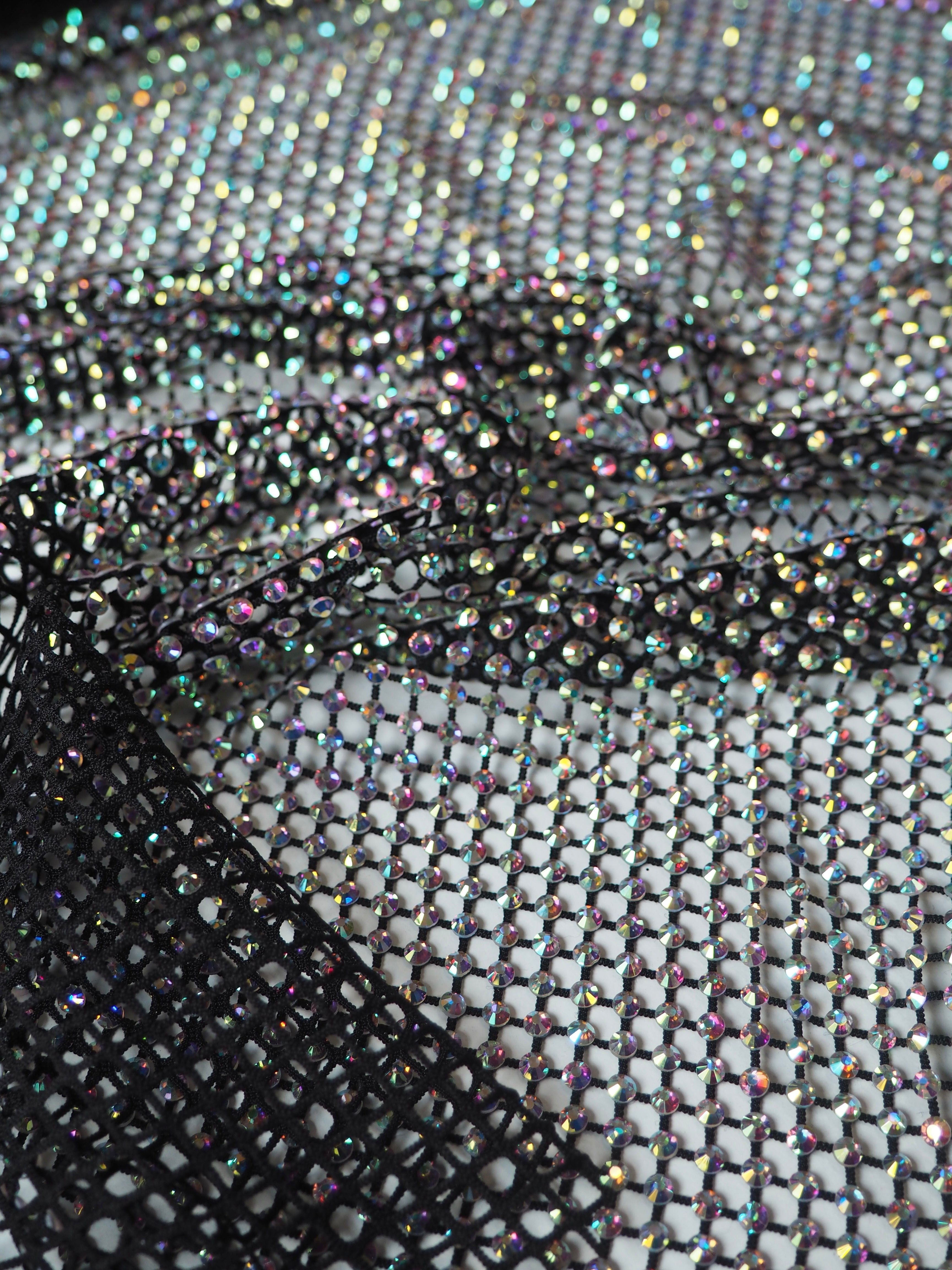This ex-designer fabric is a special netting. This black netting has heat-bonded crystals attached densely across it's surface, in between the intersections of netting. It's quite heavy weight but still drapey and very eye-catching! Has a bit of stretch 4-way. Would be amazing in for festival wear!