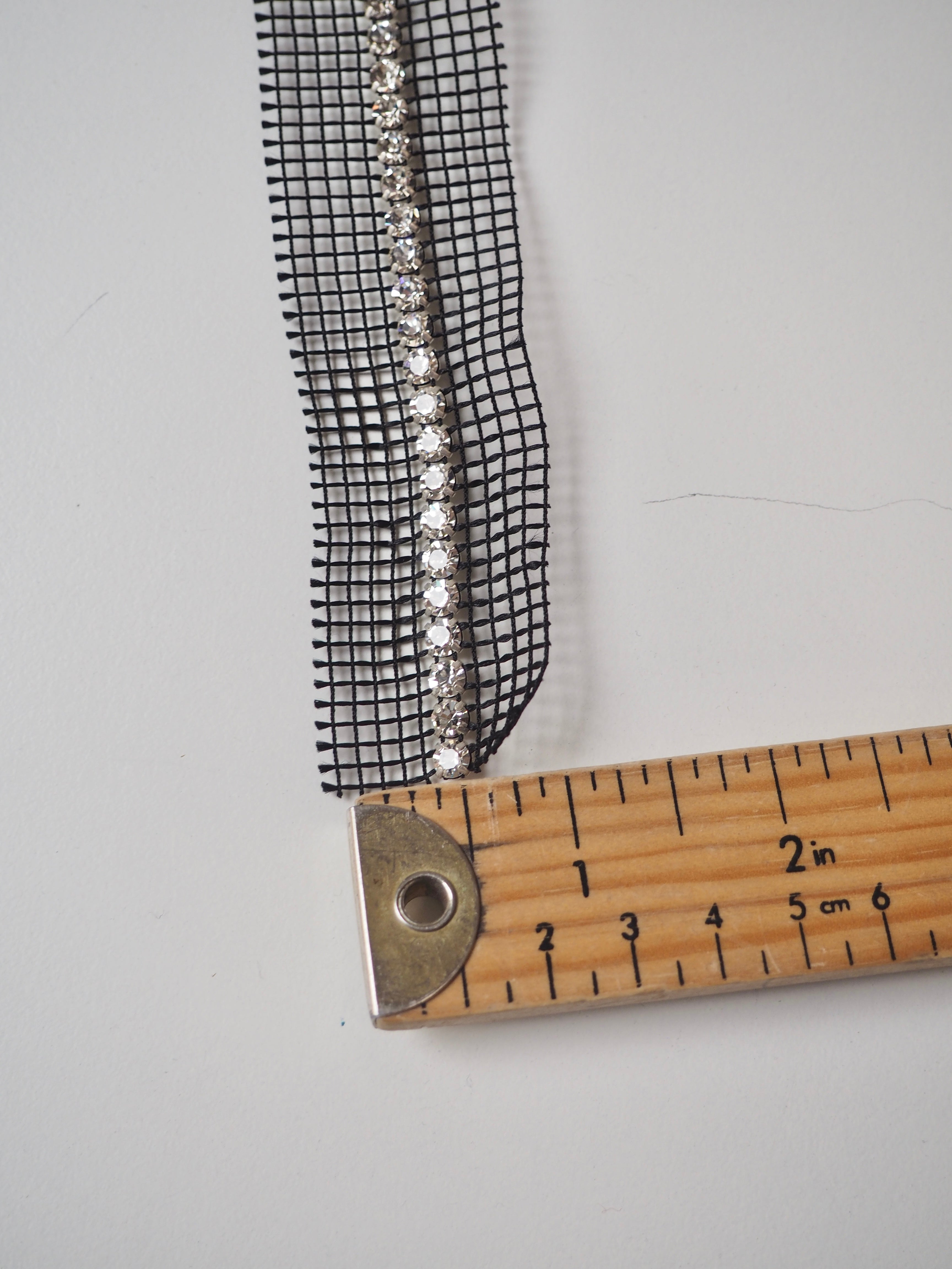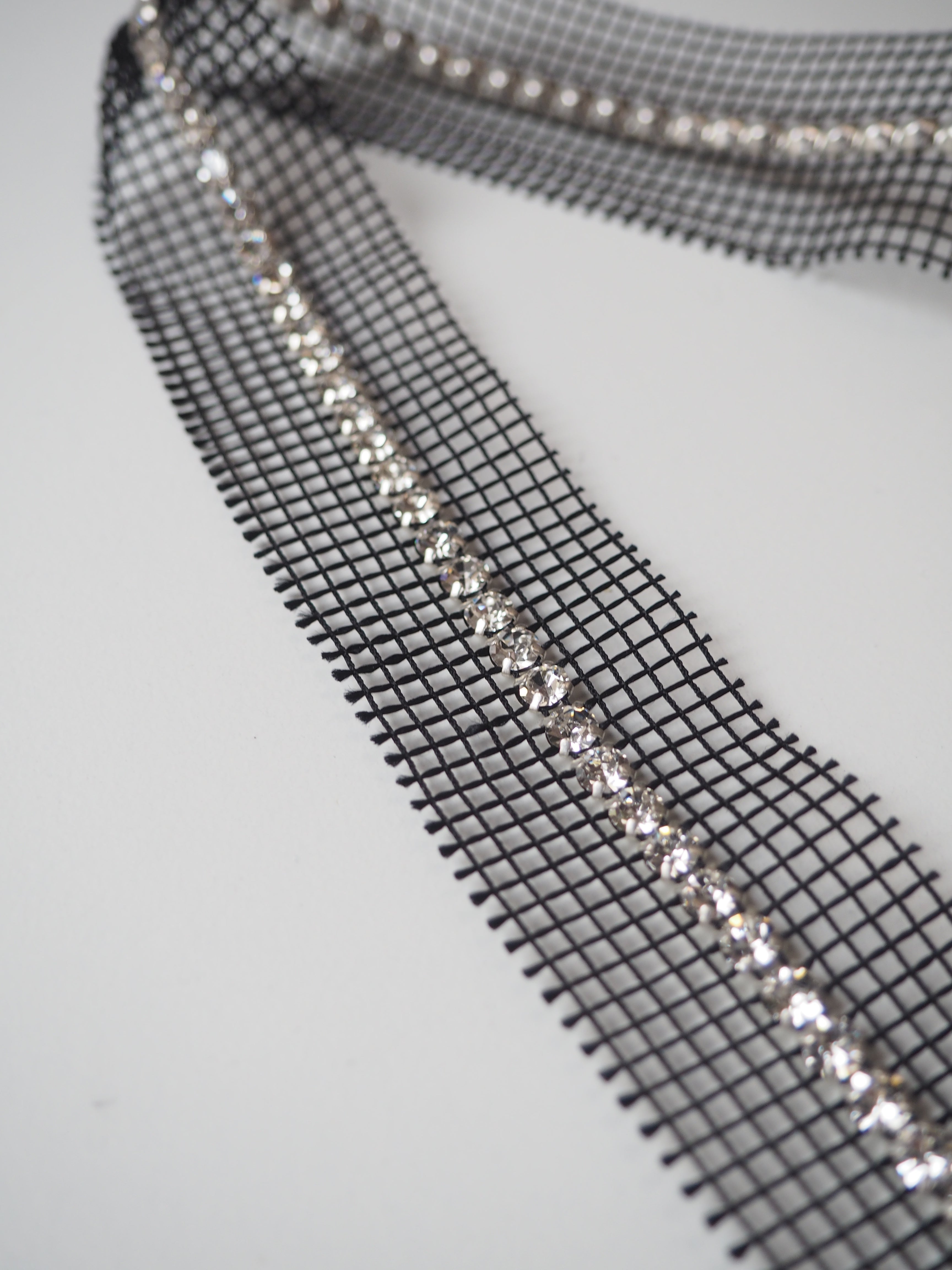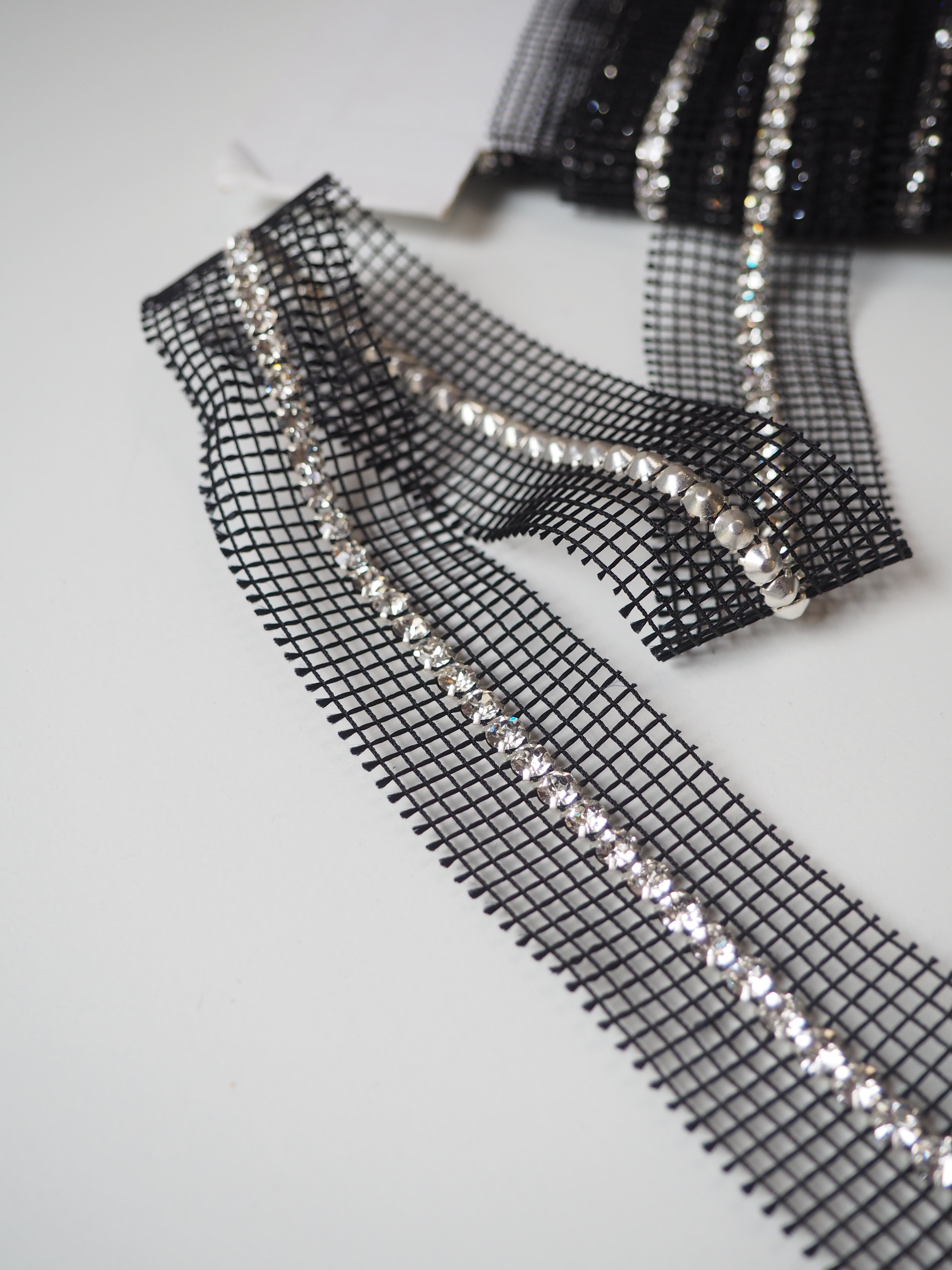 This ex-designer trim is a sparkly diamante trim. Preciosa is a top-quality Czech trim supplier, similar to Swarovski. Made up of crystals down the centre in a black setting, chained together in a gridded net weave. The crystals are super high quality and really sparkle when they catch the light! Light weight with decent movement, and easy to cut and sew on! Could be used for waistlines, hems, or any seams, and so many other fun projects!