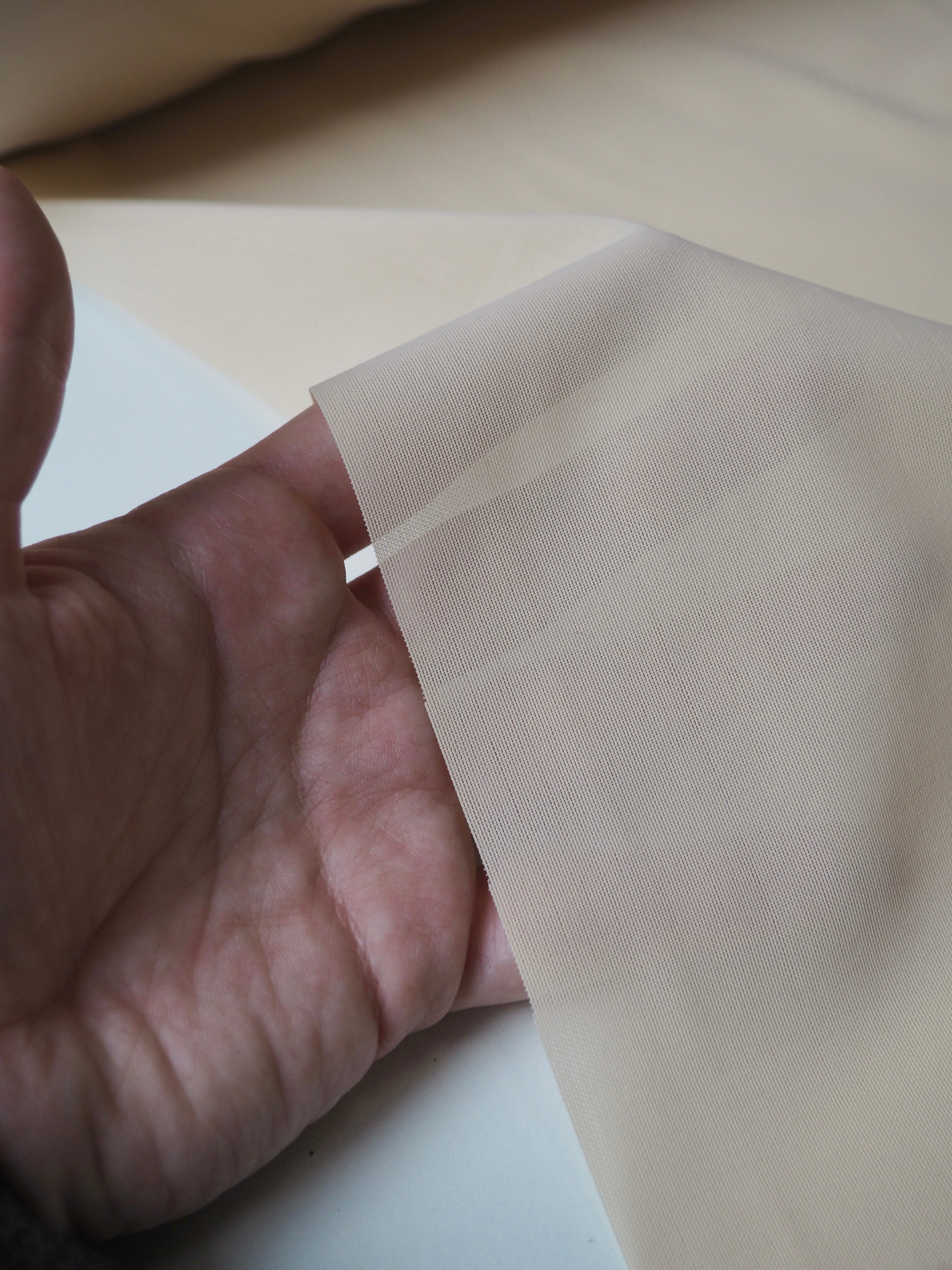 This ex-designer fabric is a stretch powernet. Powernet is a high-stretch fuller coverage mesh, with excellent recovery and great breathability. It's common for performance wear and undergarments. It's lightweight and has great support with its dense structure, but still slight sheerness when stretched. It's soft and comfy! Pairs so well with lingerie, swim, and activewear! Perfect for our lingerie patterns, and we even have bra finding kits!