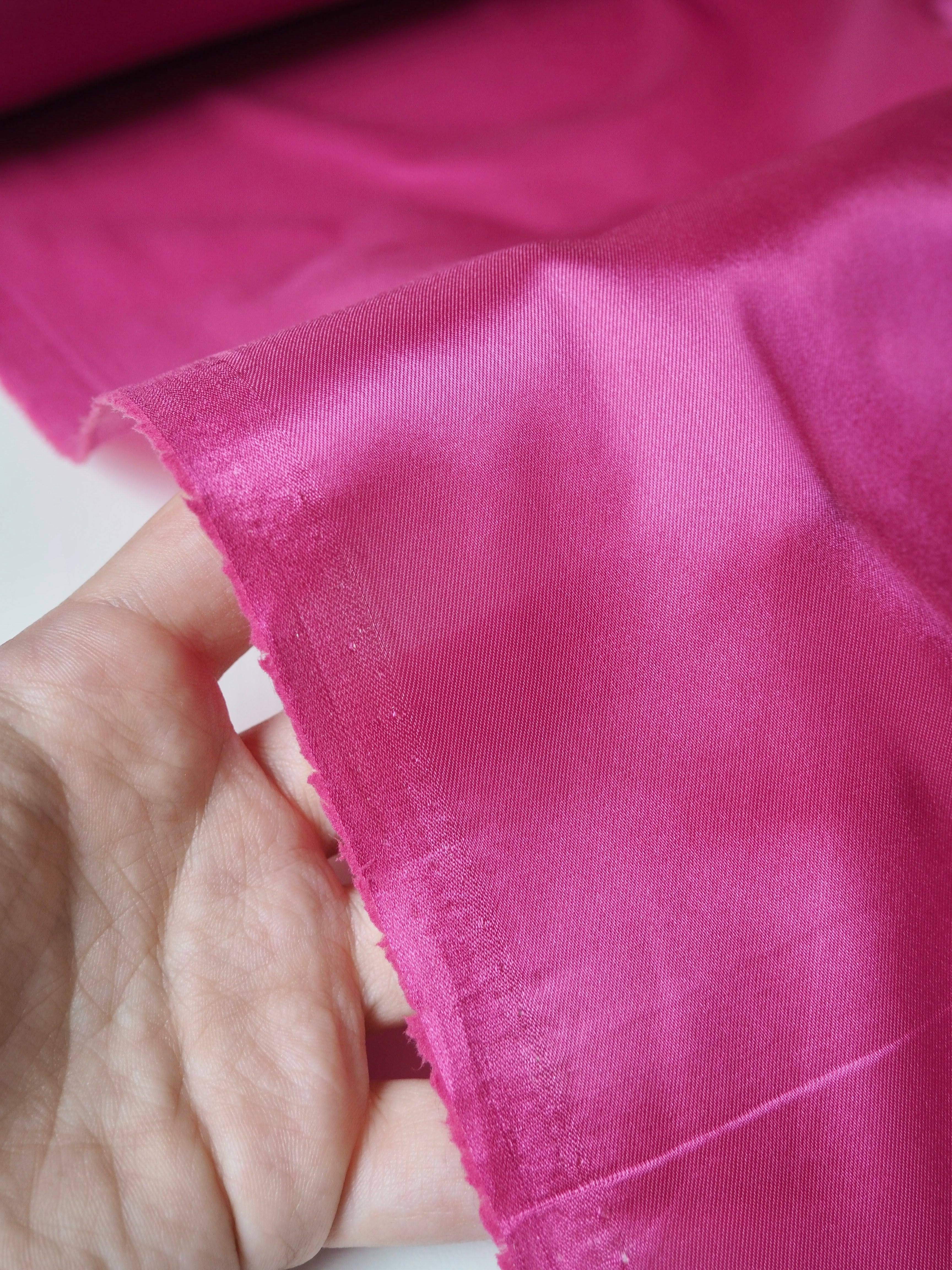 This ex-designer fabric is a stretch lining. It has a twill weave in a soft and slinky acetate fibre. Has a gentle 10% stretch width-ways. Lightweight with a gentle drape and nice satin finish. Has a slight structure to it as well. Mostly opaque. Ideal for lining any garment, especially a suit jacket or coat!