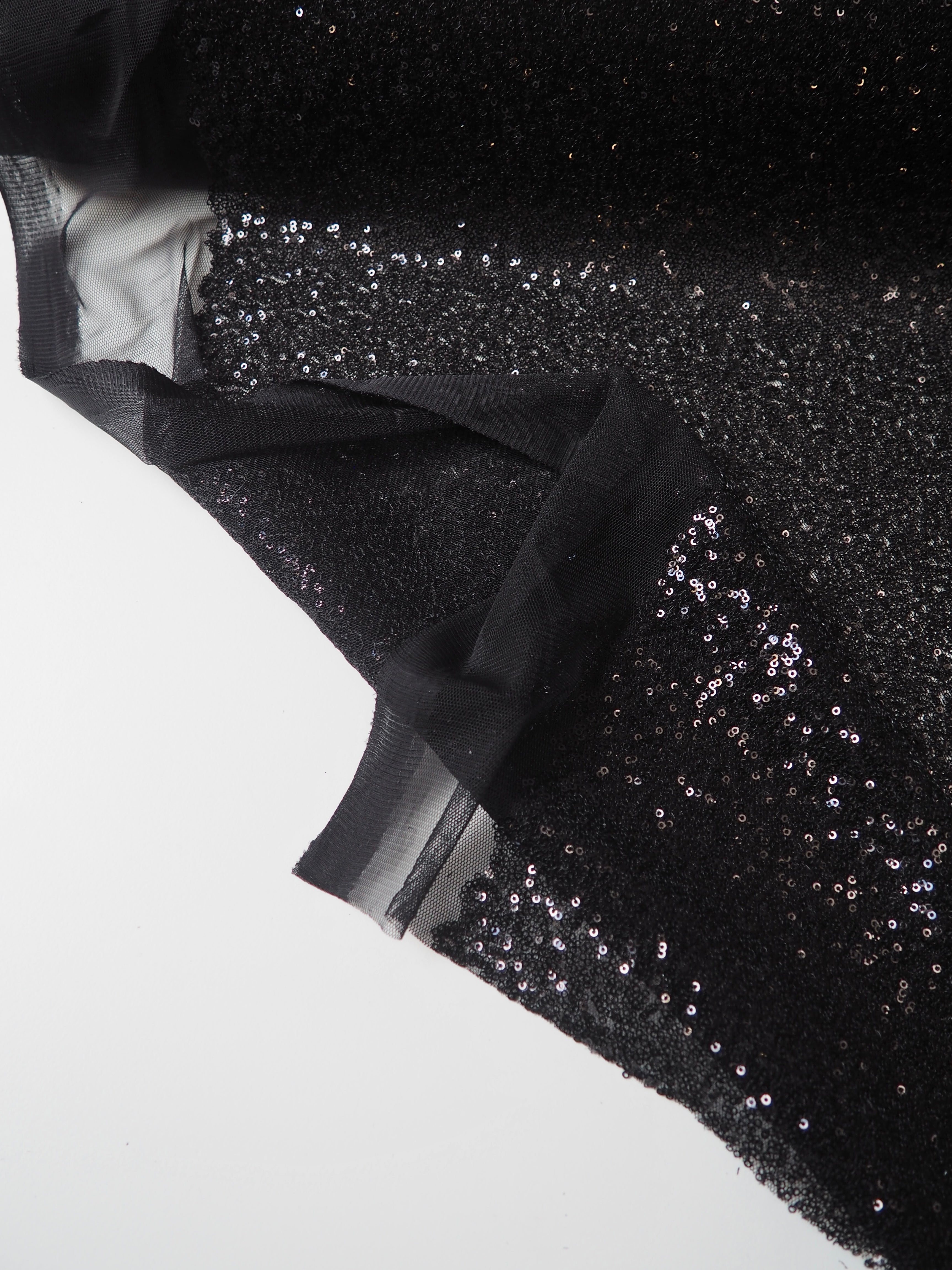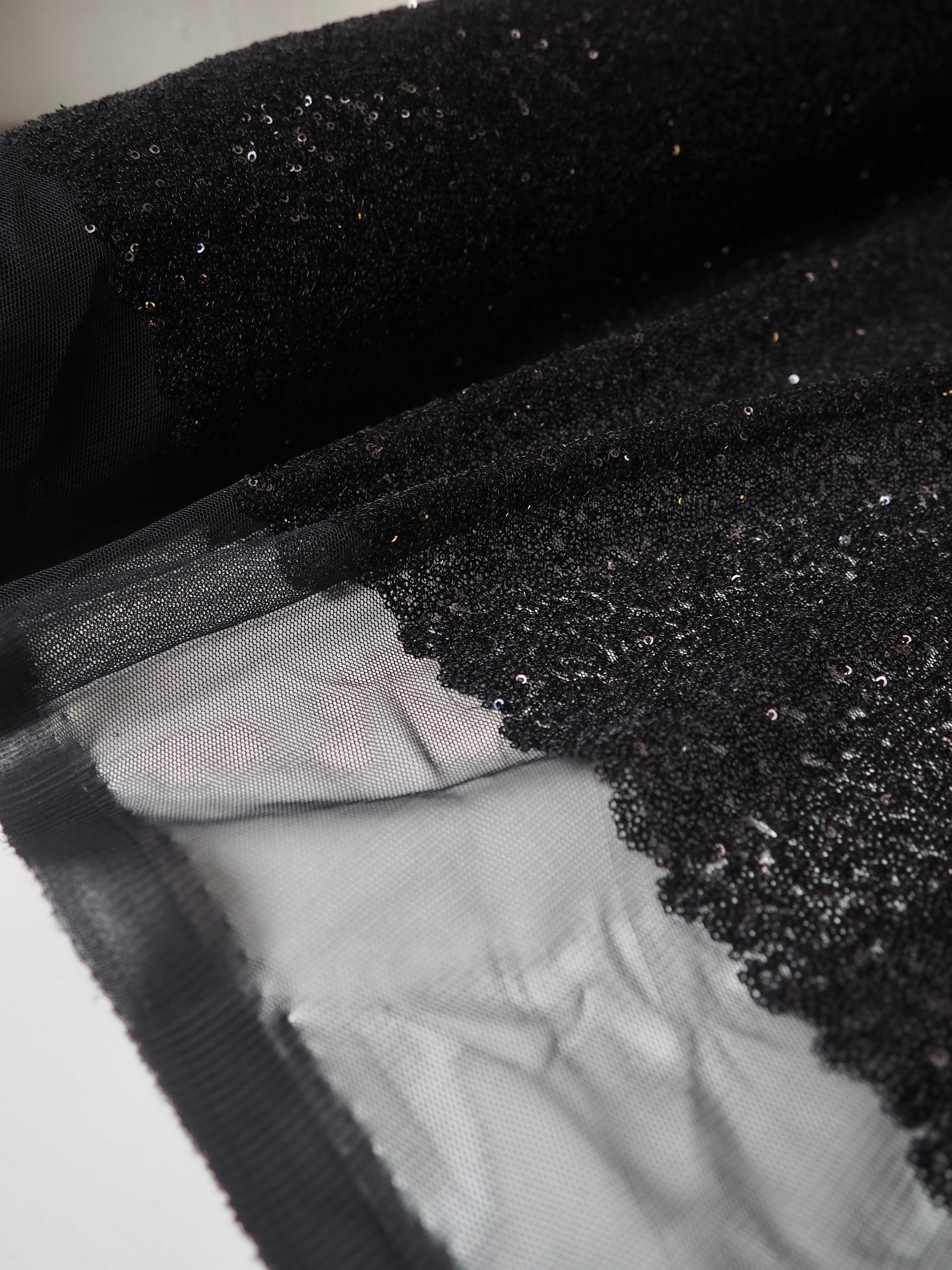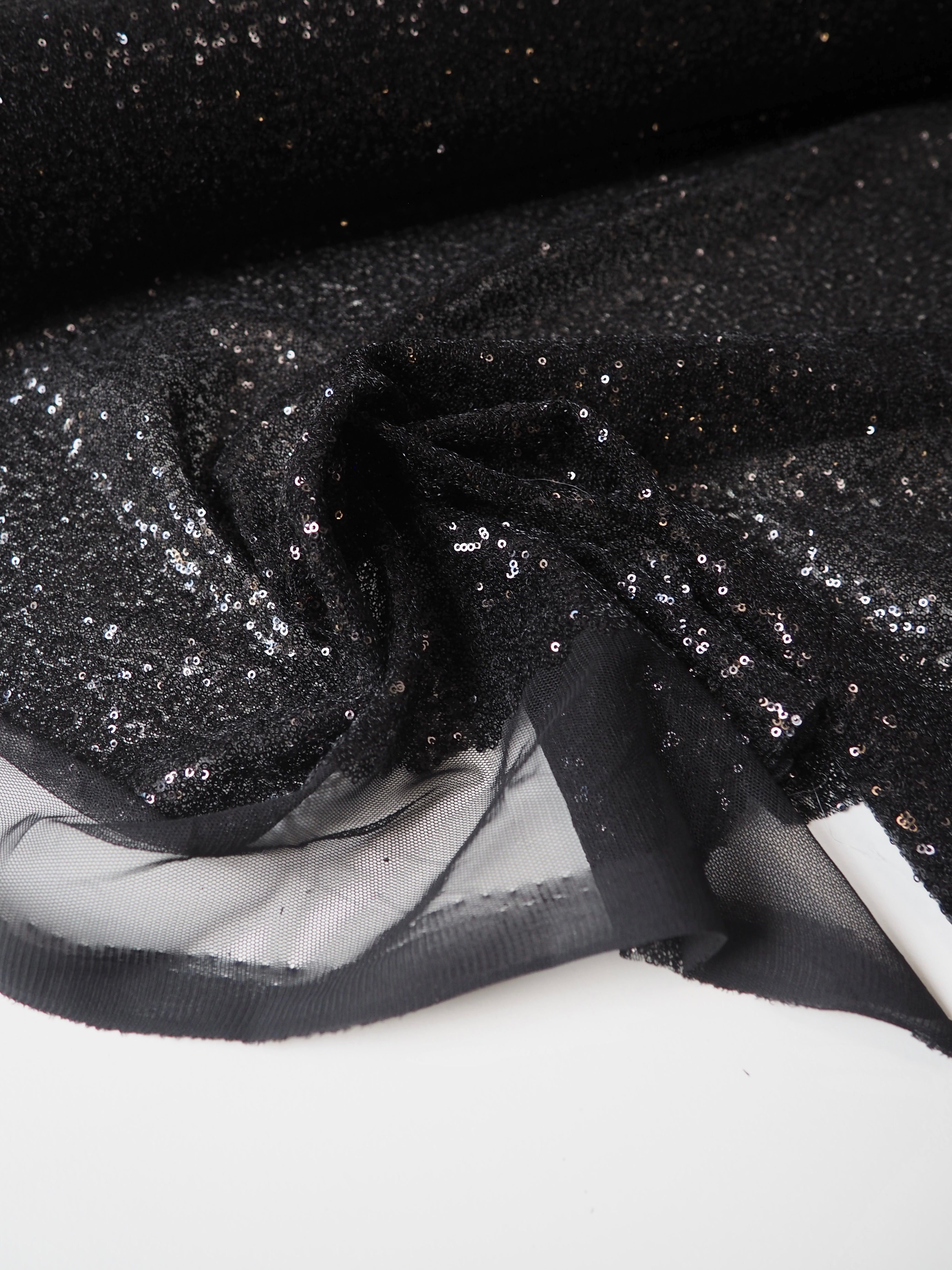 This ex-designer fabric is a sequin tulle. Black micro sequins are woven onto a black tulle. The sequins are amazing quality, and secured on very well for long wear. They are woven on for medium coverage. Light to medium weight with a lovely drape. This fabric would be perfect for a party dress, skirt or top!
