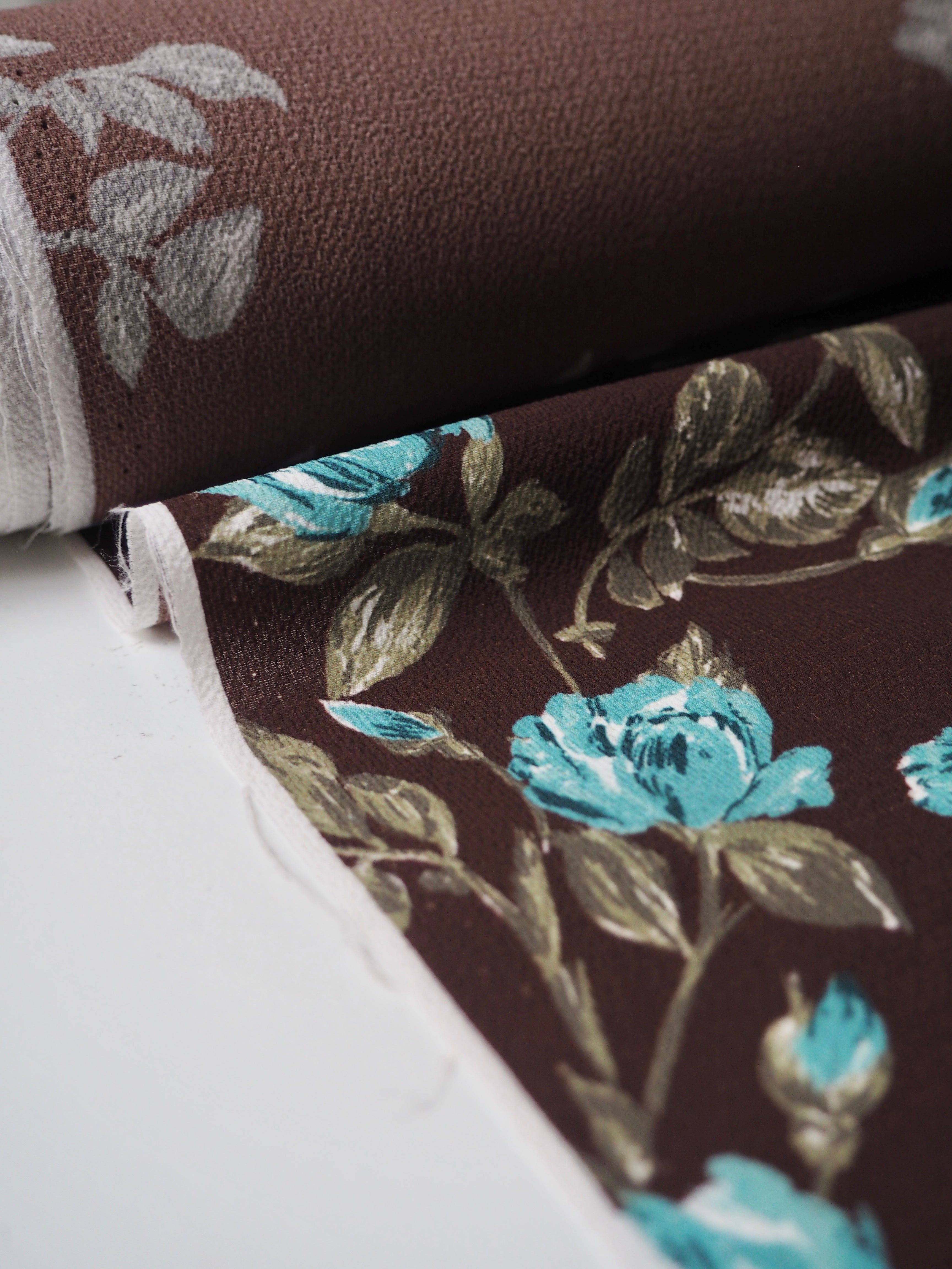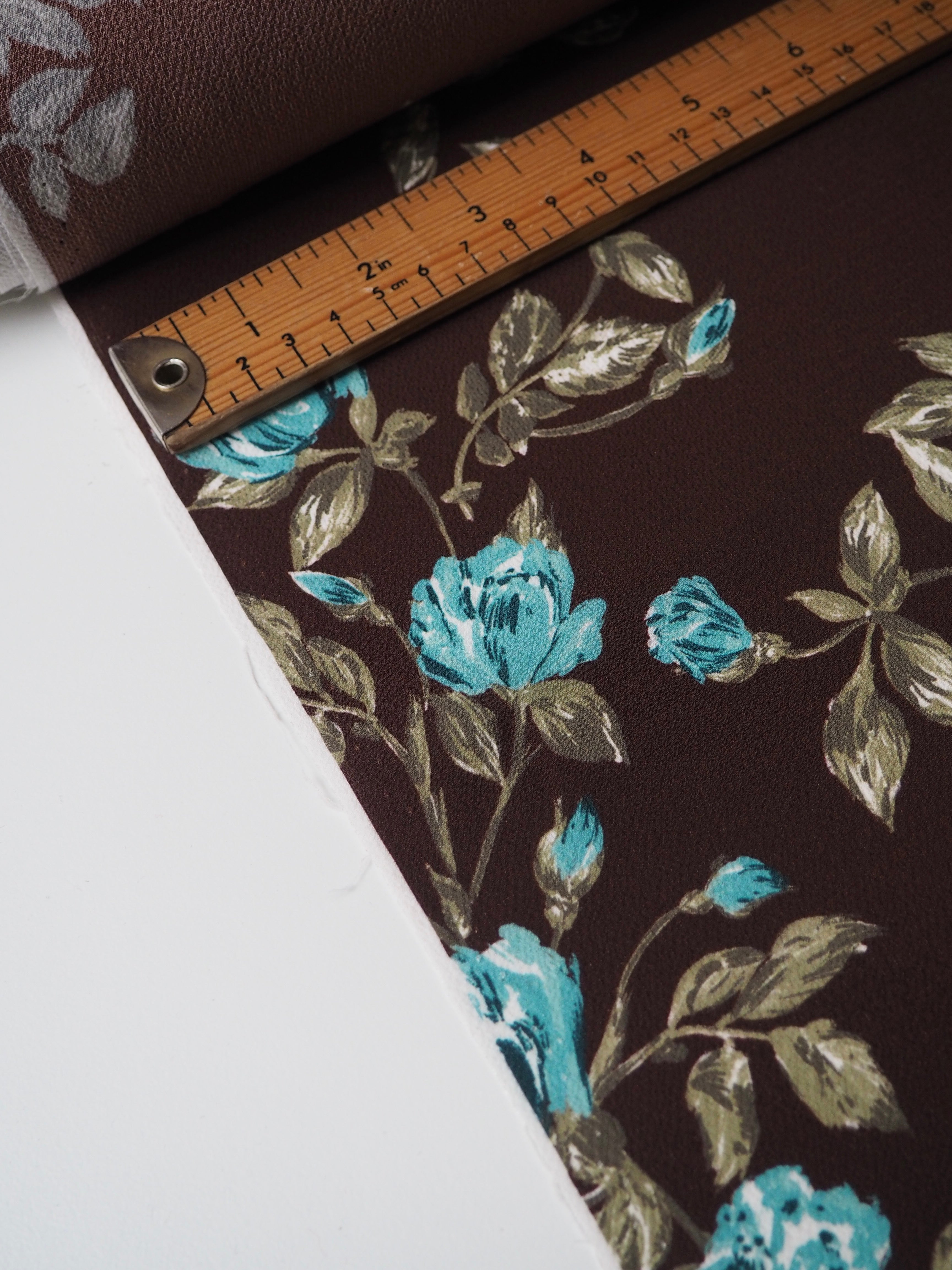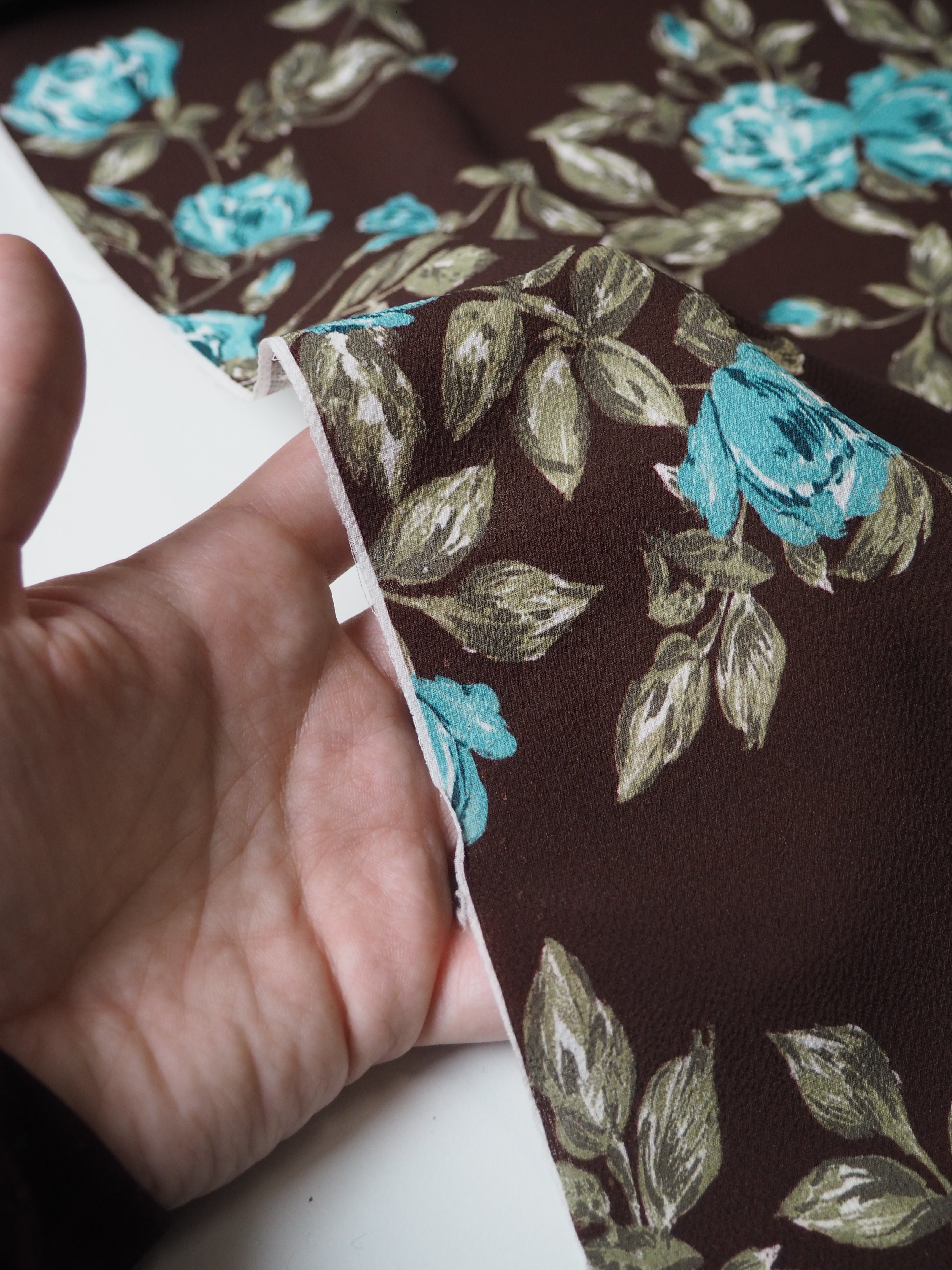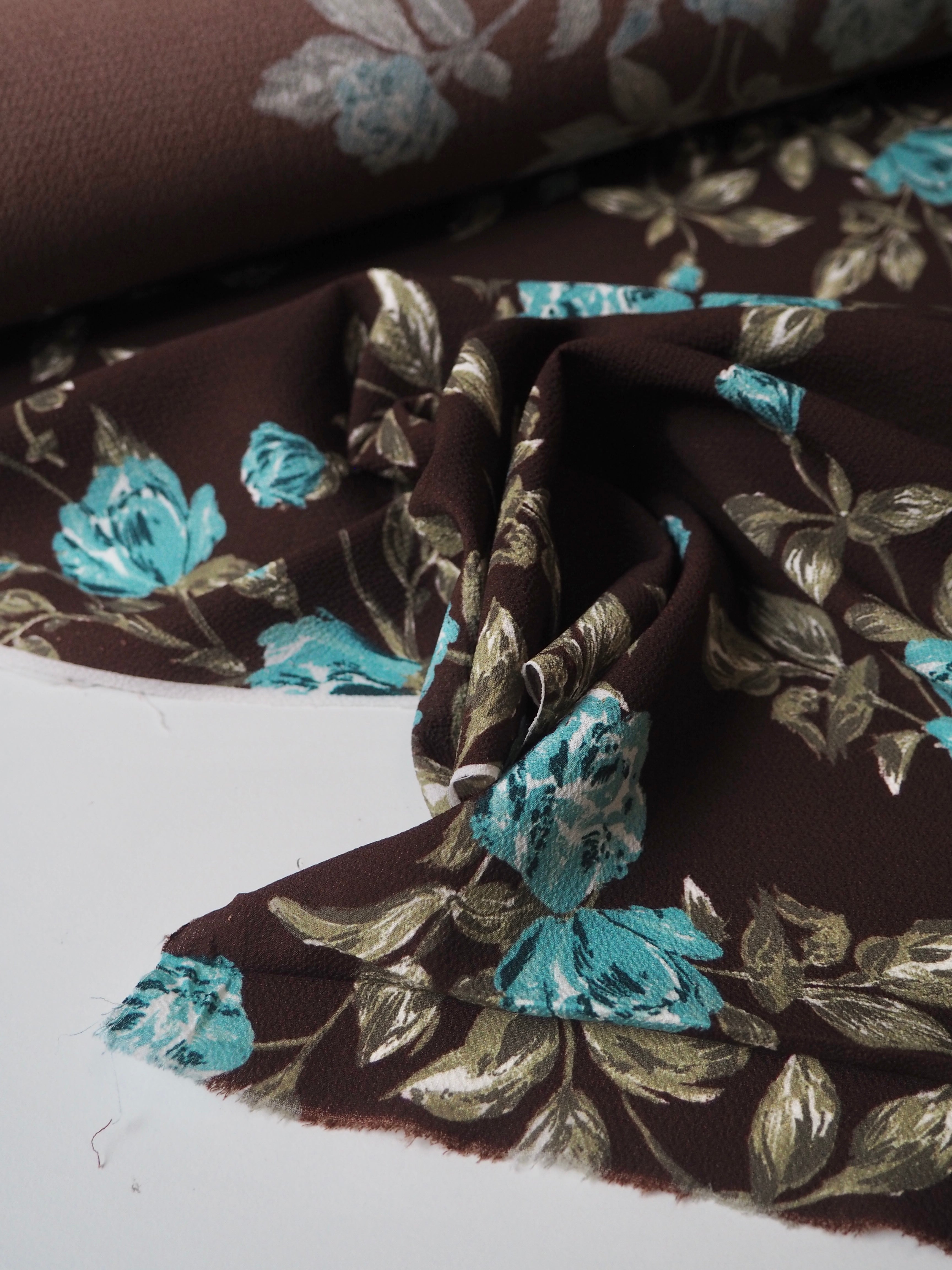 This ex-designer fabric is a slightly crinkled crepe. It has an amazing drape, that is light and airy. It's brown with blue, white, and green blooms. It's an exclusive designer print. Opaque with such a lovely textured handle. Would make a lovely dress or top!