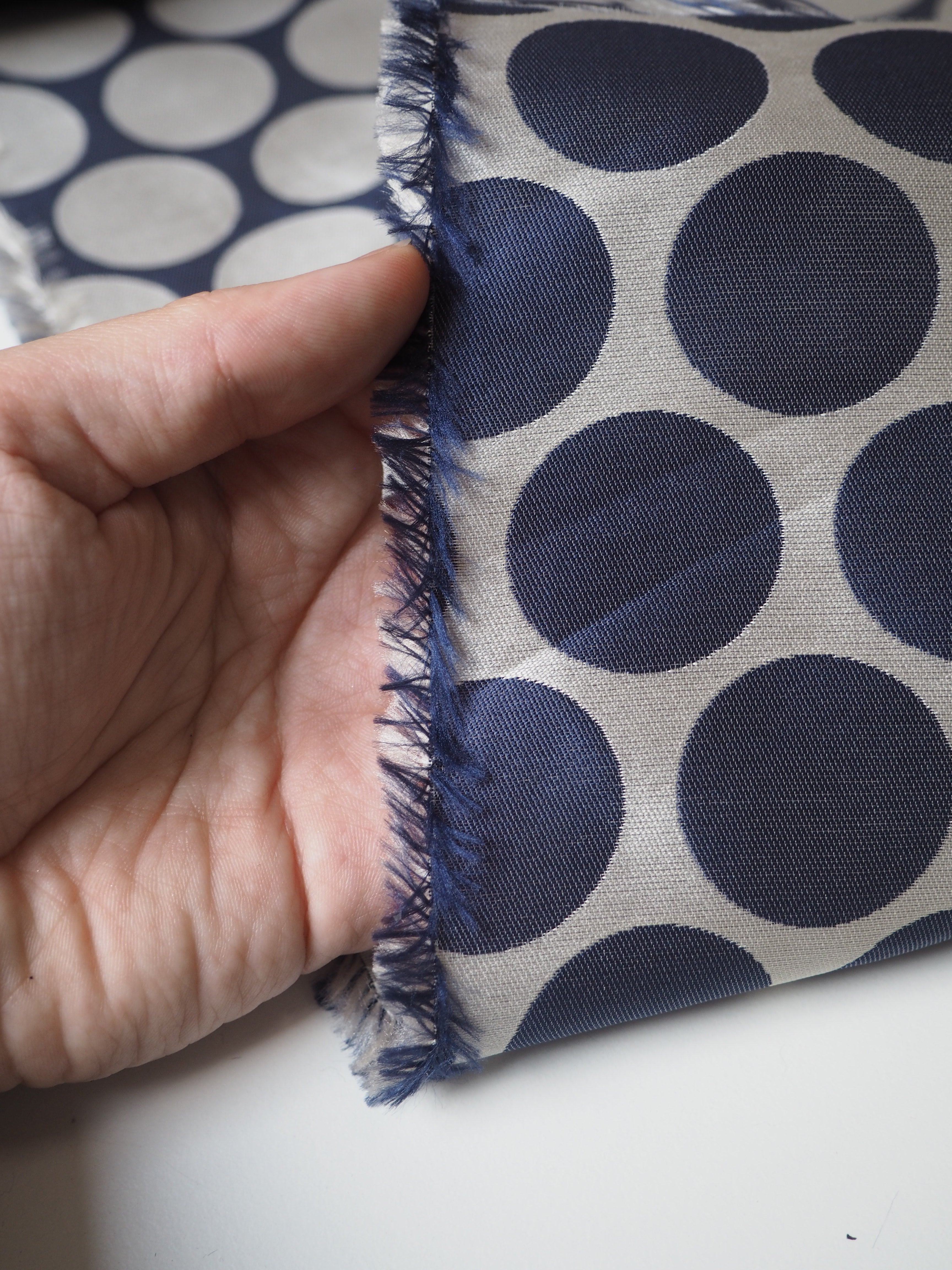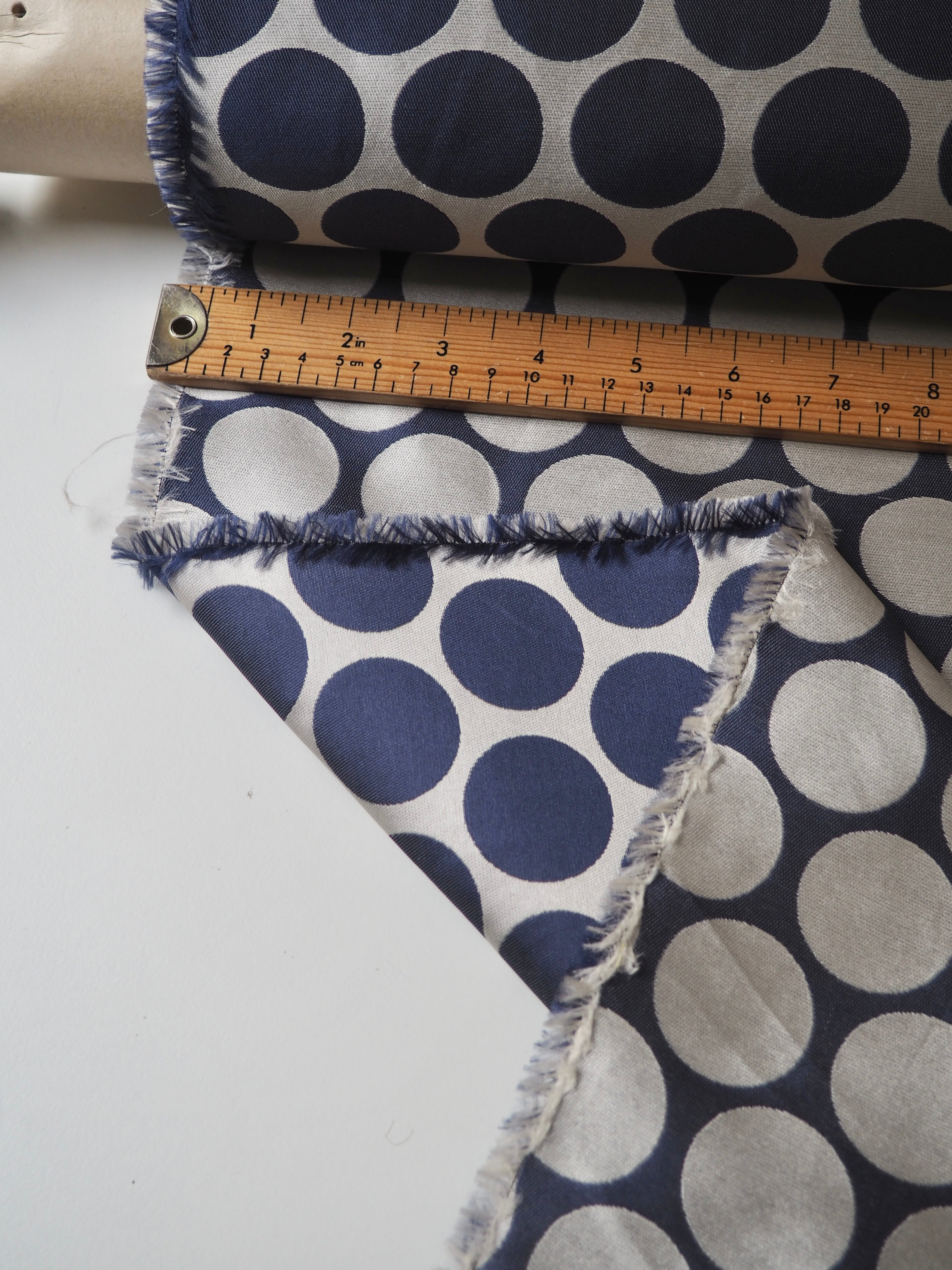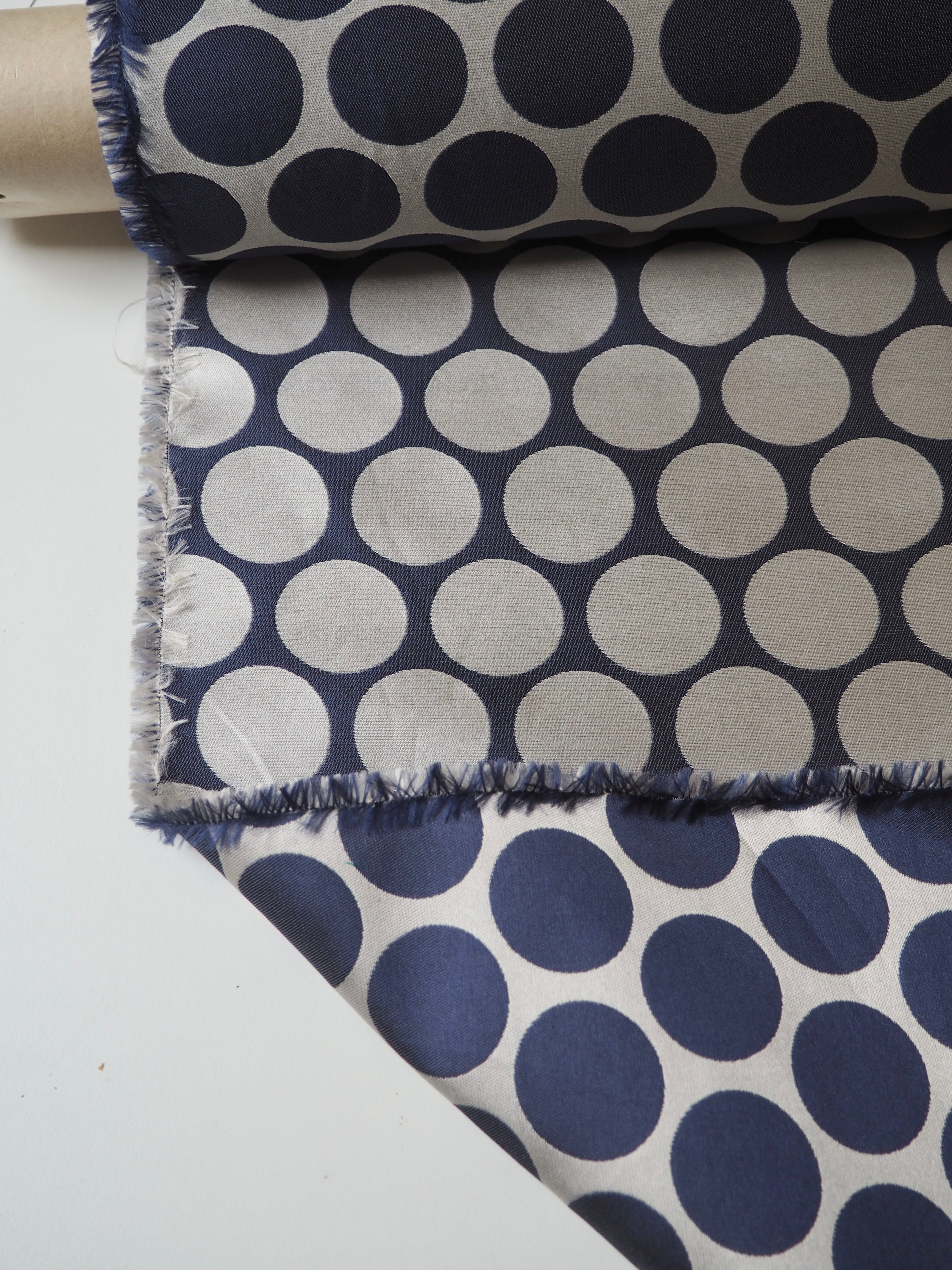 This ex-designer fabric is a jacquard. Either side of this fabric could be used, with silver and blue polka dot design in opposite colours. It's opaque, light weight with a soft structure. It's quite smooth and crisp in handle. Would make a beautiful light jacket or fitted dress!